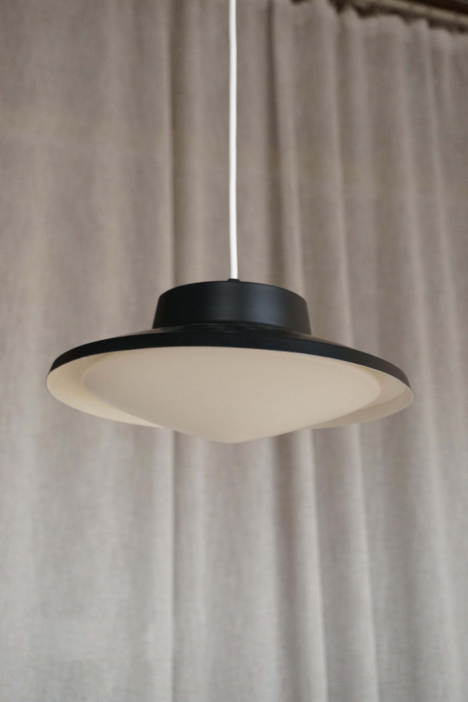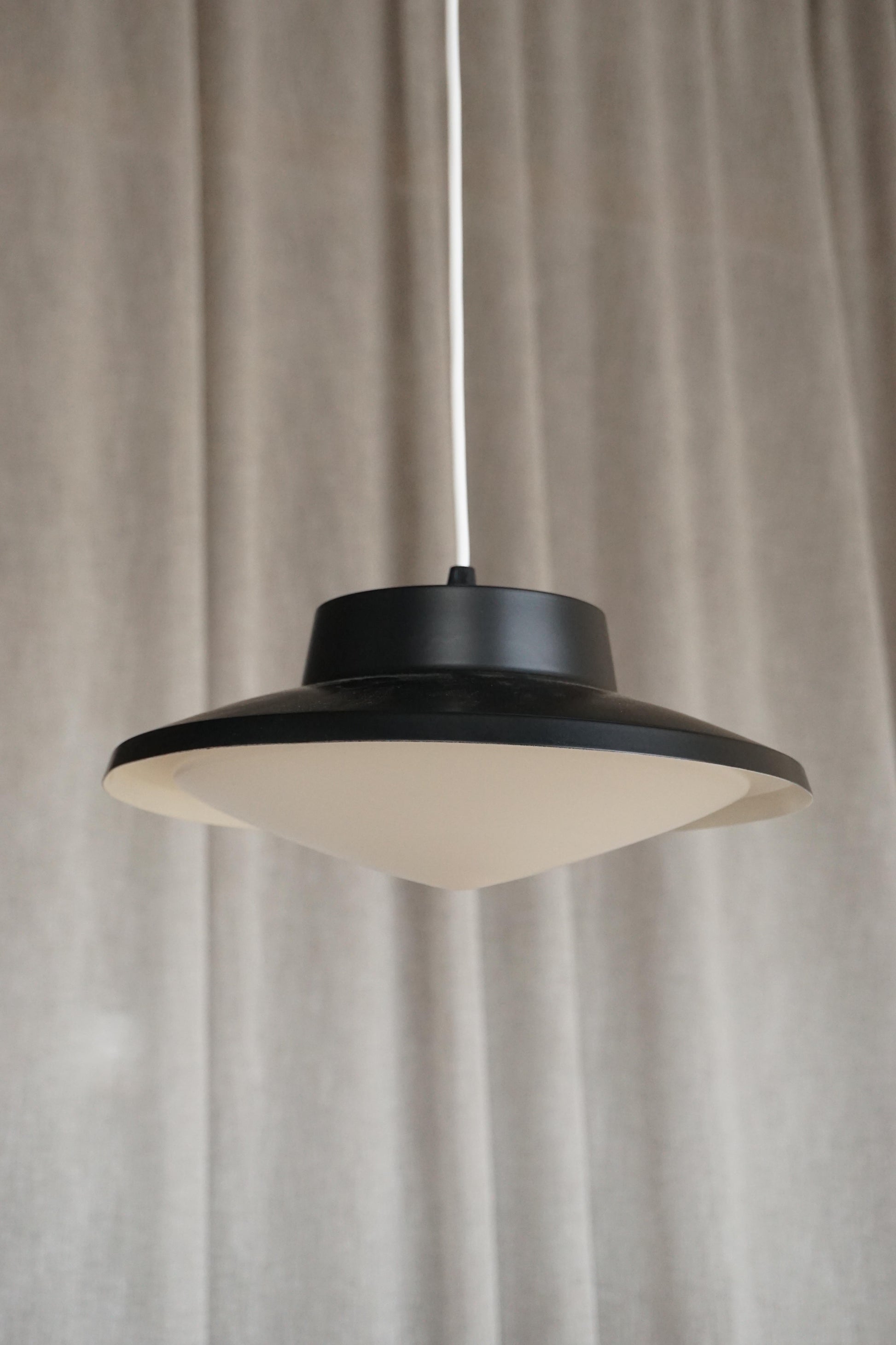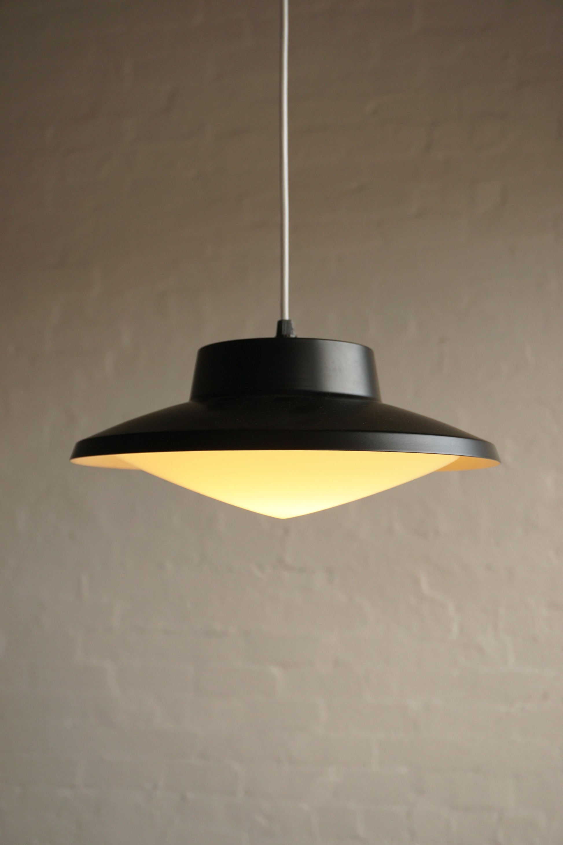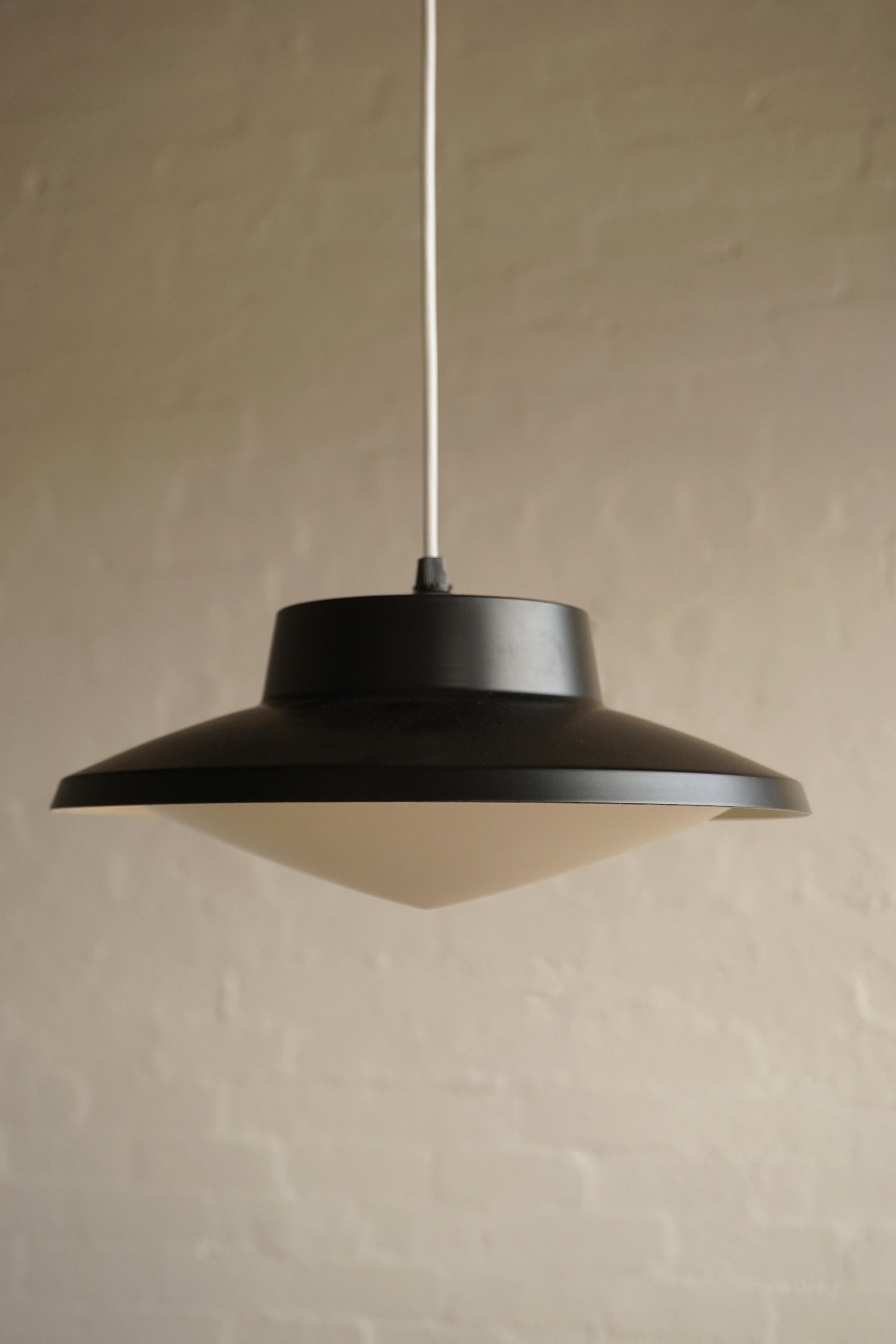Glass pendants c.1950s France. Metal is newly lacquered black. Opaline glass shades in good condition. Fully rewired to Australian standard with 2 metres of white flex.