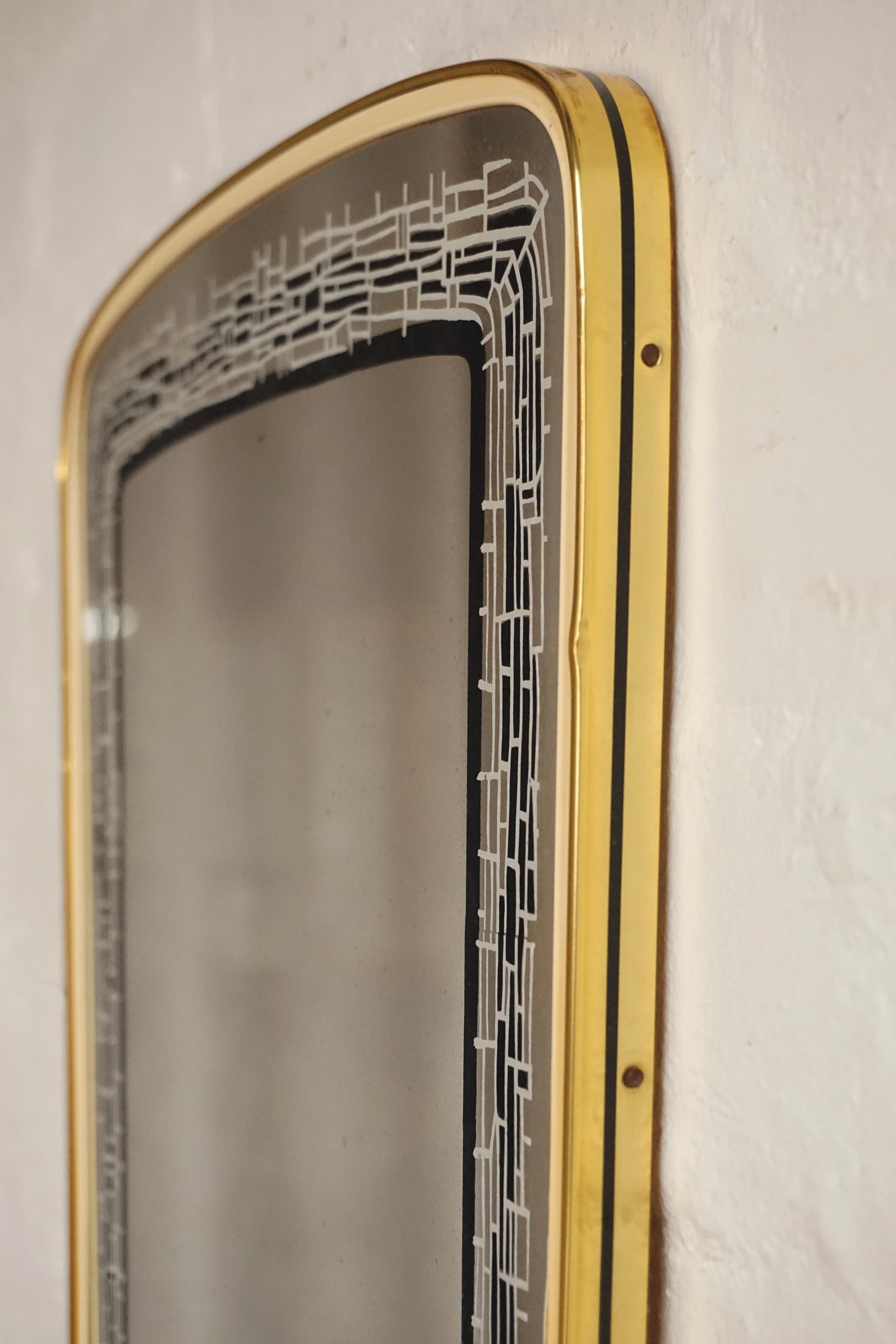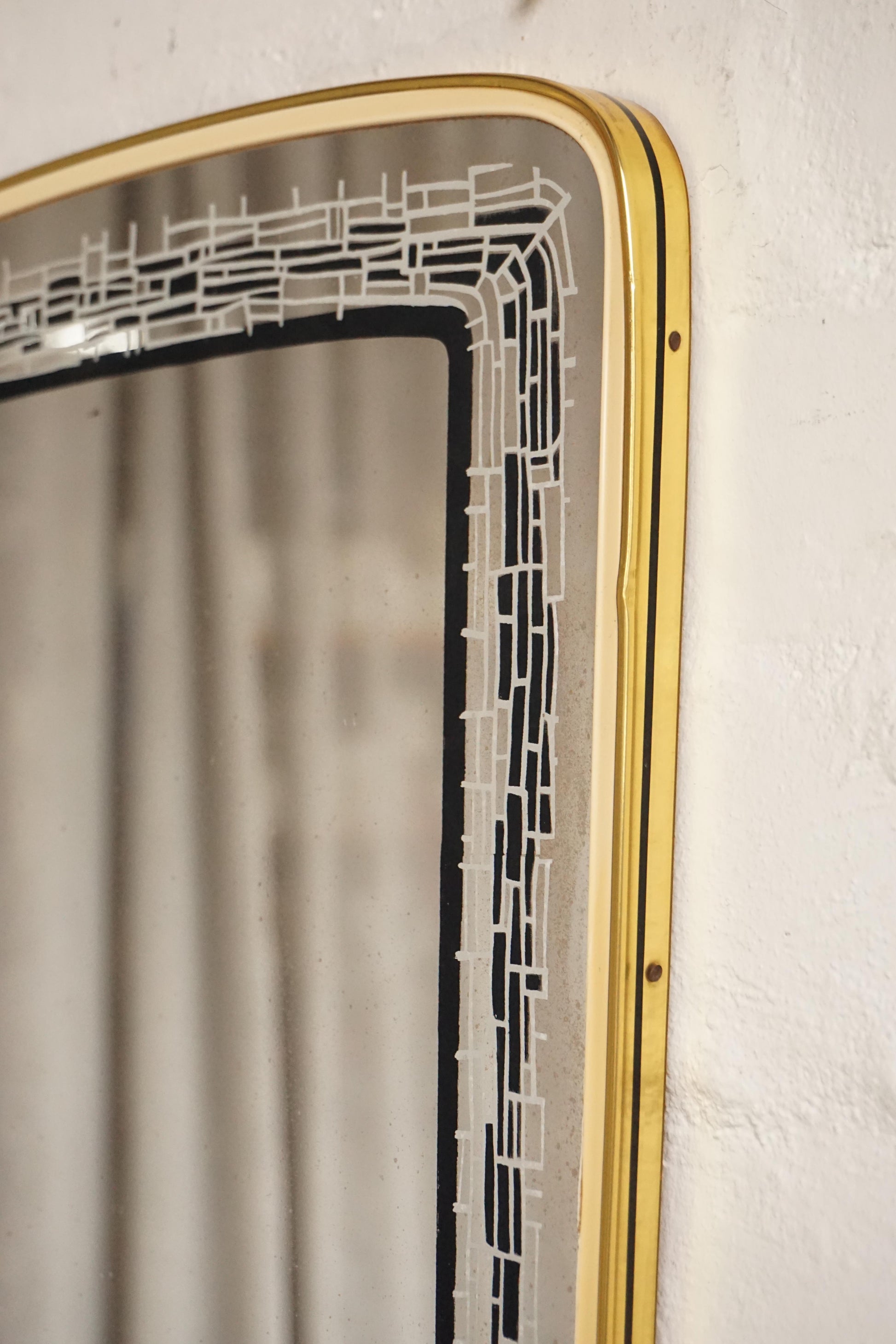 Mirror with decorative enamelled design c.1950s Europe. Original glass has a light patina that doesn't affect its use.