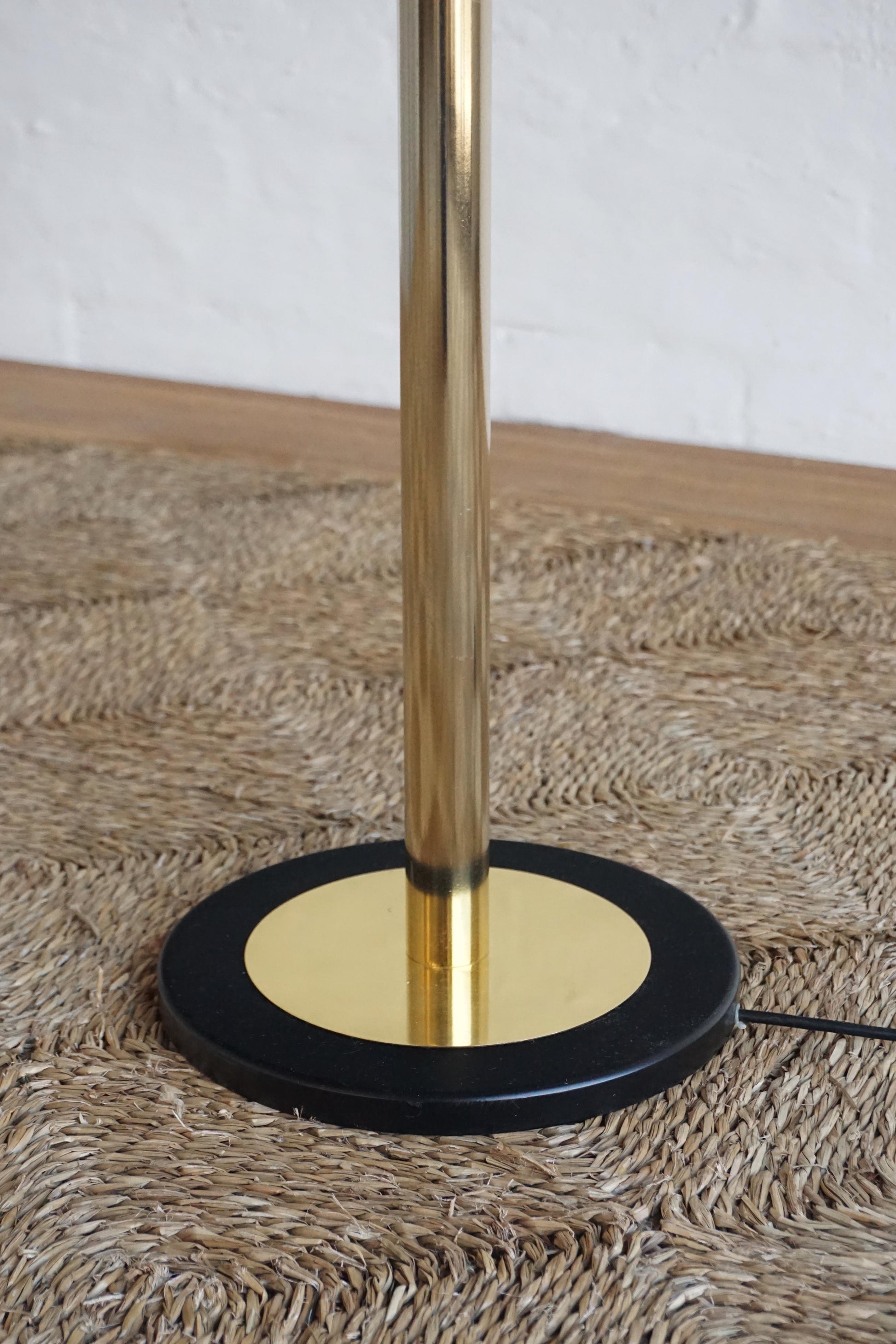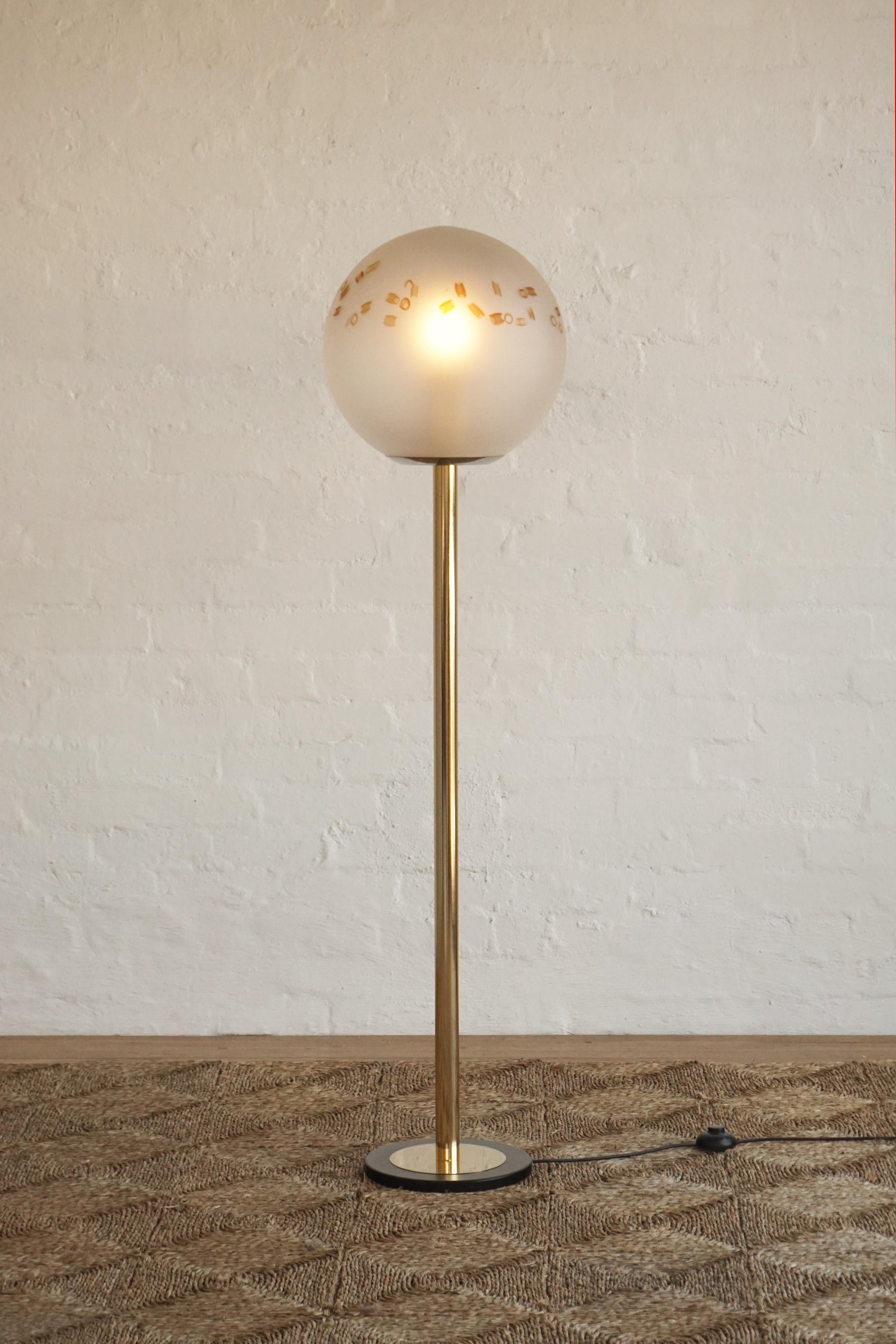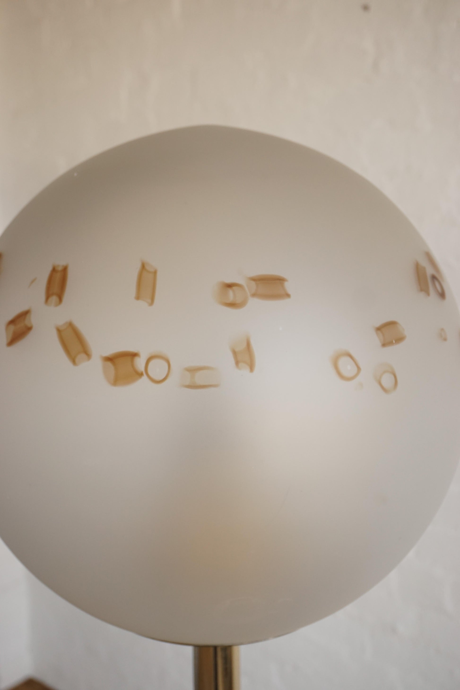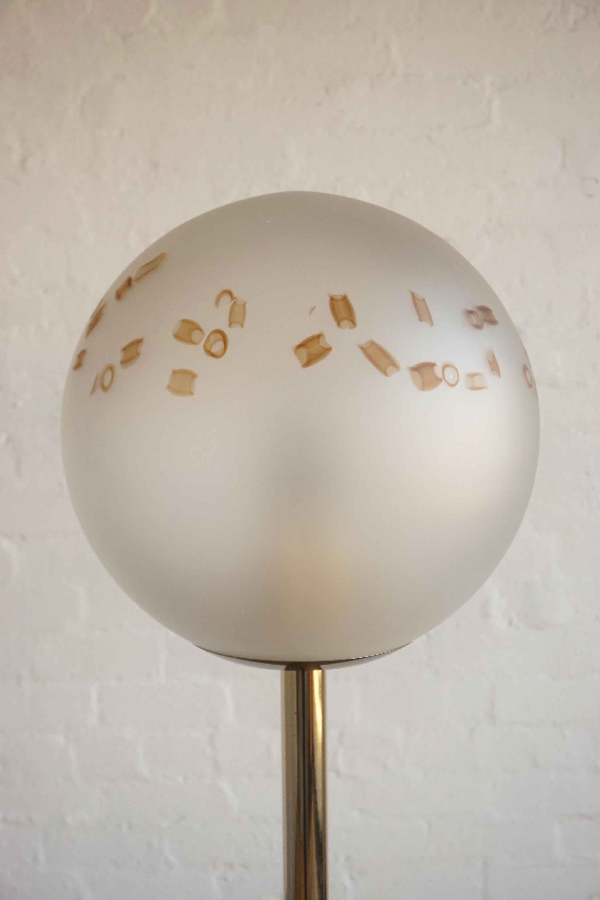 Floor lamp c.1970s Italy. Handmade murano glass dome shade with 'canes'. Polished brass plated stem shows some patina. Heavy steel base for stability. Fully rewired to Australian Standard with a new foot switch.