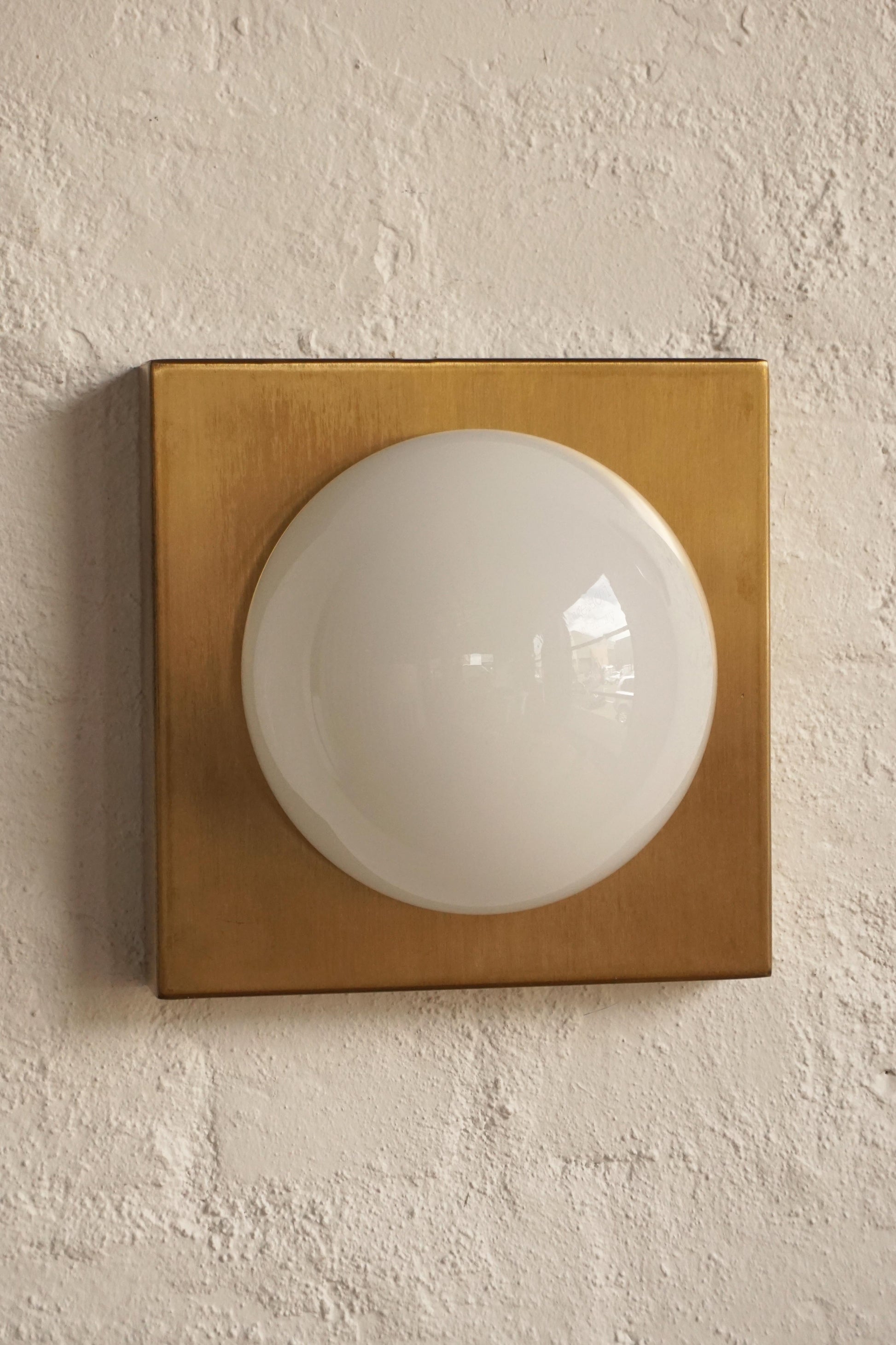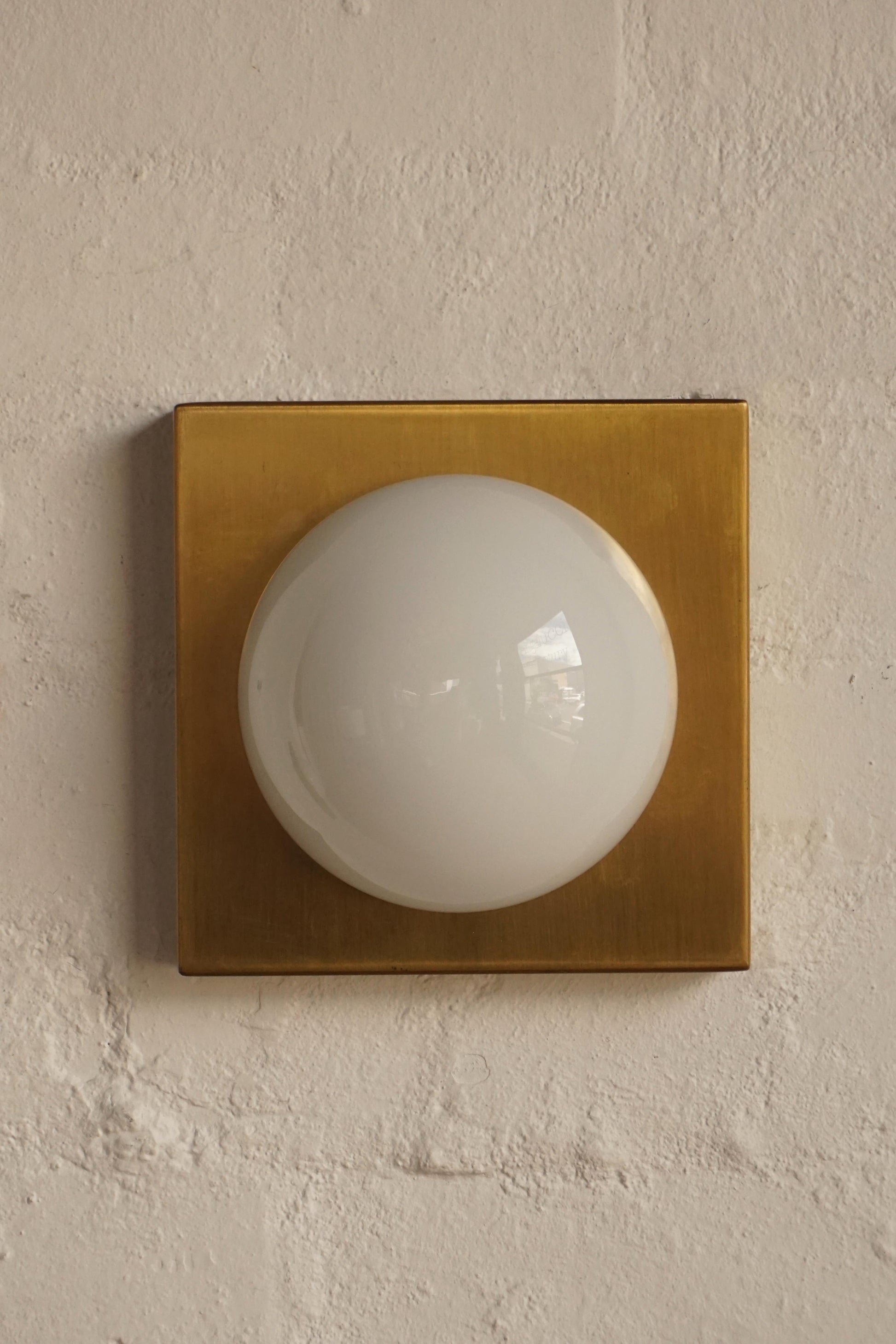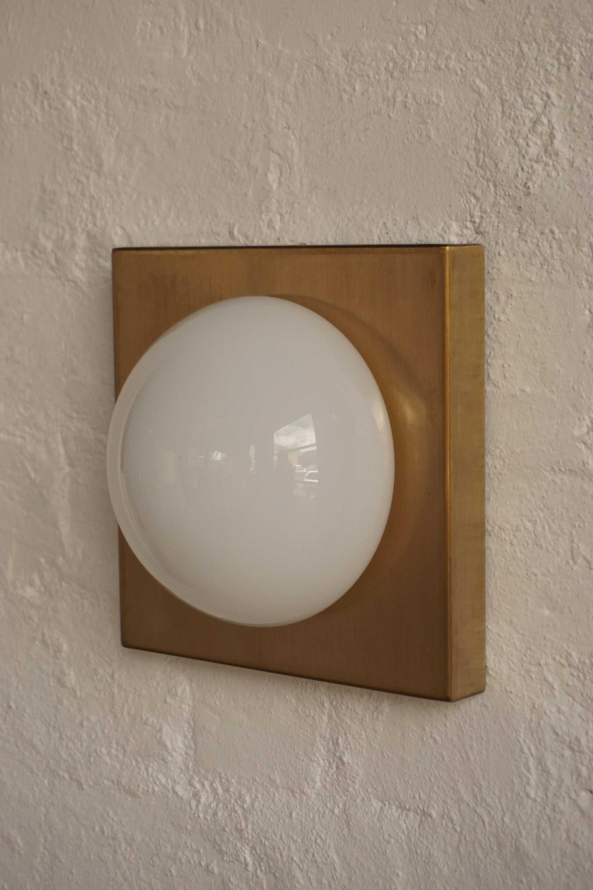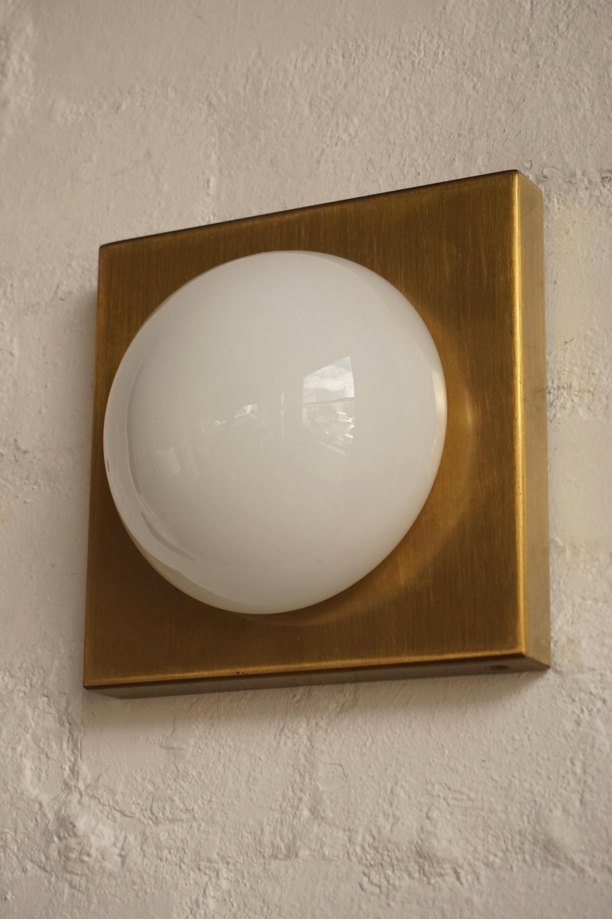 Pair of solid brass and opaline glass sconces c.1970s Europe. Purchased in Italy. Brass has been polished. Rewired to Australian Standard and ready to be hardwired in.