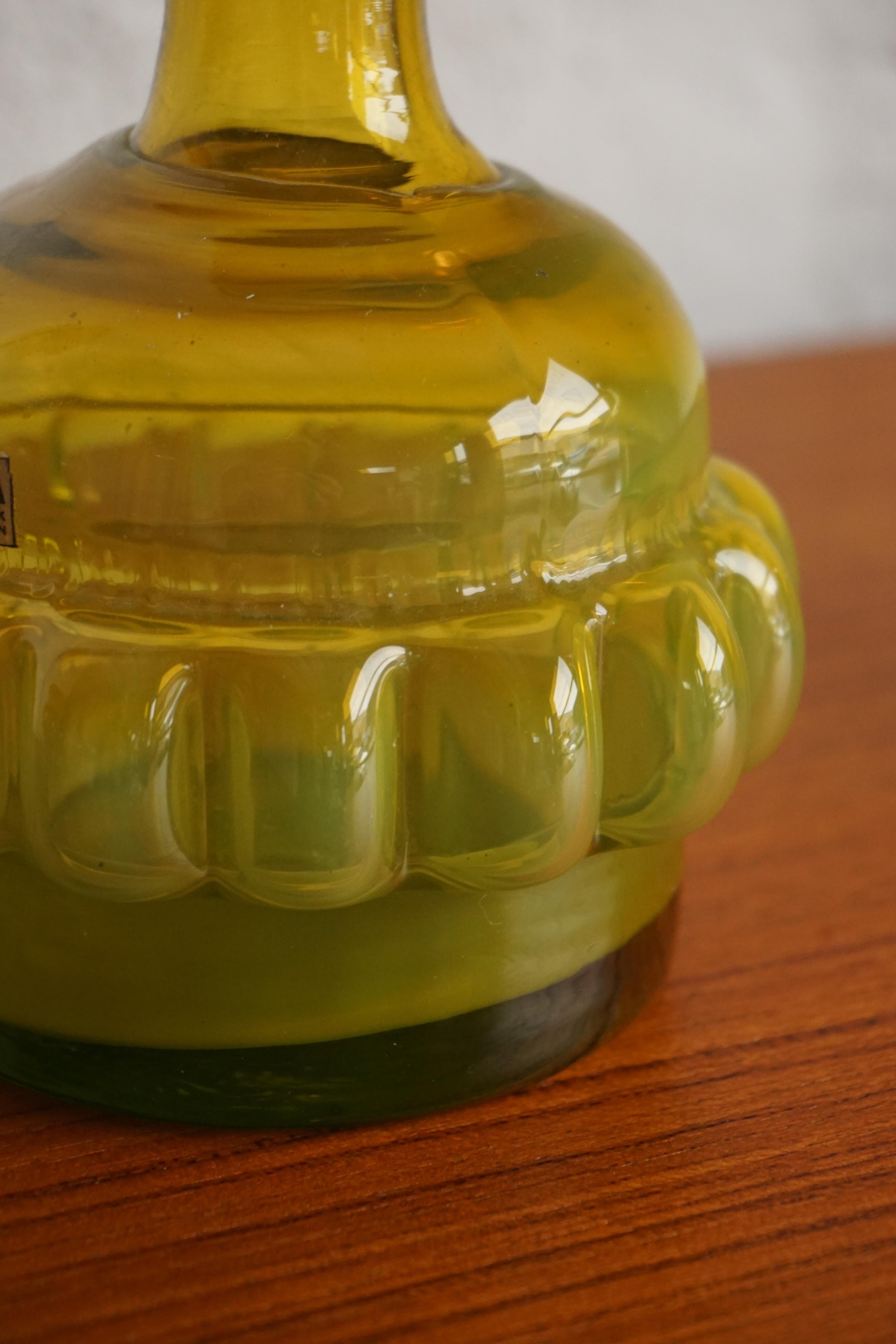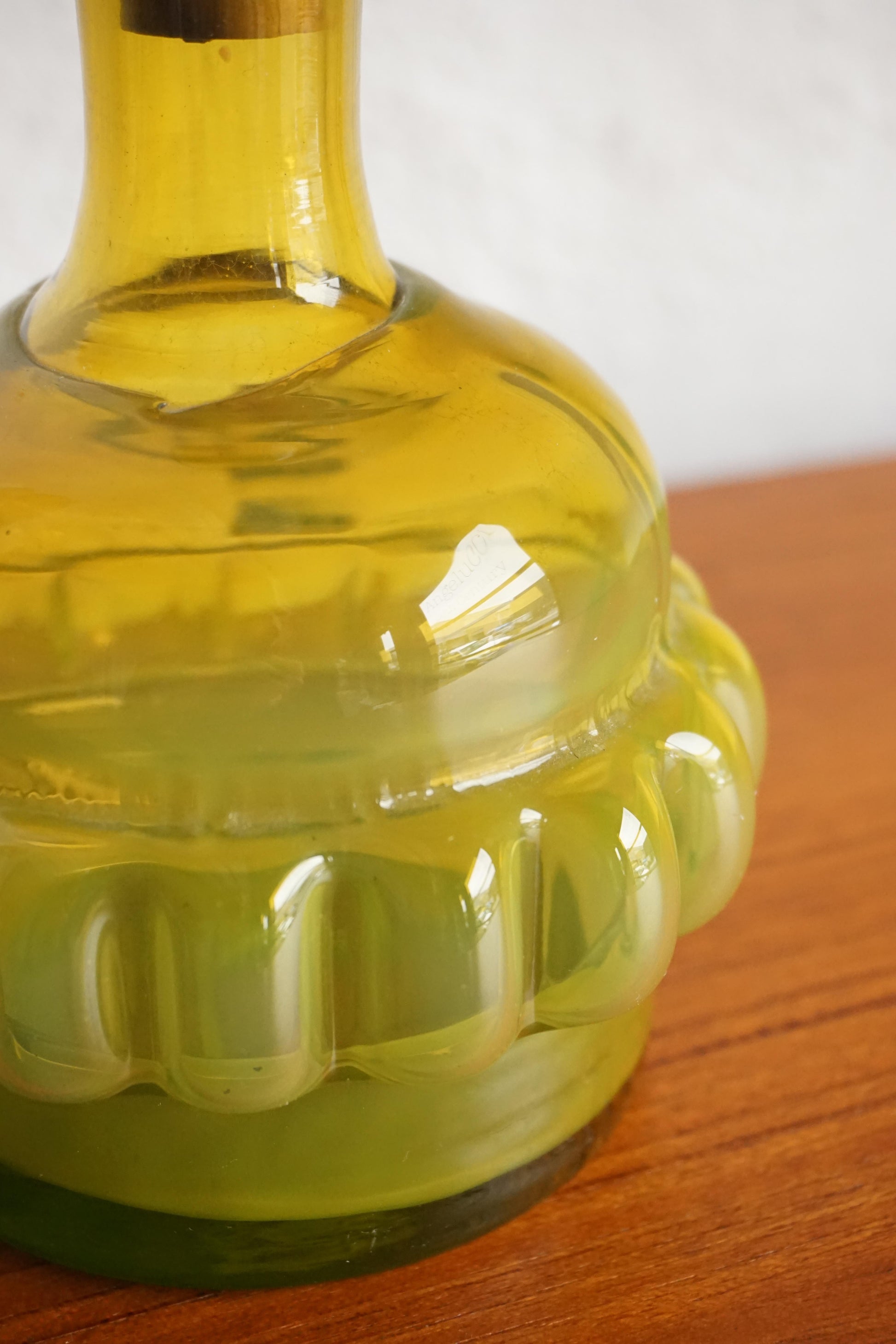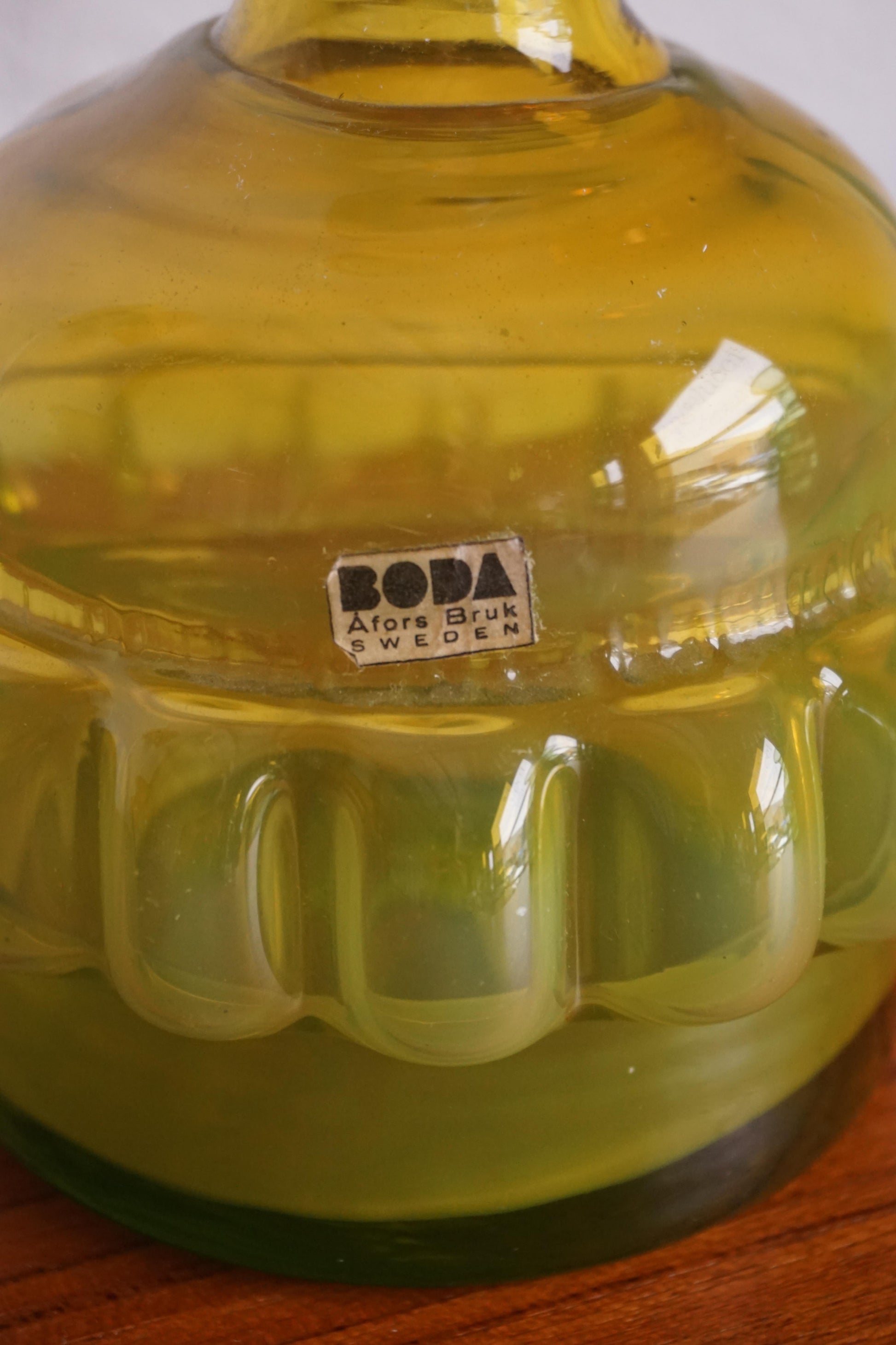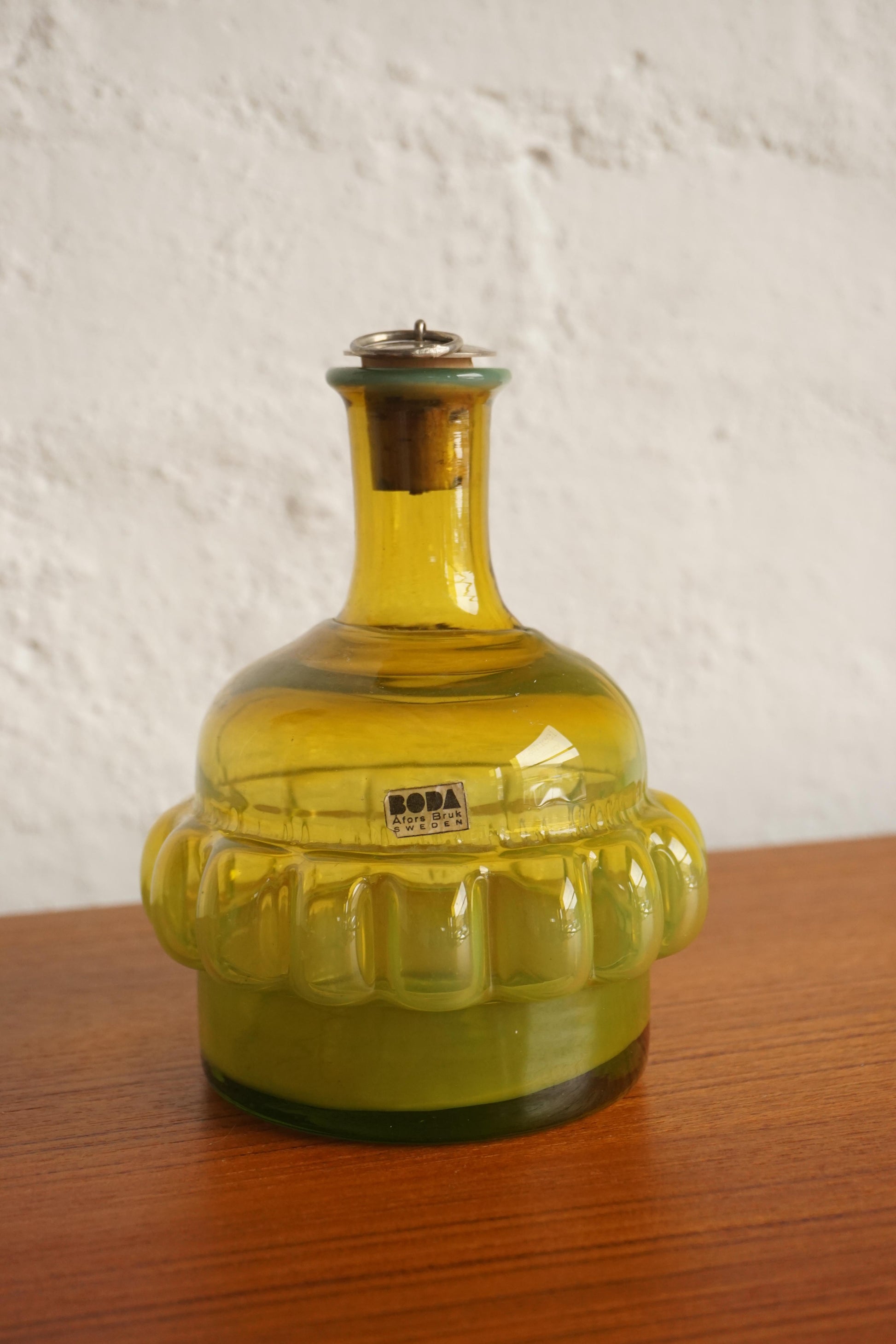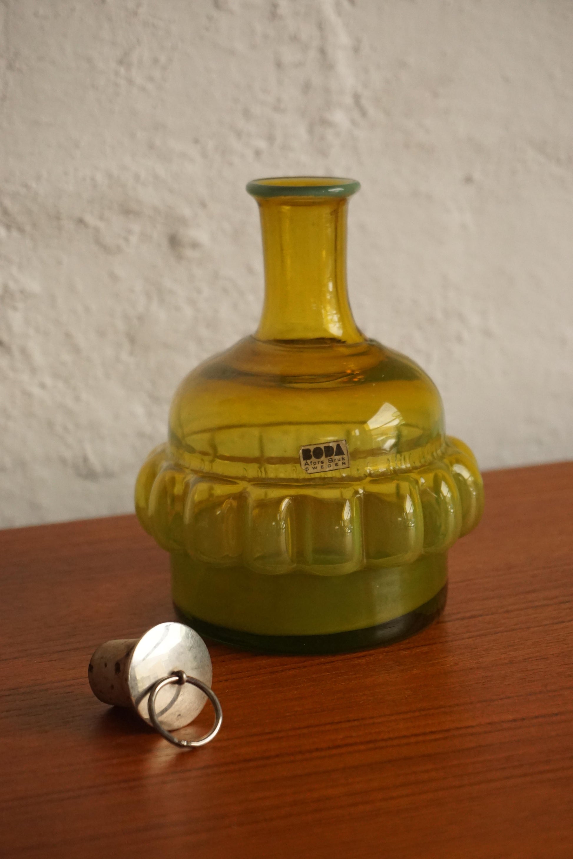 Mouth blown glass bottle by Bertil Vallien for Boda c.1960s Sweden. Green cadmium glass that glows in shades of yellow, orange and red under UV light. Original silver stopper. Incredible piece for a collector of uranium/cadmium glass.