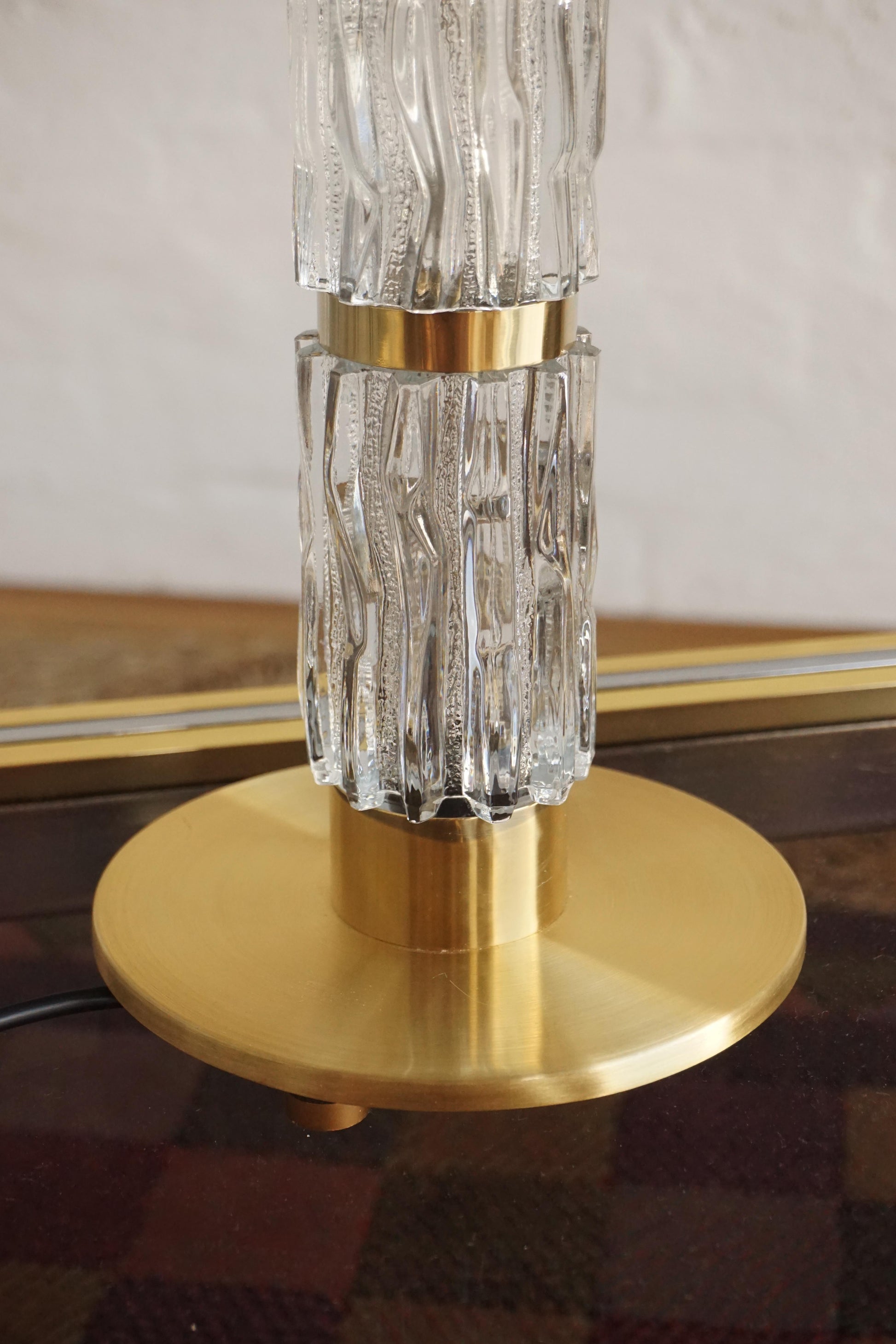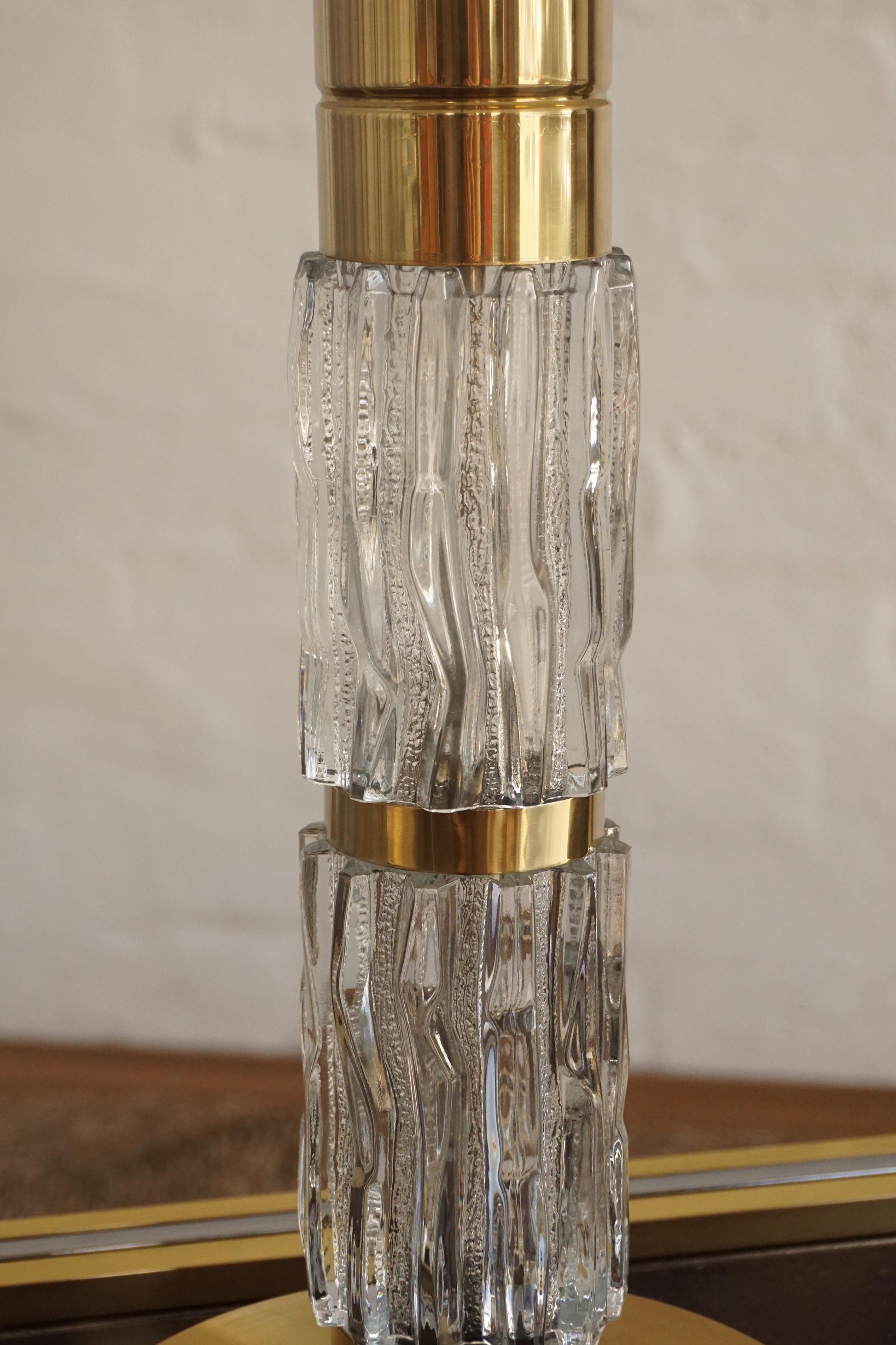 Brass and glass table lamp by Kalmar c.1960s Austria. Two textured clear glass cylinders are separated by solid brass bands and a heavy brass base. Brass has been polished. Fully rewired to Australian Standard with a new shade.