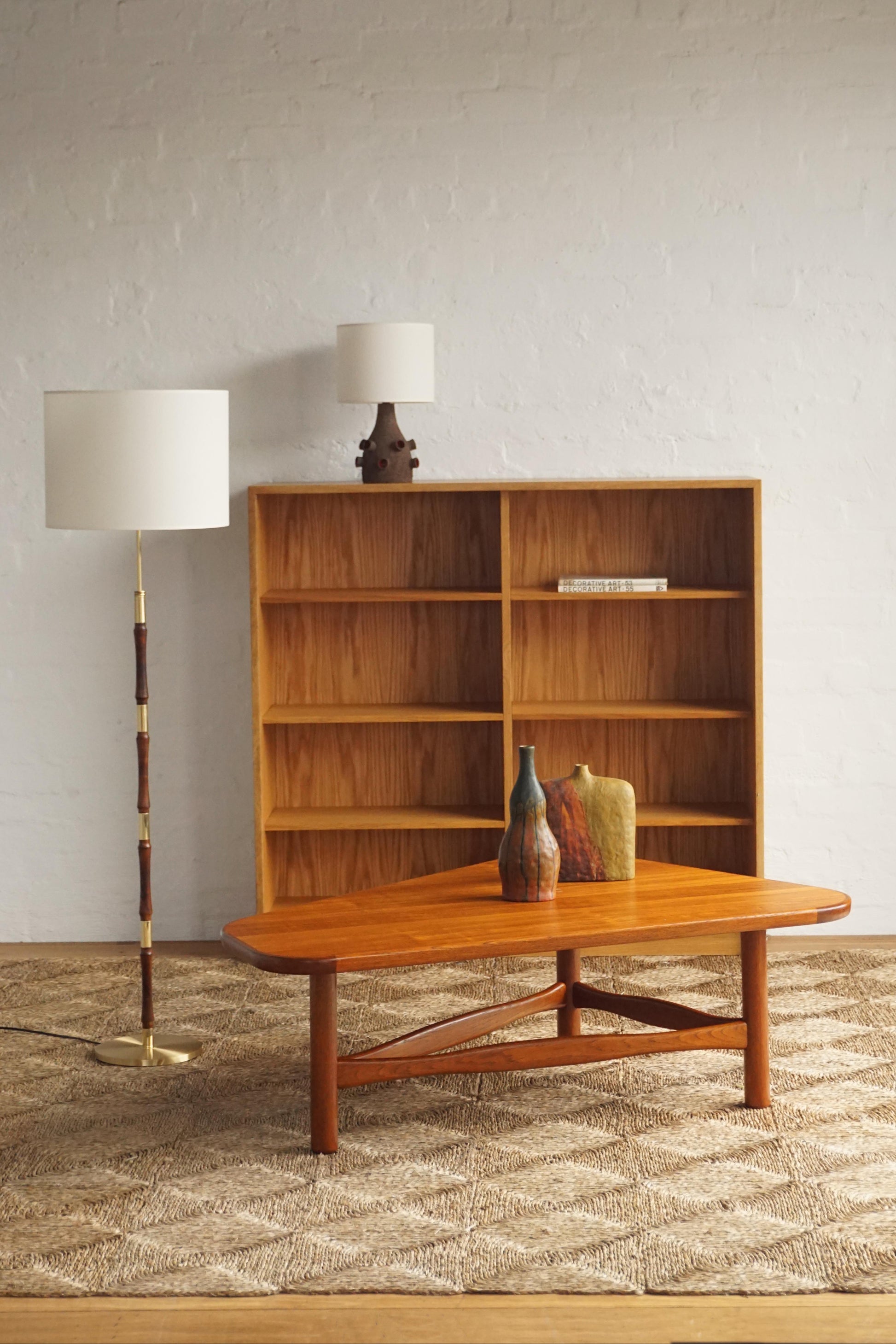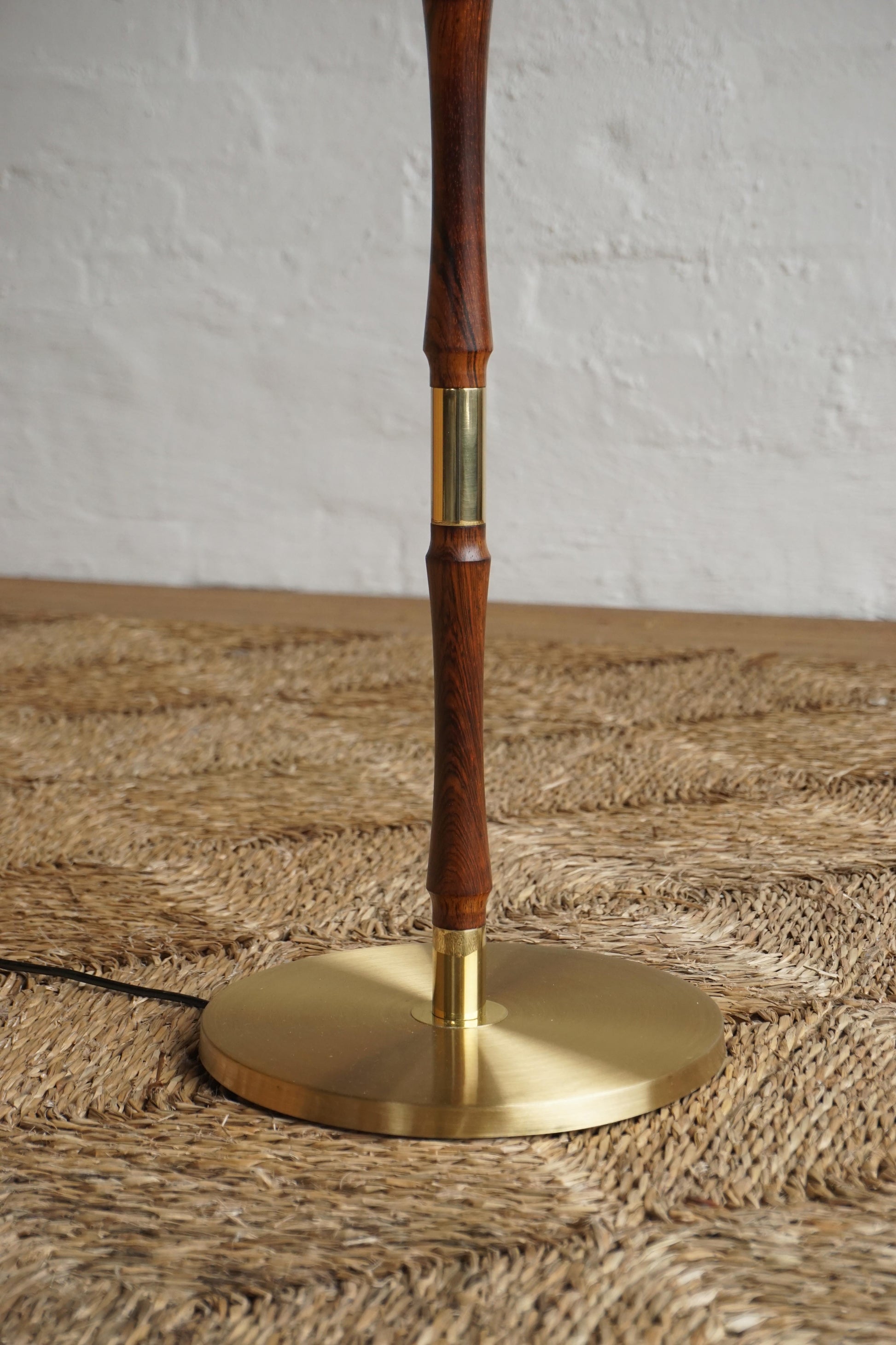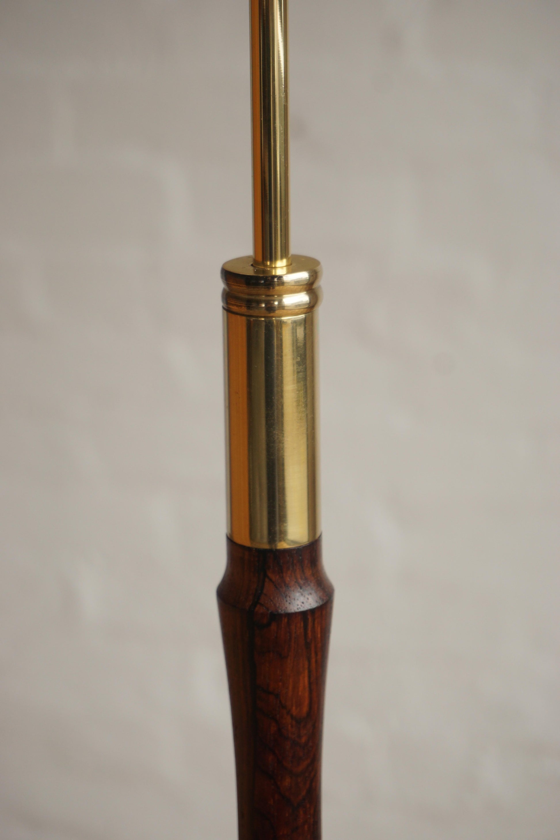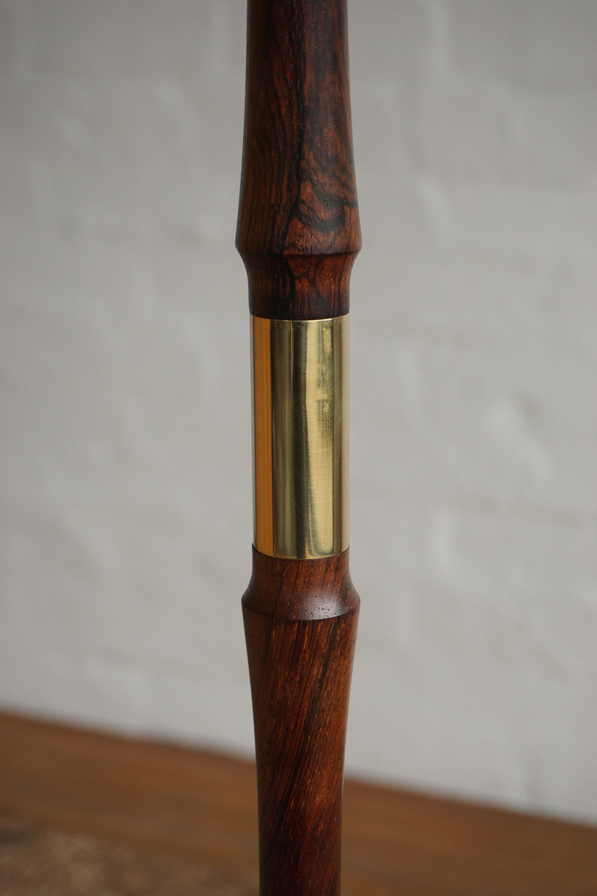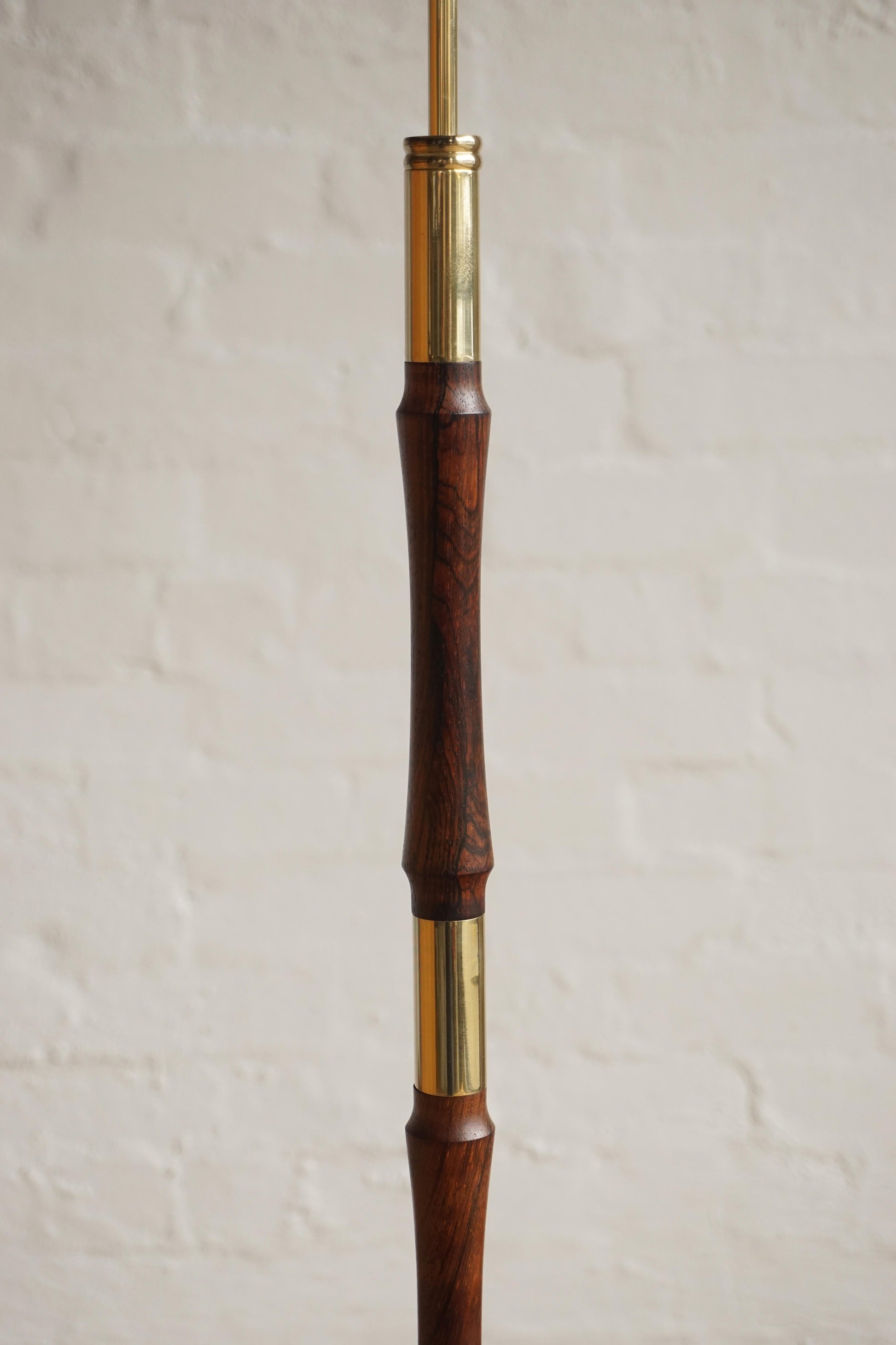 Brazilian Rosewood and brass standard lamp produced c.1960s Denmark. The rosewood has been sanded and polished, the brass details have been polished. Adjustable in height. Fully rewired to Australian standard with new canvas shade.