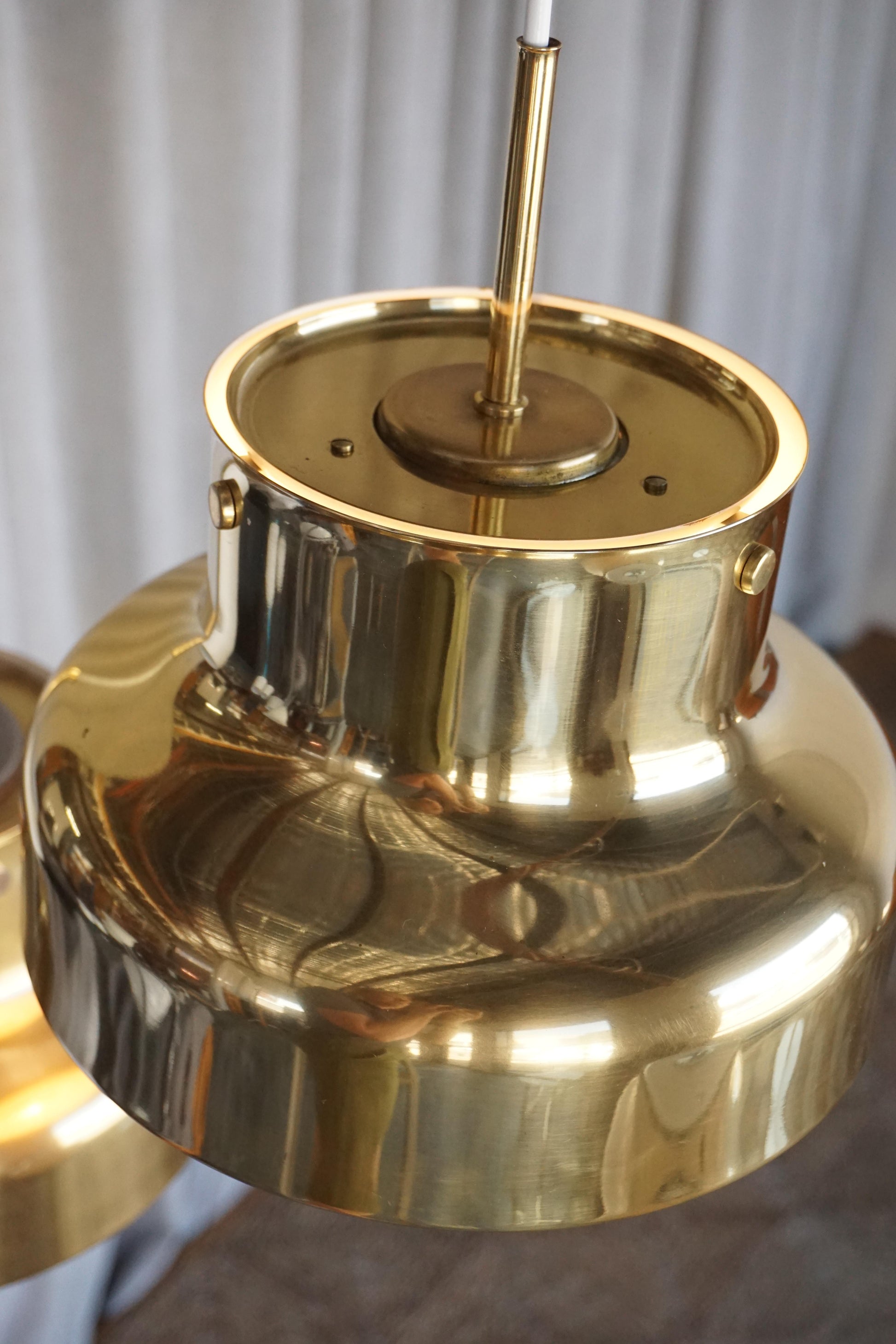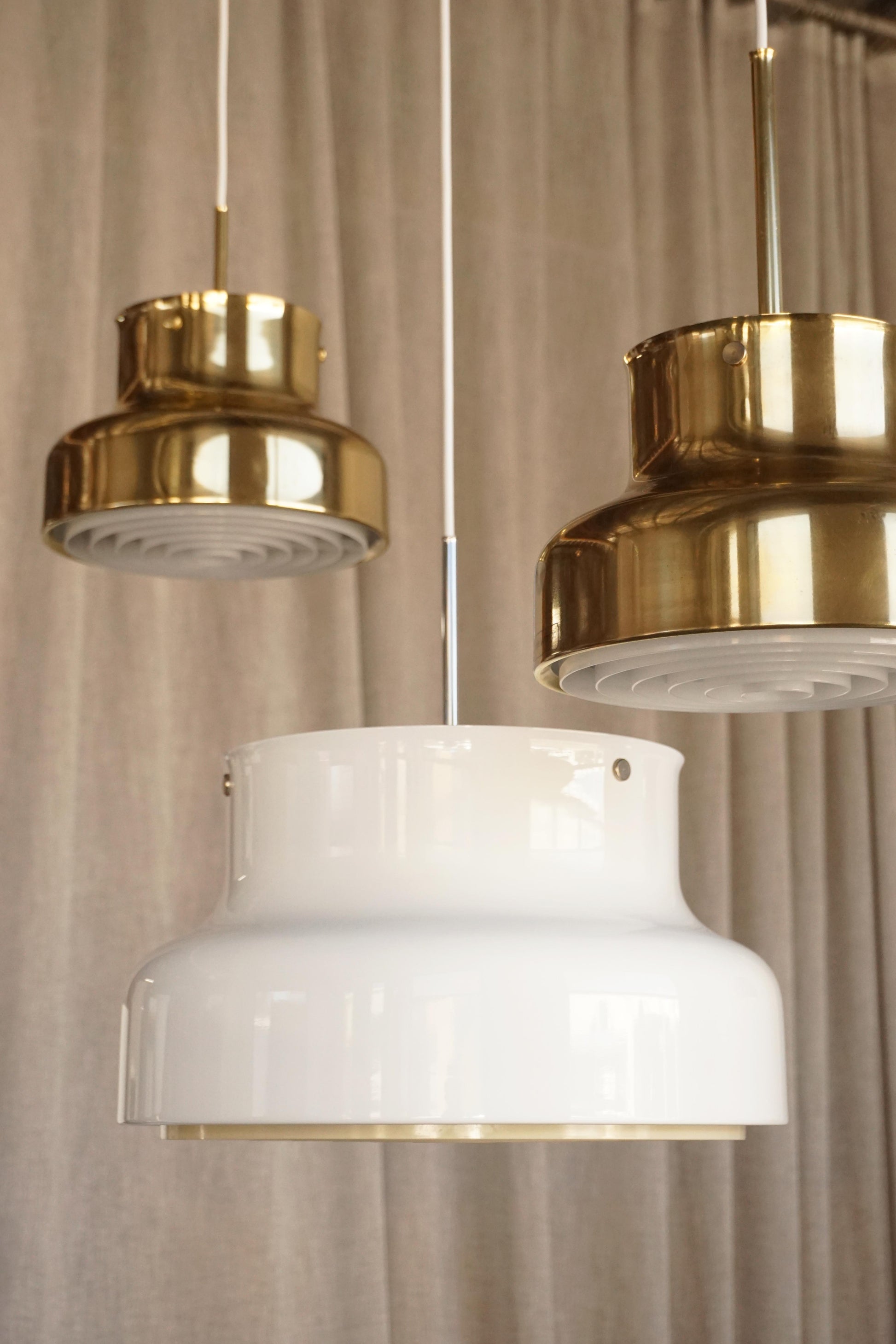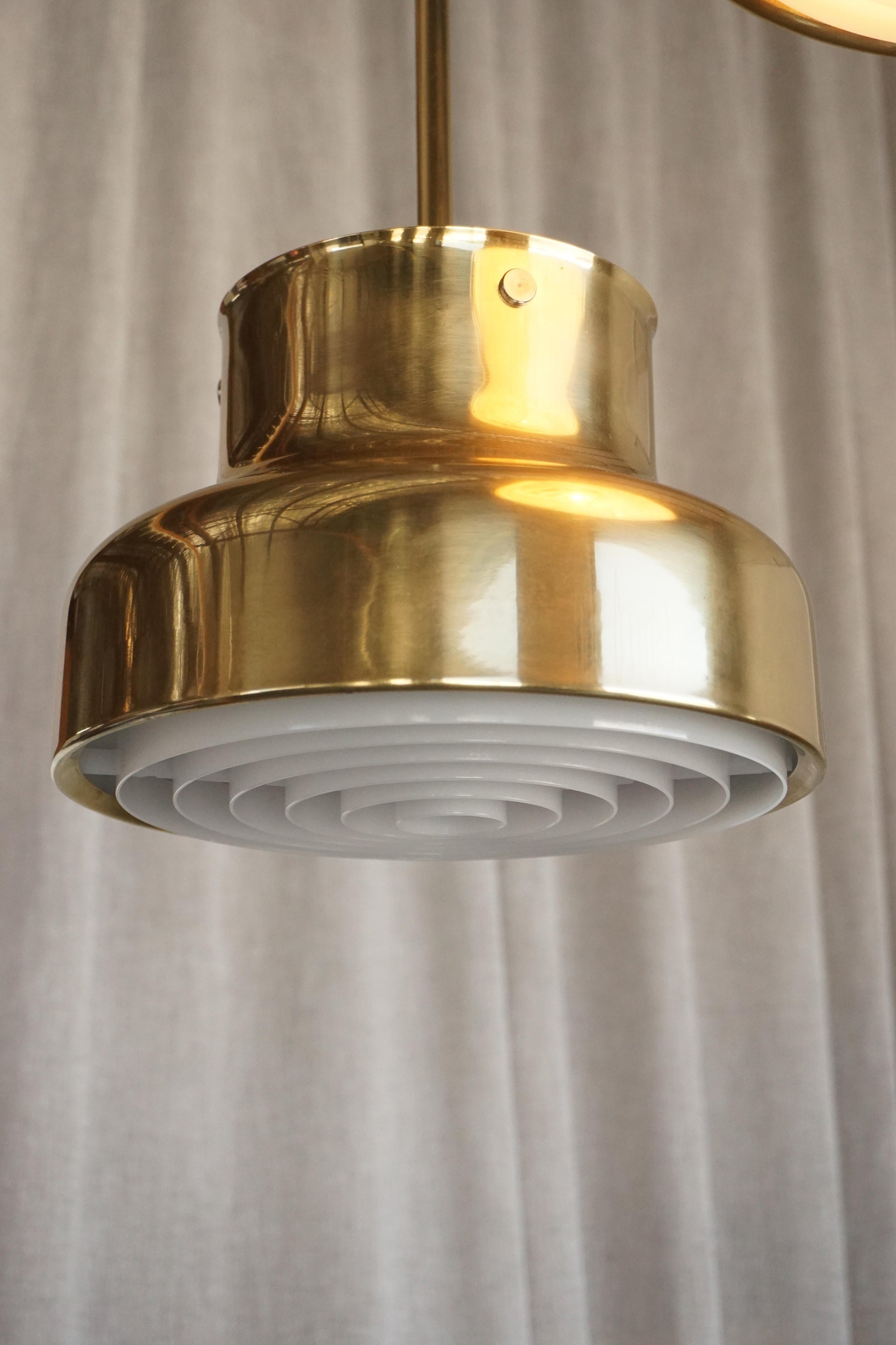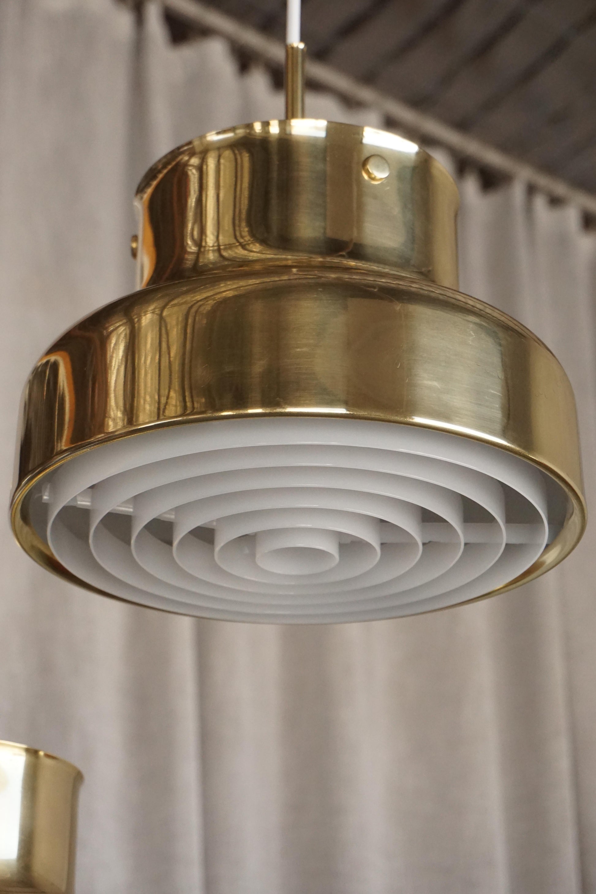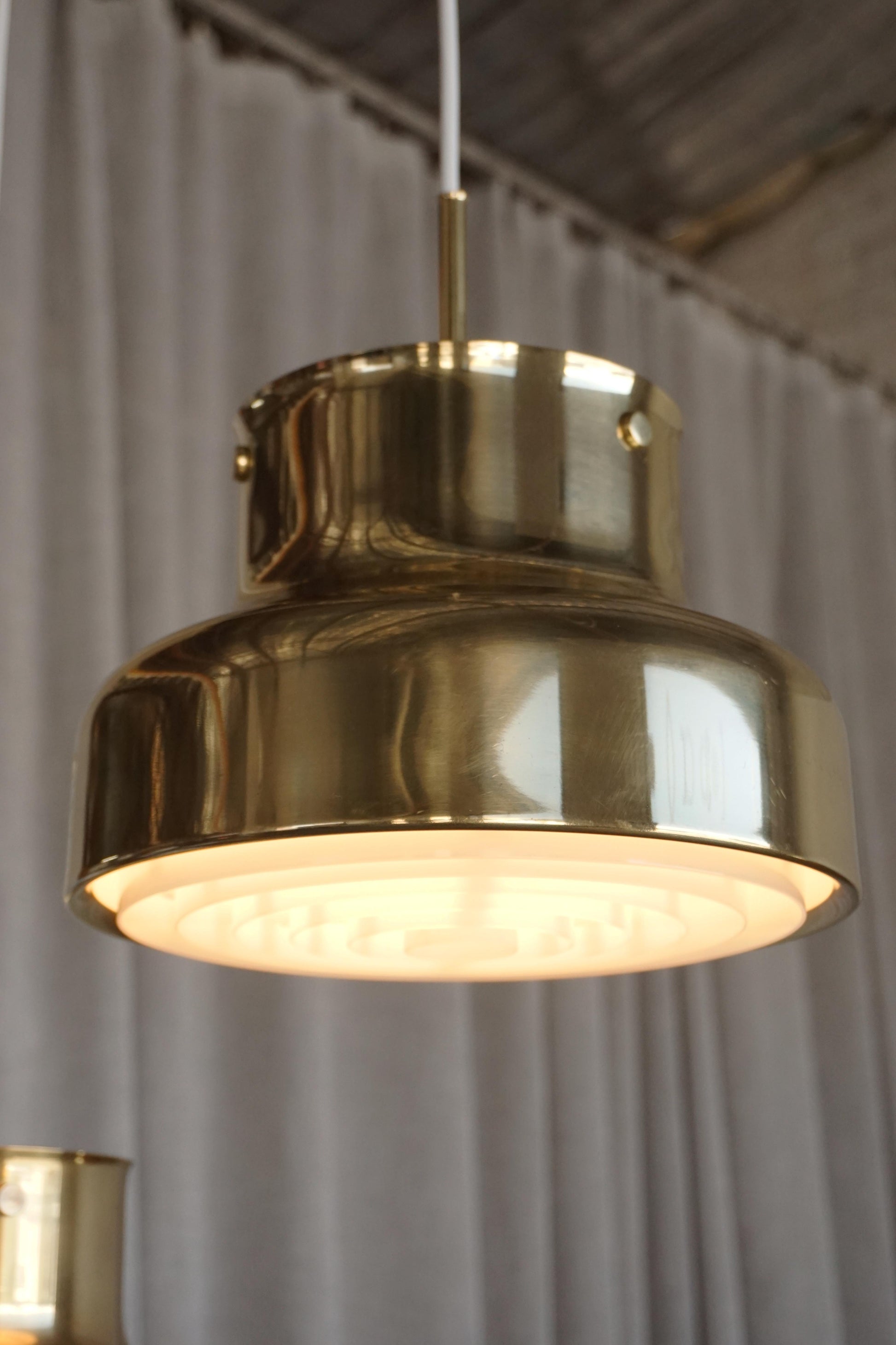 Brass 'Bumling' pendants designed by Anders Persson for Atelje Lyktan c.1970s Sweden. Solid brass. Central perspex diffuser. Fully rewired to Australian standard with 2m white flex.