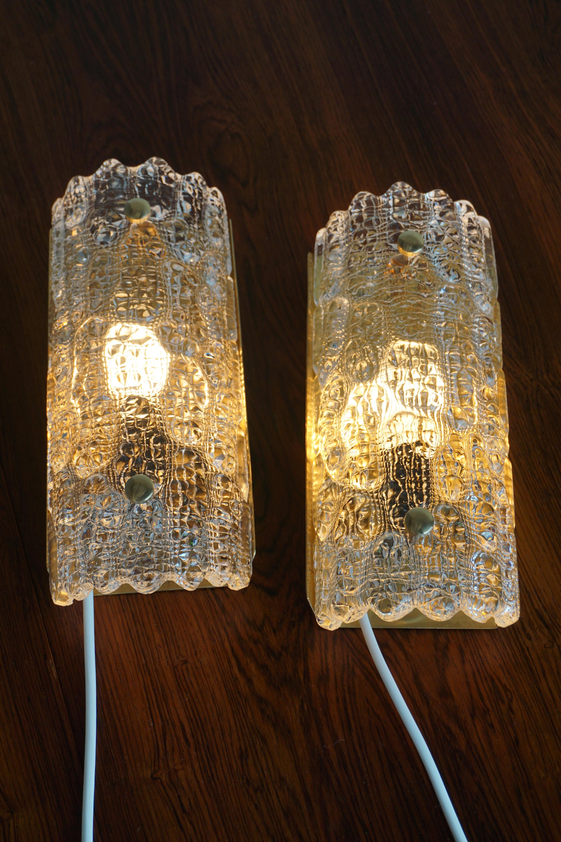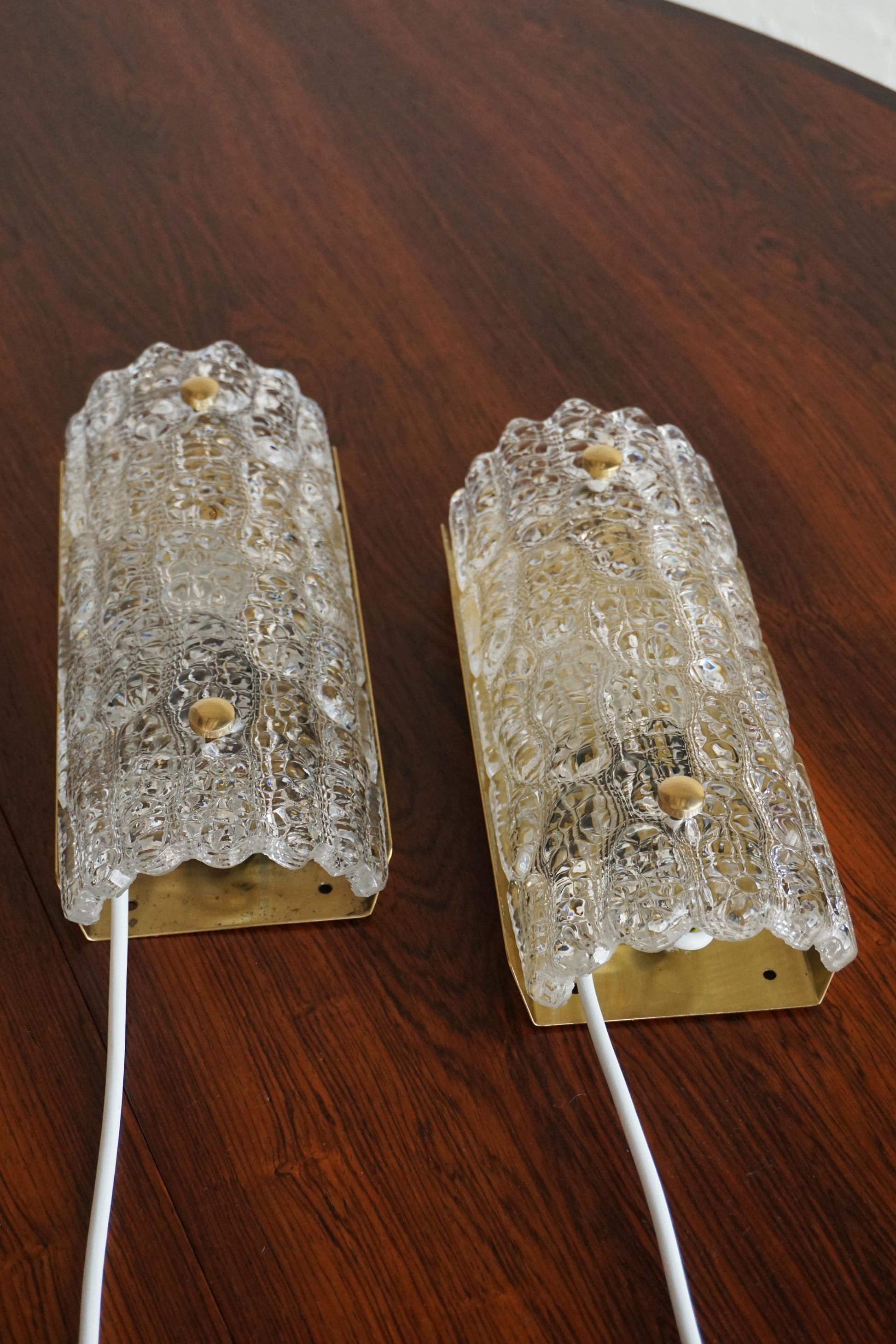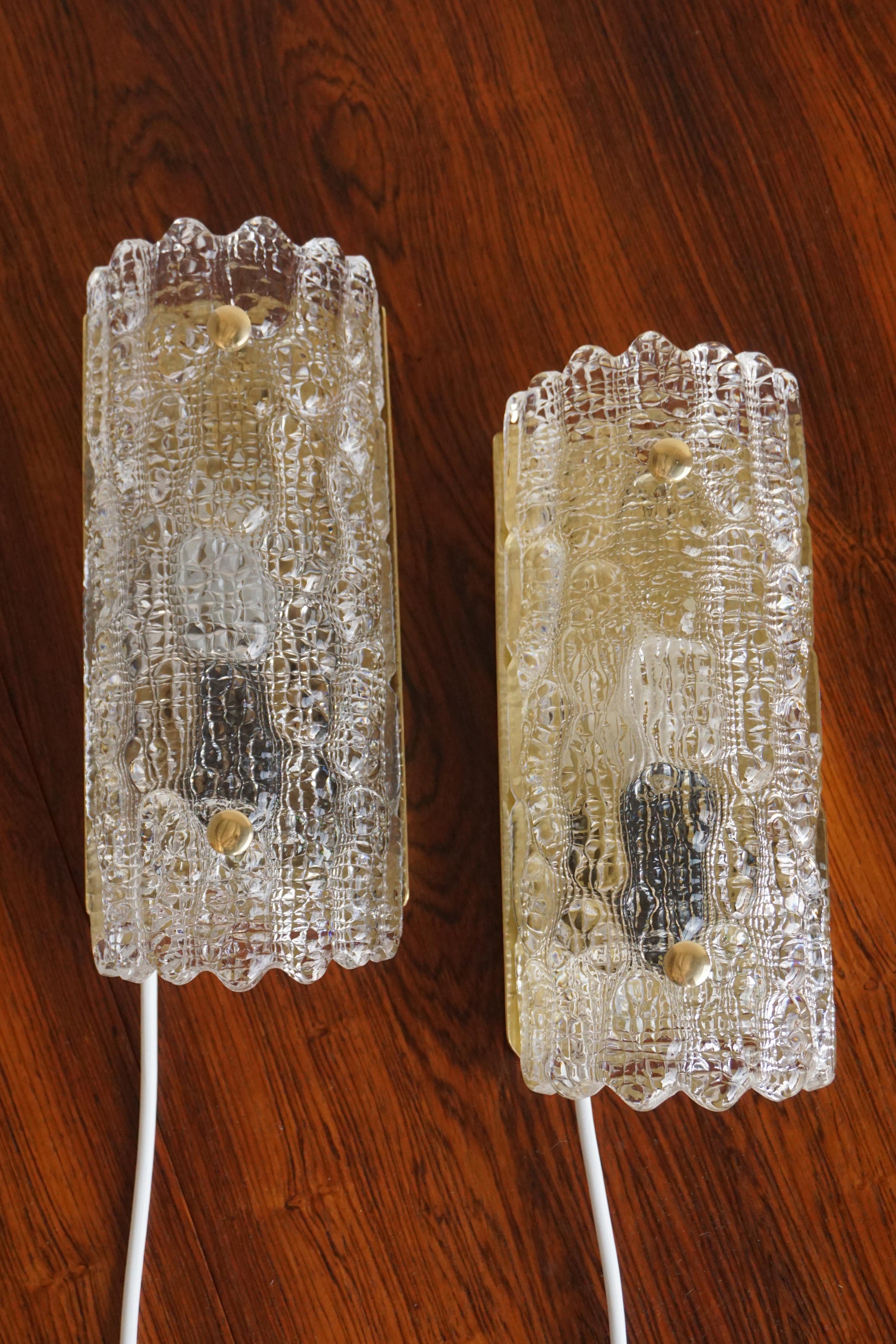 Pair of sconces designed by Carl Fagerlund for Lyfa c.1960s Sweden. Original moulded glass by Orrefors. The brass backing plate and hardware has been polished. Fully rewired to Australian Standard.