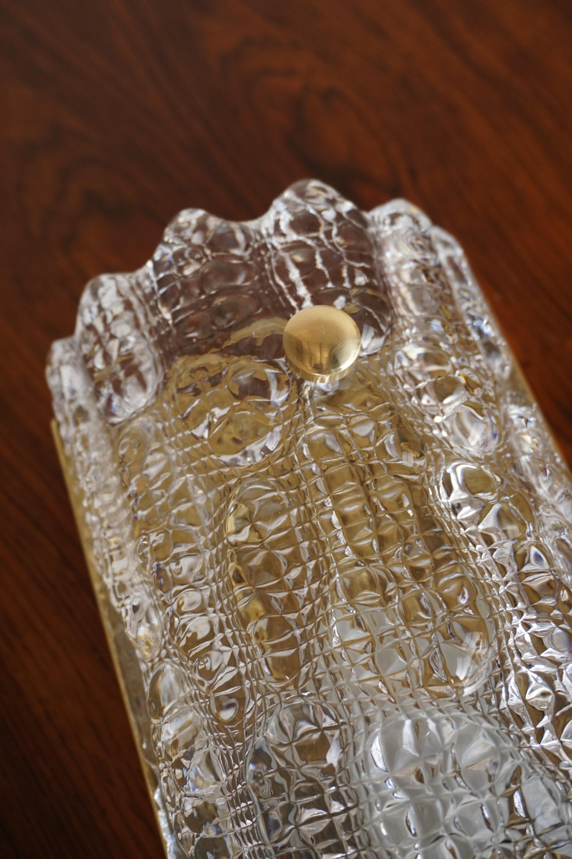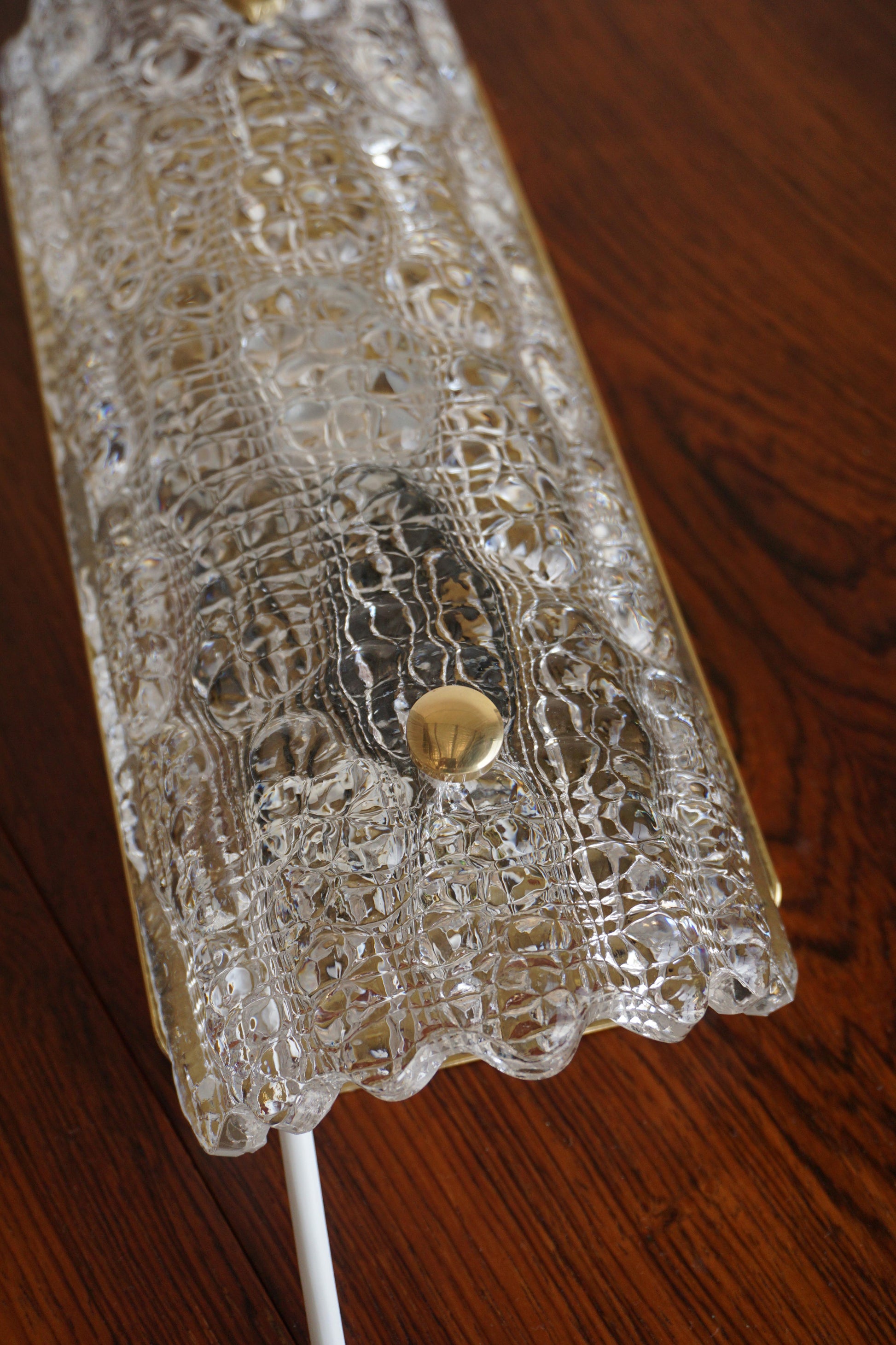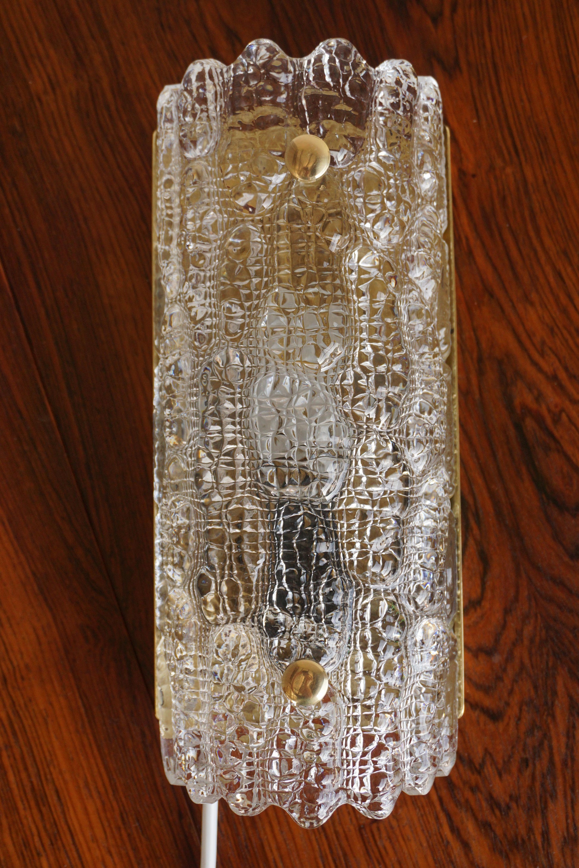 Pair of sconces designed by Carl Fagerlund for Lyfa c.1960s Sweden. Original moulded glass by Orrefors. The brass backing plate and hardware has been polished. Fully rewired to Australian Standard.