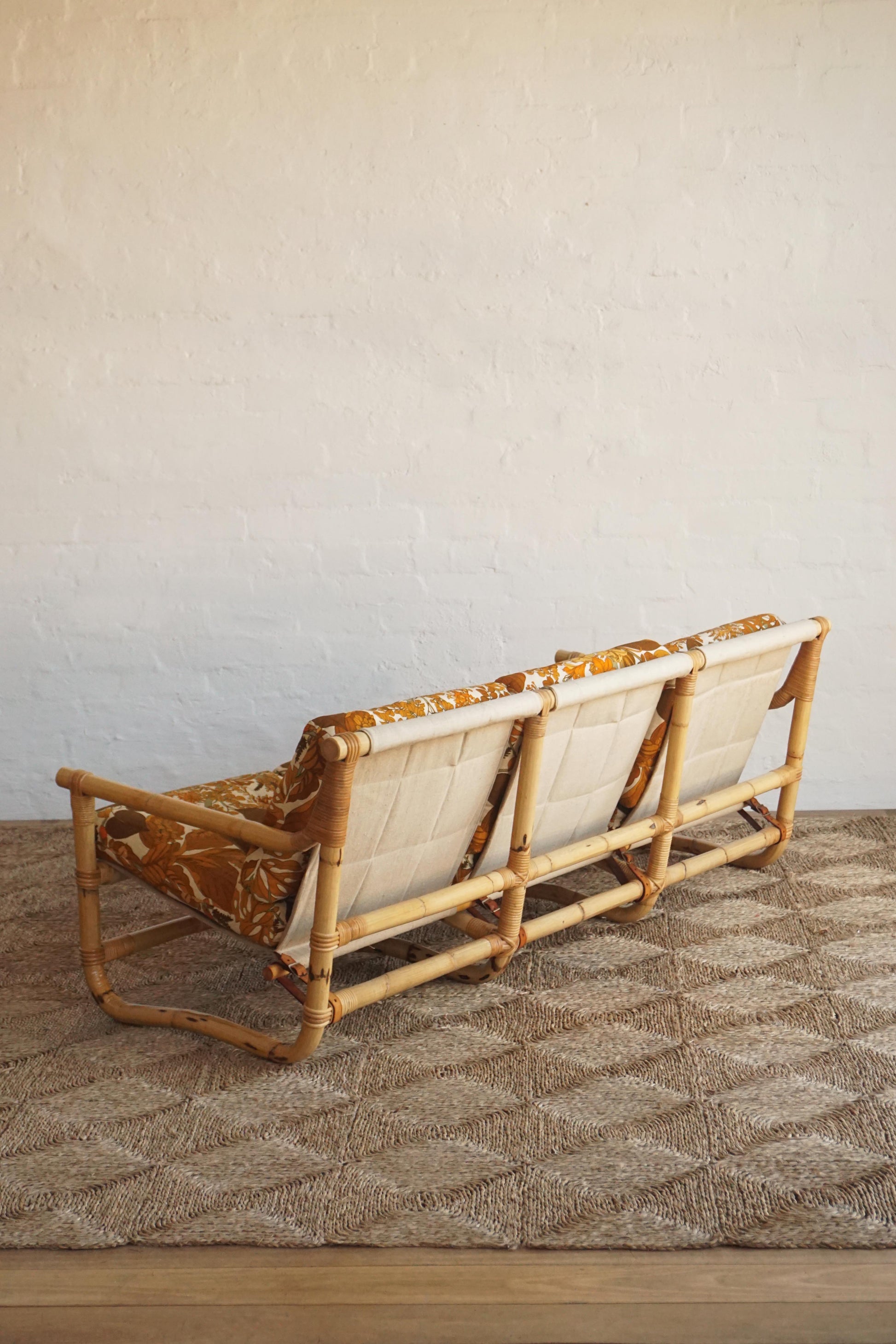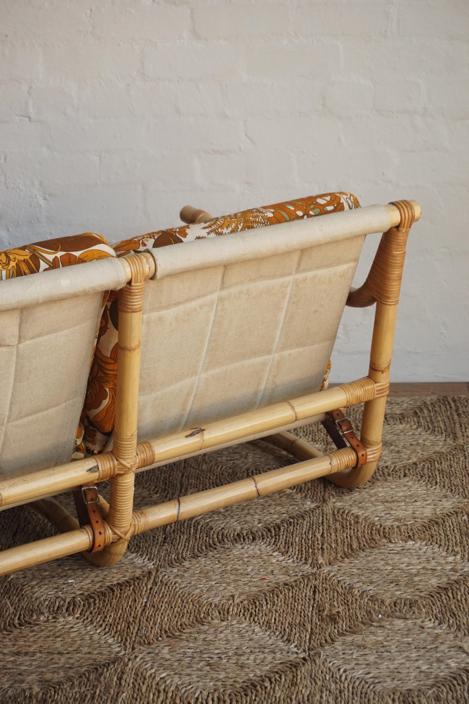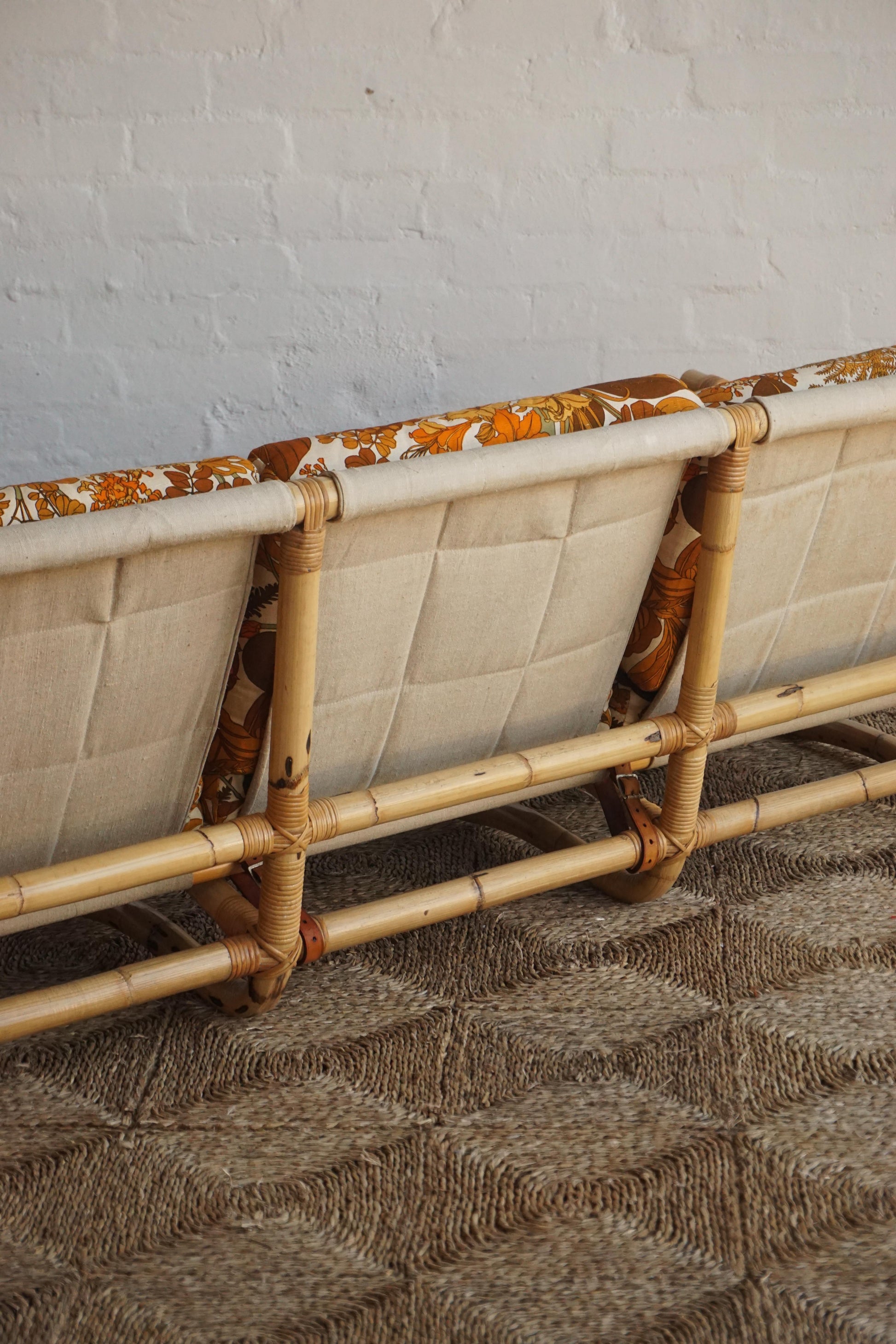 Bamboo three seater sofa c.1970s Denmark. Original upholstery with Belgian linen sling and leather straps with brass buckles. Bamboo has been cleaned and lacquered.