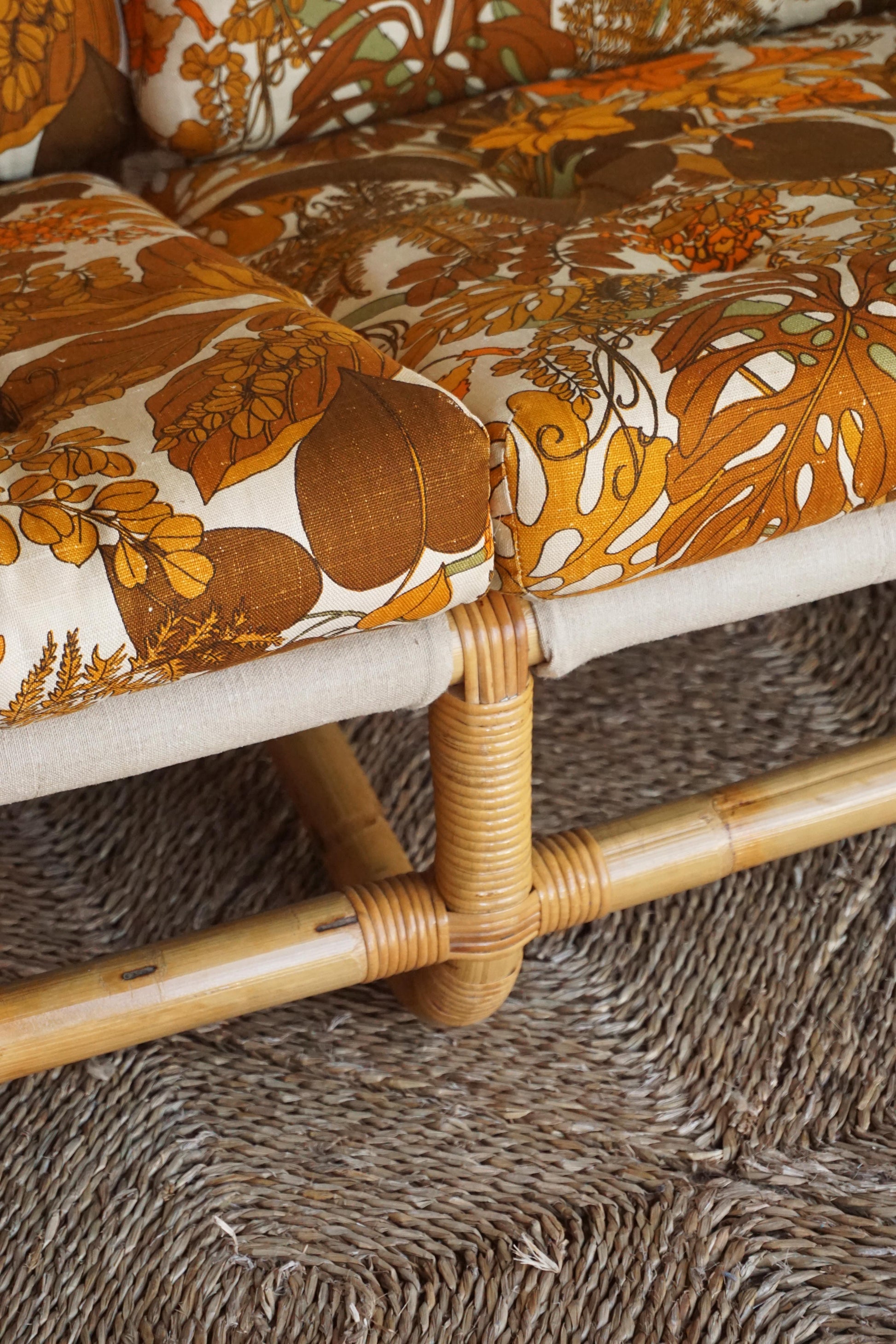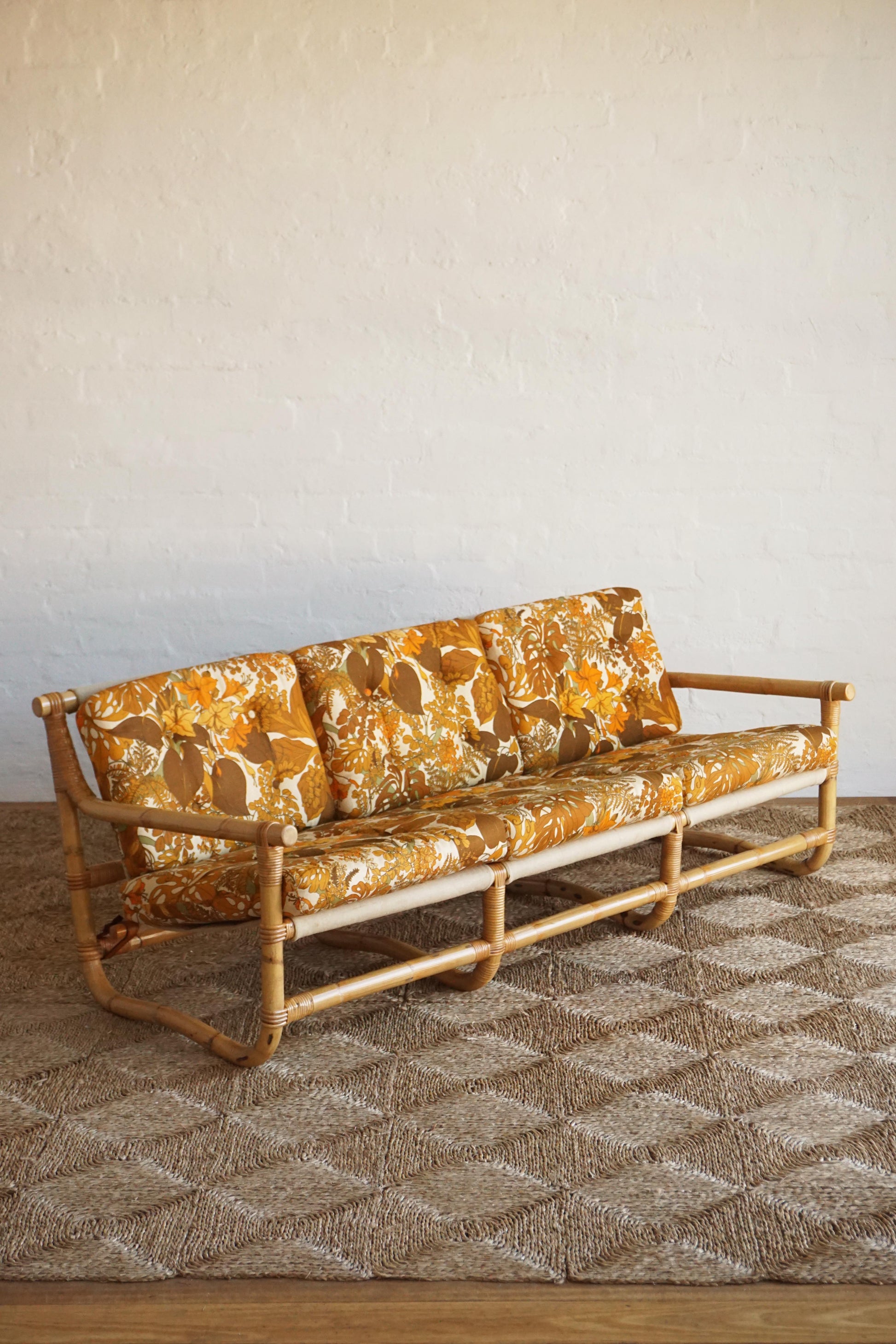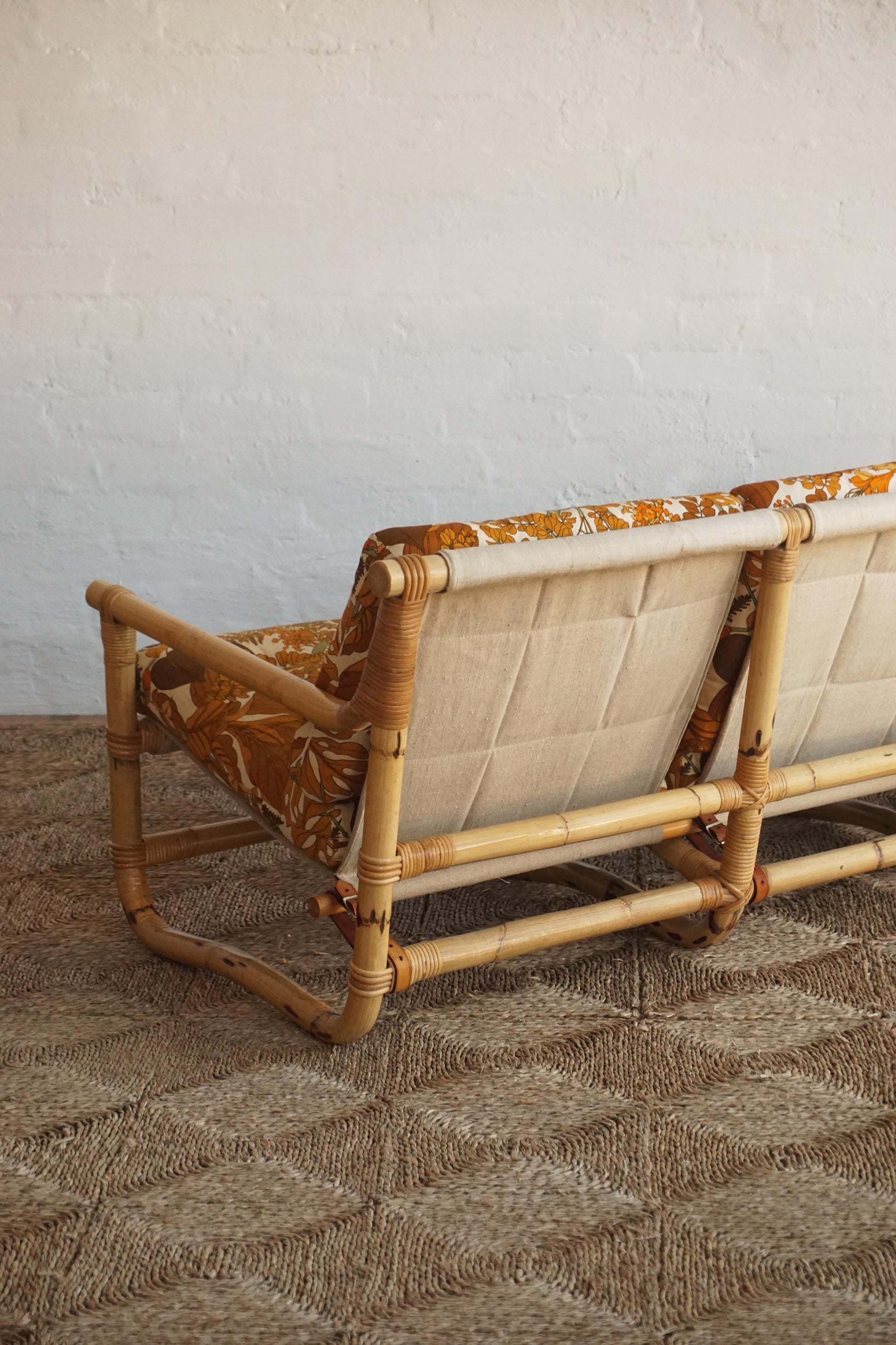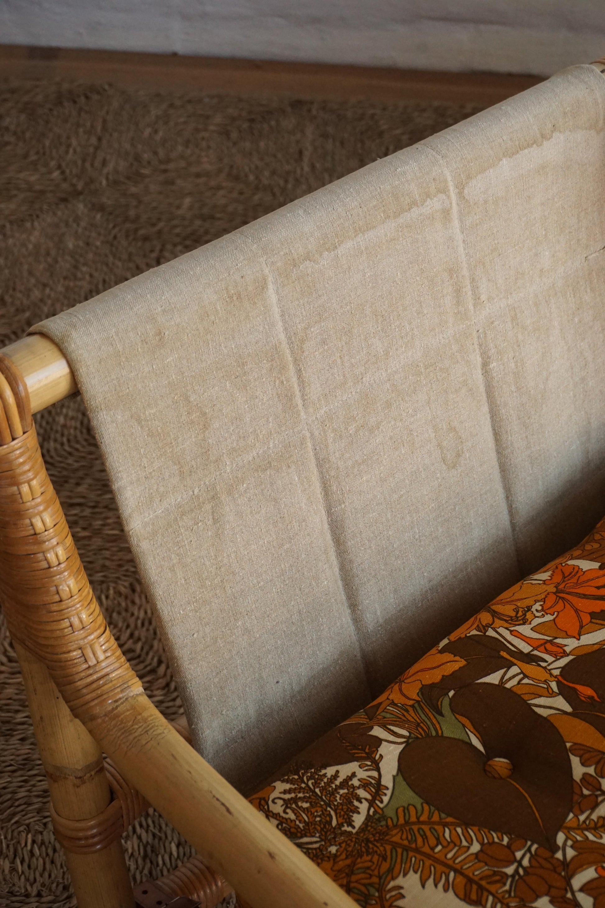 Bamboo three seater sofa c.1970s Denmark. Original upholstery with Belgian linen sling and leather straps with brass buckles. Bamboo has been cleaned and lacquered.