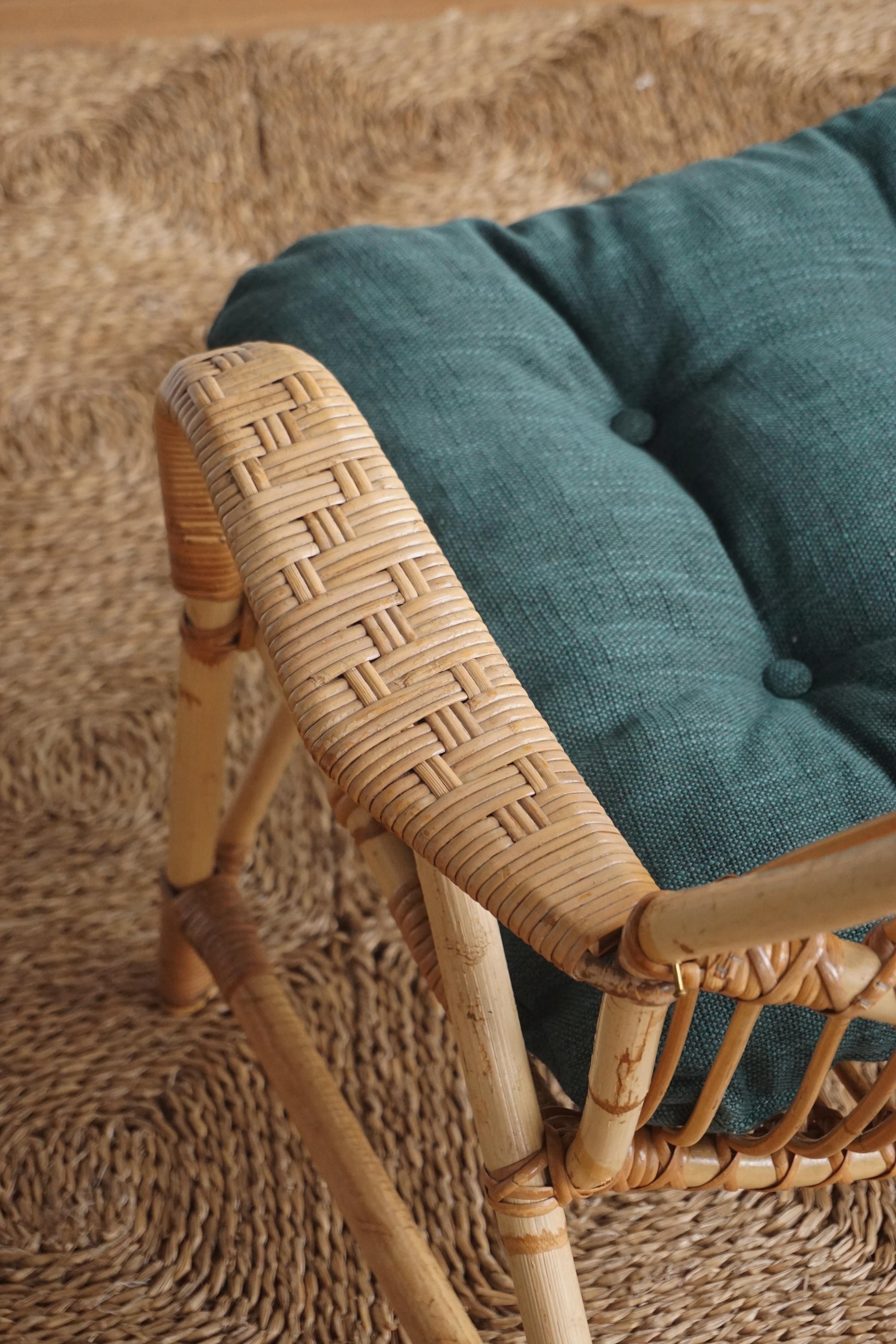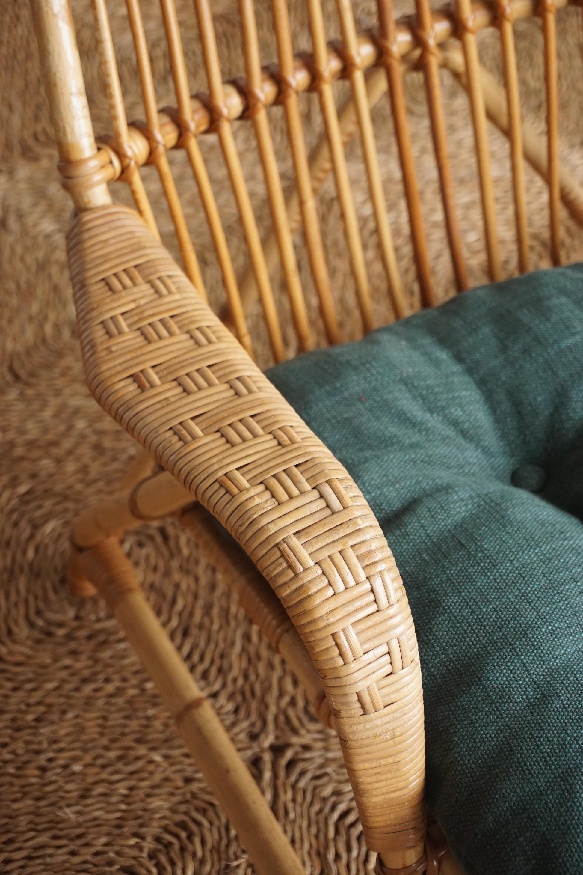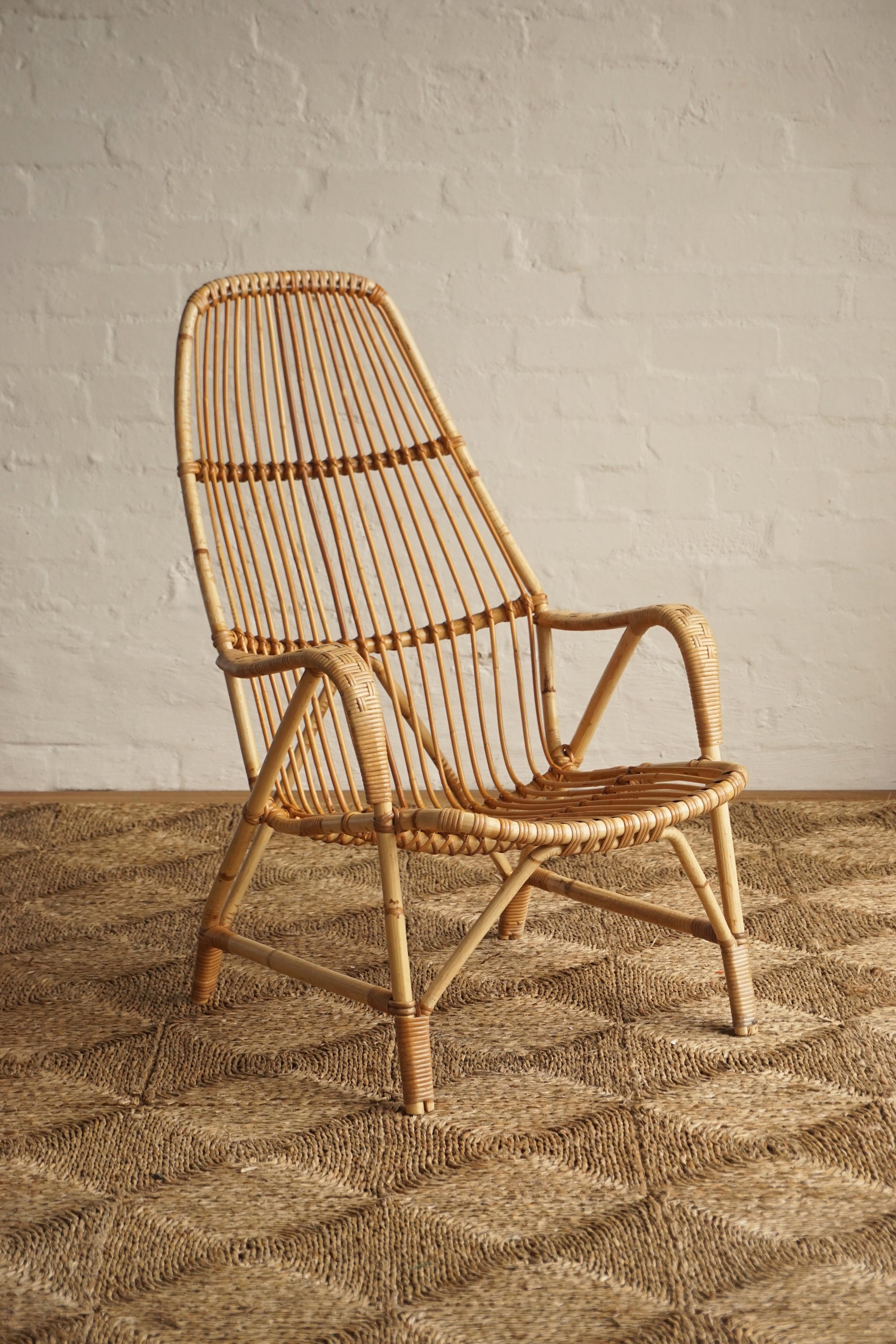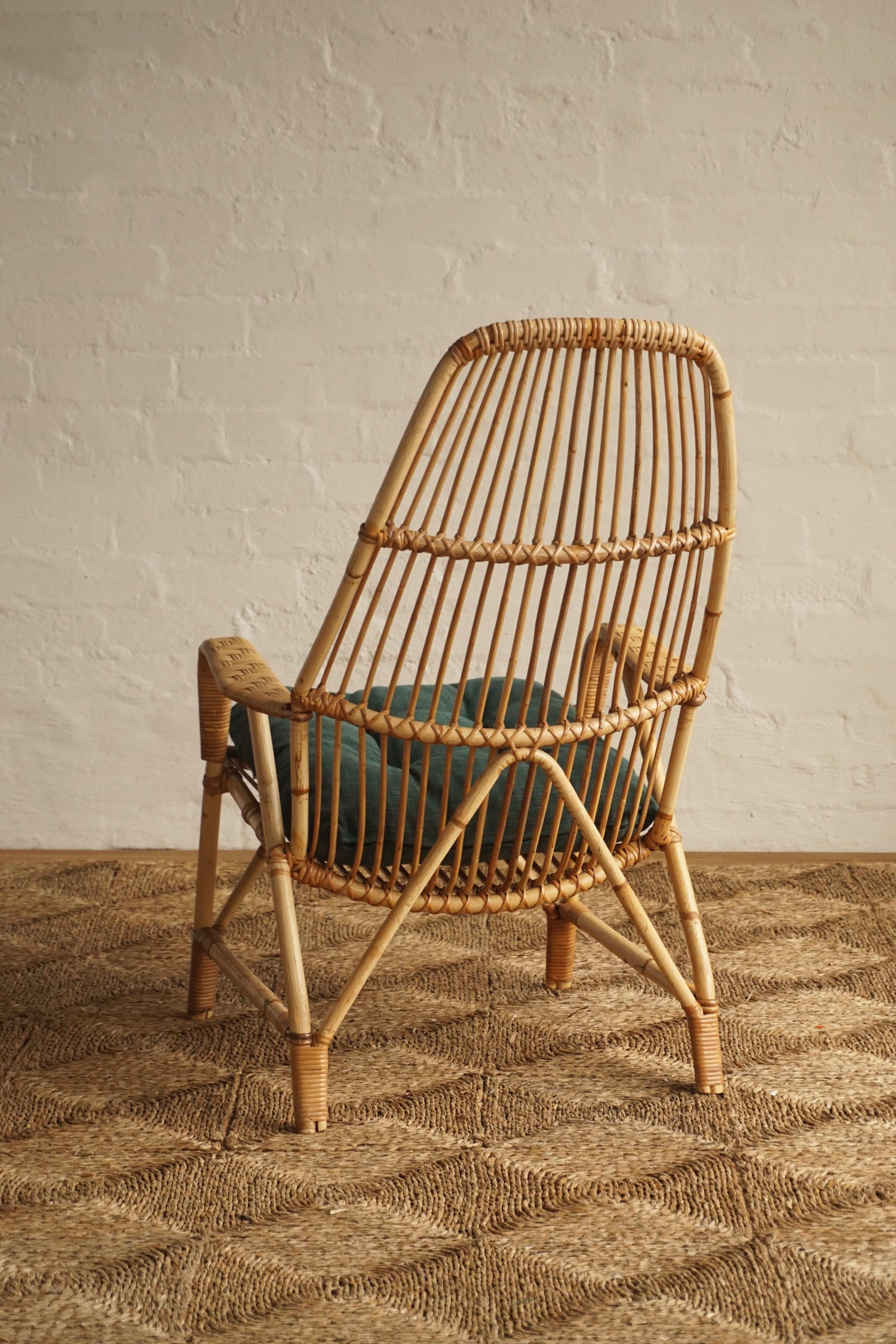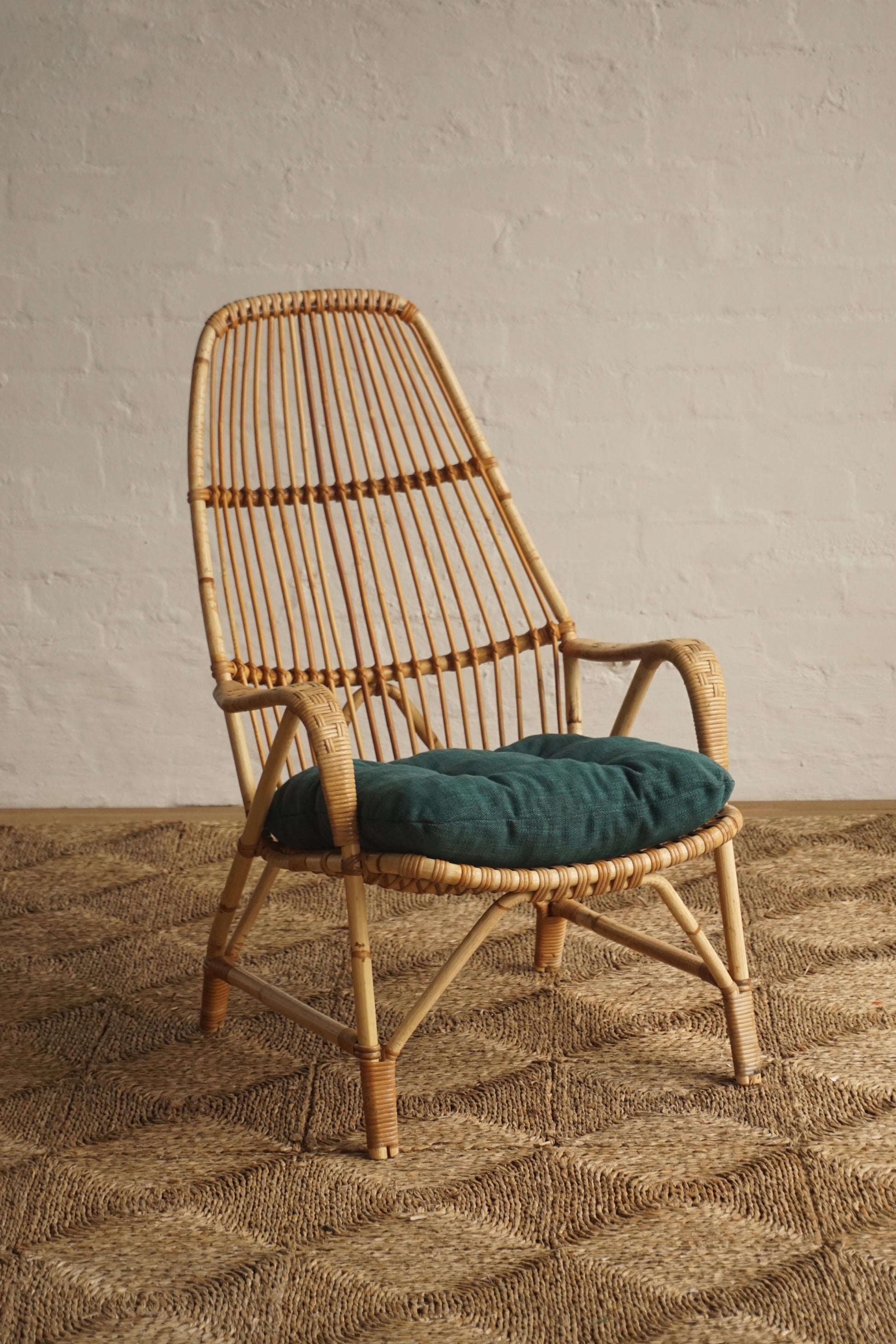 High back cane lounge chair c.1950s Denmark. Newly upholstered seat cushion. The frame has been cleaned and finished in a clear lacquer. In good vintage condition.