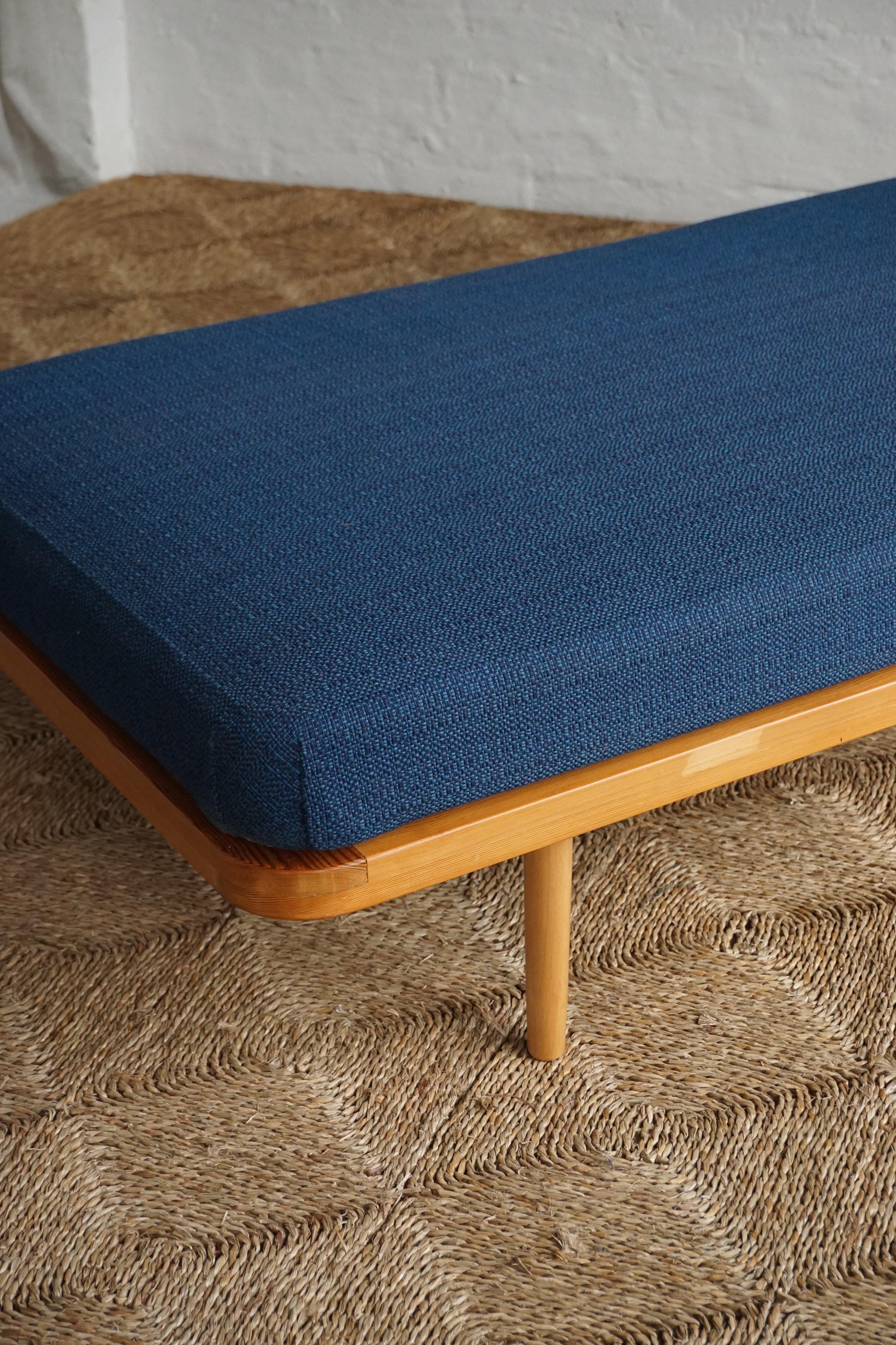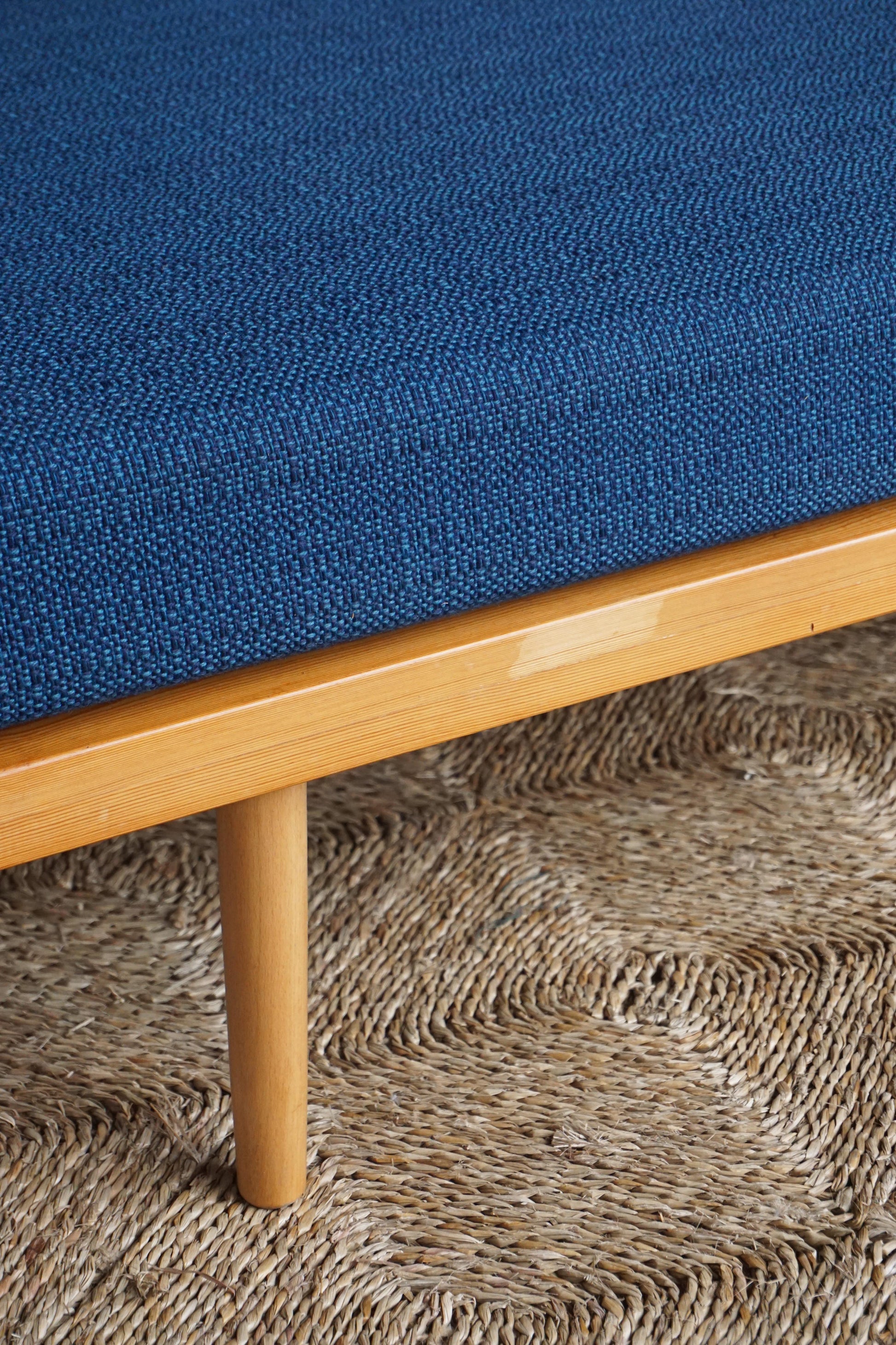 Scandinavian pine daybed c.1970s Denmark. Original steel spring cushion and royal blue wool upholstery. Frame has been cleaned and waxed. Two matching daybeds available.