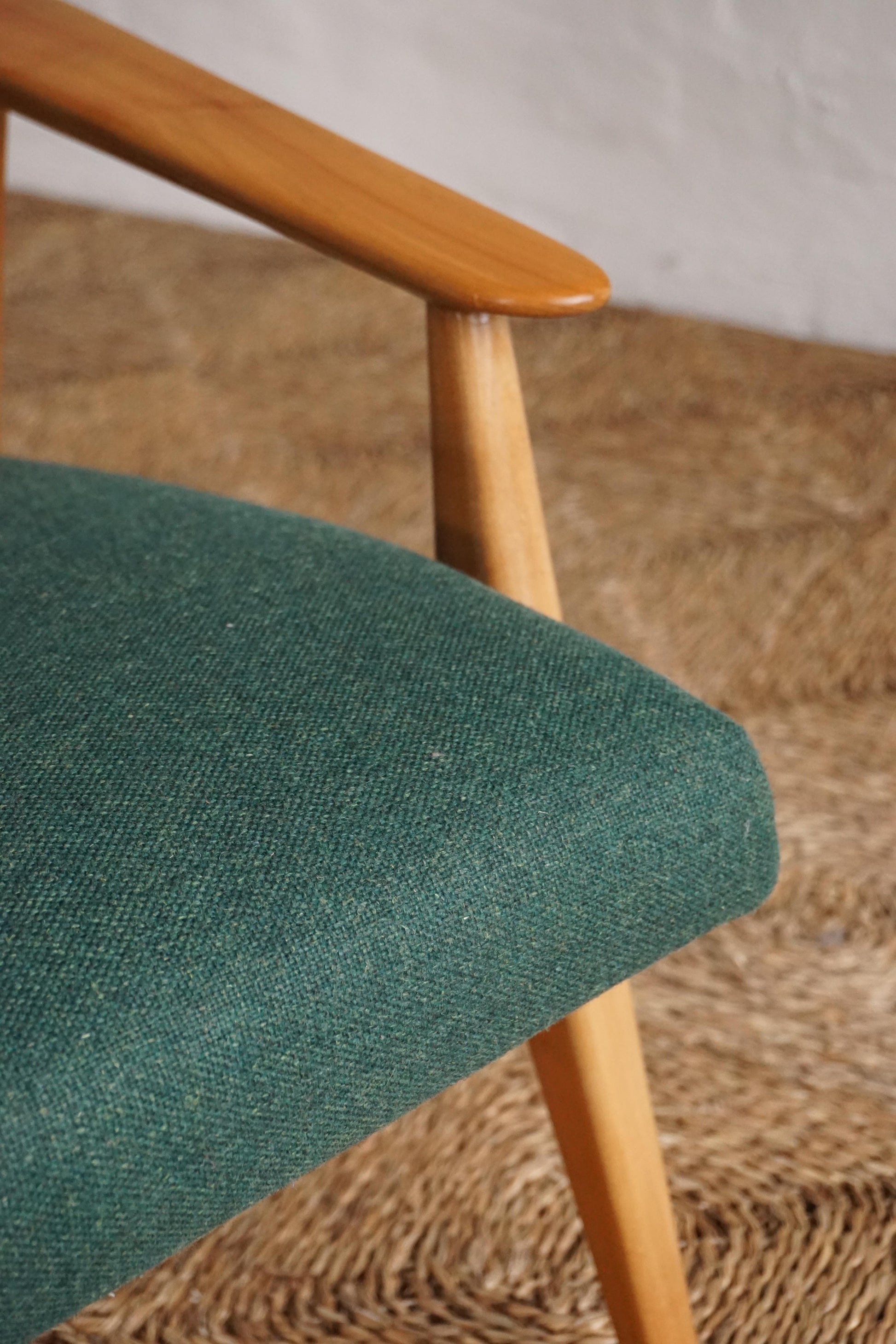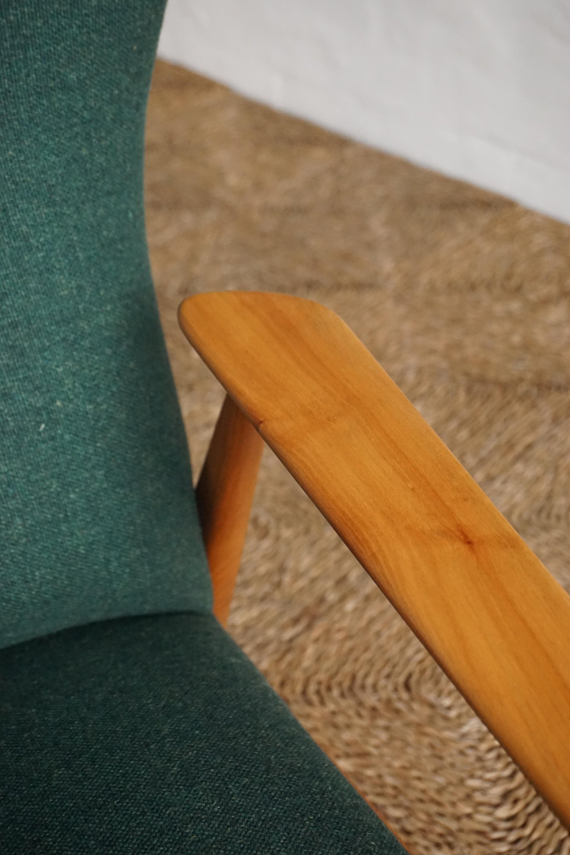 High back lounge chair c.1950s Sweden. Comfortable ergonomic design that supports the neck. Solid elm frame has been sanded and polished, timber frame in great restored condition. All new upholstery in Camira 'Main LIne Flax', a wool and flax blend, in the colour Hornchurch.