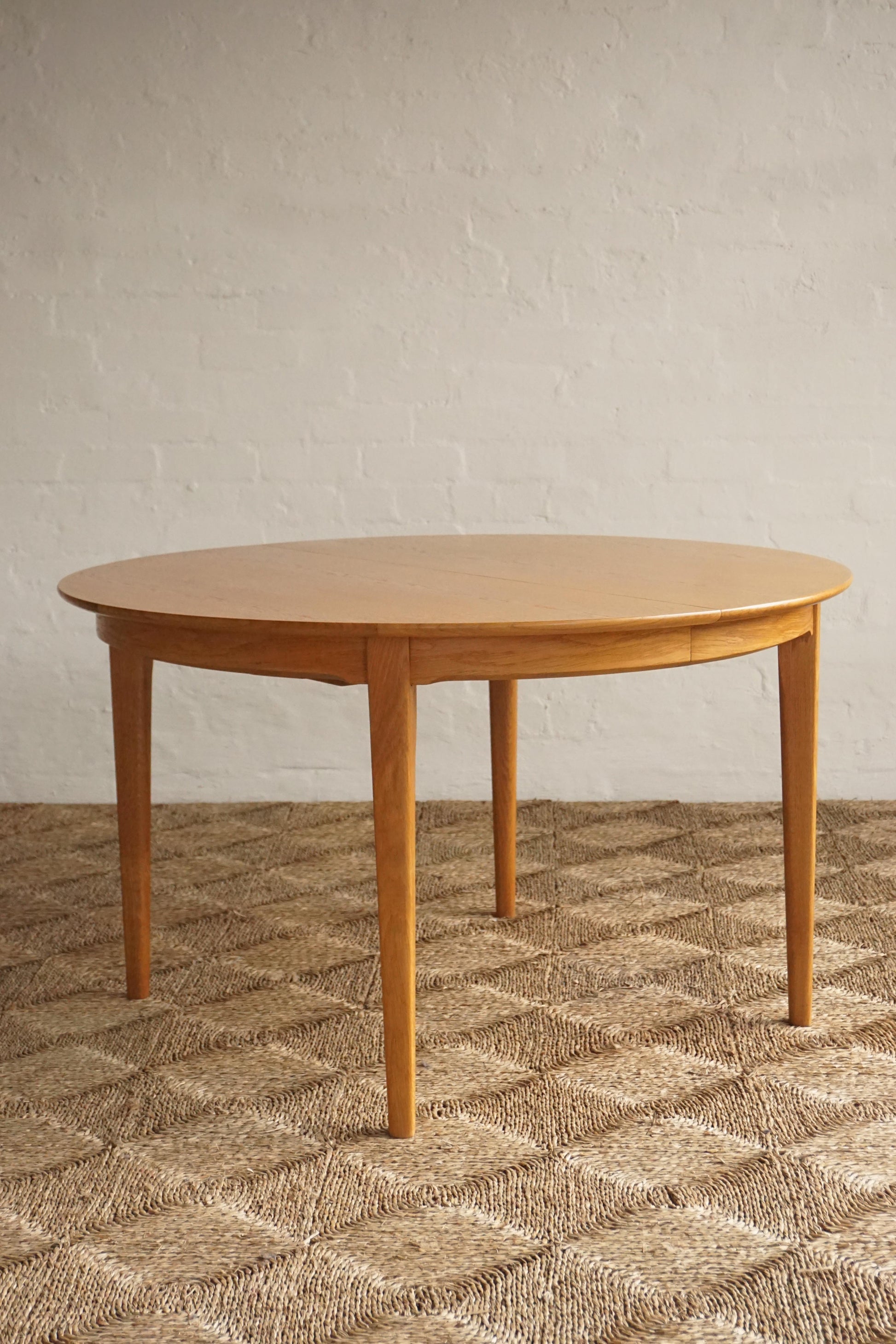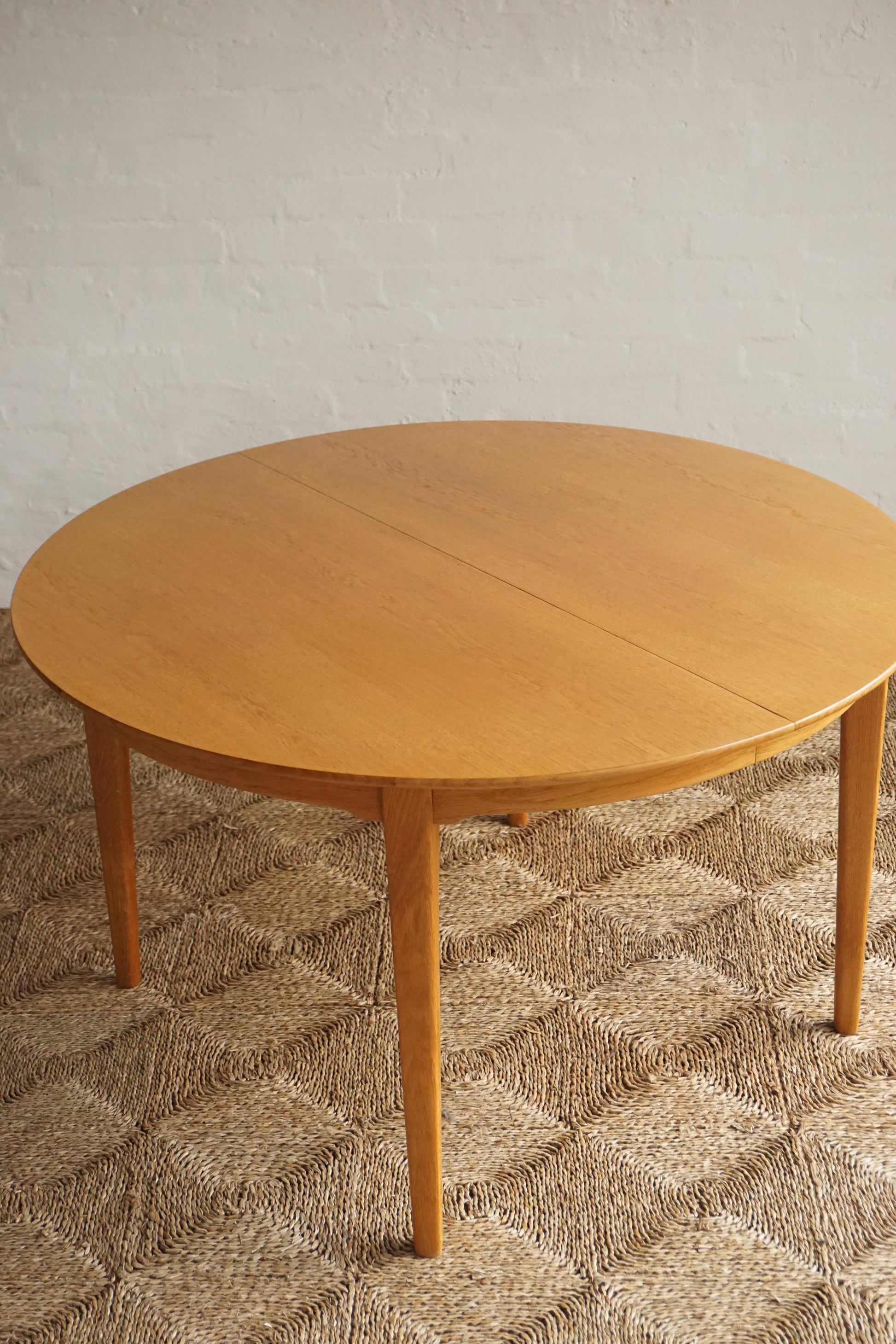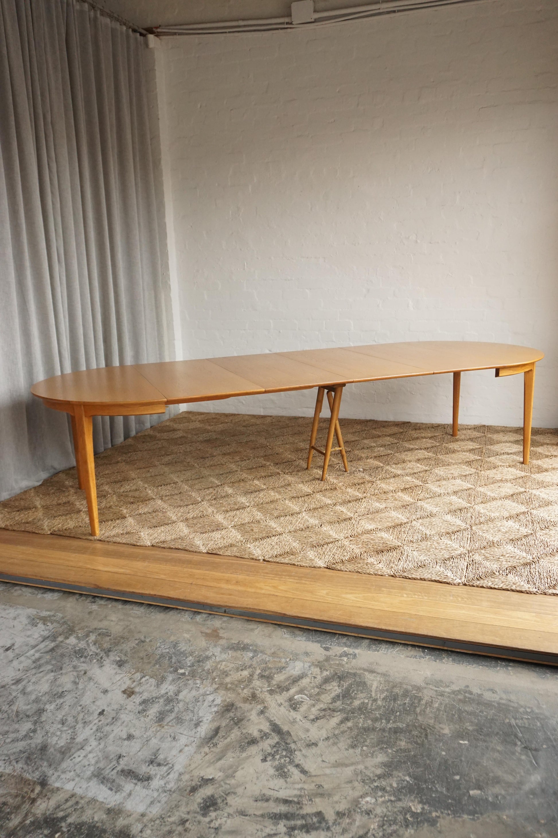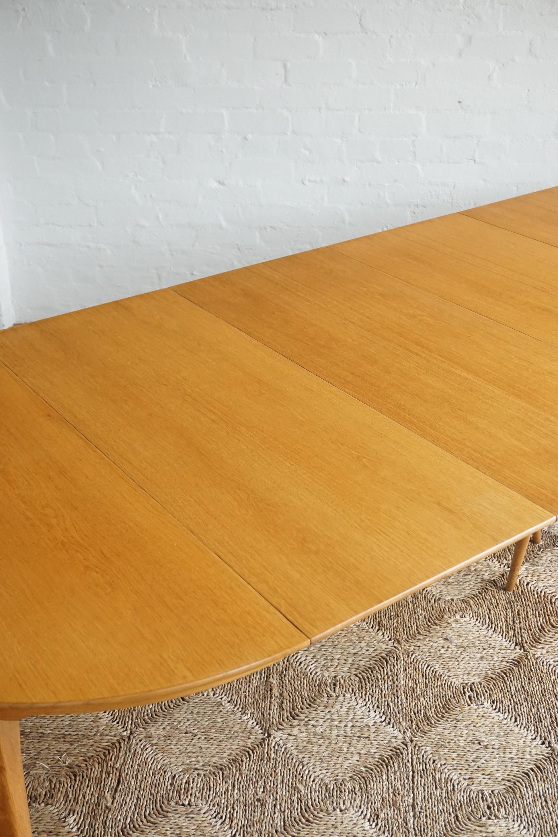 Large extendable oak dining table by Skovby c.1960s Denmark. Four extension leaves and a wooden drop down support leg extend the table from a 125cm round to a 3.25 metre long table. Comfortably seats 12 making it ideal for those who entertain large groups.