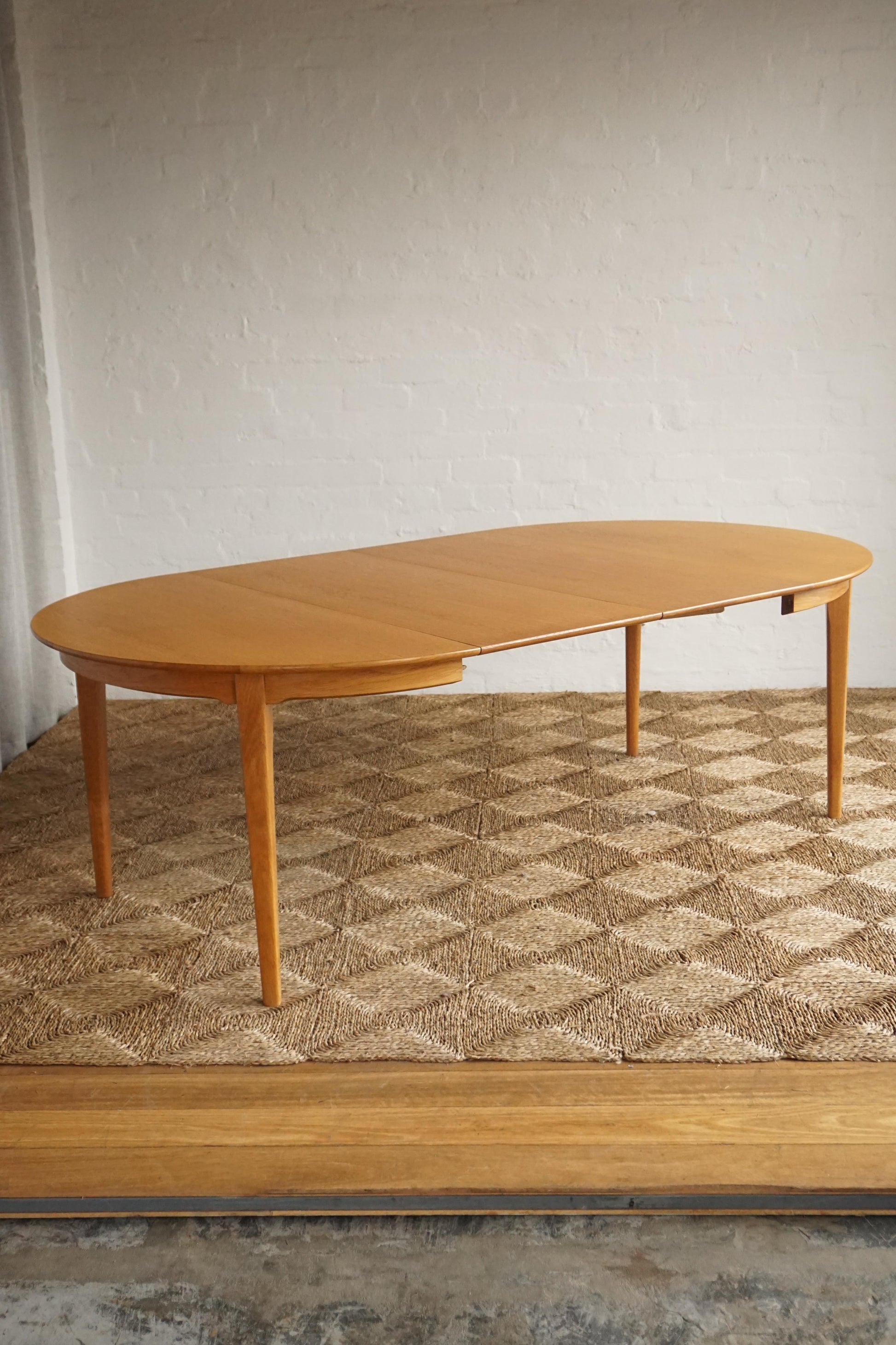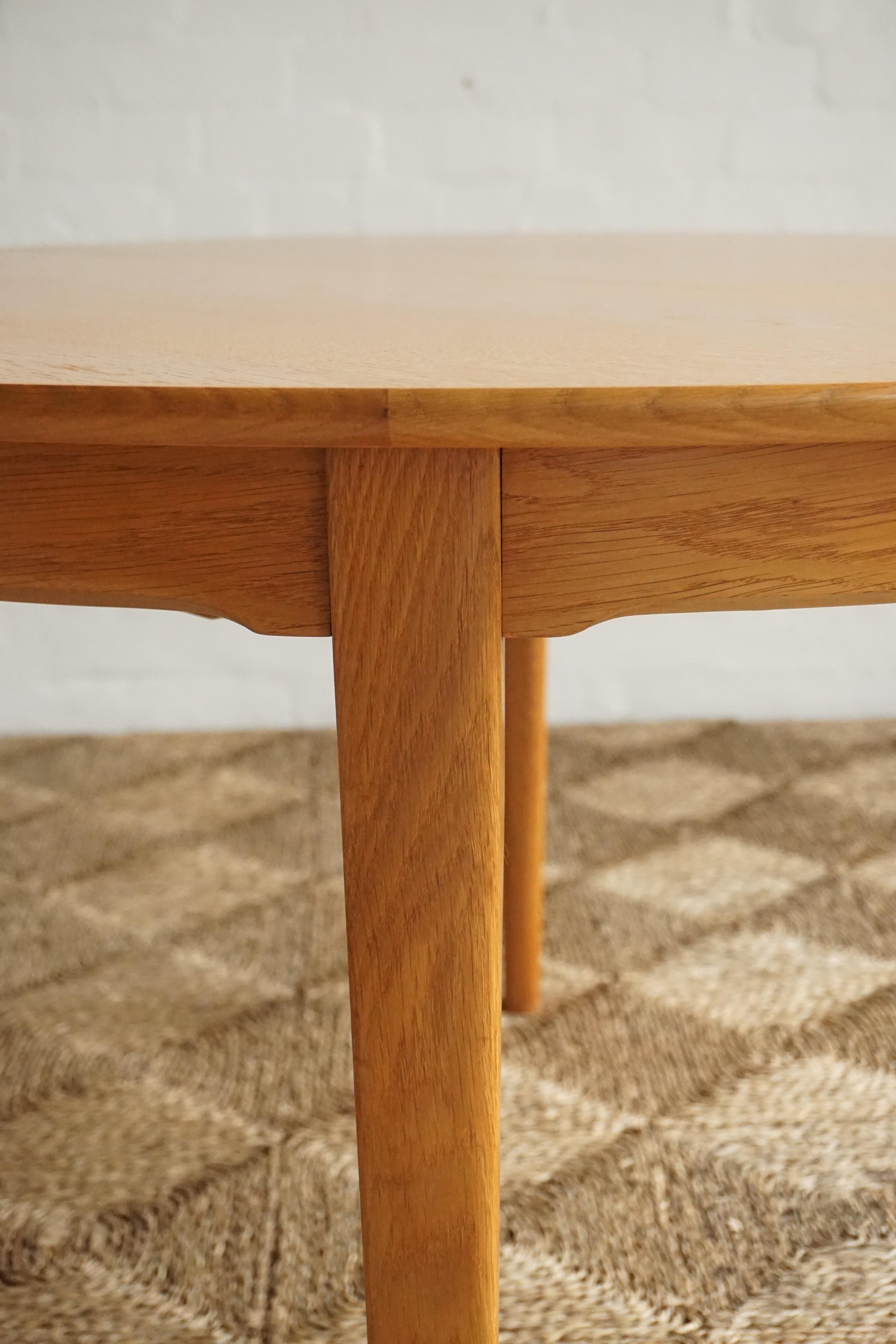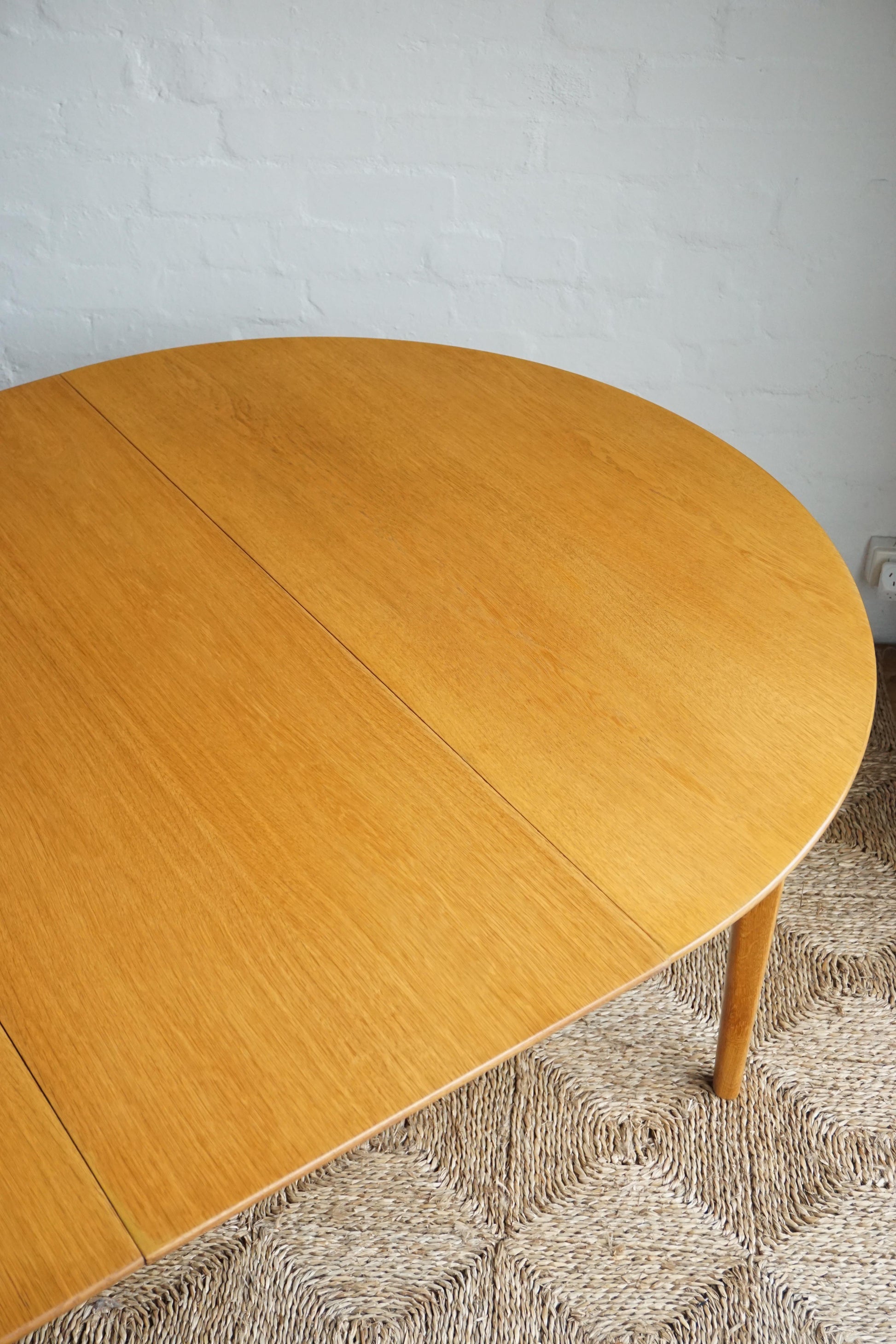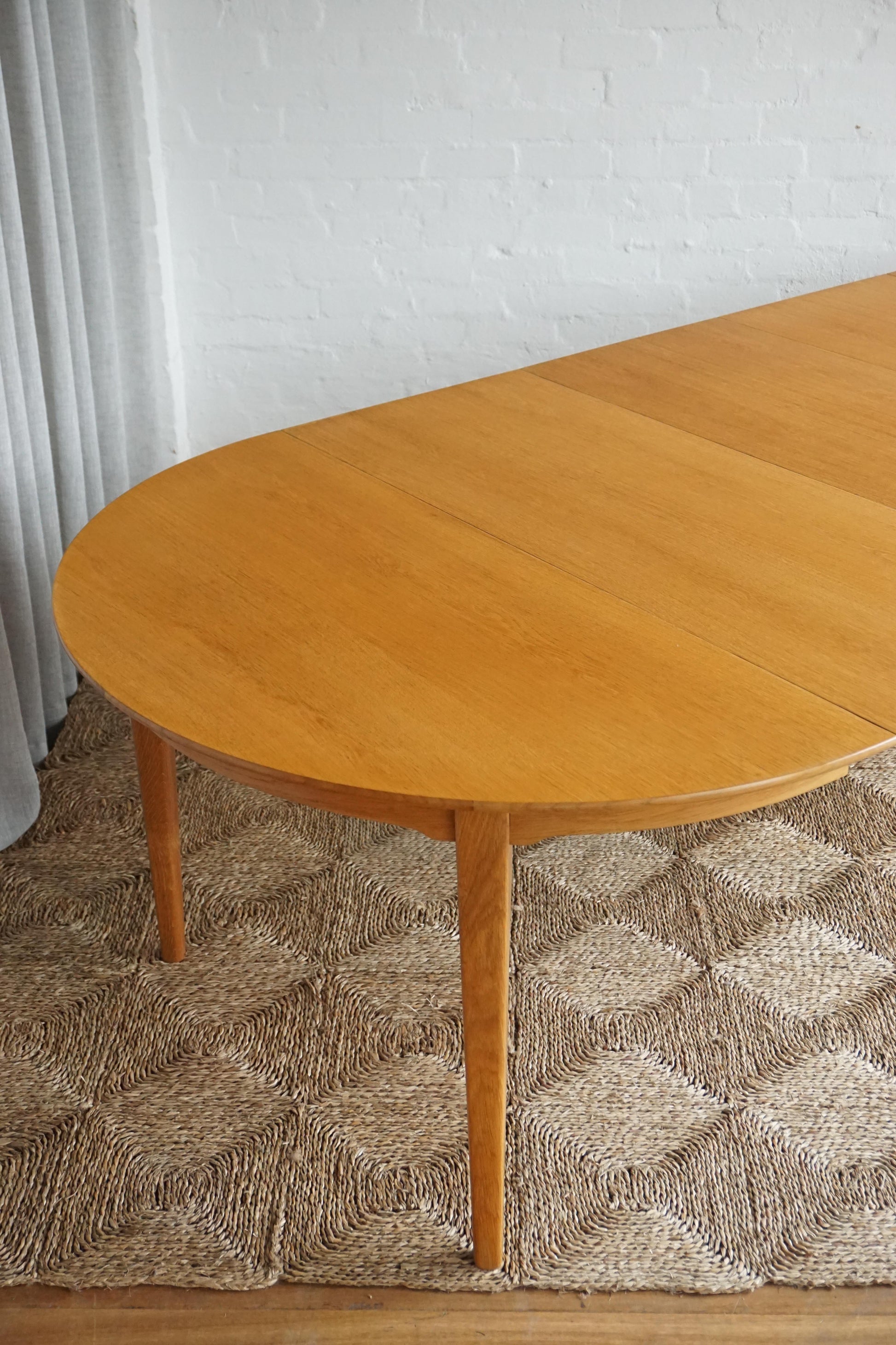 Large extendable oak dining table by Skovby c.1960s Denmark. Four extension leaves and a wooden drop down support leg extend the table from a 125cm round to a 3.25 metre long table. Comfortably seats 12 making it ideal for those who entertain large groups.