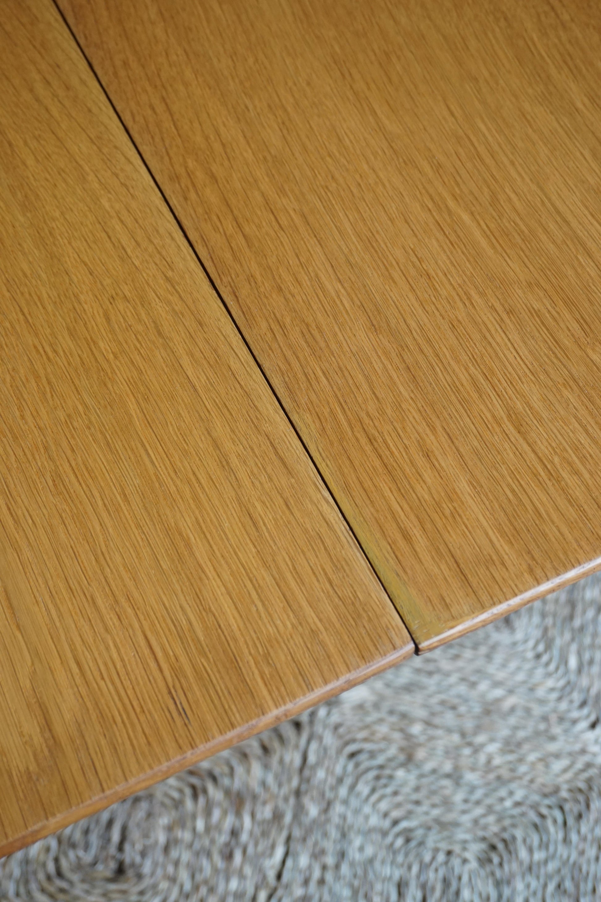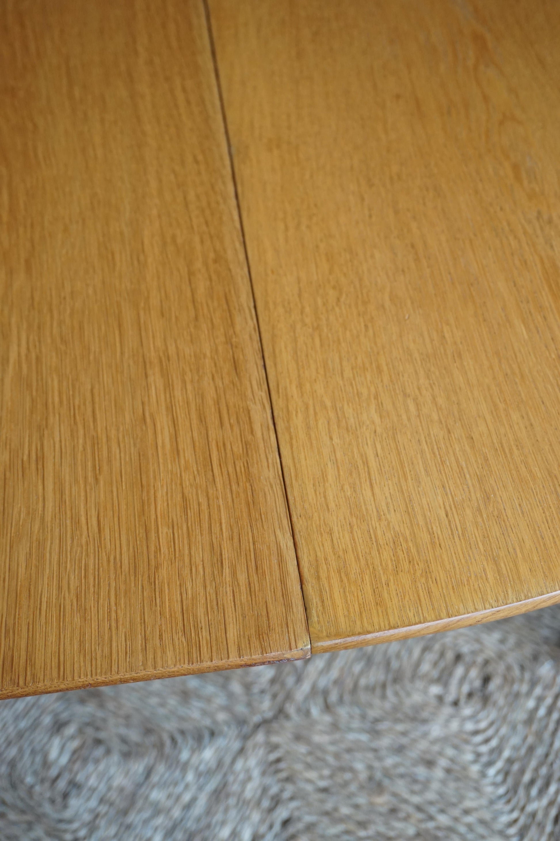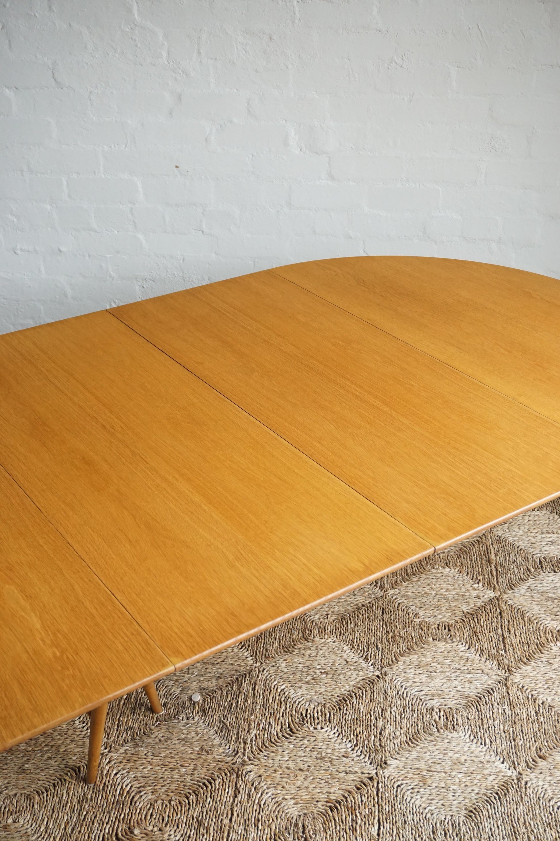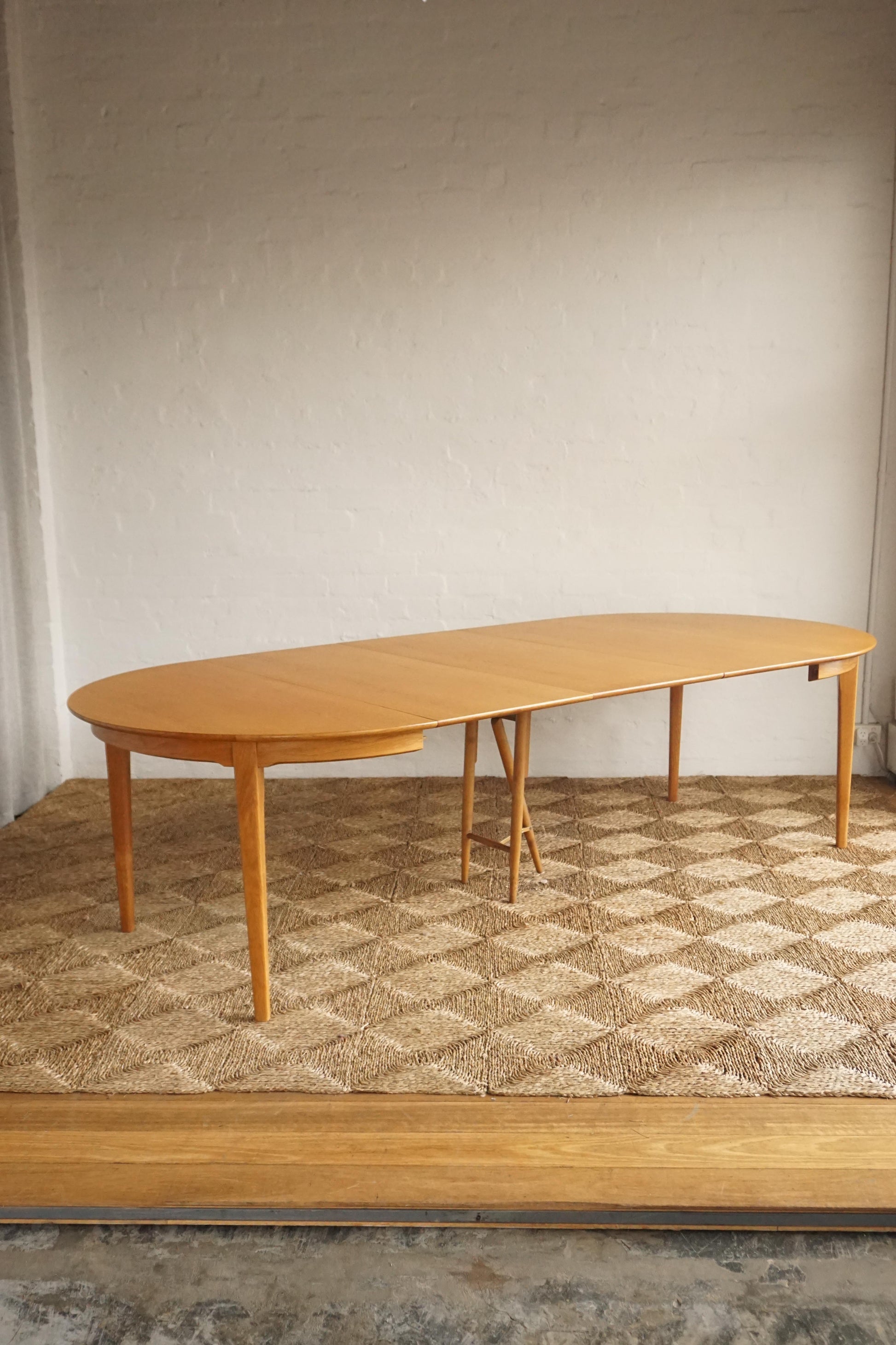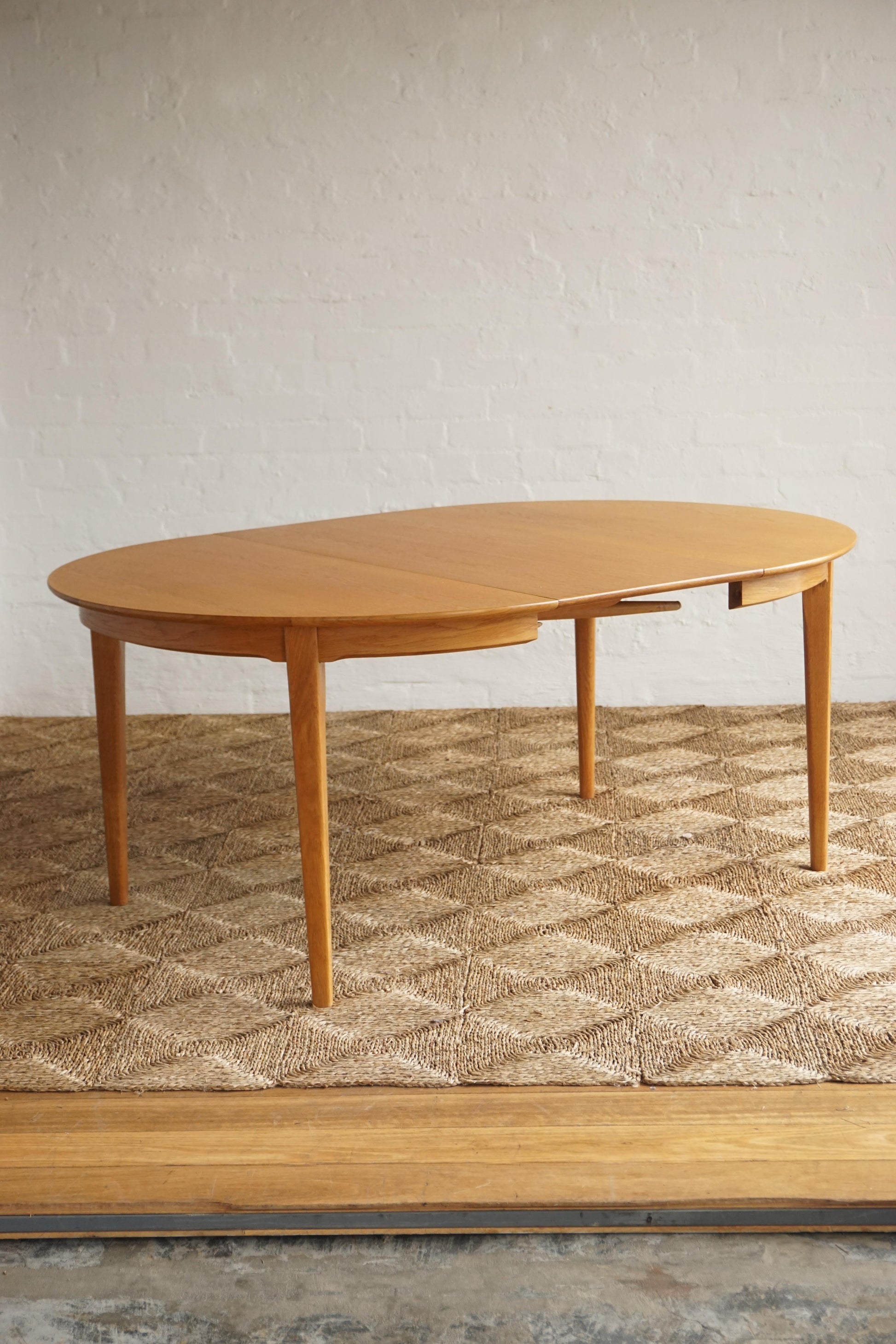 Large extendable oak dining table by Skovby c.1960s Denmark. Four extension leaves and a wooden drop down support leg extend the table from a 125cm round to a 3.25 metre long table. Comfortably seats 12 making it ideal for those who entertain large groups.