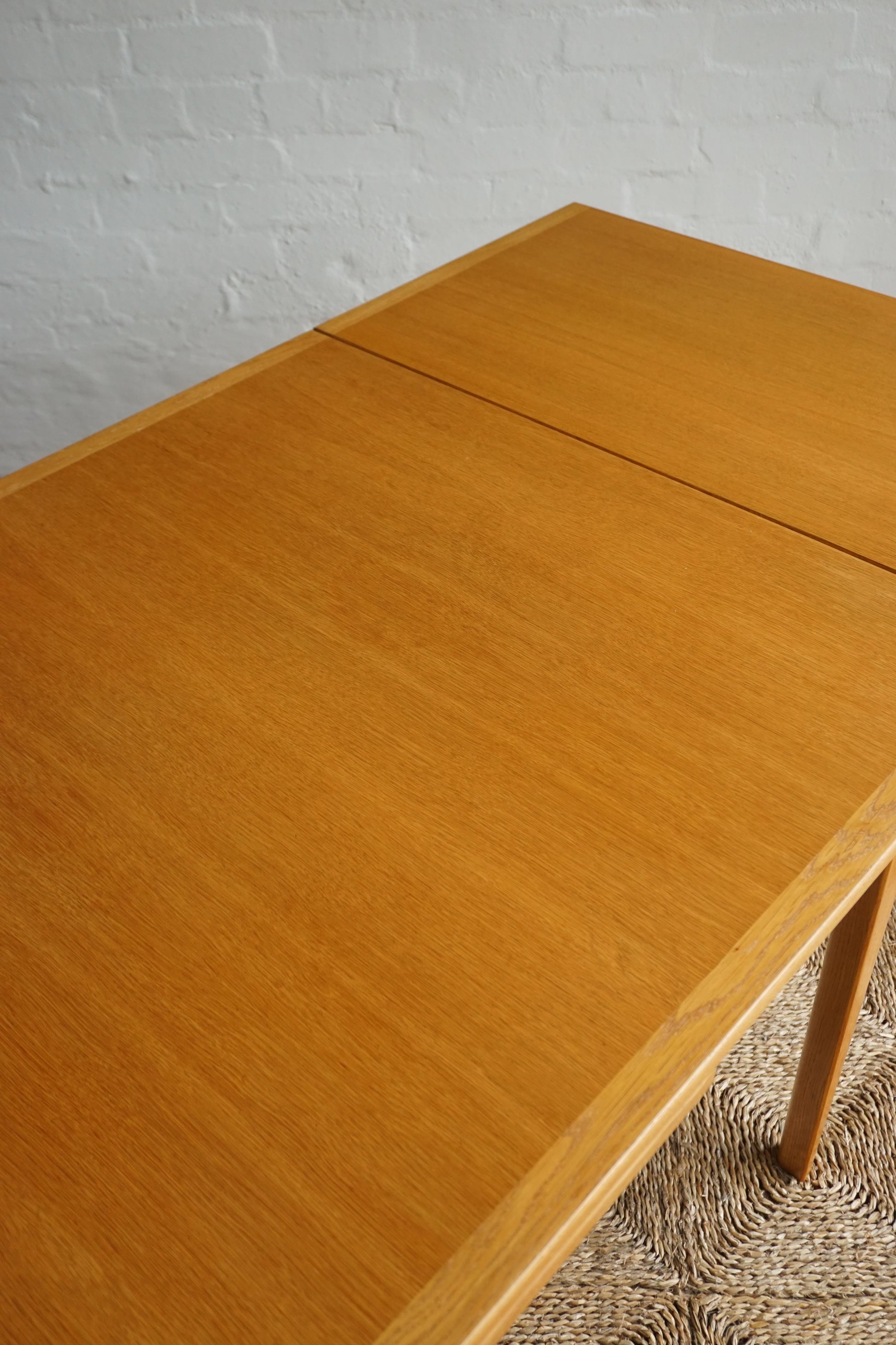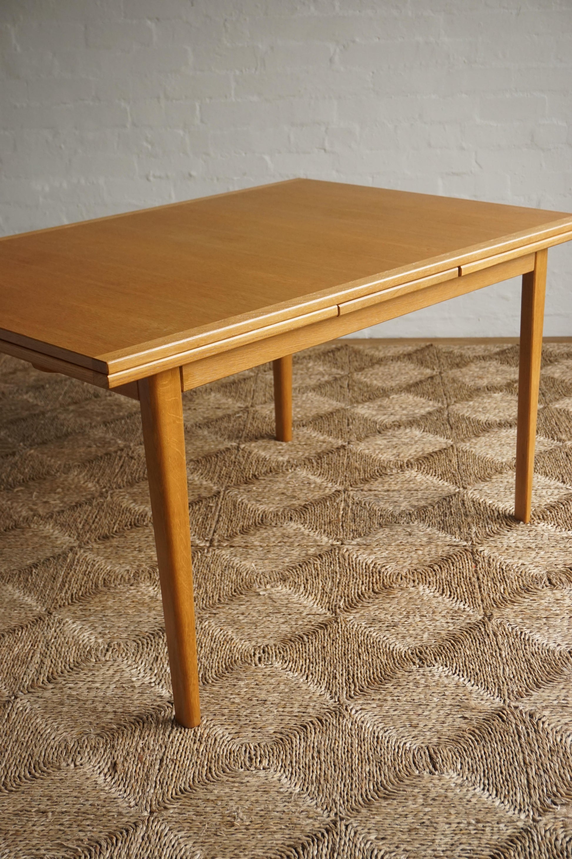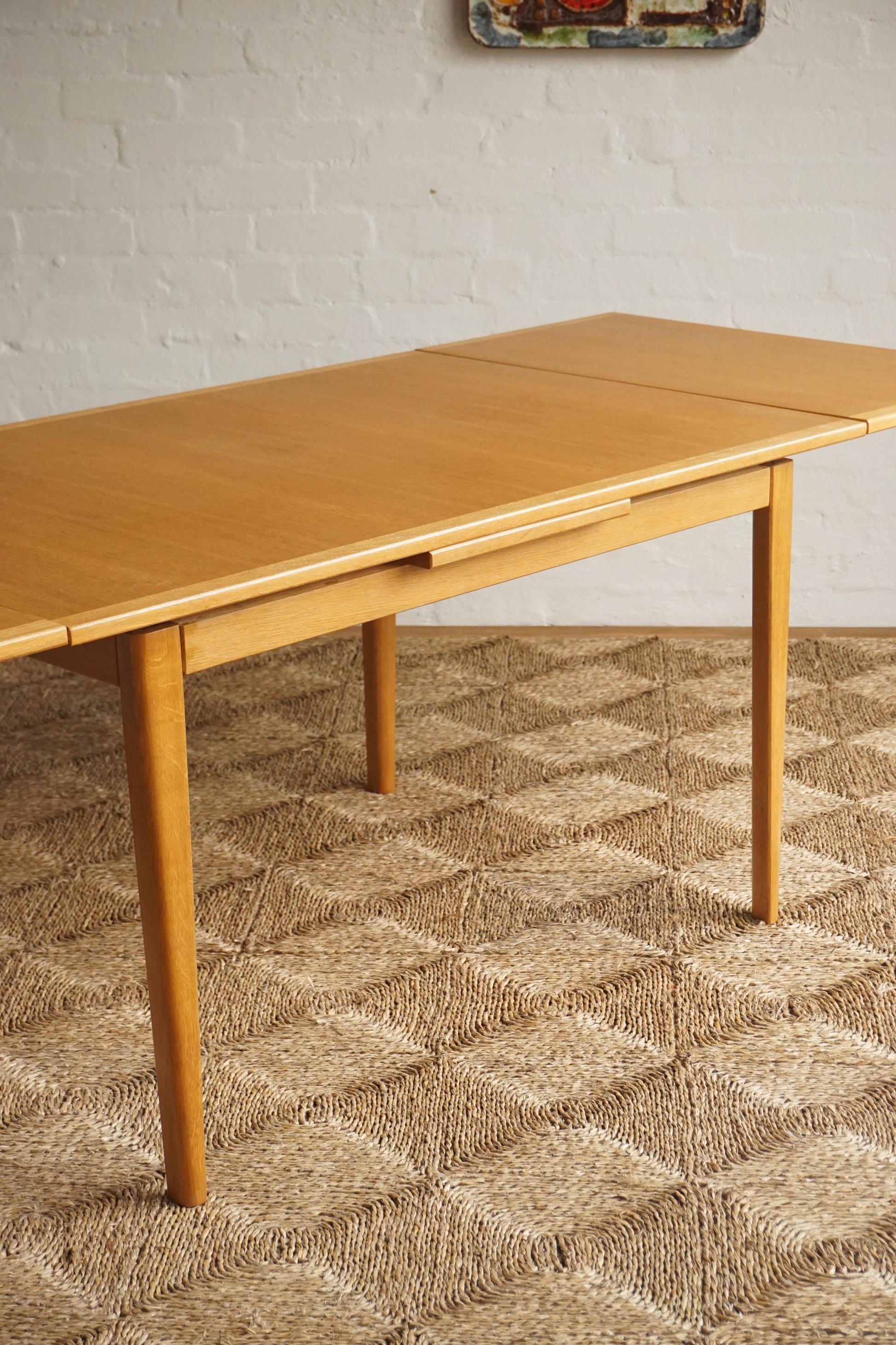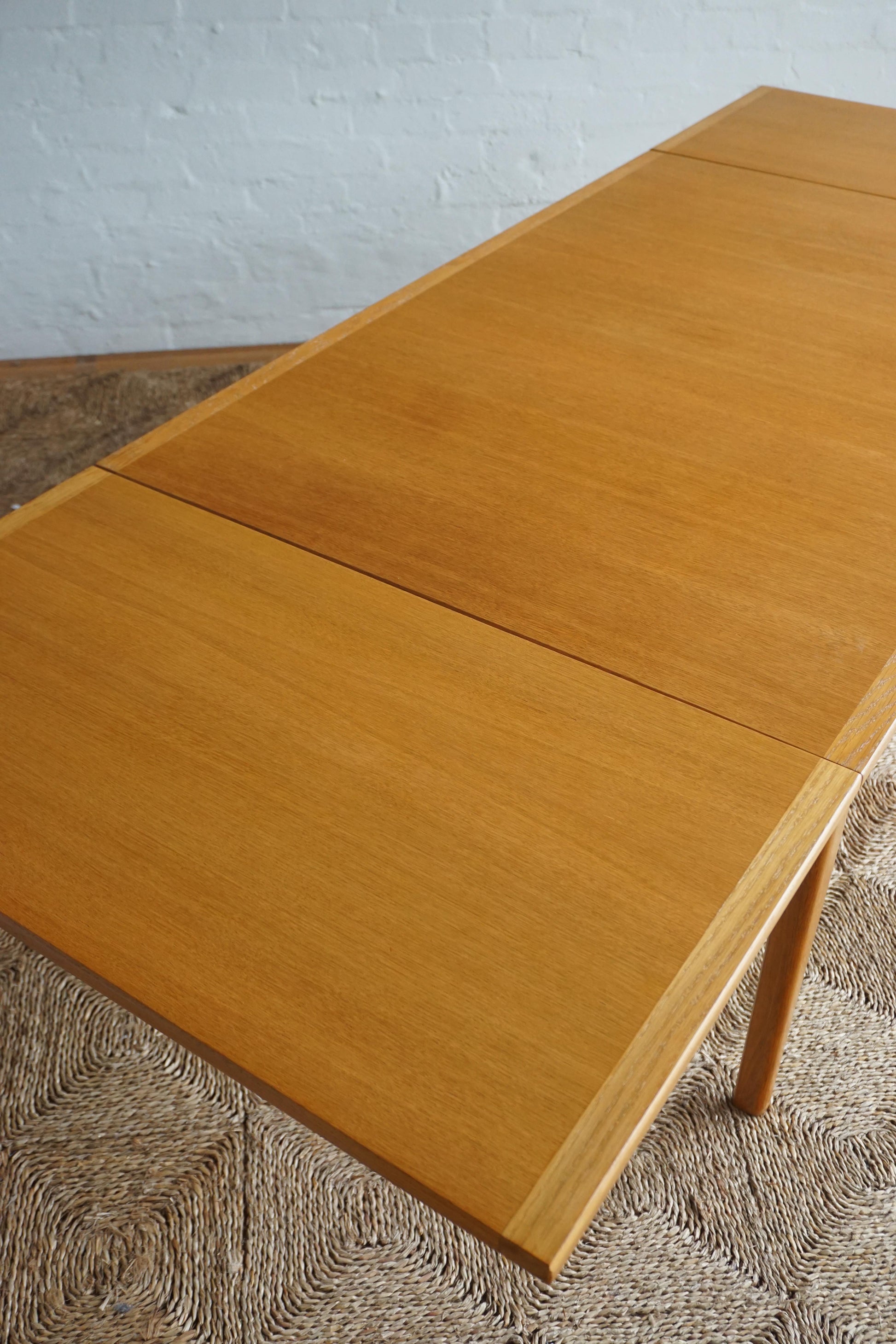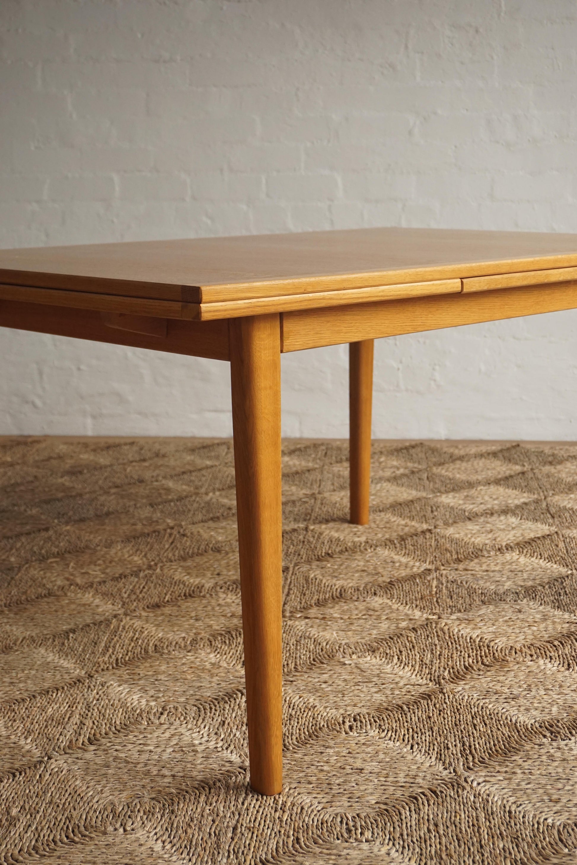 Oak dining table c.1970s Denmark. Two extension leaves slide out to extend the table to seat 8. The table has been fully restored, sanded and polished and finished in a hard shellac.
