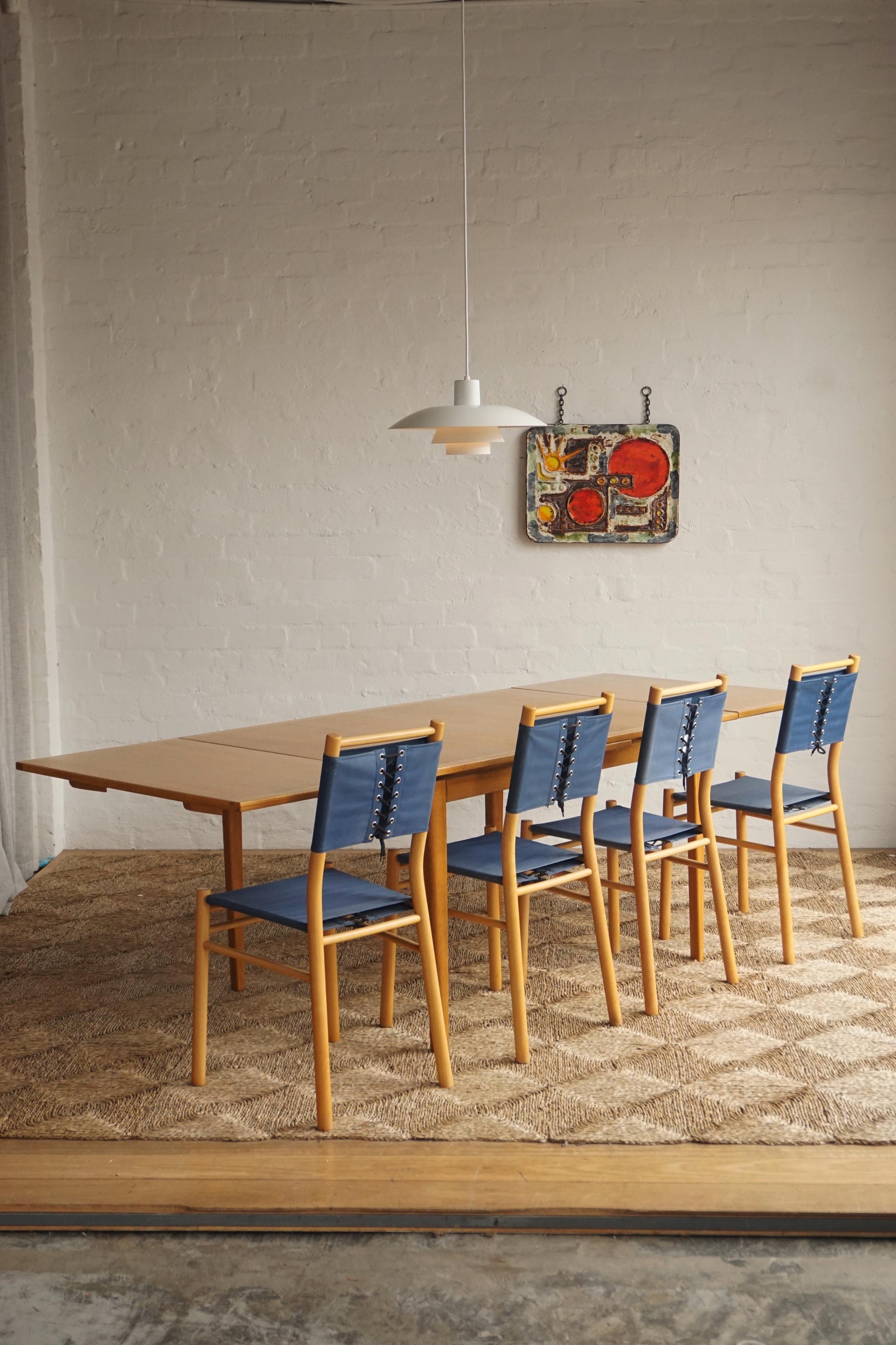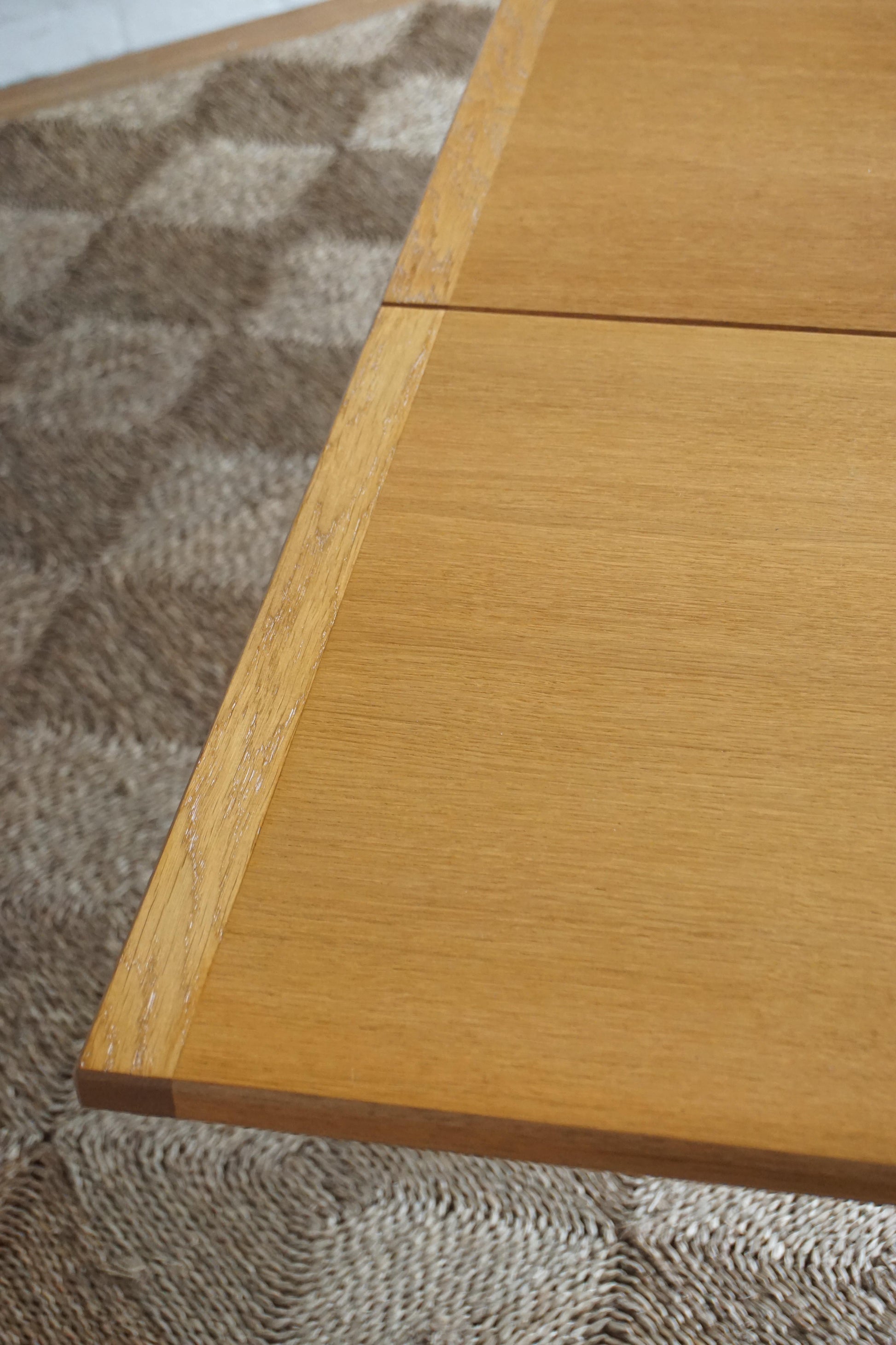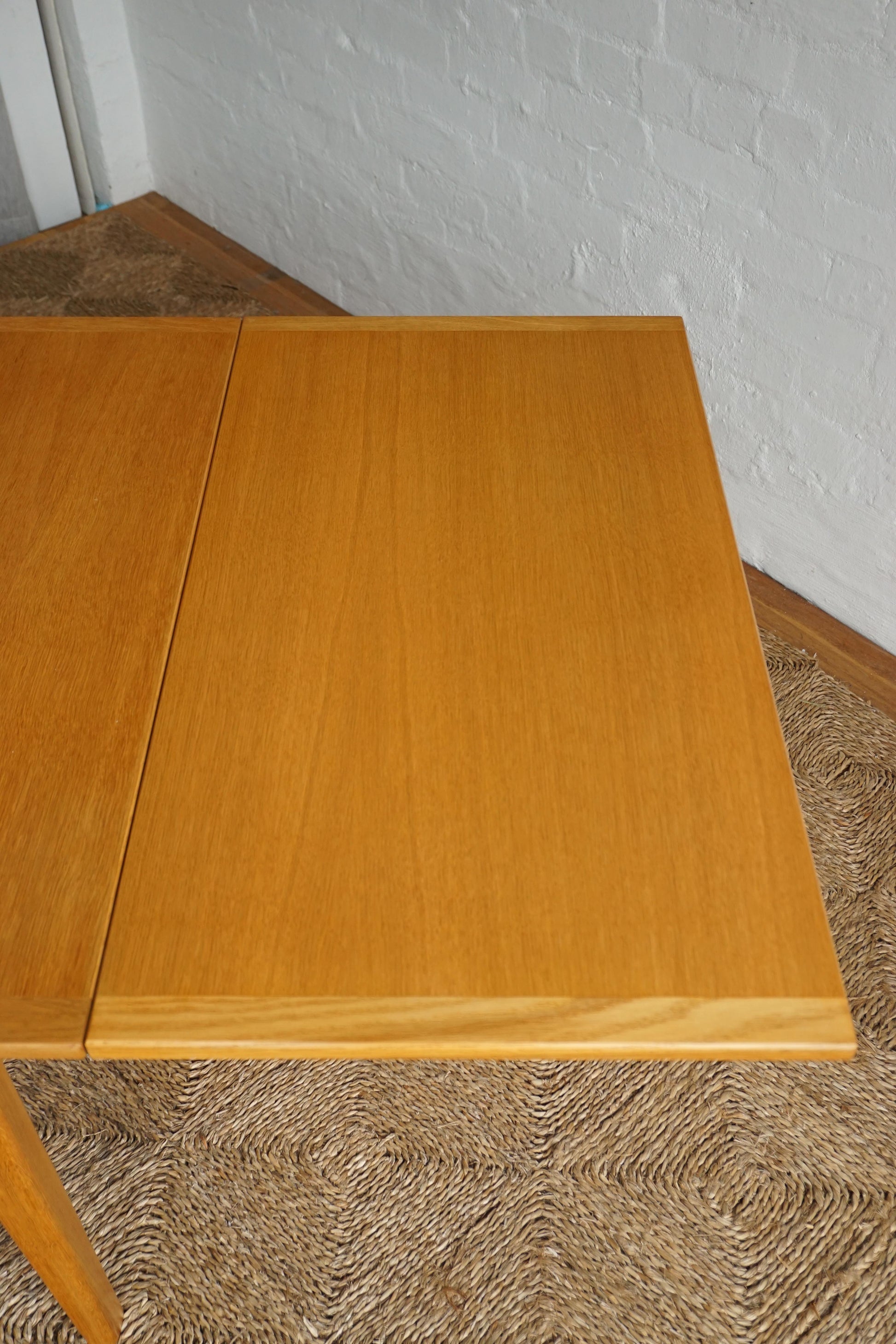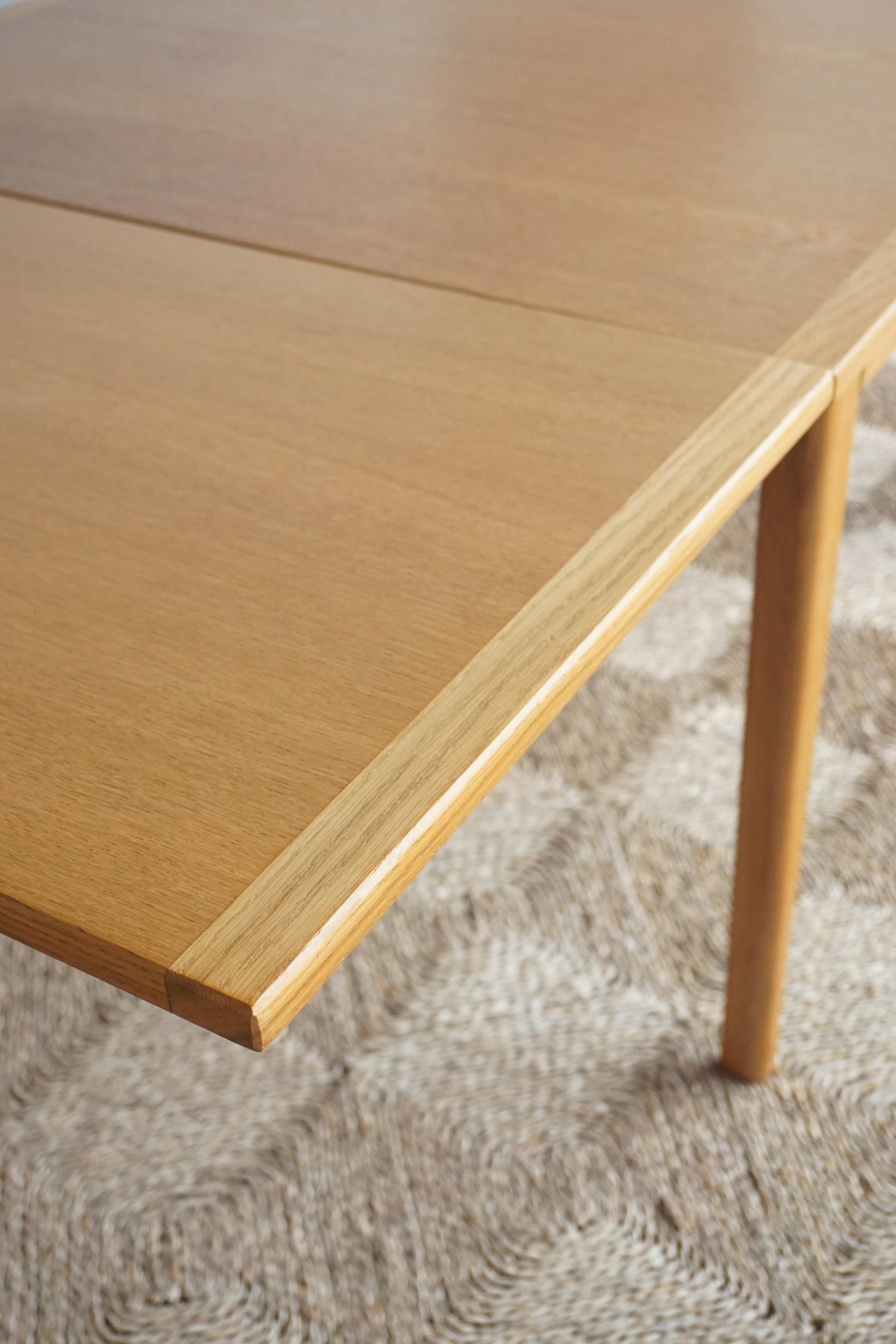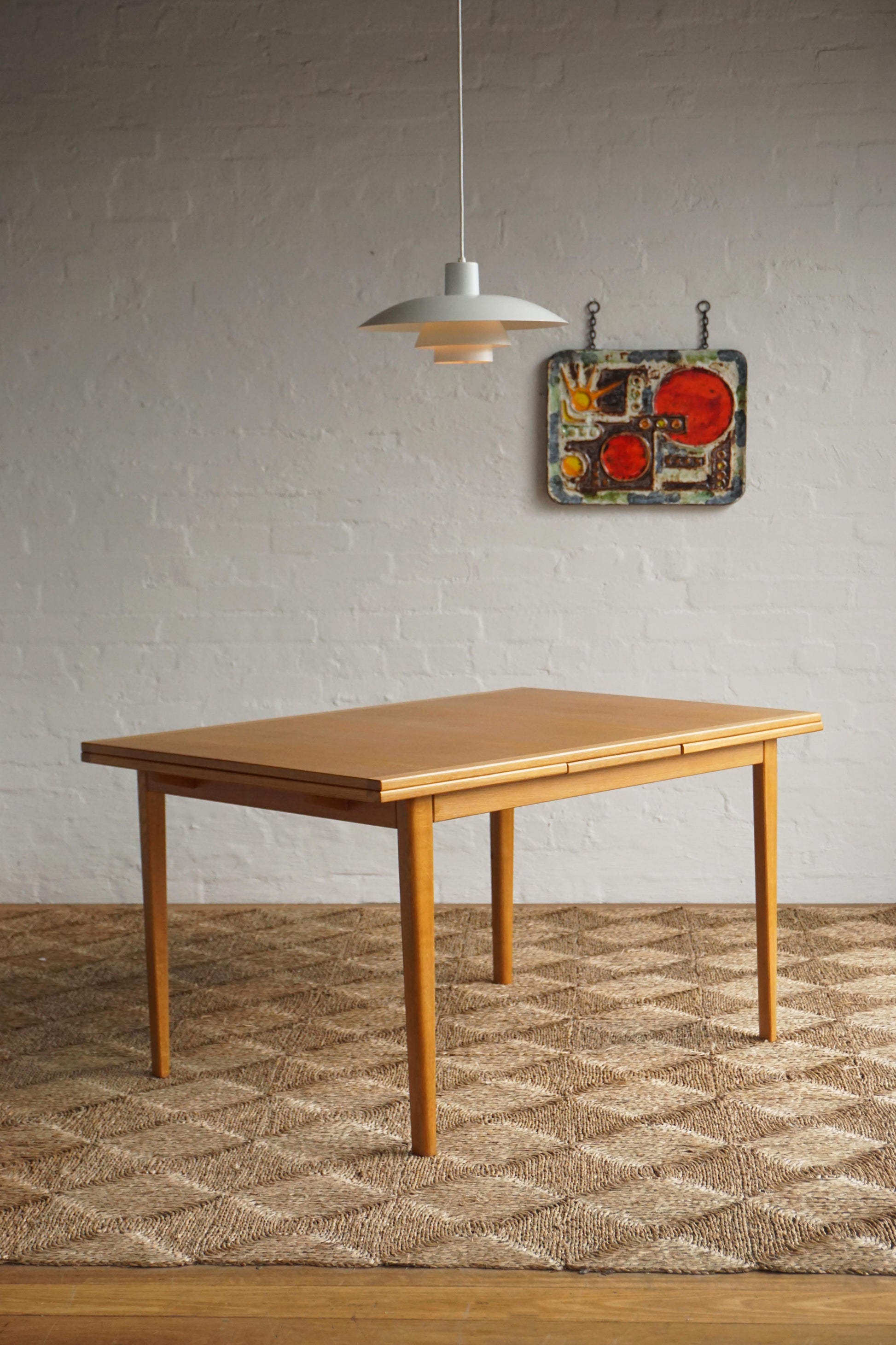 Oak dining table c.1970s Denmark. Two extension leaves slide out to extend the table to seat 8. The table has been fully restored, sanded and polished and finished in a hard shellac.