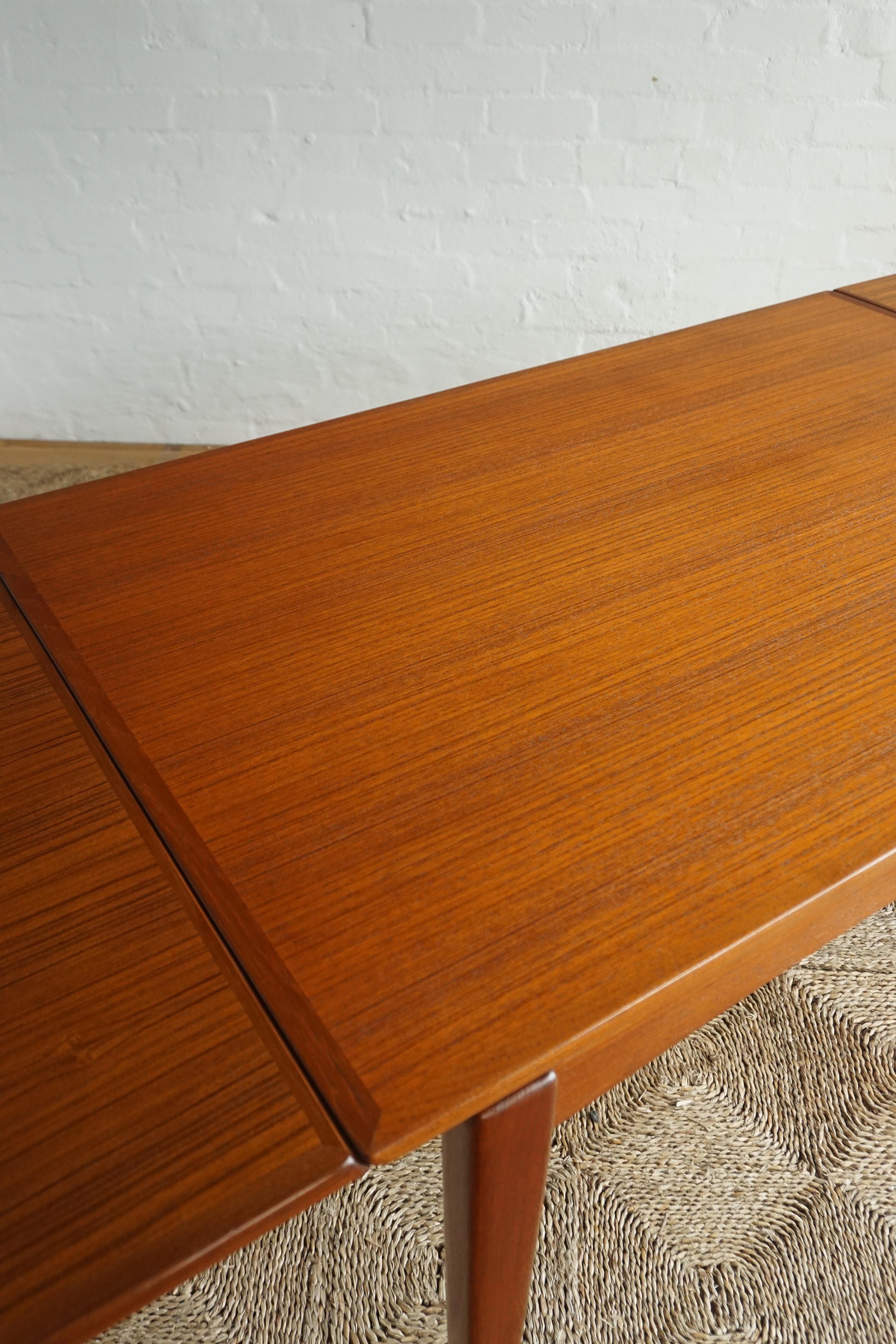 Extendable teak dining table c.1970s Denmark. Solid teak legs. Two extension leaves slide out to extend the table to seat 8-10. The table has been fully restored, sanded, polished and finished in a hard shellac.