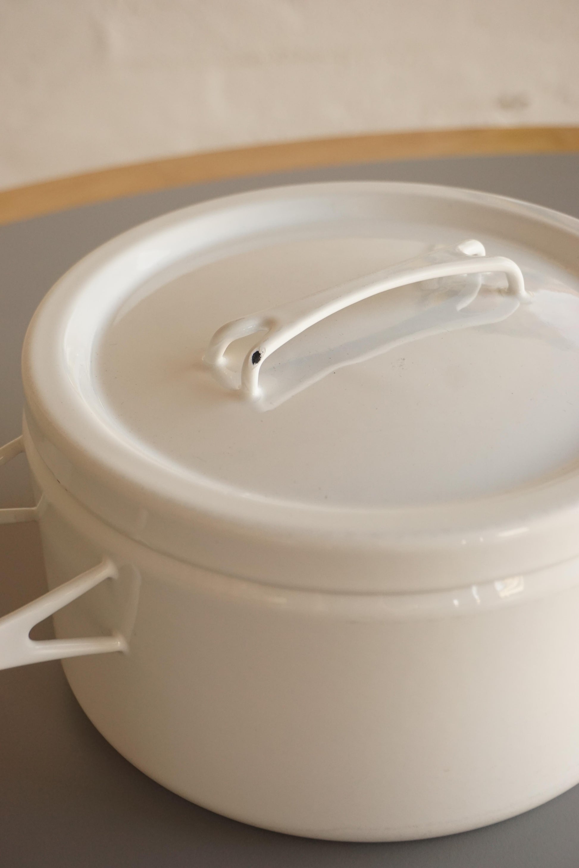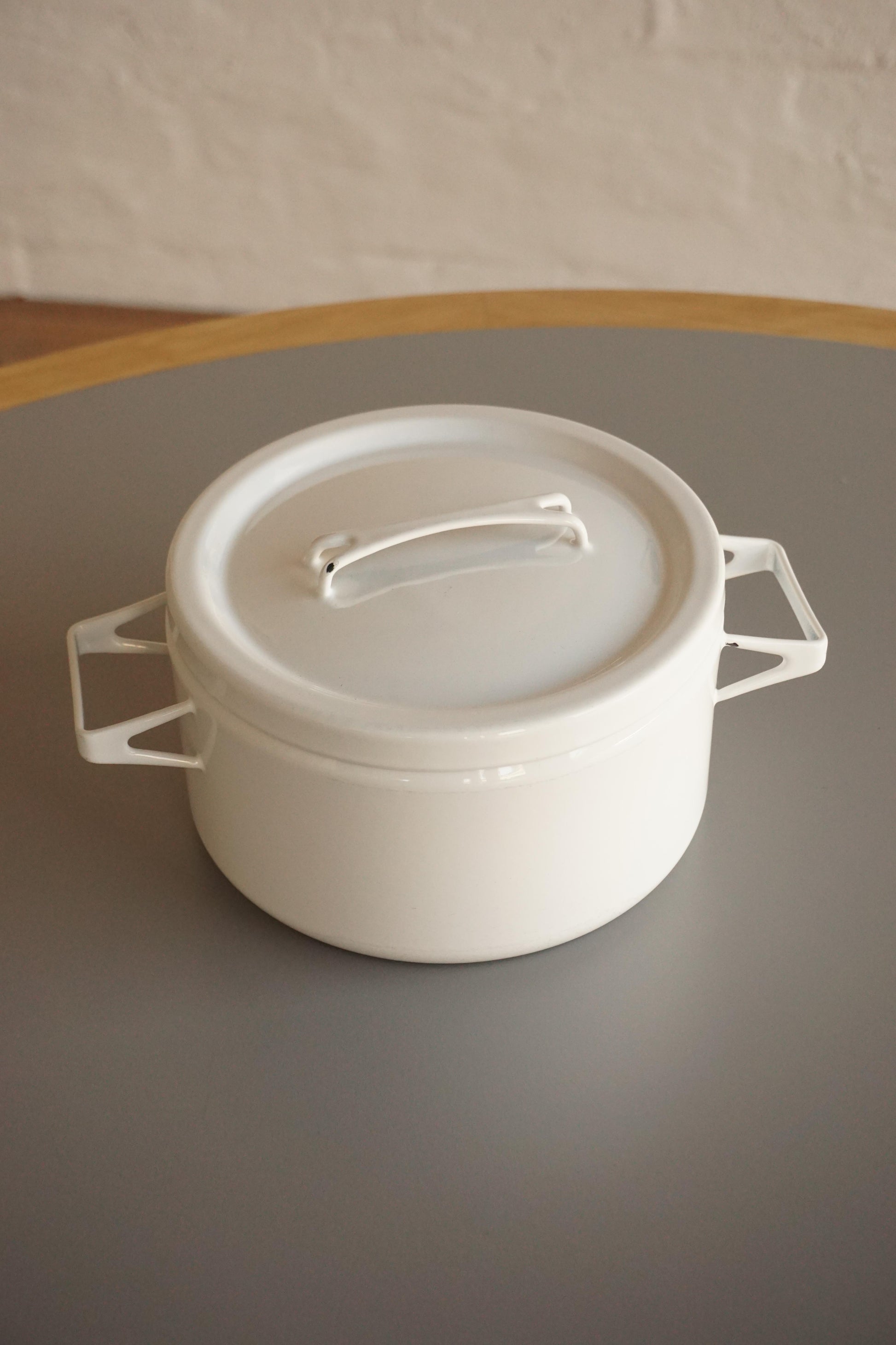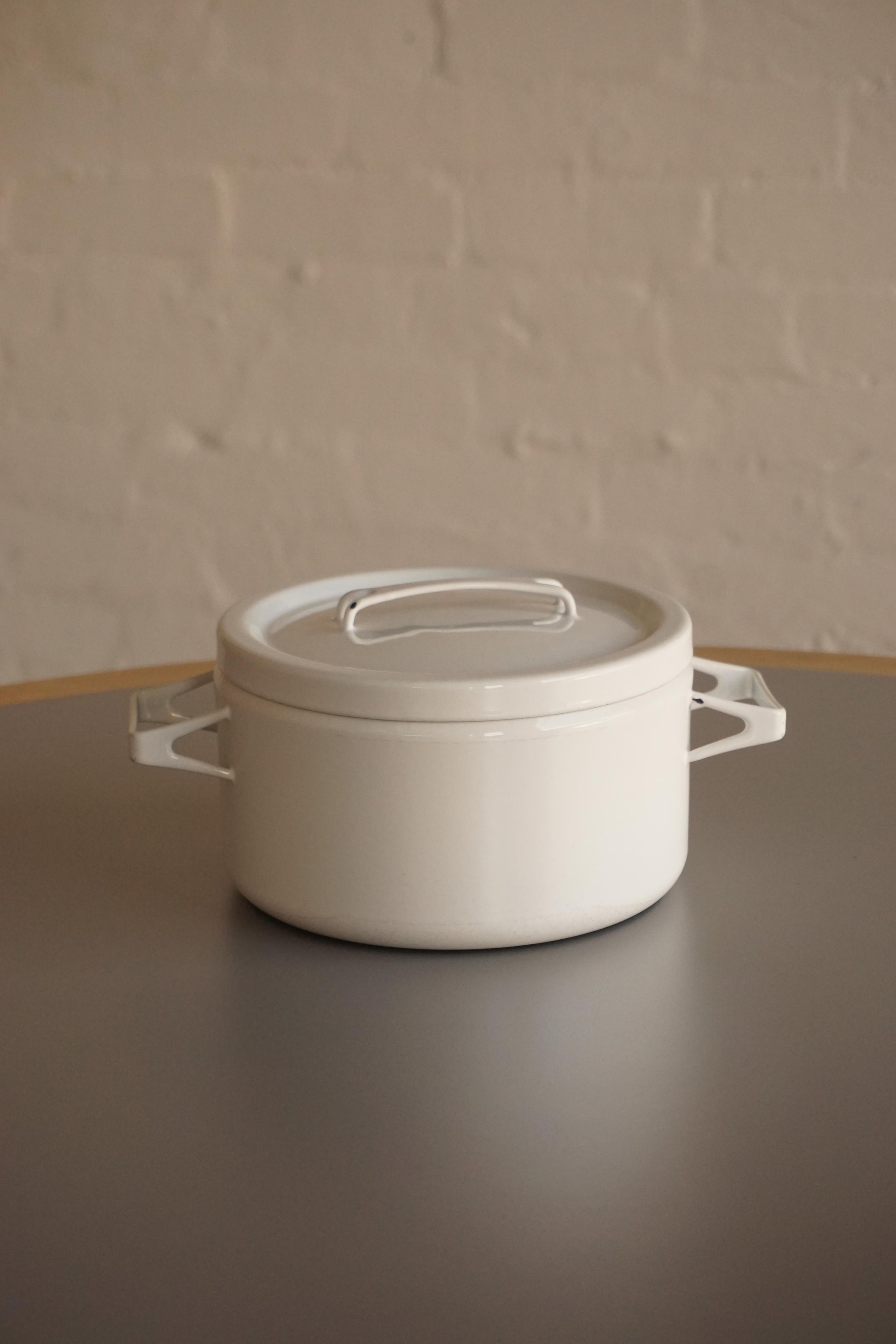 Lidded casserole dish produced by Finel Arabia c.1960s Finland. Enamelled steel. Two small chips to the enamel and very light surface scratches to the interior (from someone using a metal spoon) as shown in photos, otherwise looks barely used.