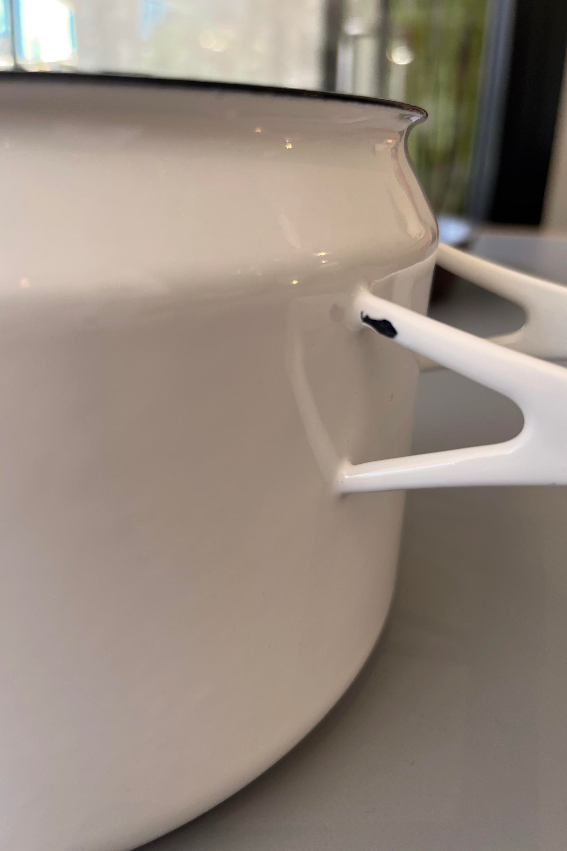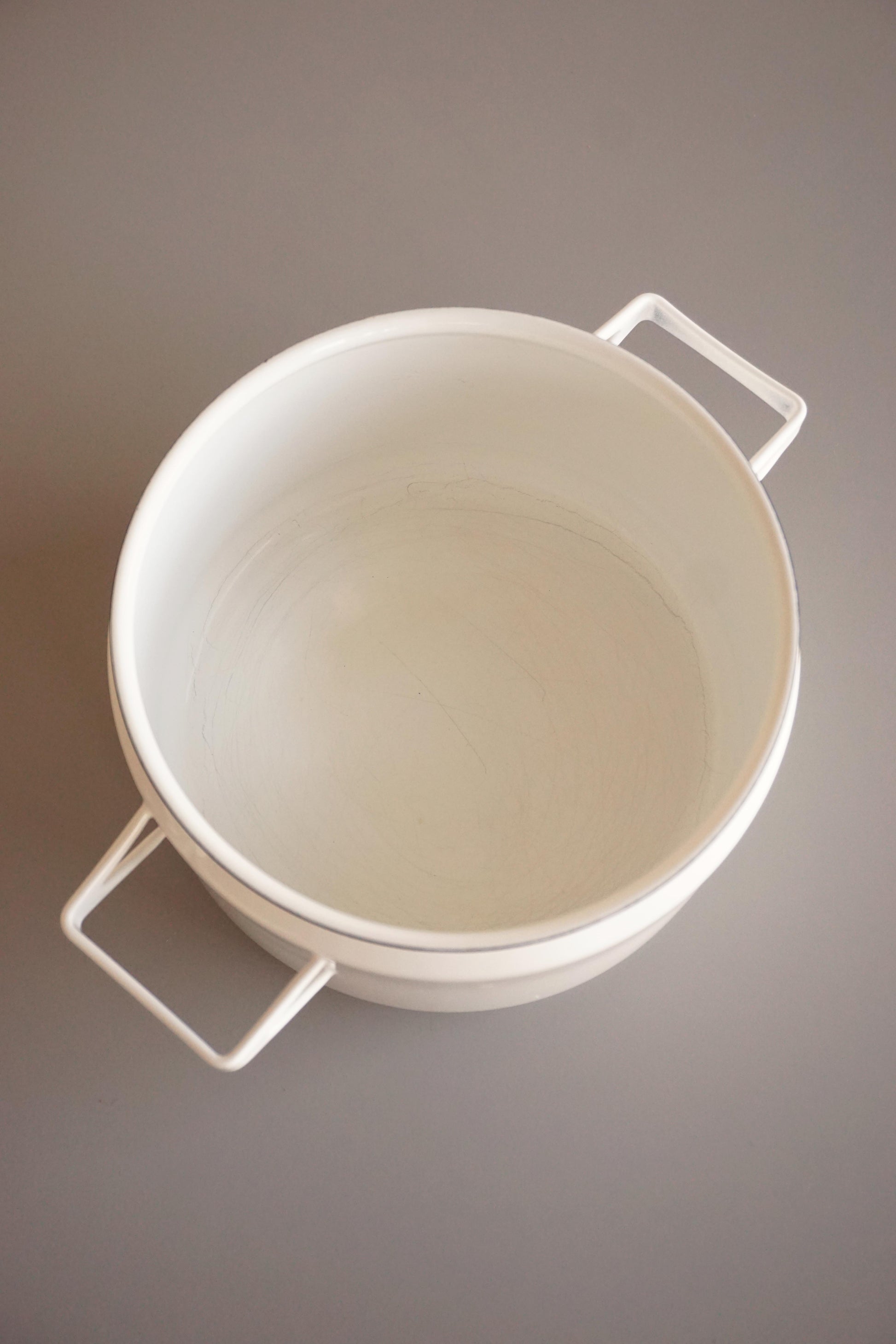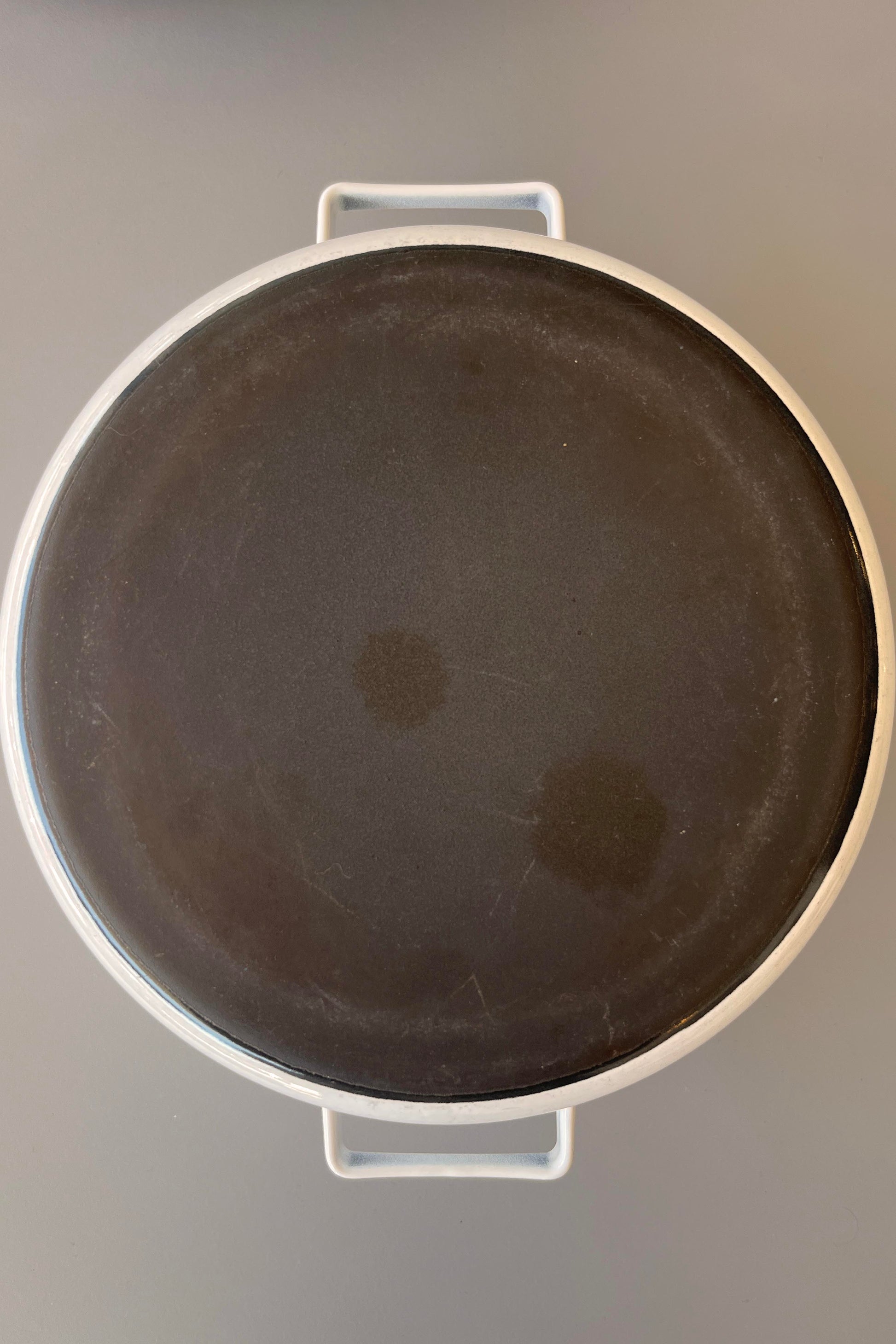 Lidded casserole dish produced by Finel Arabia c.1960s Finland. Enamelled steel. Two small chips to the enamel and very light surface scratches to the interior (from someone using a metal spoon) as shown in photos, otherwise looks barely used.