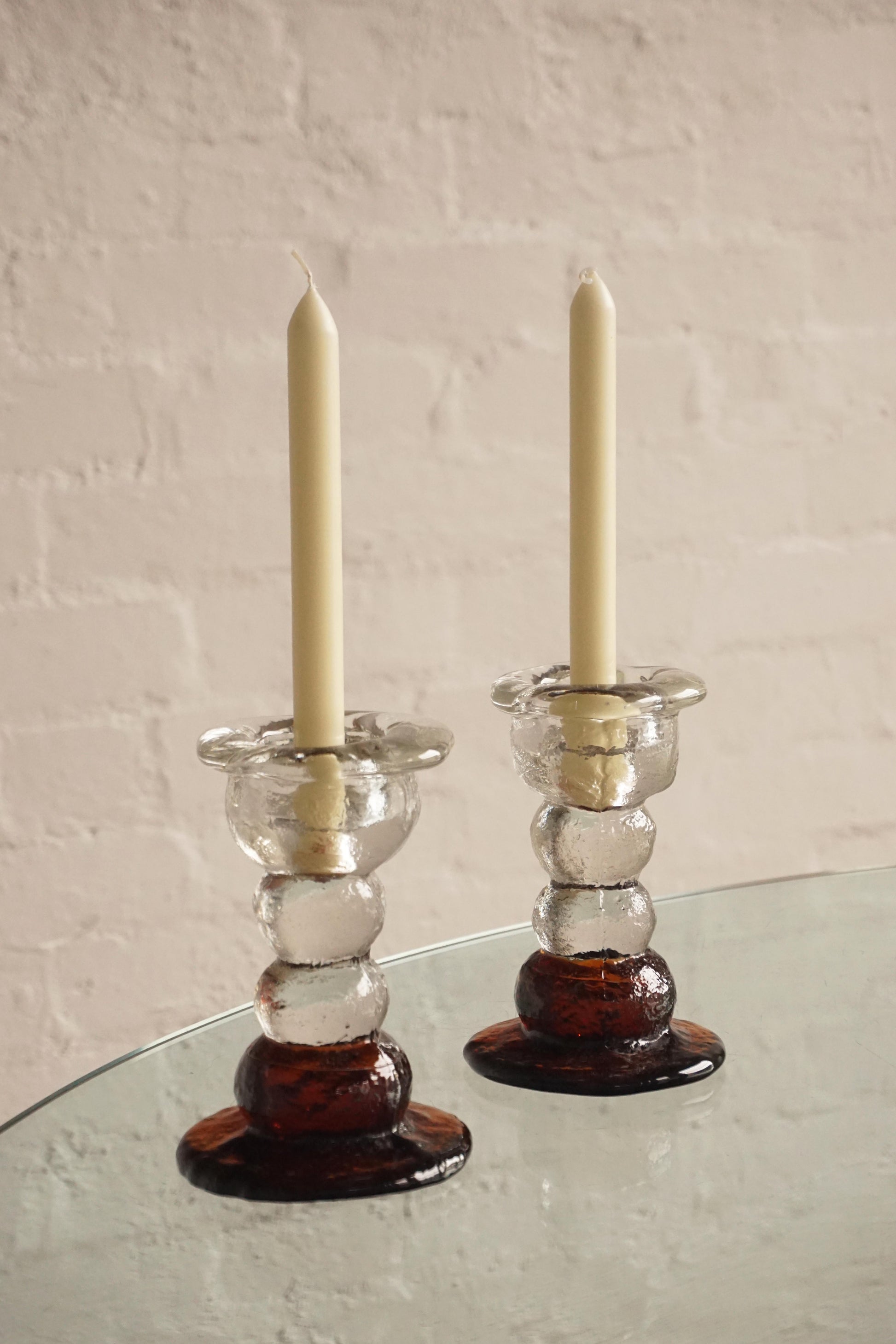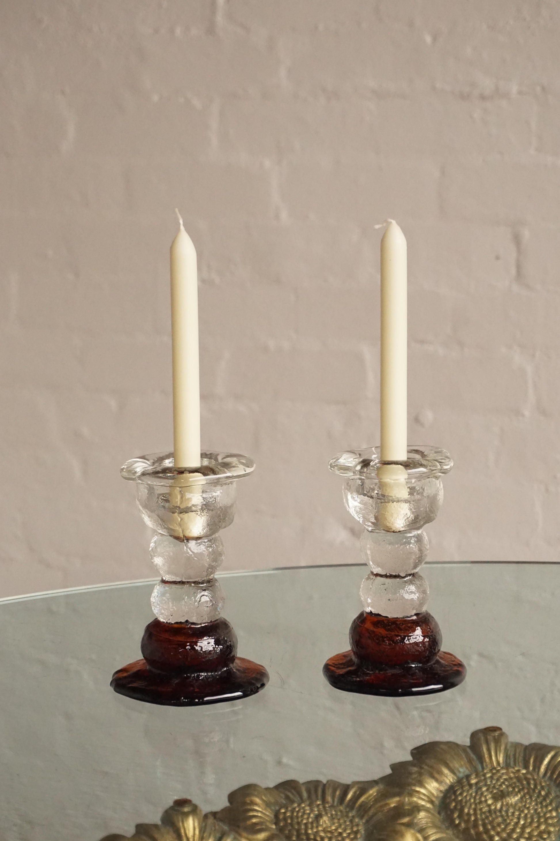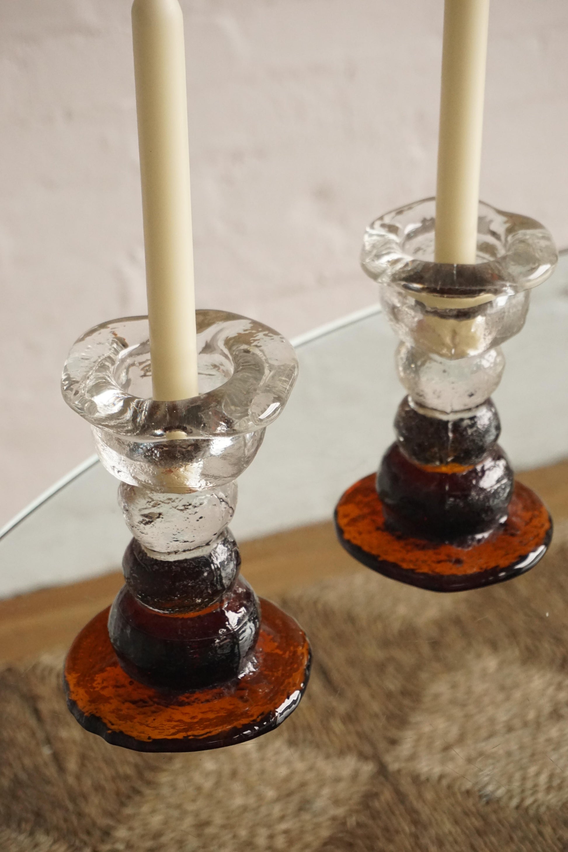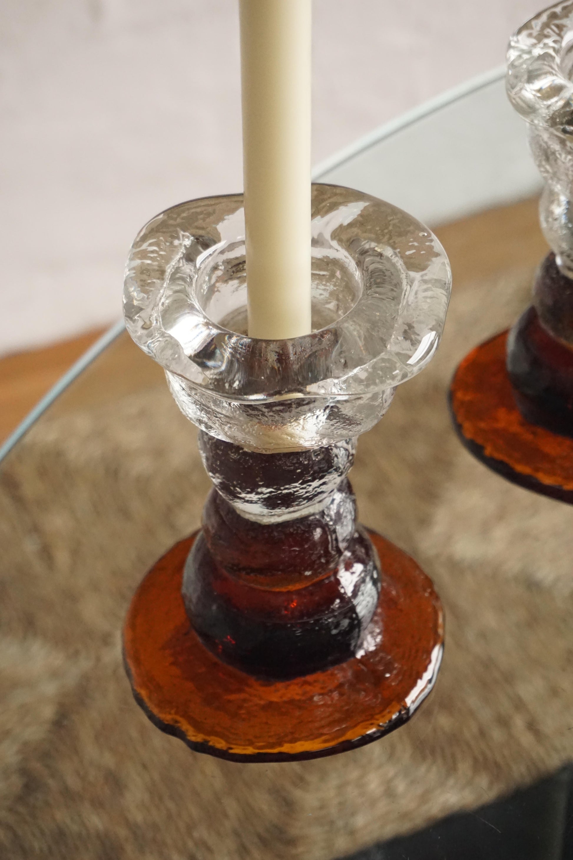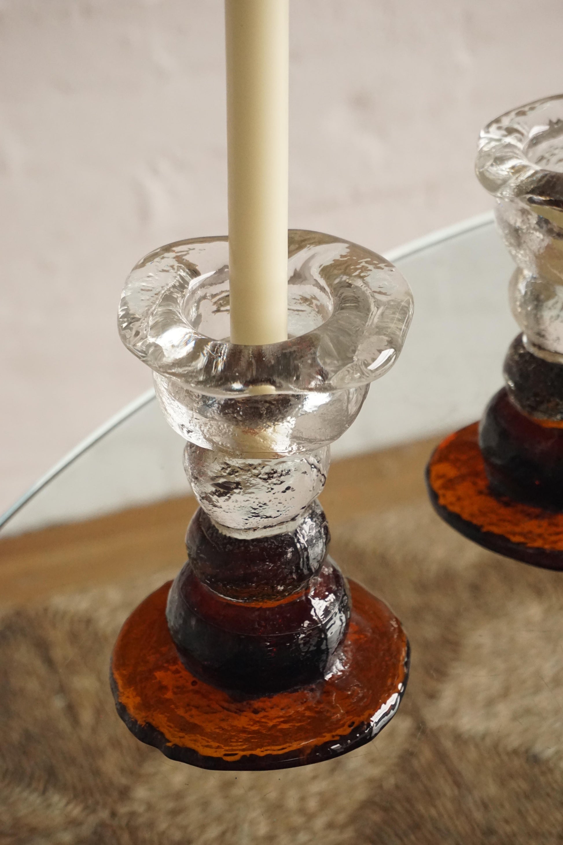 Pair of handmade glass candle holders by Humppila, Finland c.1970s. From their "Kivi" or "Rock" collection. Clear and amber glass with a textured surface. Heavy glass for stability. Excellent condition.