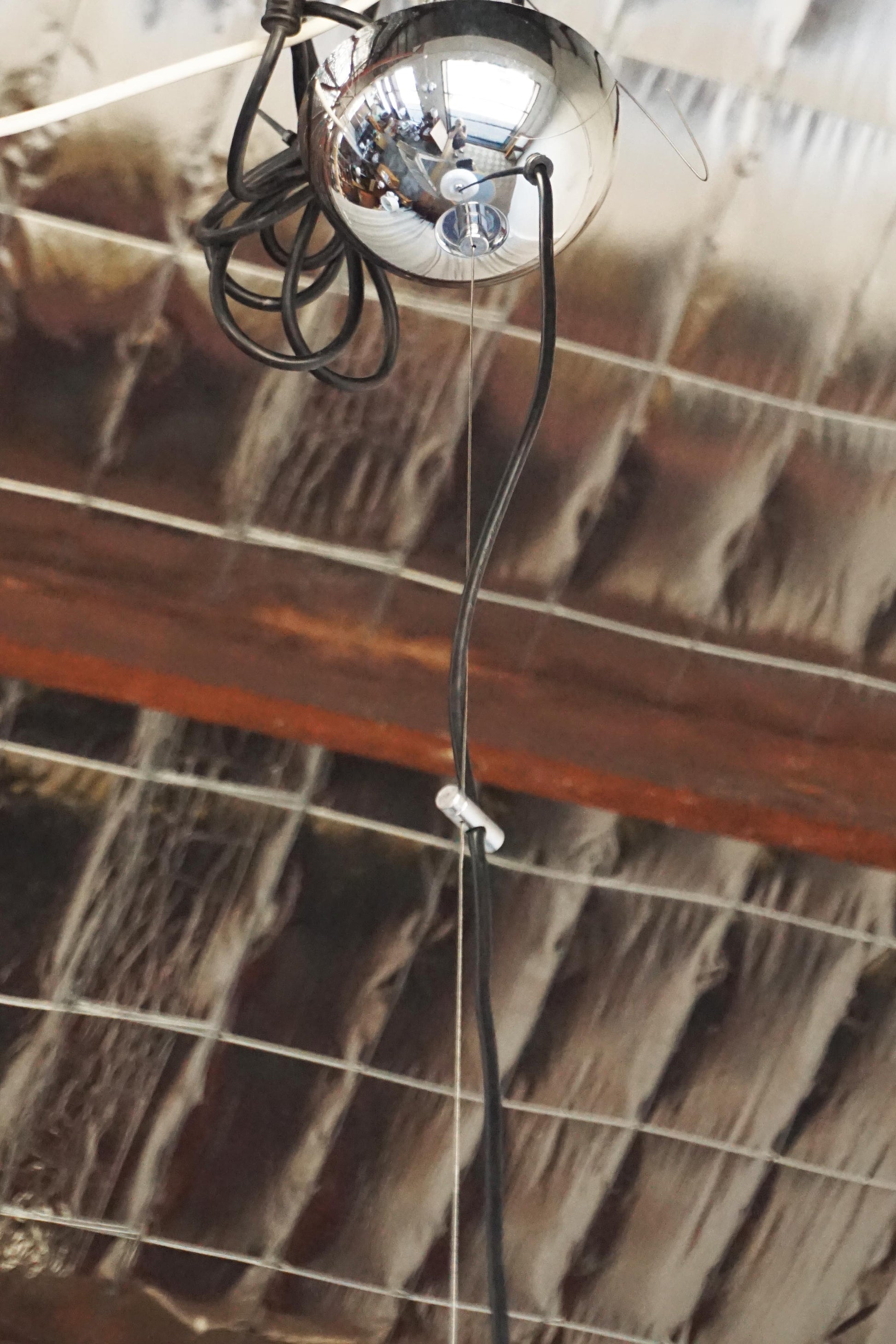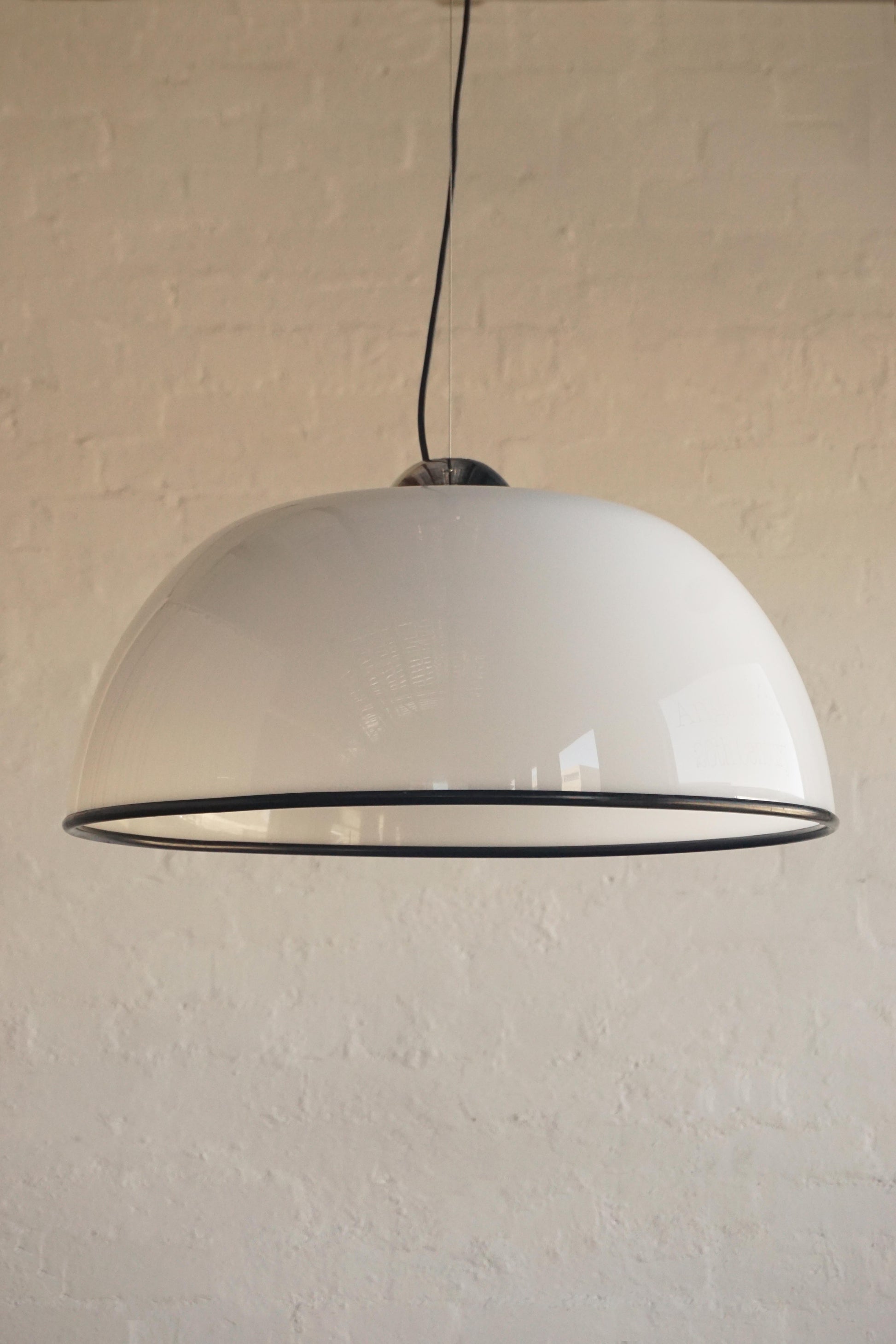 Pendant by Guzzini c.1960s Italy. White acrylic shade with contrast black trim and polished chrome fixture. Fully rewired to Australian Standard with 2 metres of black flex, hanging wire and original chrome ceiling canopy.