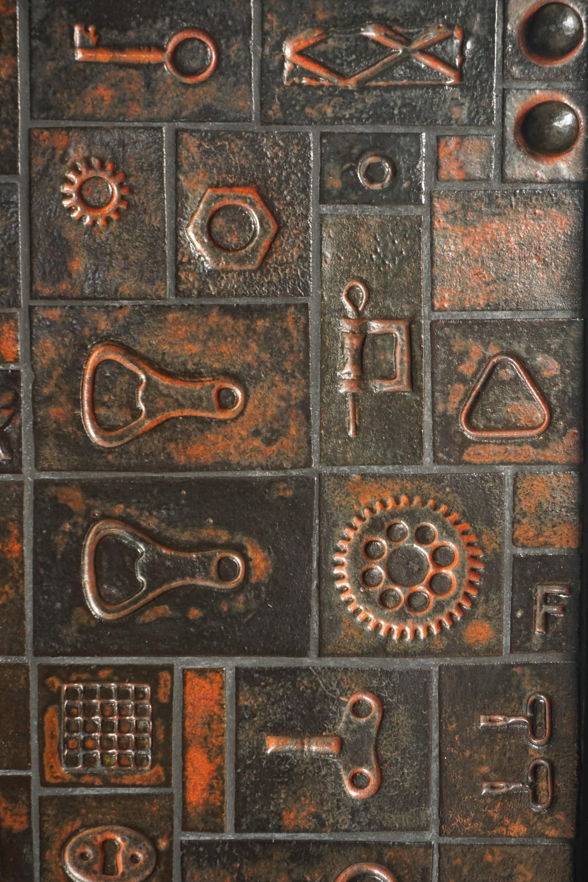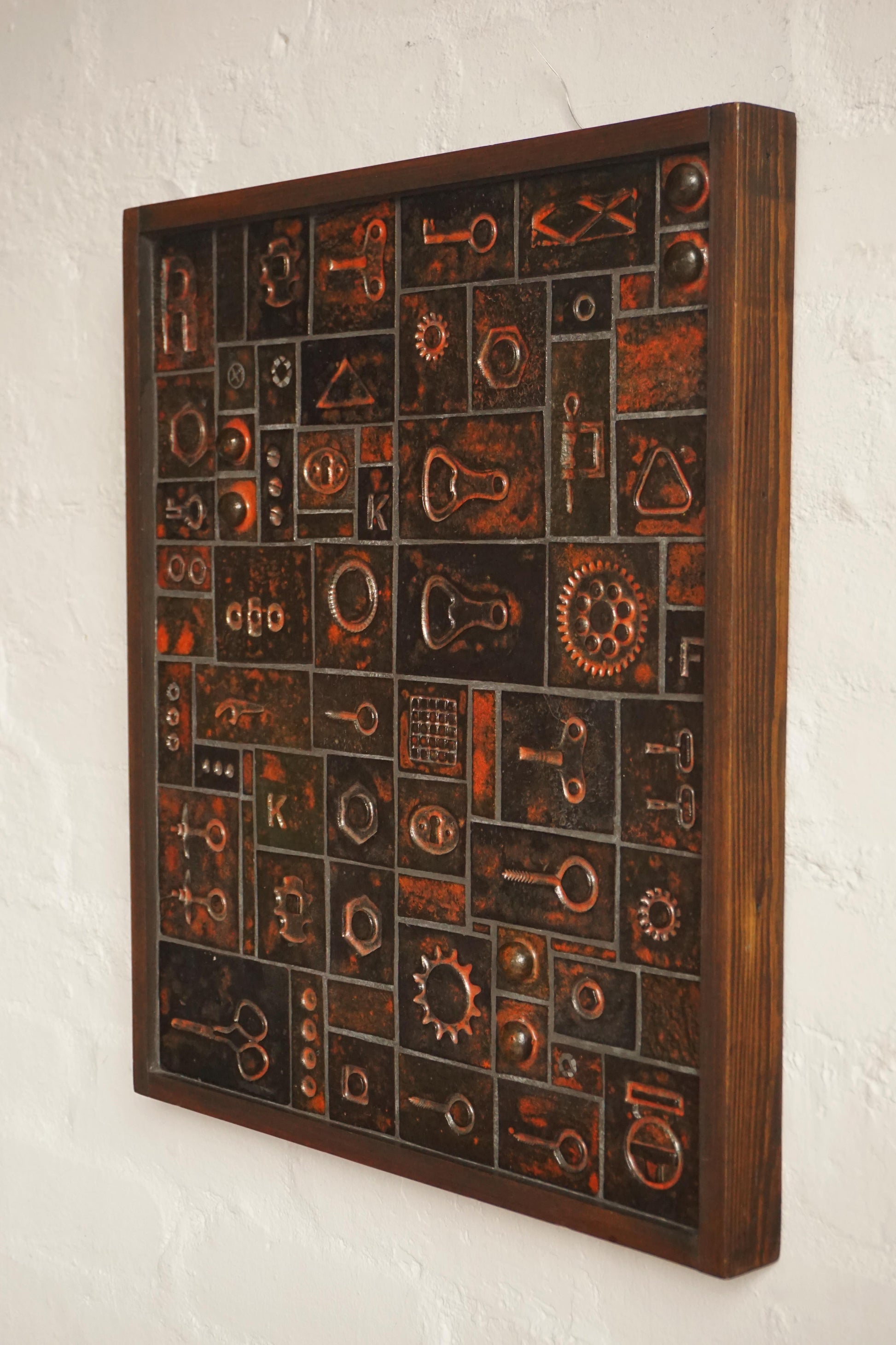 Handmade ceramic wall plaque c.1960s. Tiles have been impressed with industrial objects such as locks, bottle openers and keys. Timber frame. Unknown maker.