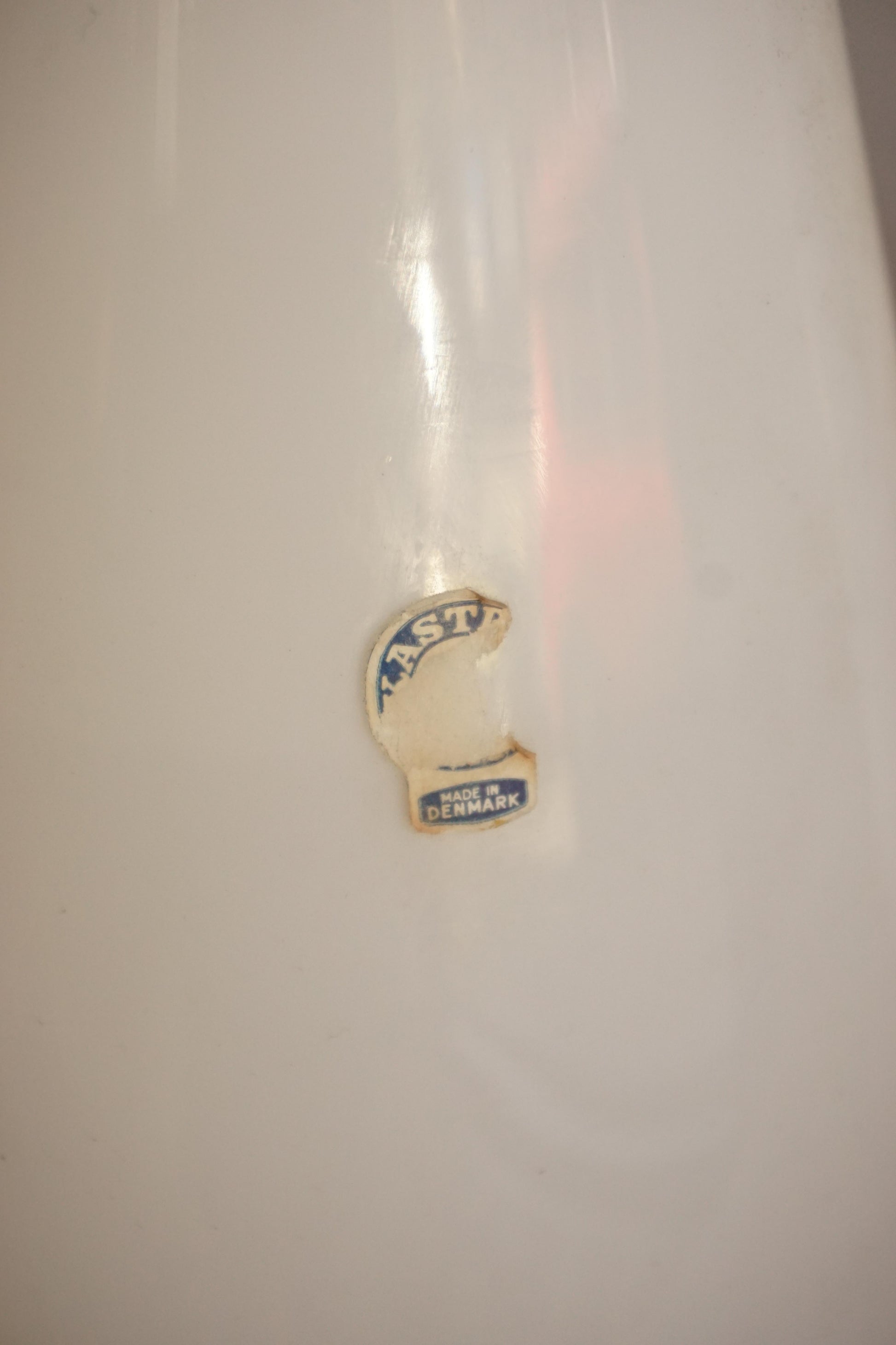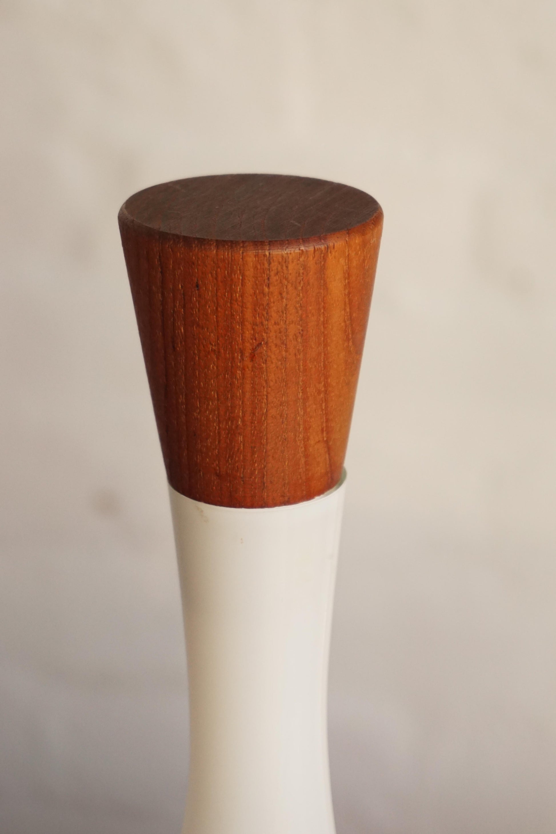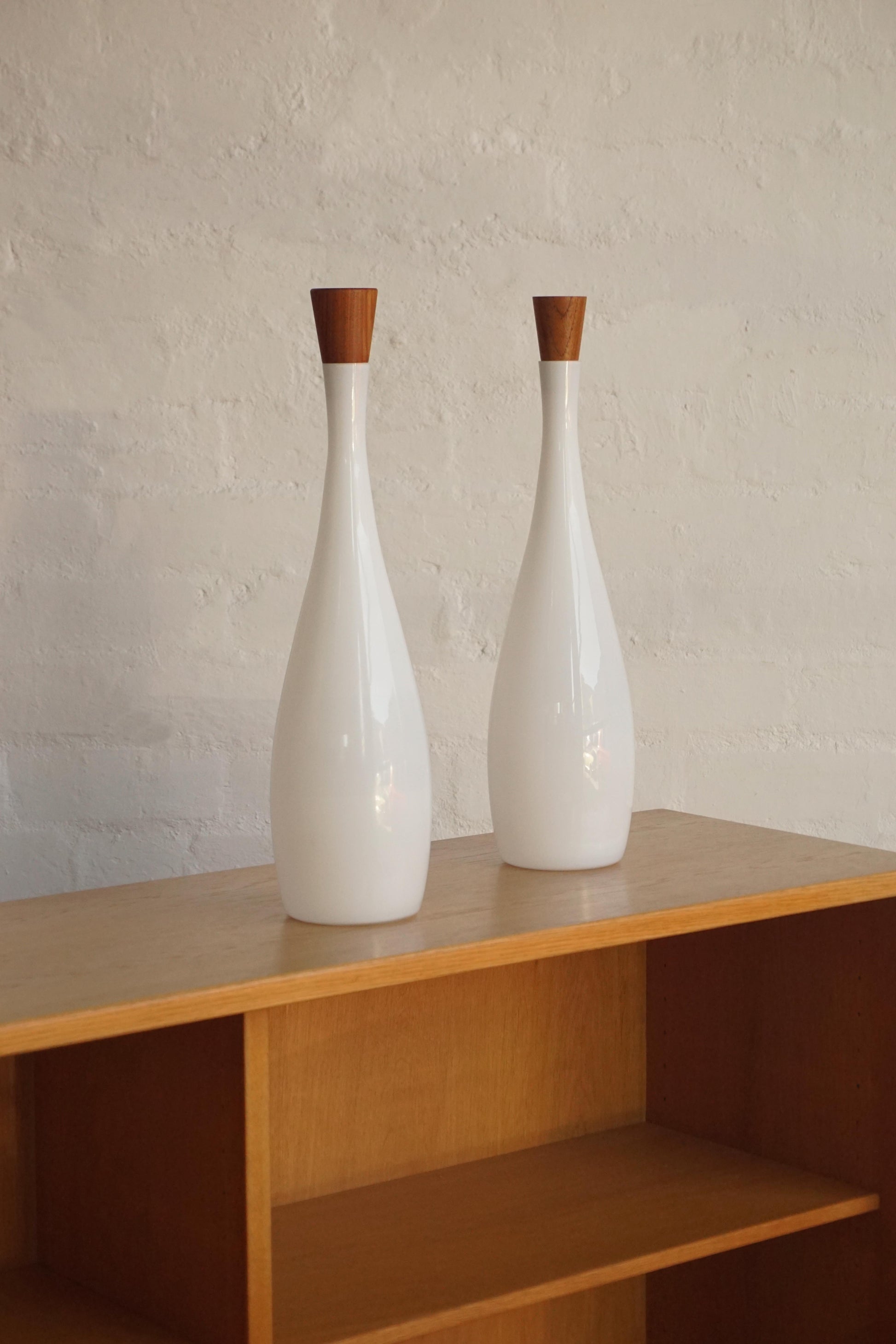 Tall glass bottles designed by Jacob Bang for Kastrup c.1957 Denmark. Opaline glass with a teak stopper. Makers sticker on one of the bottles.