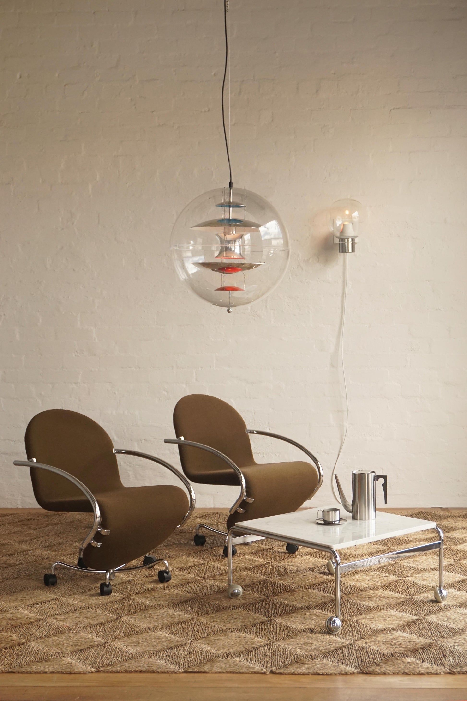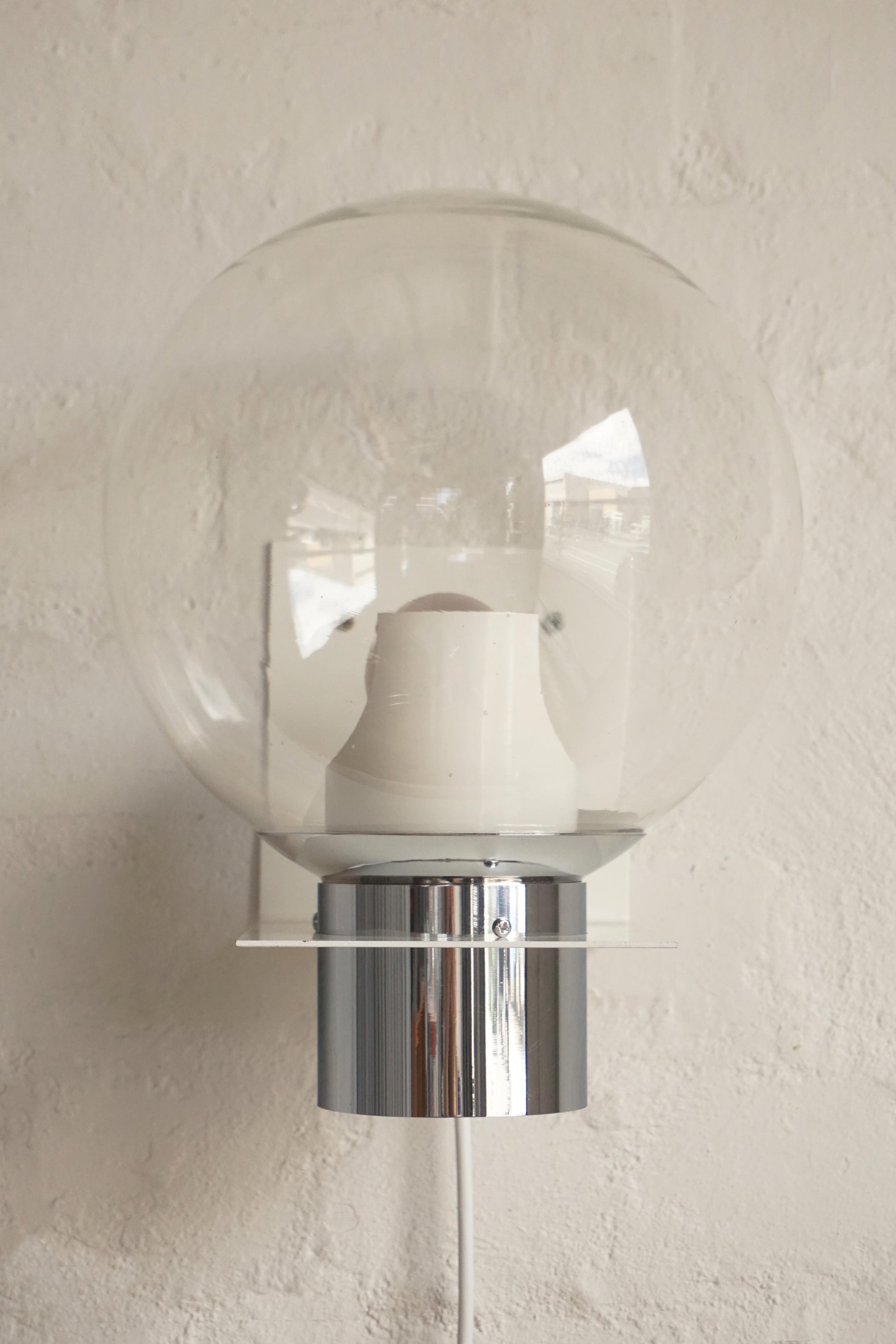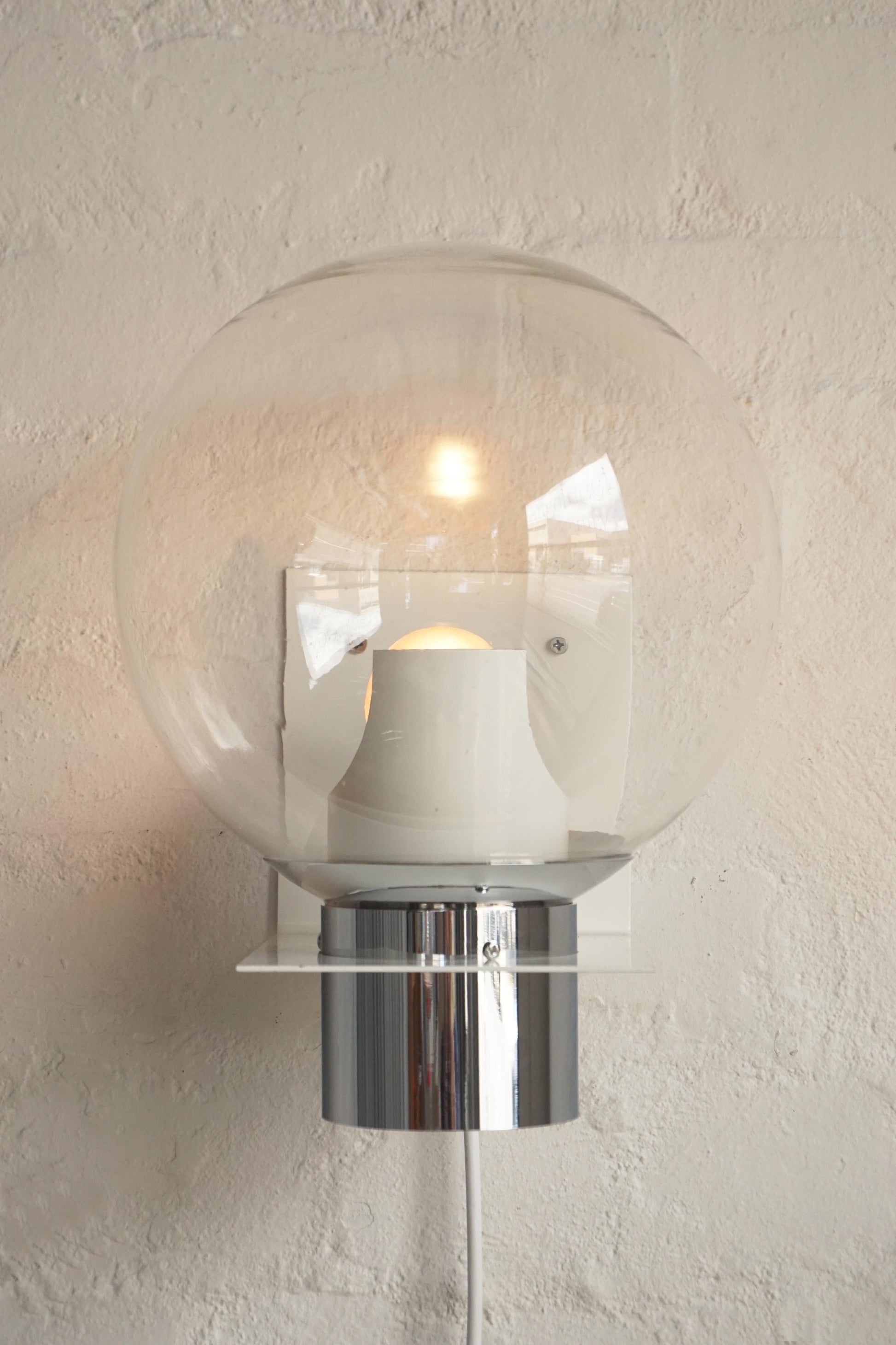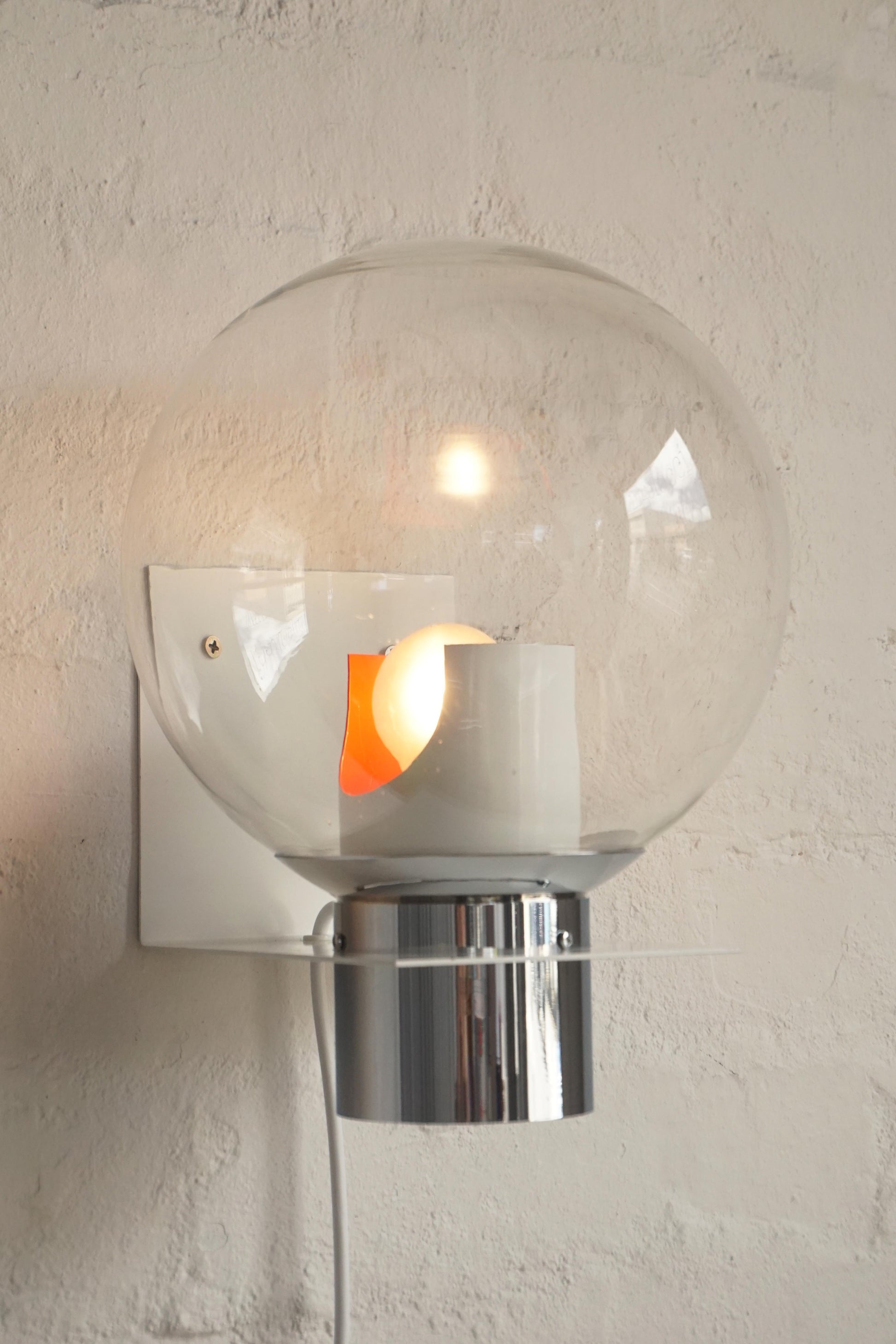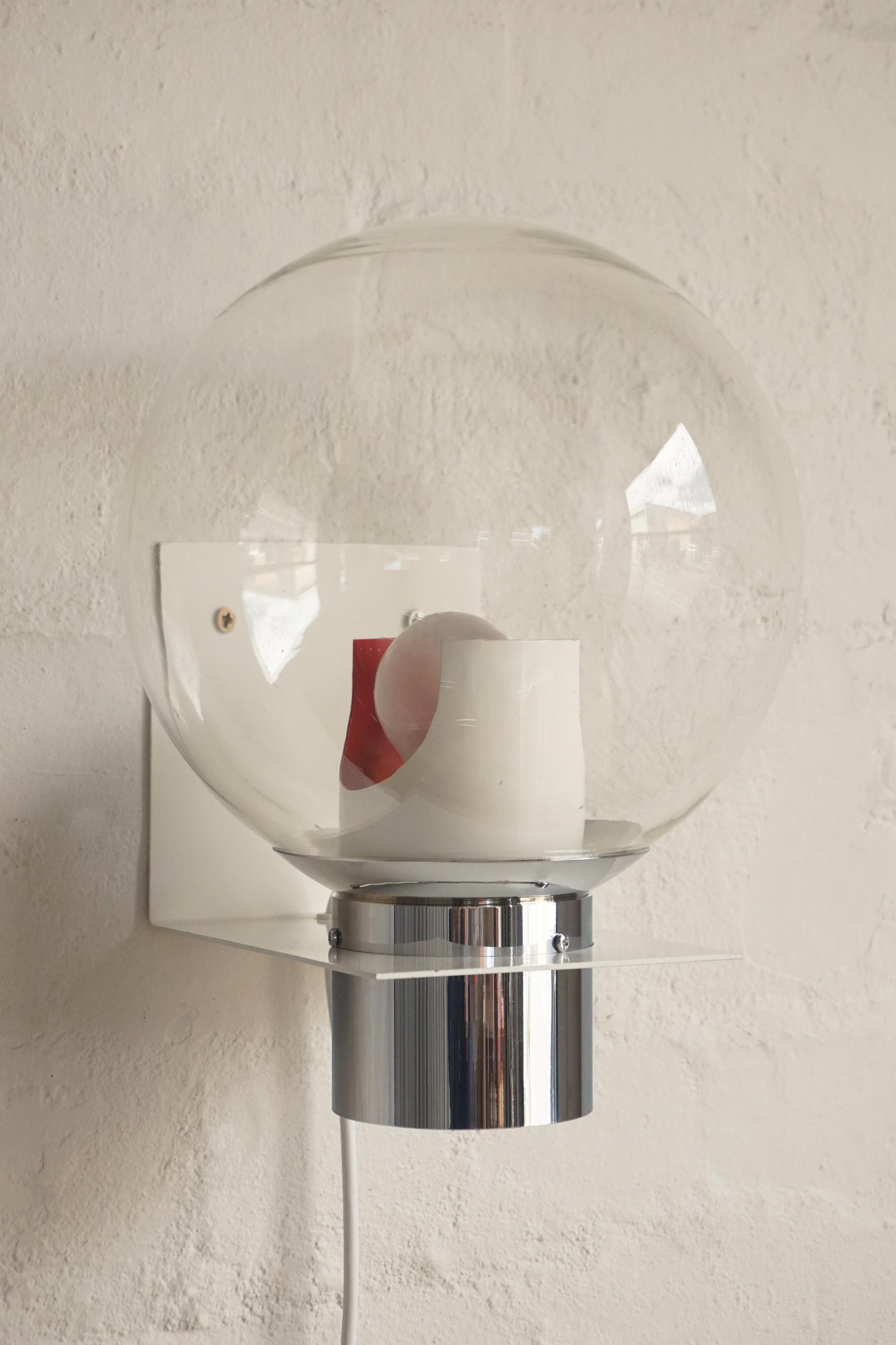 Space-age sconce by Lyfa c.1960s Denmark. Glass dome rests upon a polished chrome base. Metal backing plate in original white enamel with red enamel interior. Fully rewired to Australian Standard.