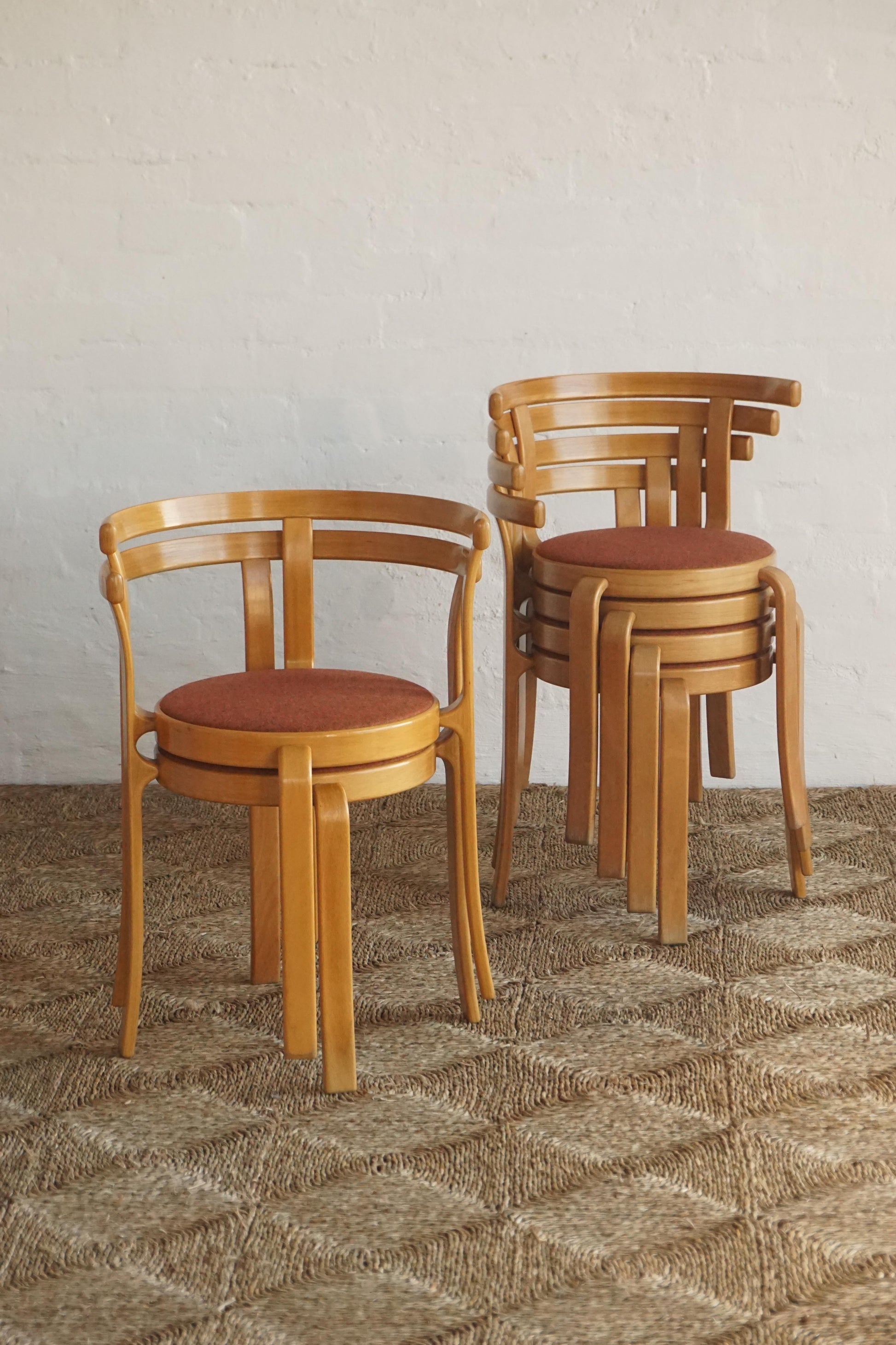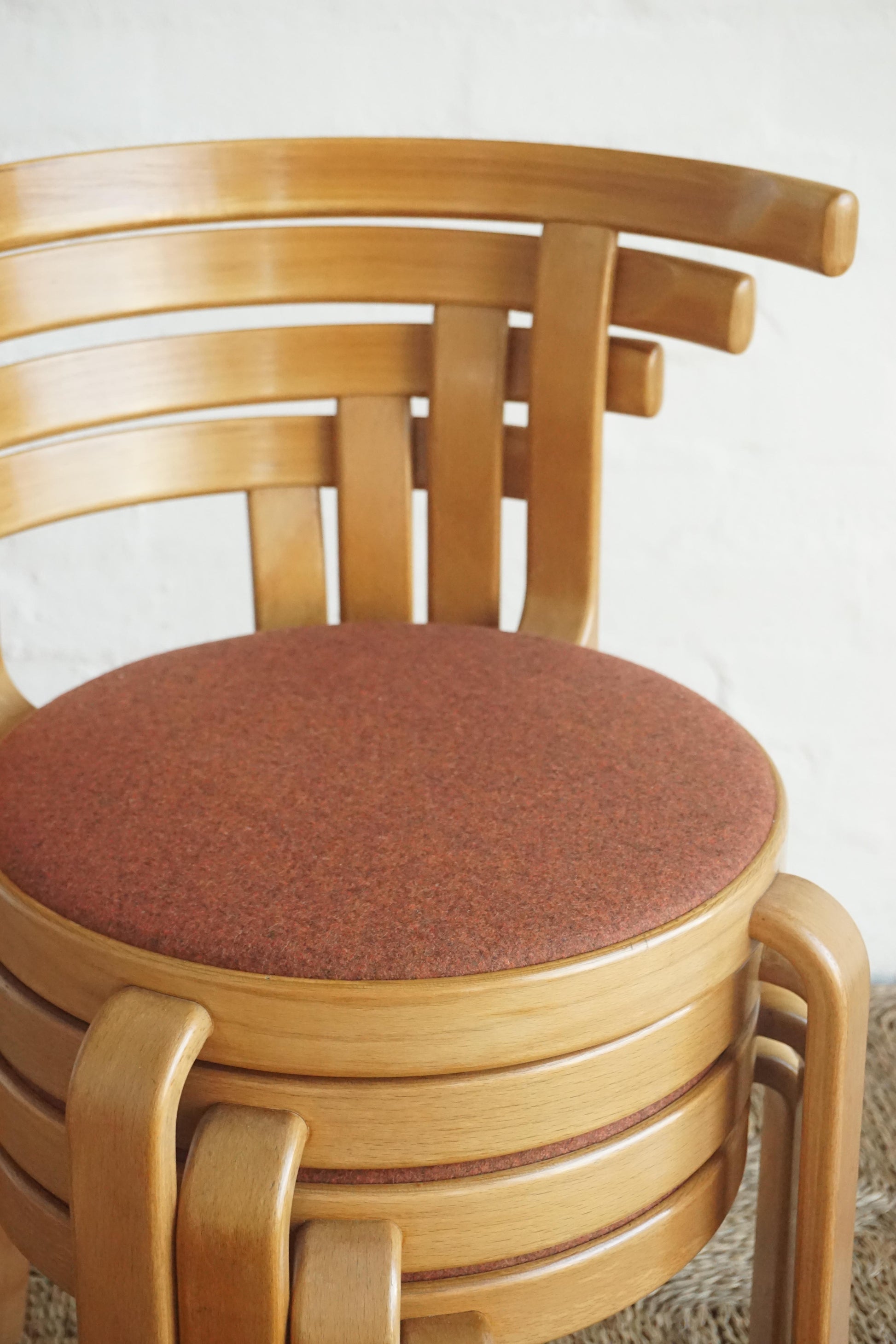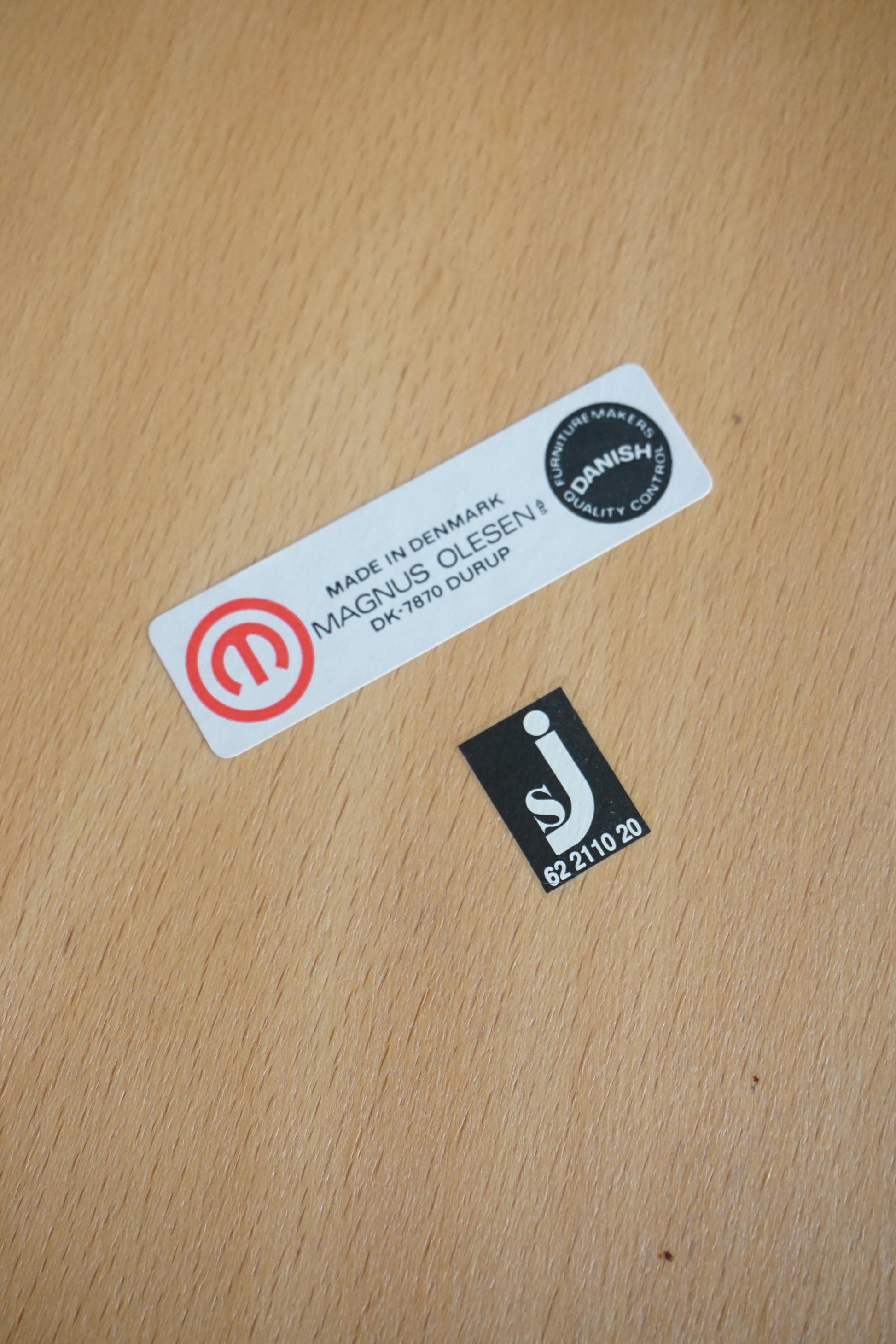 Set of 6 dining chairs designed by Rud Thygesen & Johnny Sorensen for Magnus Olesen, 1970s Denmark. Stackable beech frames have been restored with all new seat upholstery.