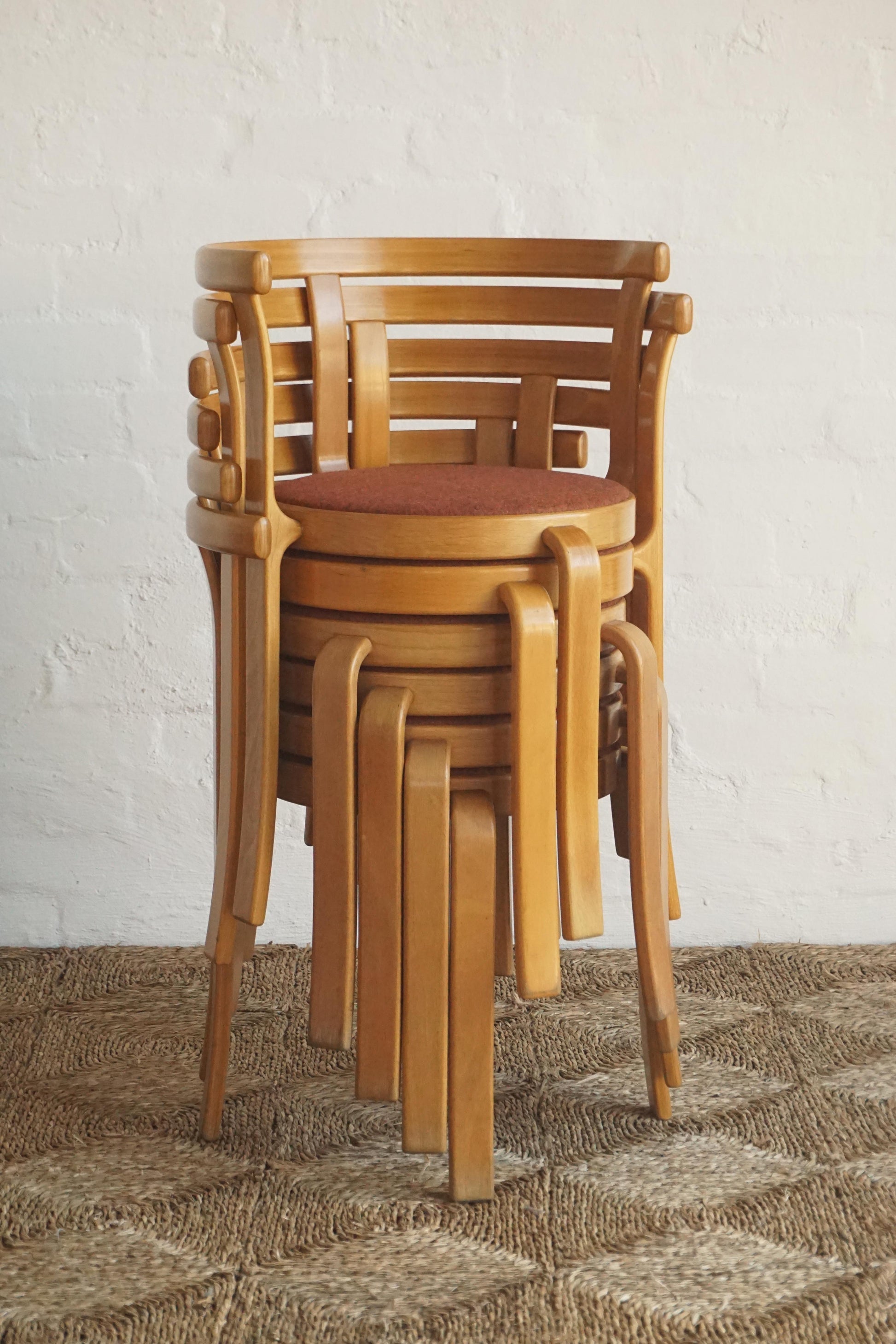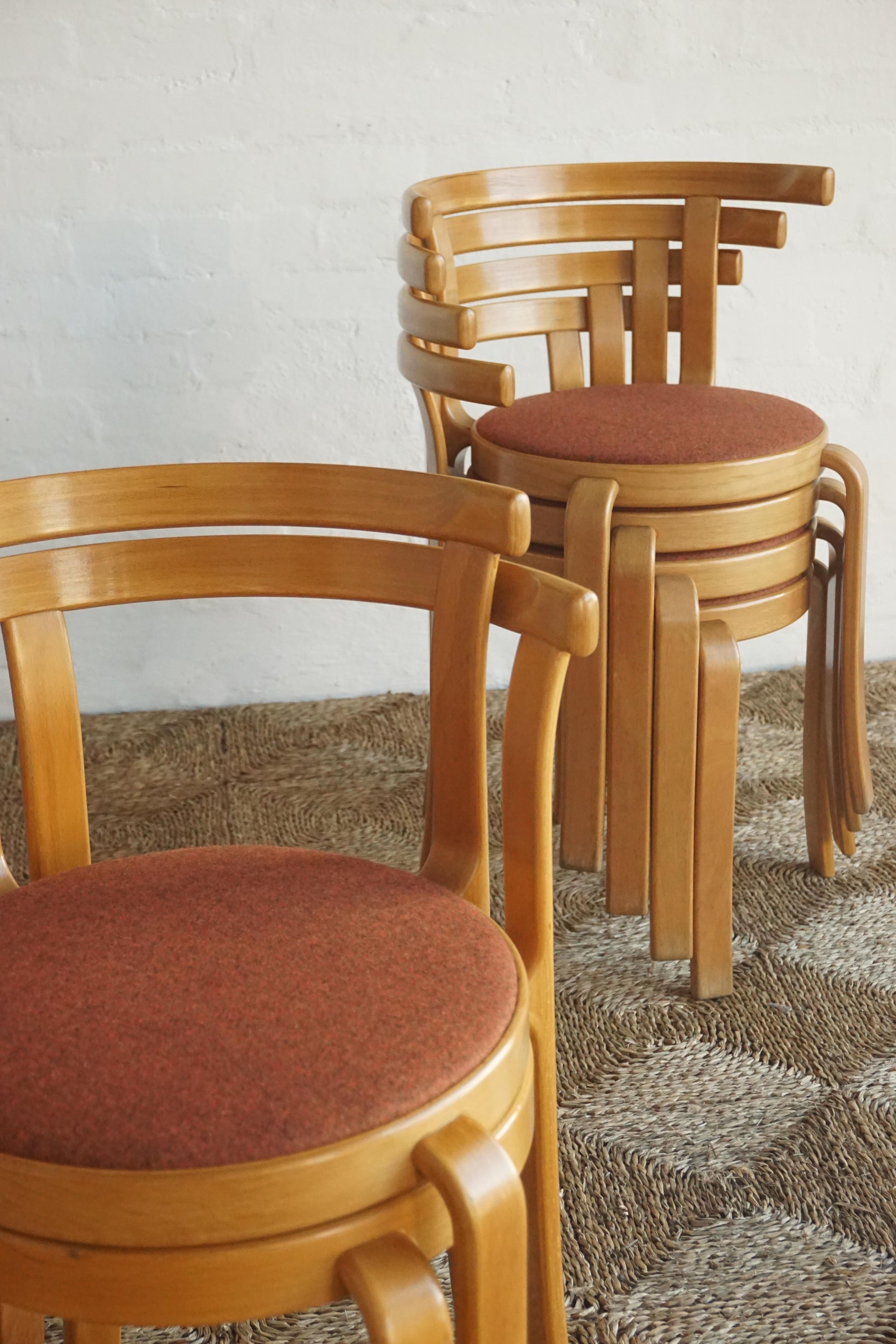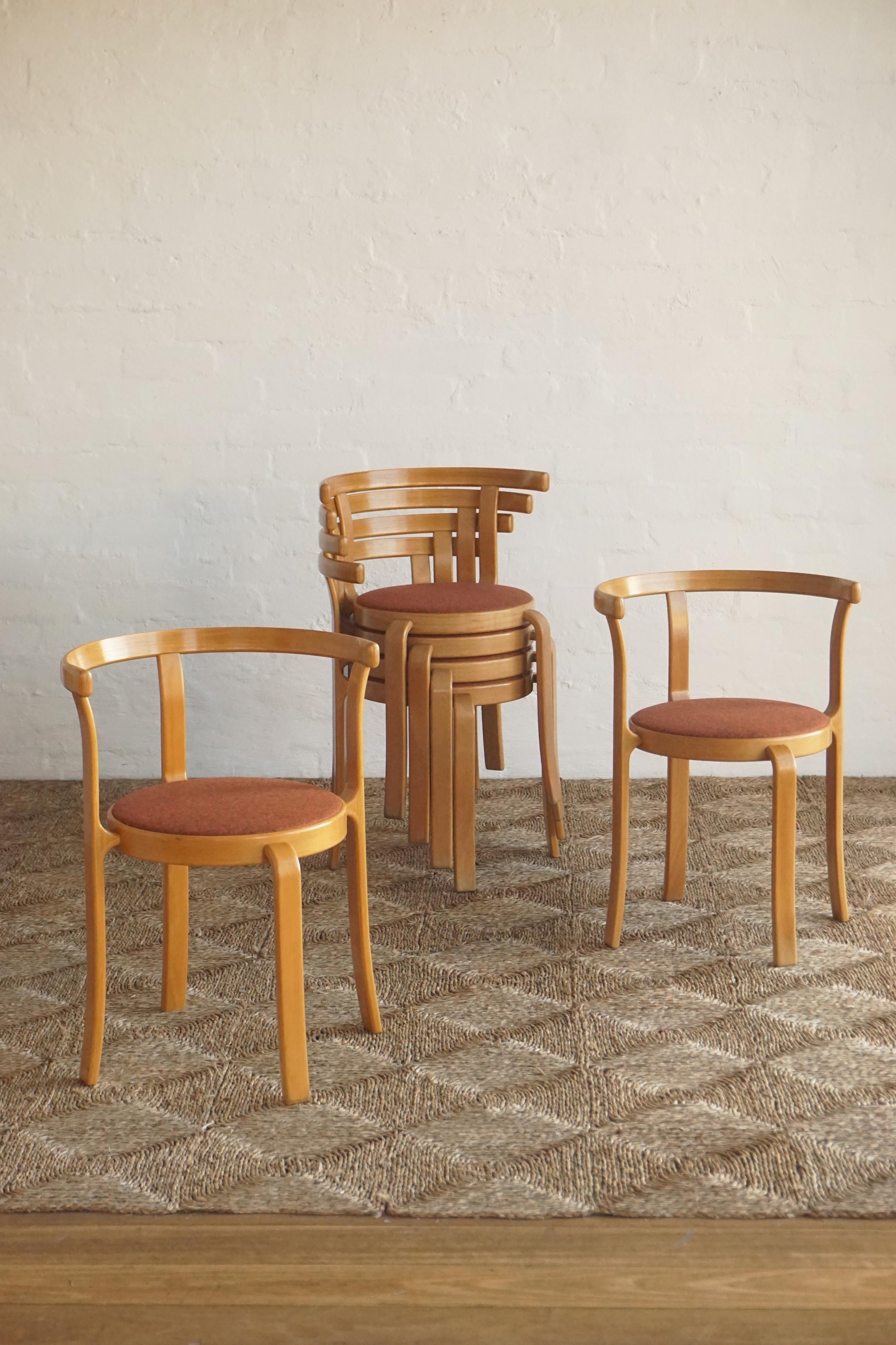 Set of 6 dining chairs designed by Rud Thygesen & Johnny Sorensen for Magnus Olesen, 1970s Denmark. Stackable beech frames have been restored with all new seat upholstery.