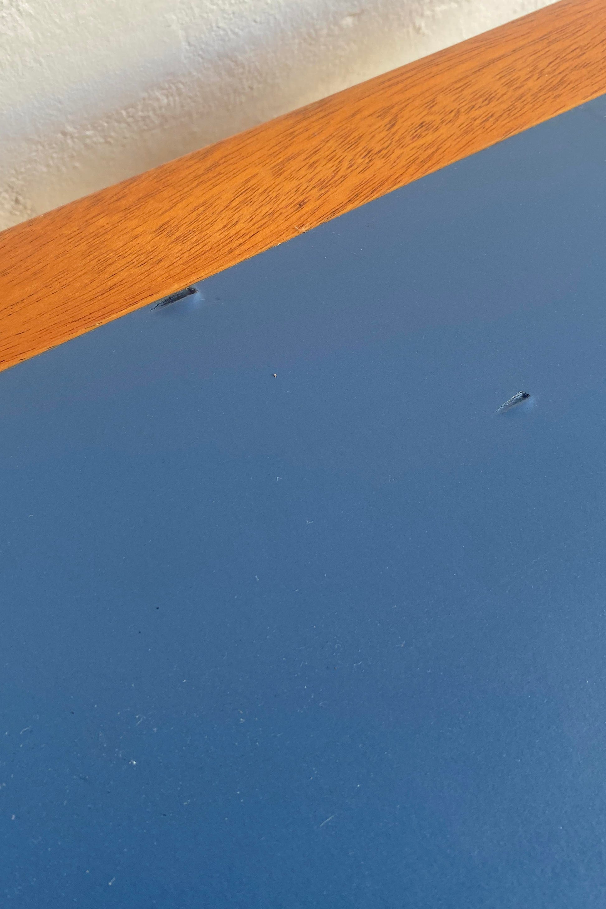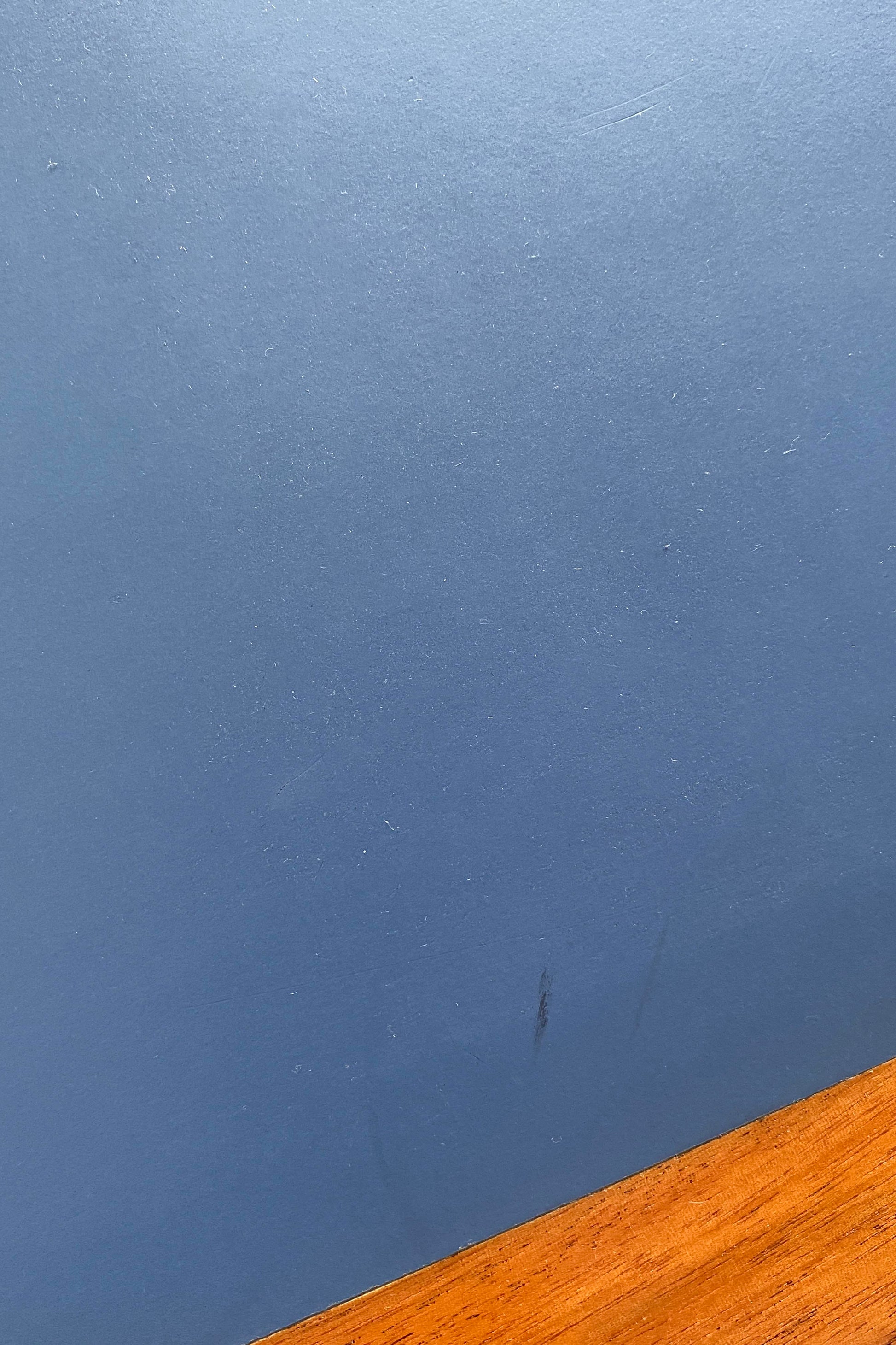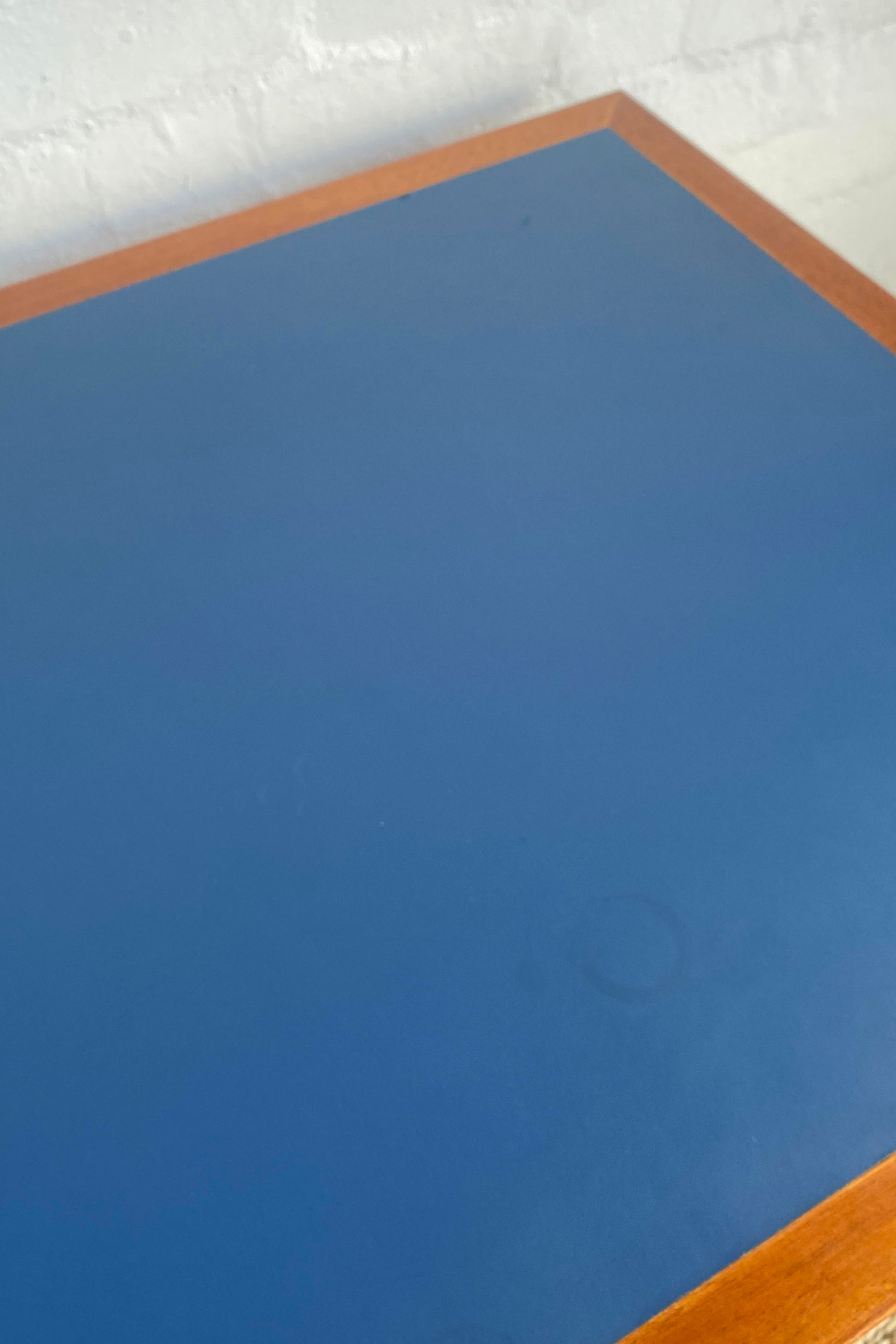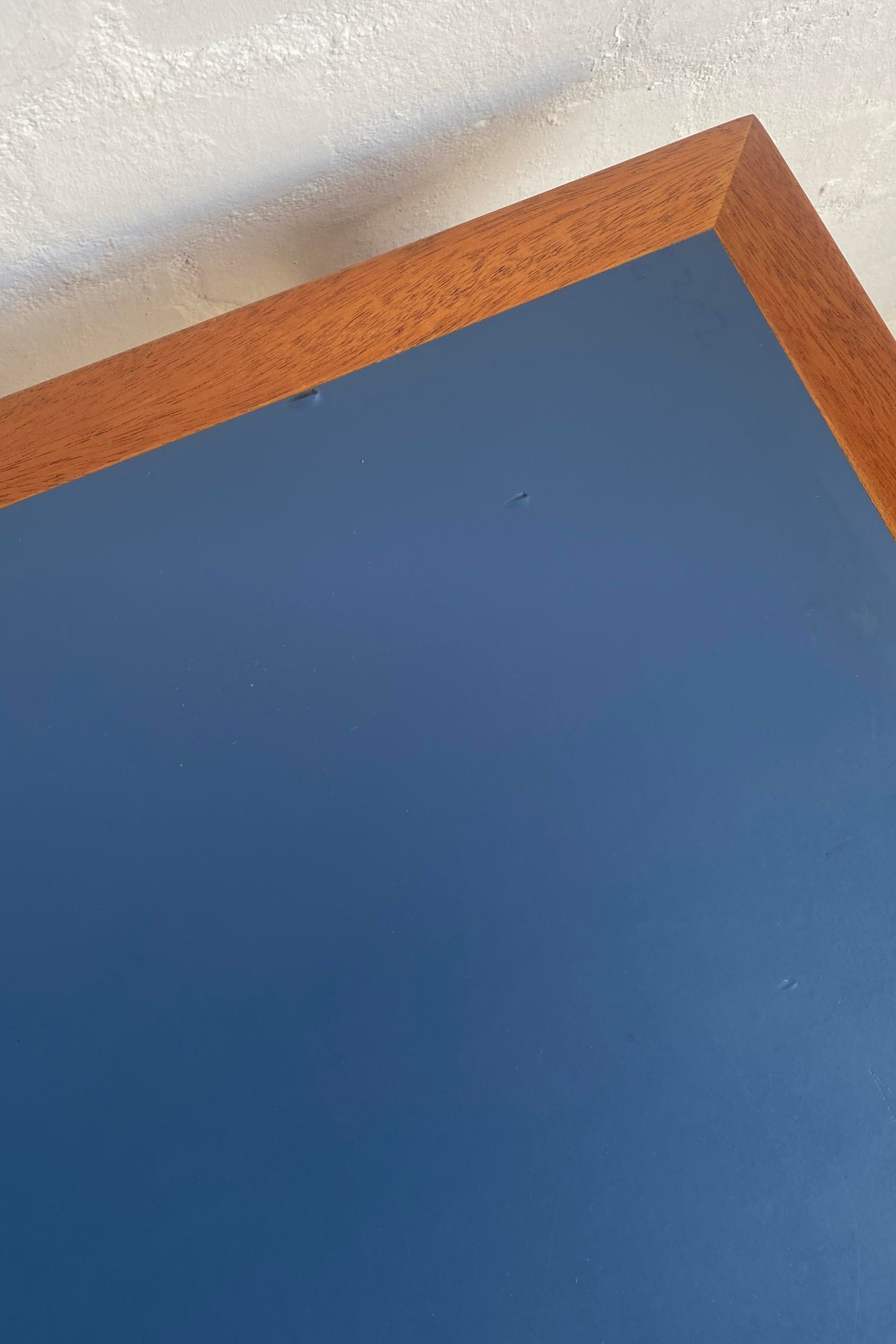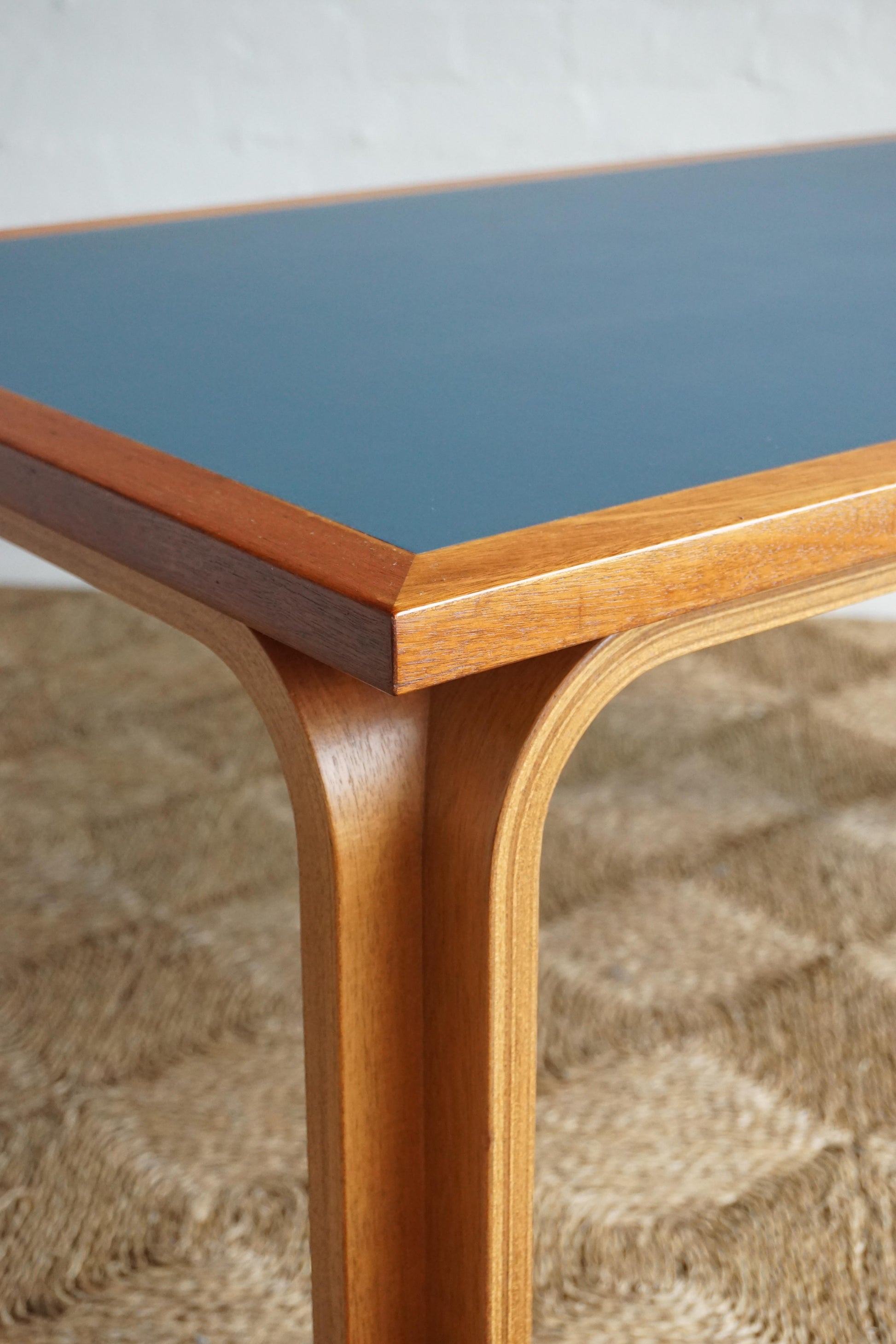 Dining table, or desk, designed by Rud Thygesen & Johnny Sørensen for Magnus Olesen, 1970s Denmark. Mahogany frame with blue linoleum table top. Table has been waxed and polished. The inset linoleum has some wear as shown in photos, priced accordingly.