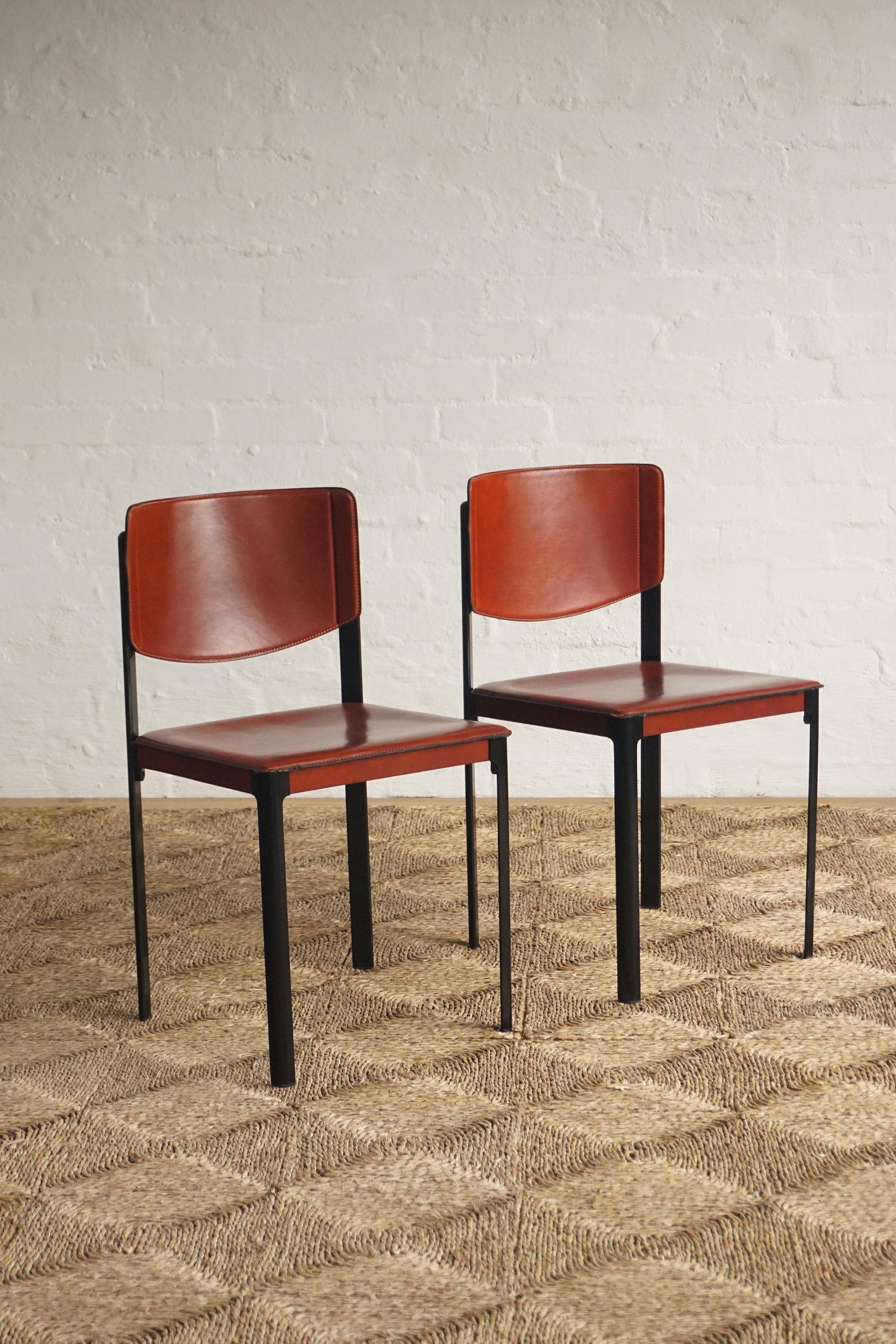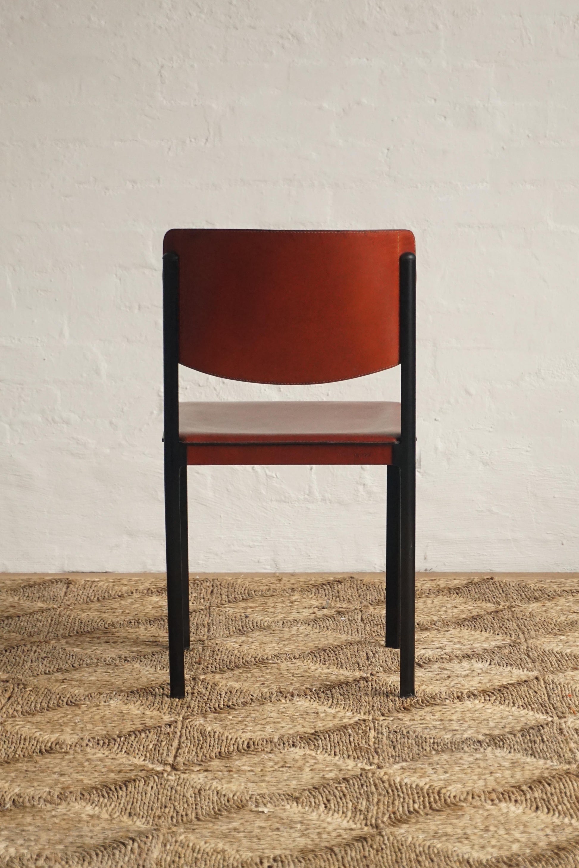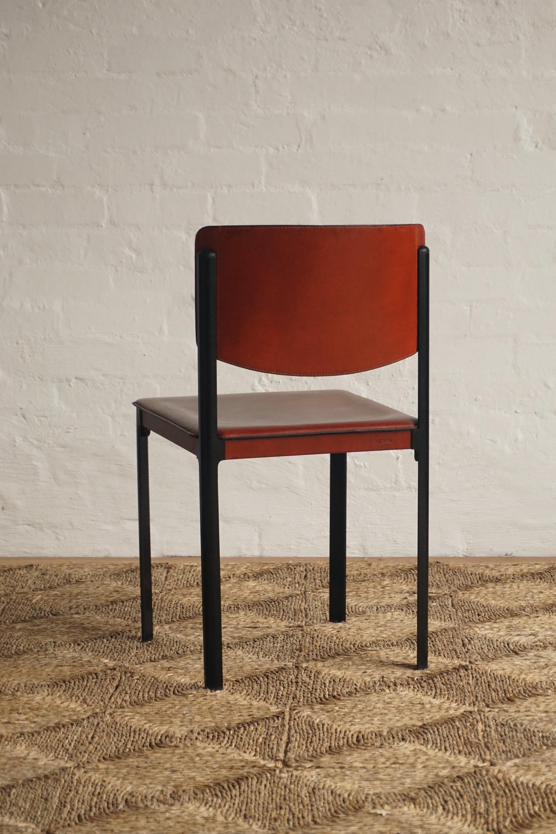 Leather dining chairs by Matteo Grassi c.1970s Italy. Brick-red leather over a heavy steel frame. General wear and scratches to the leather on each chair. Leather has been cleaned and conditioned. Makers mark.