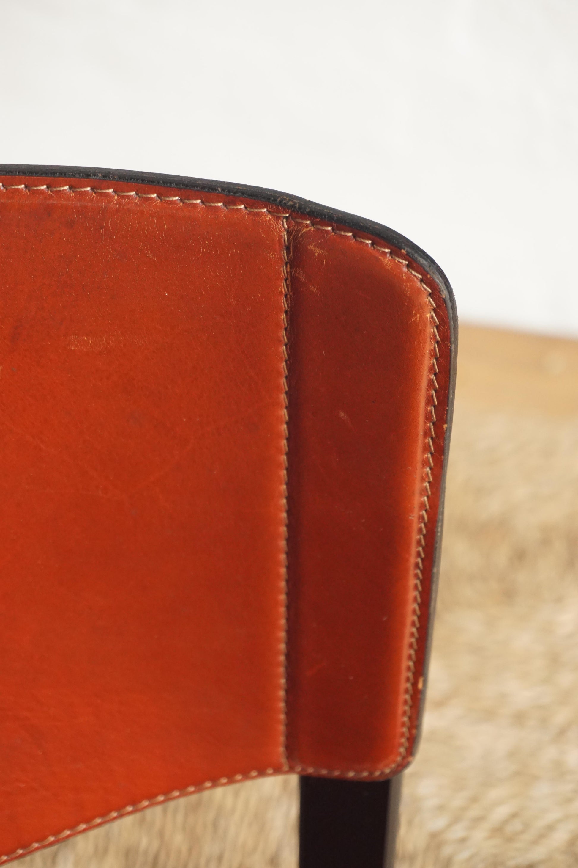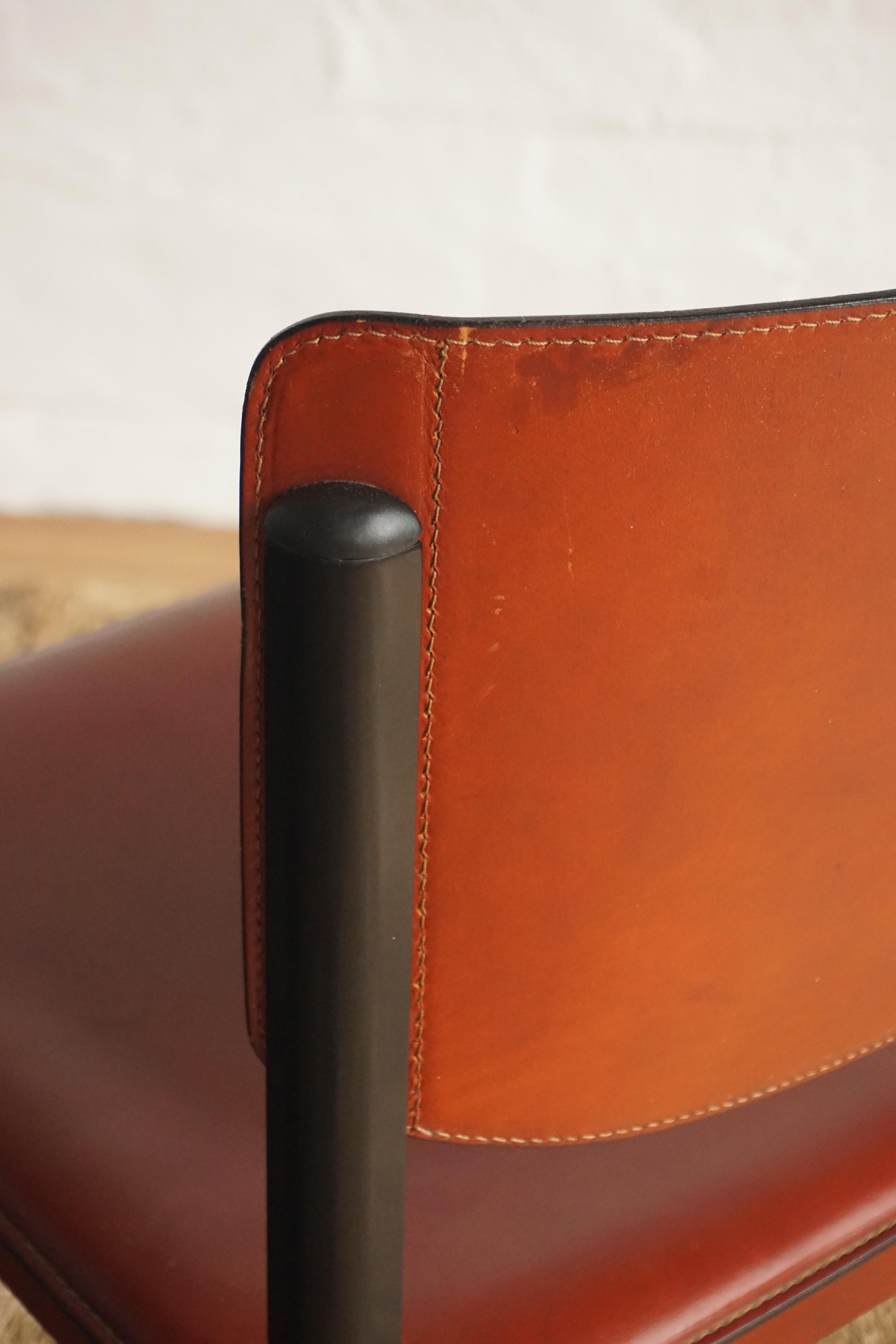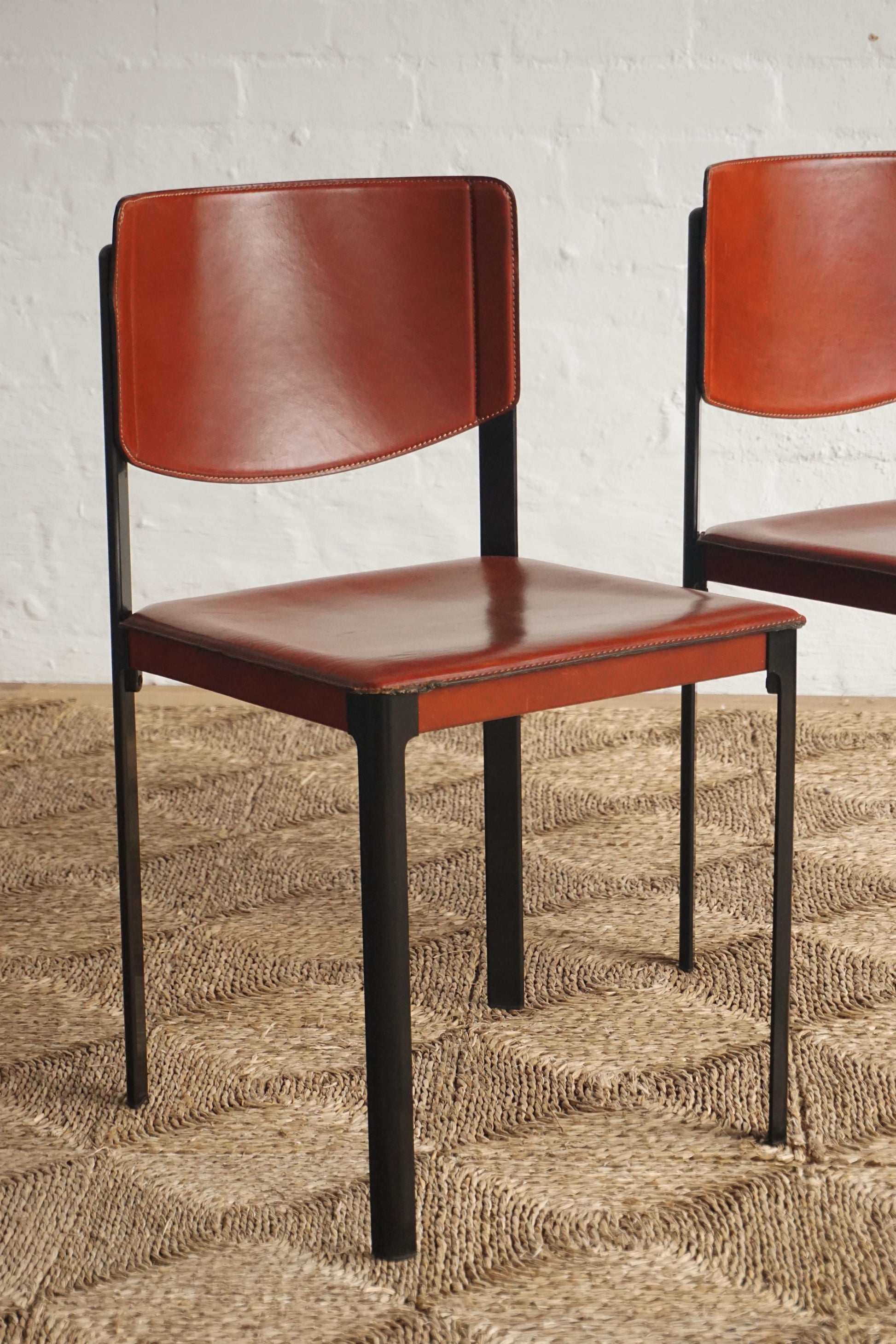 Leather dining chairs by Matteo Grassi c.1970s Italy. Brick-red leather over a heavy steel frame. General wear and scratches to the leather on each chair. Leather has been cleaned and conditioned. Makers mark.