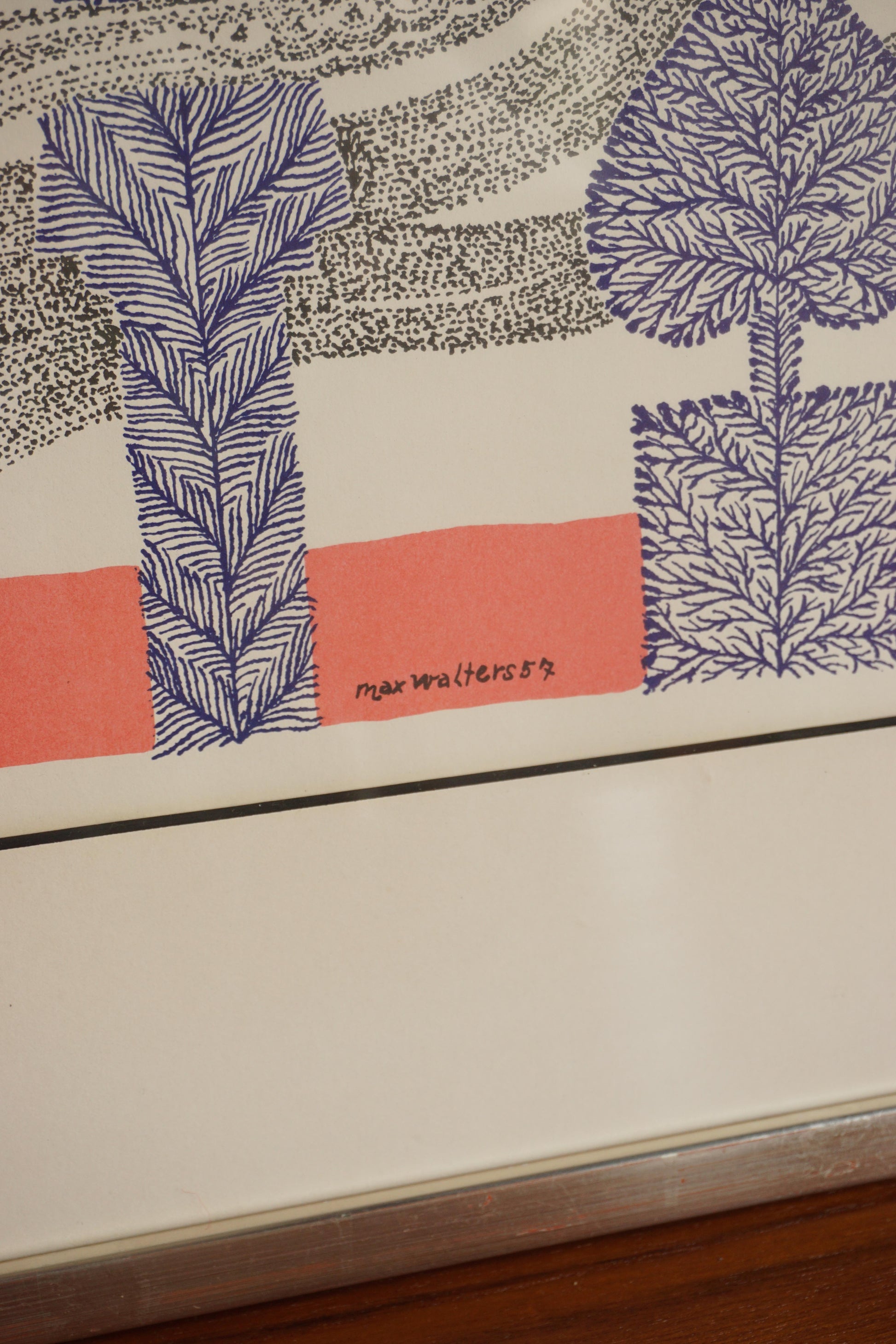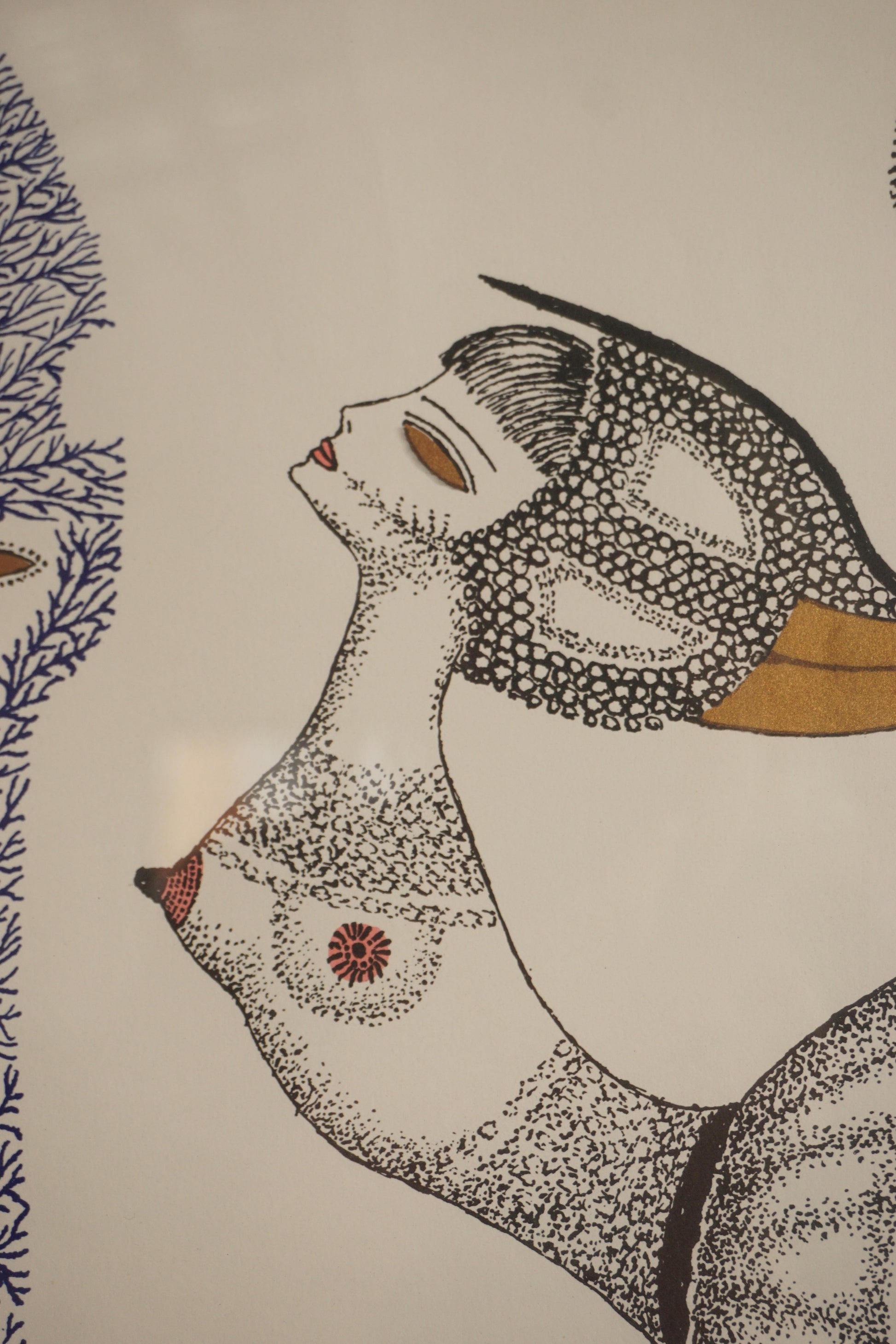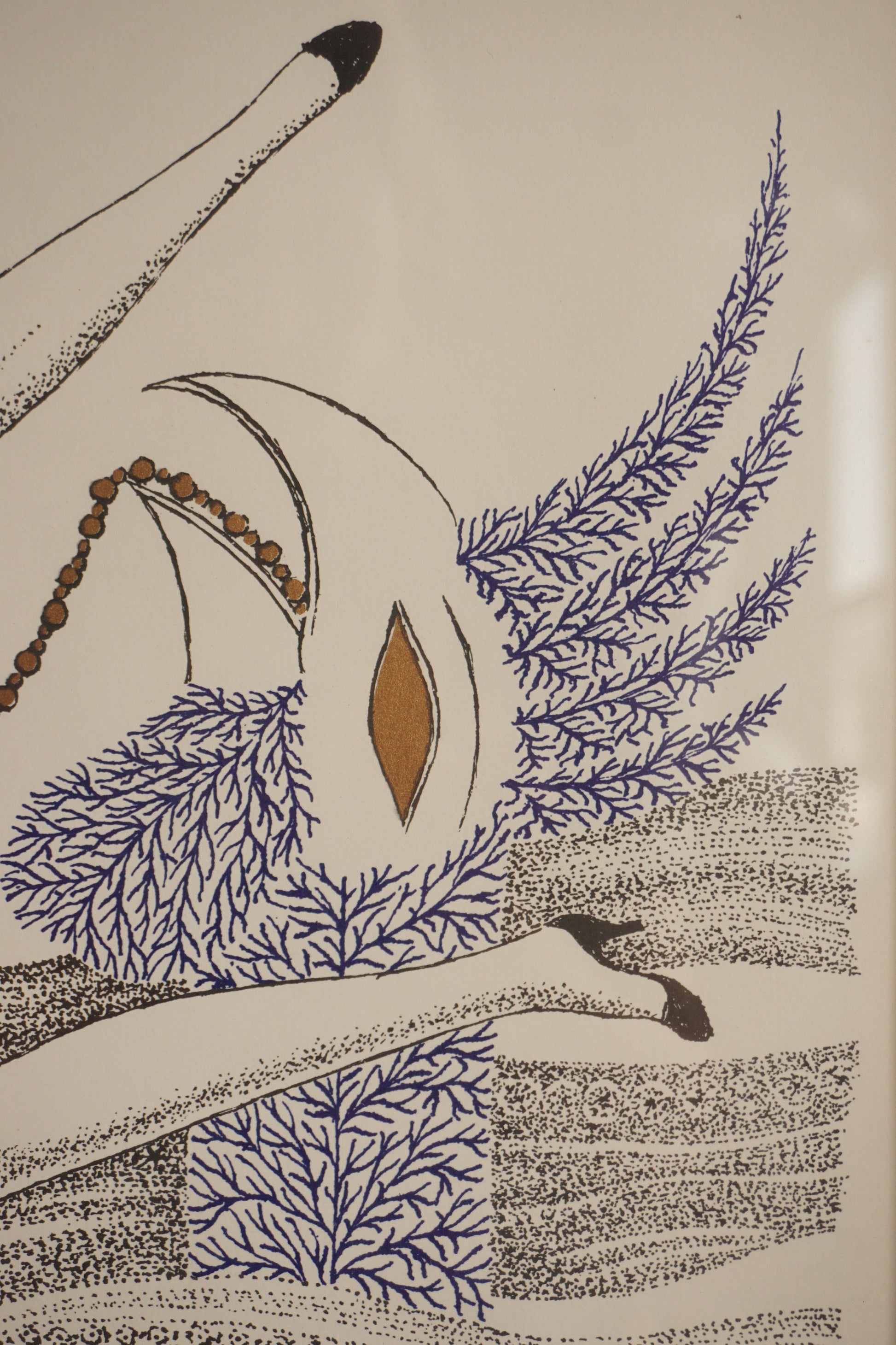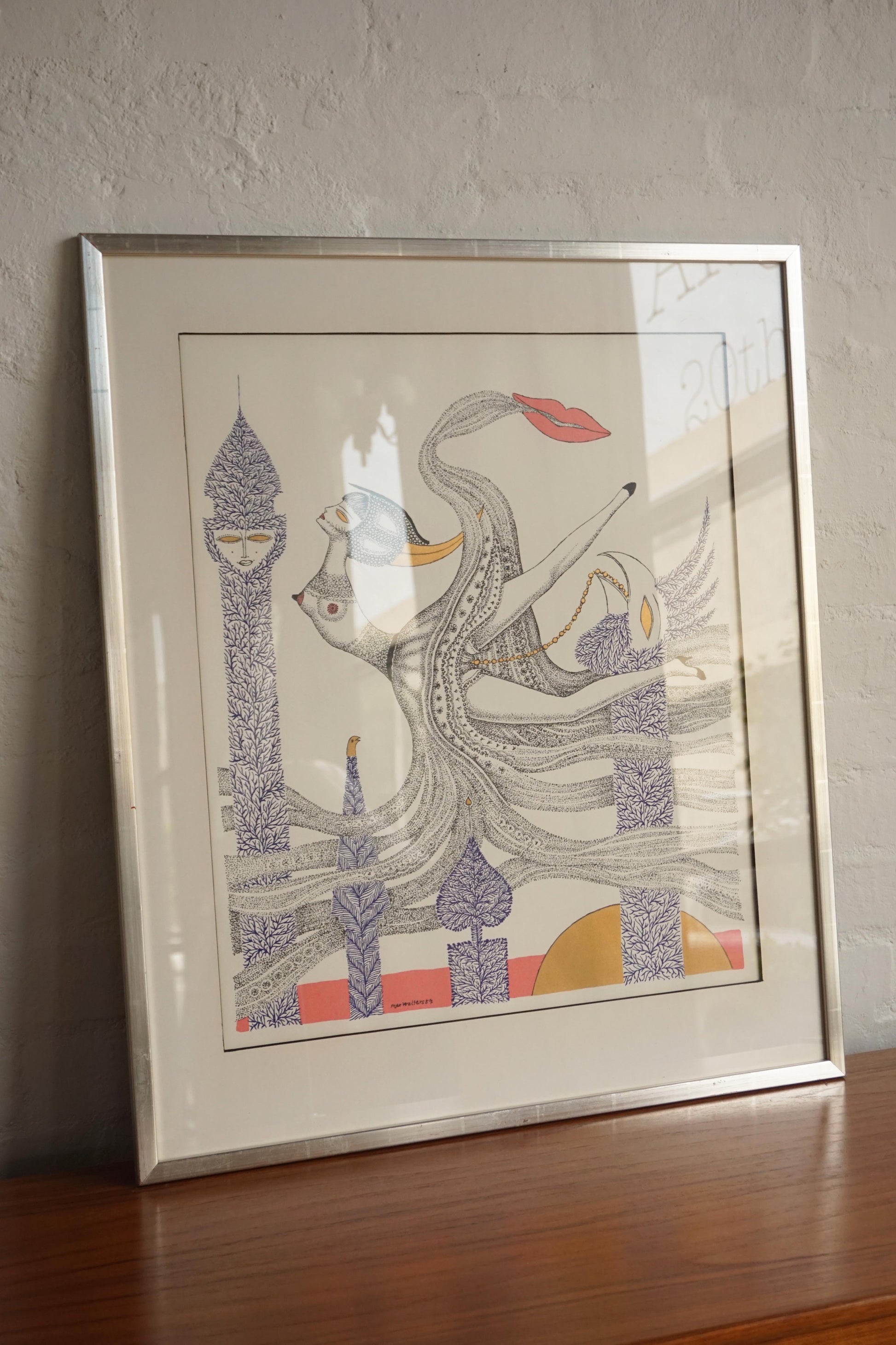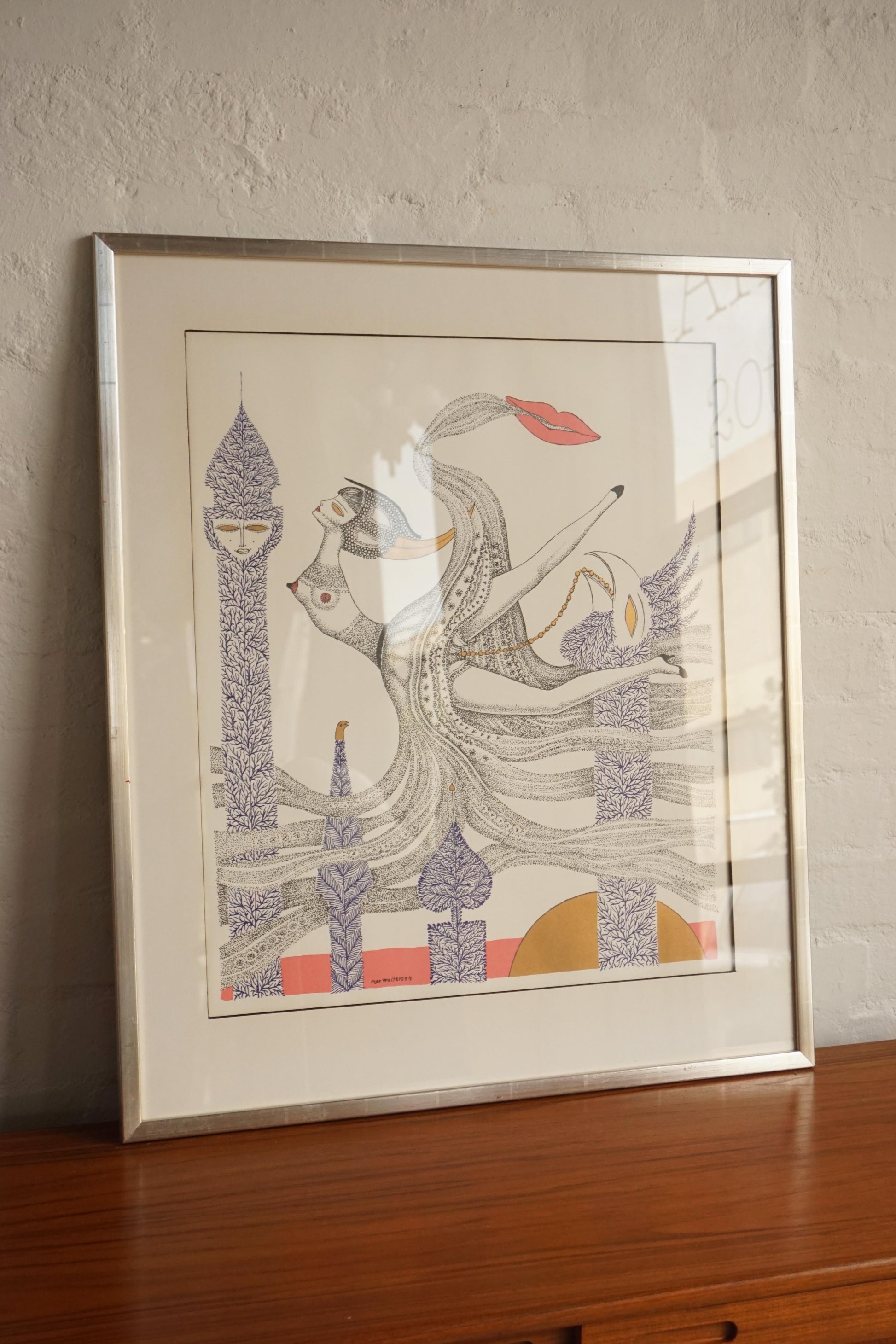 Framed surrealist lithograph with gold foil detail by Swedish artist Max Walter Svanberg c.1957. Printed signature. Original distressed silver lacquered timber frame.