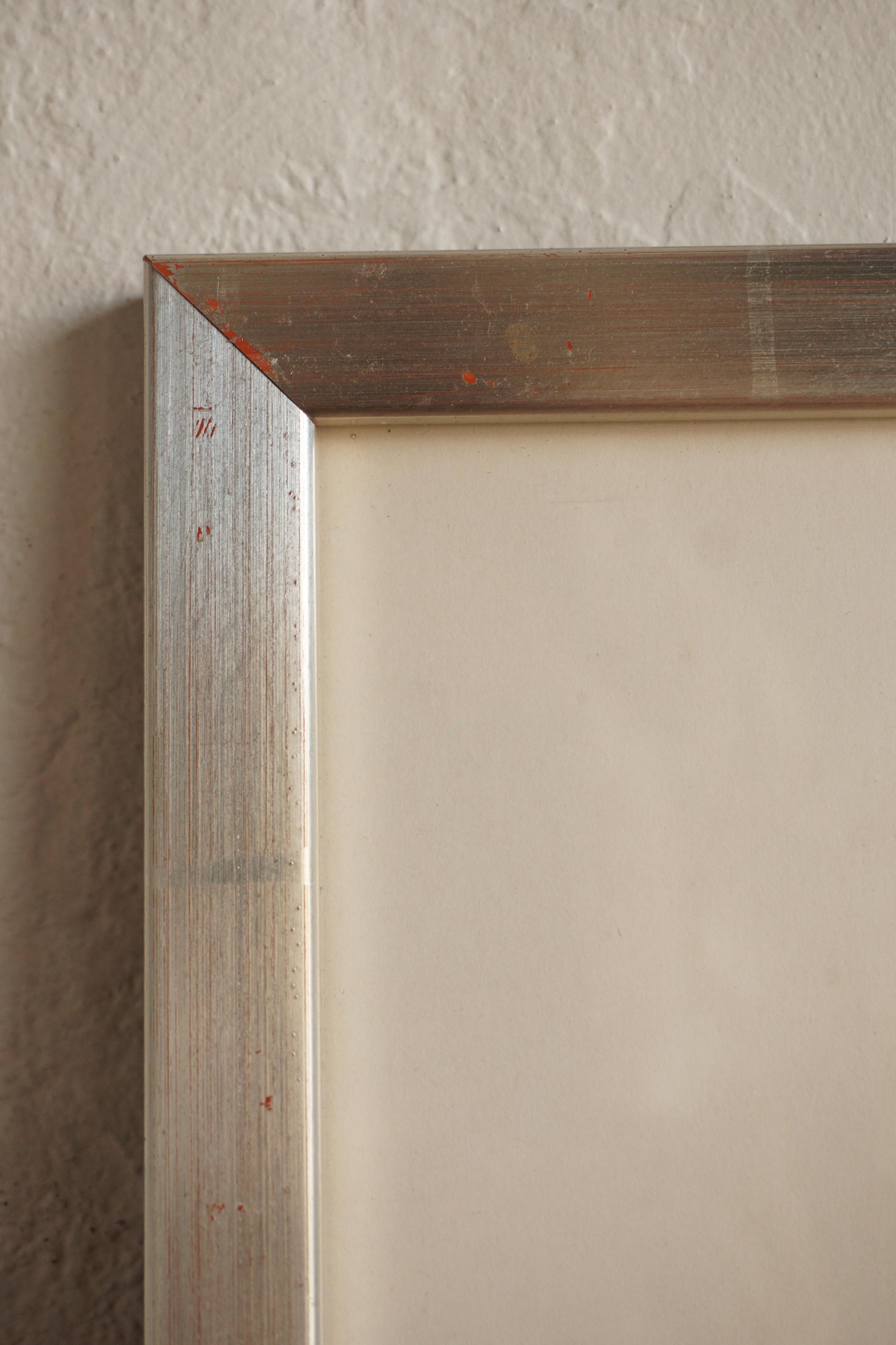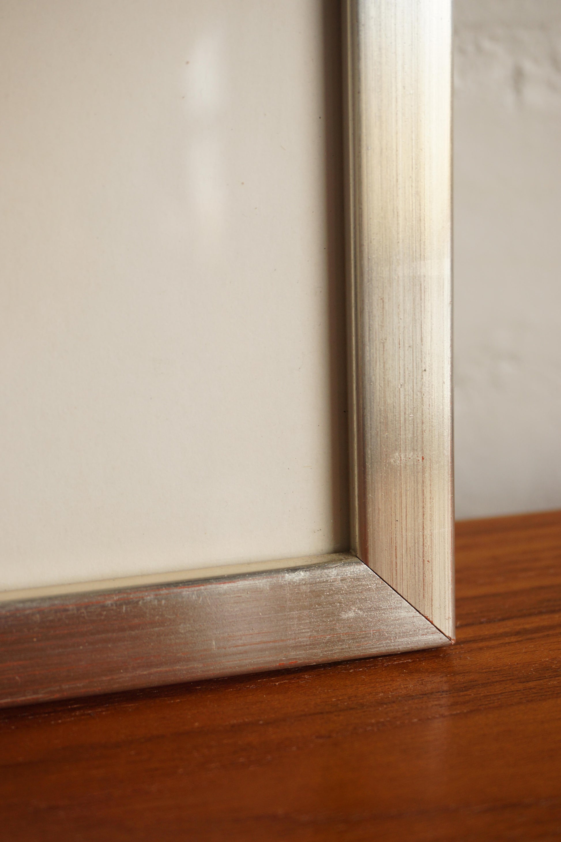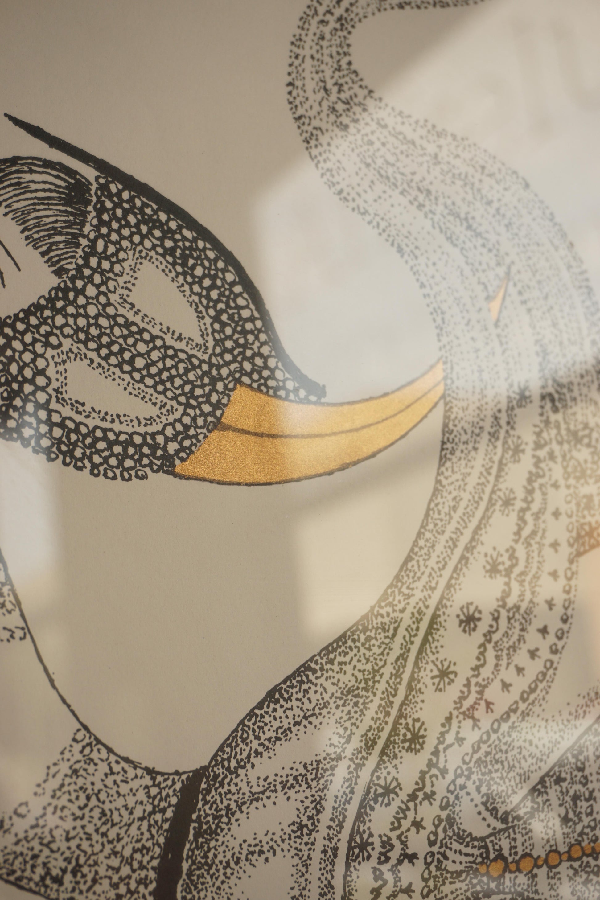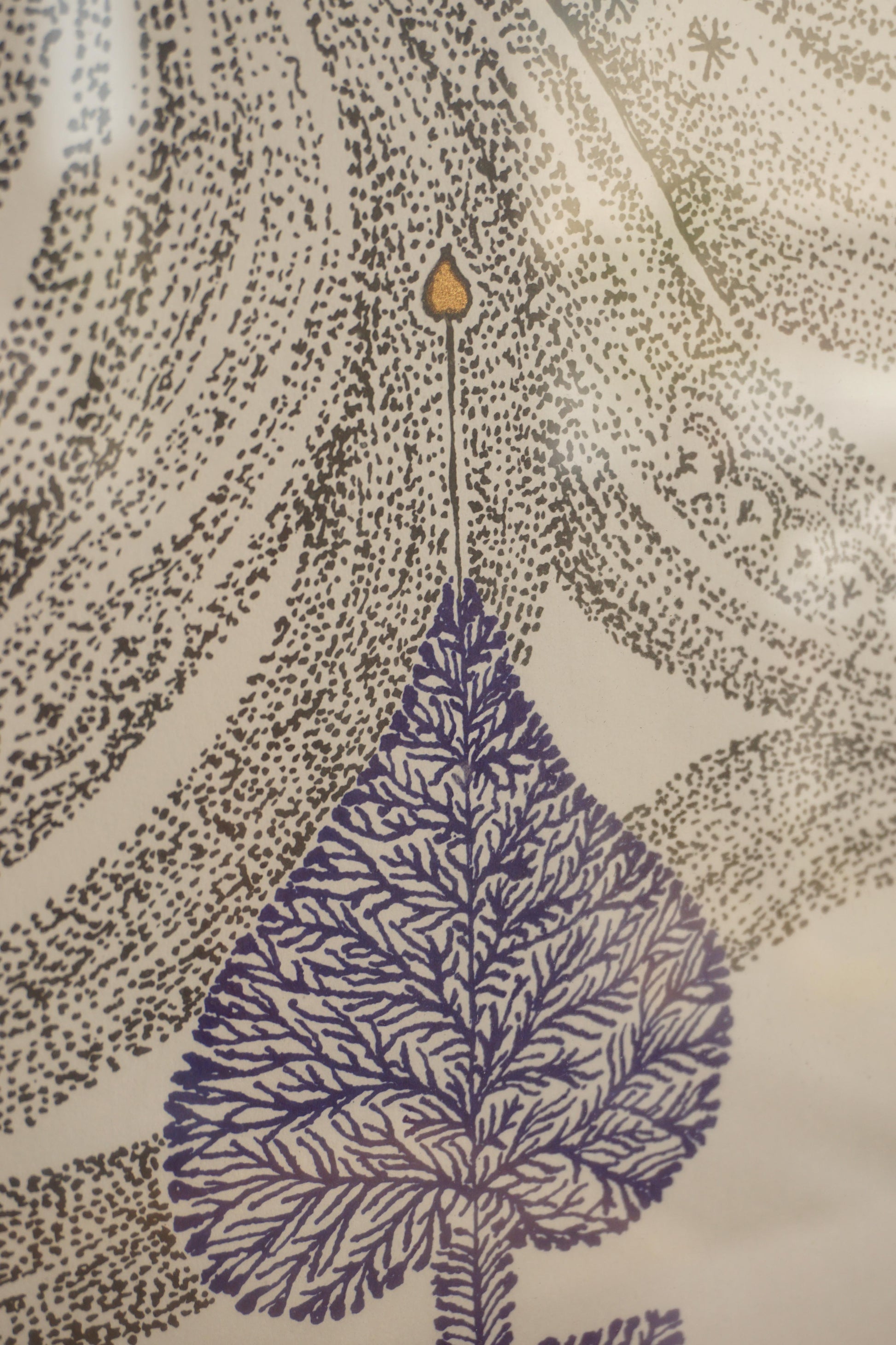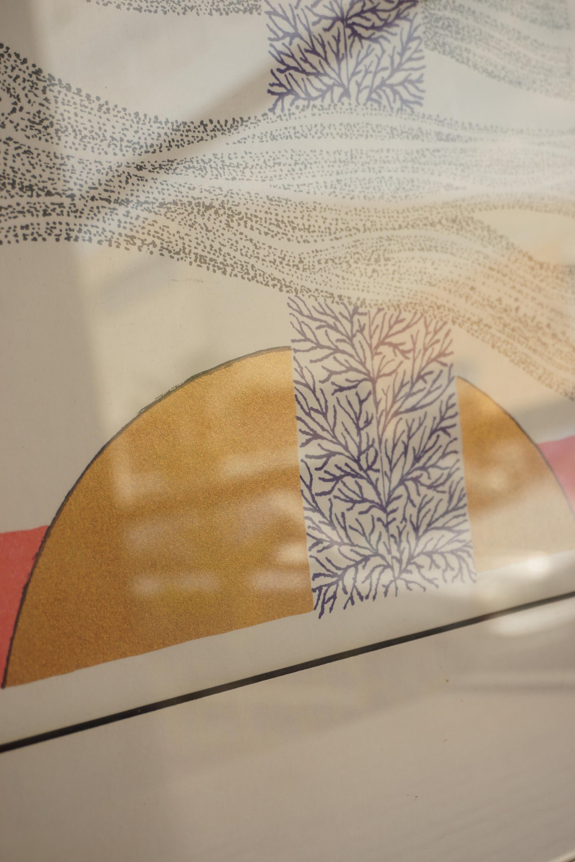 Framed surrealist lithograph with gold foil detail by Swedish artist Max Walter Svanberg c.1957. Printed signature. Original distressed silver lacquered timber frame.