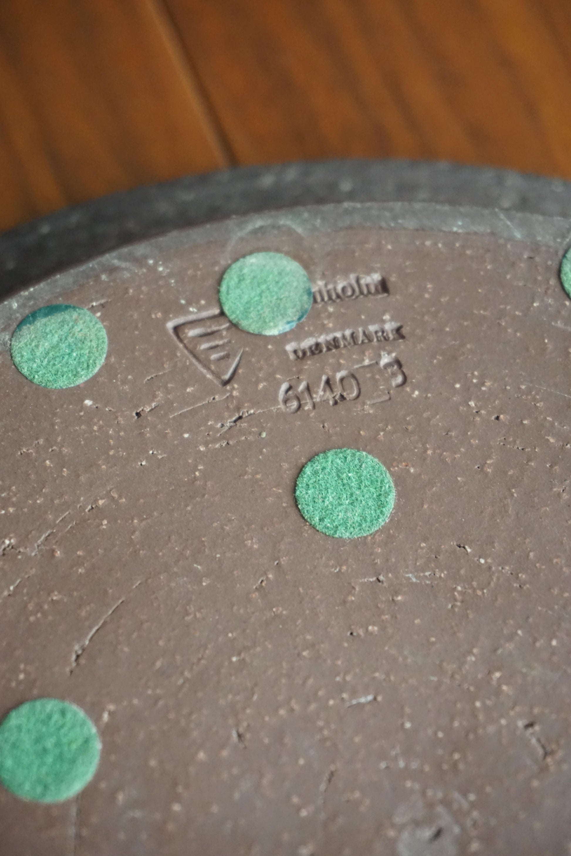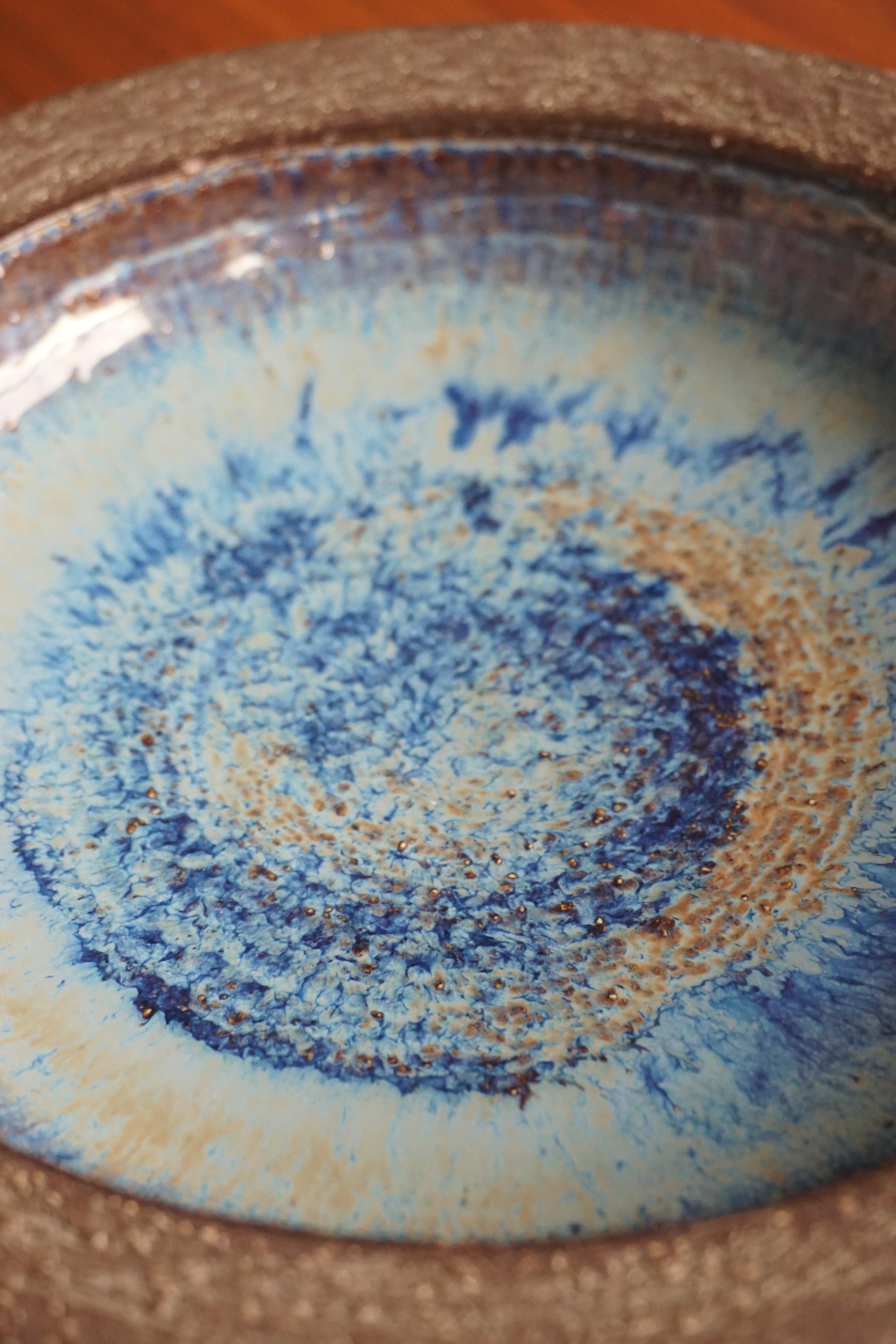 Decorative stoneware plate with blue glaze by Michael Andersen & Son c.1960s, Denmark. Makers mark on base.