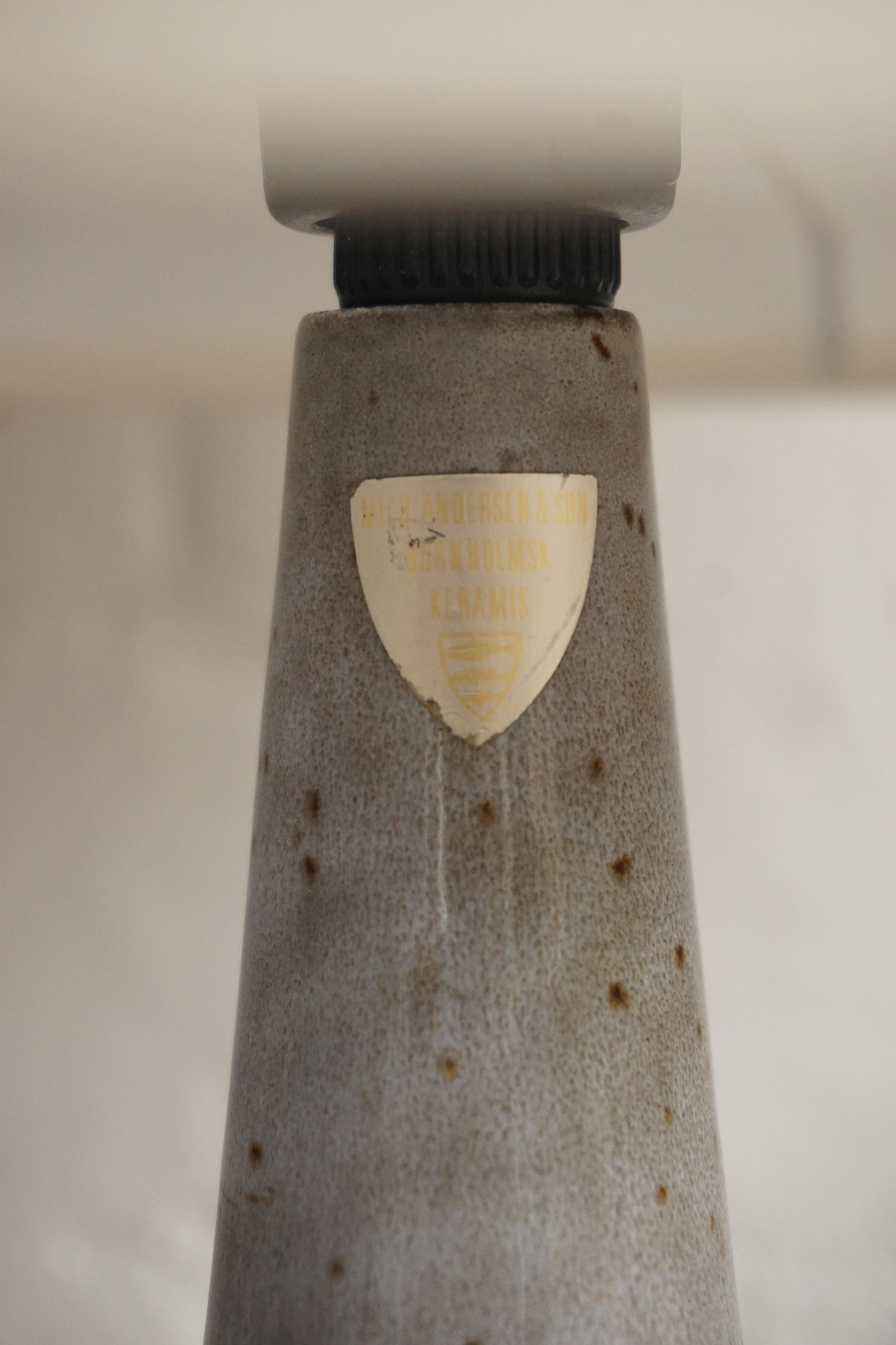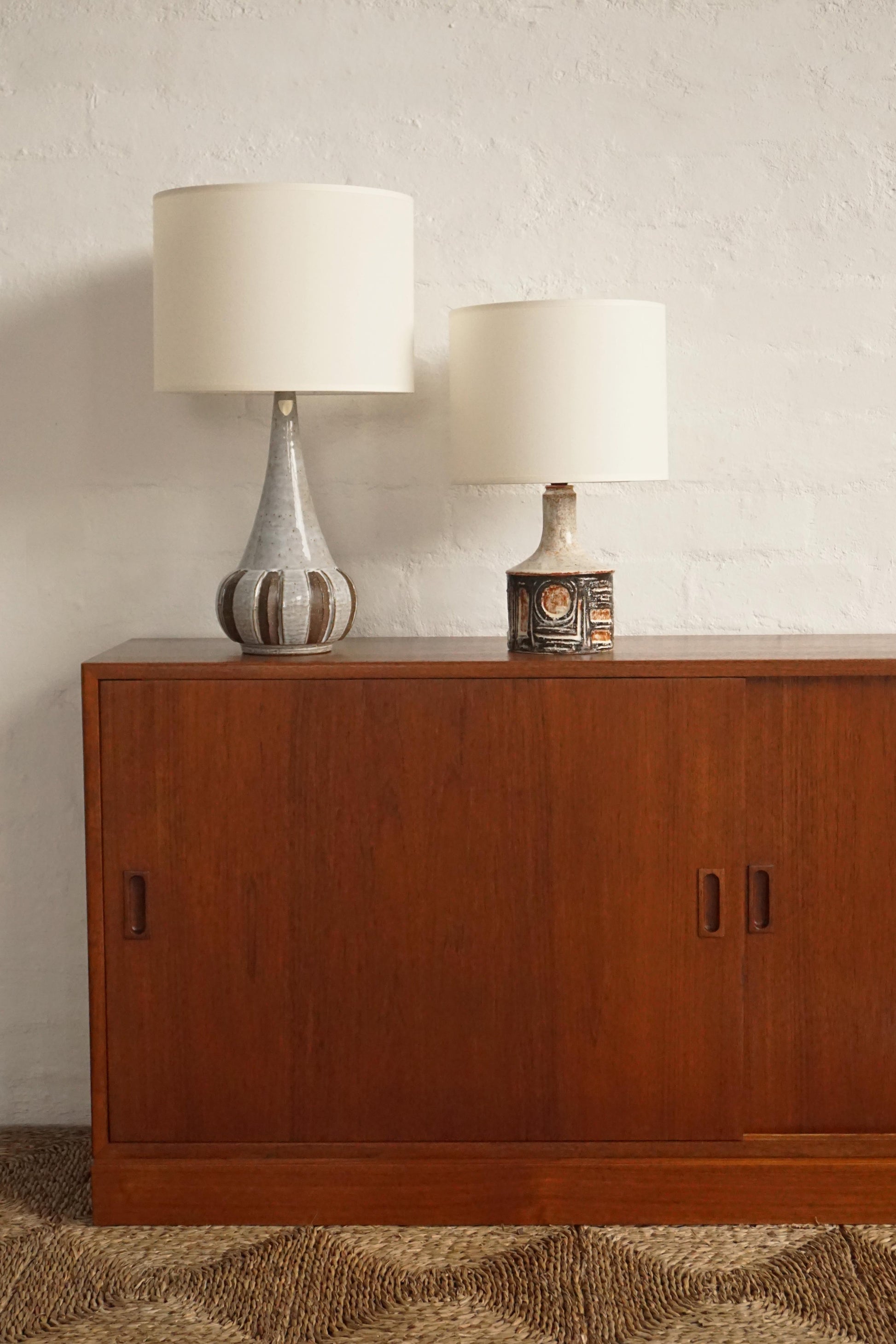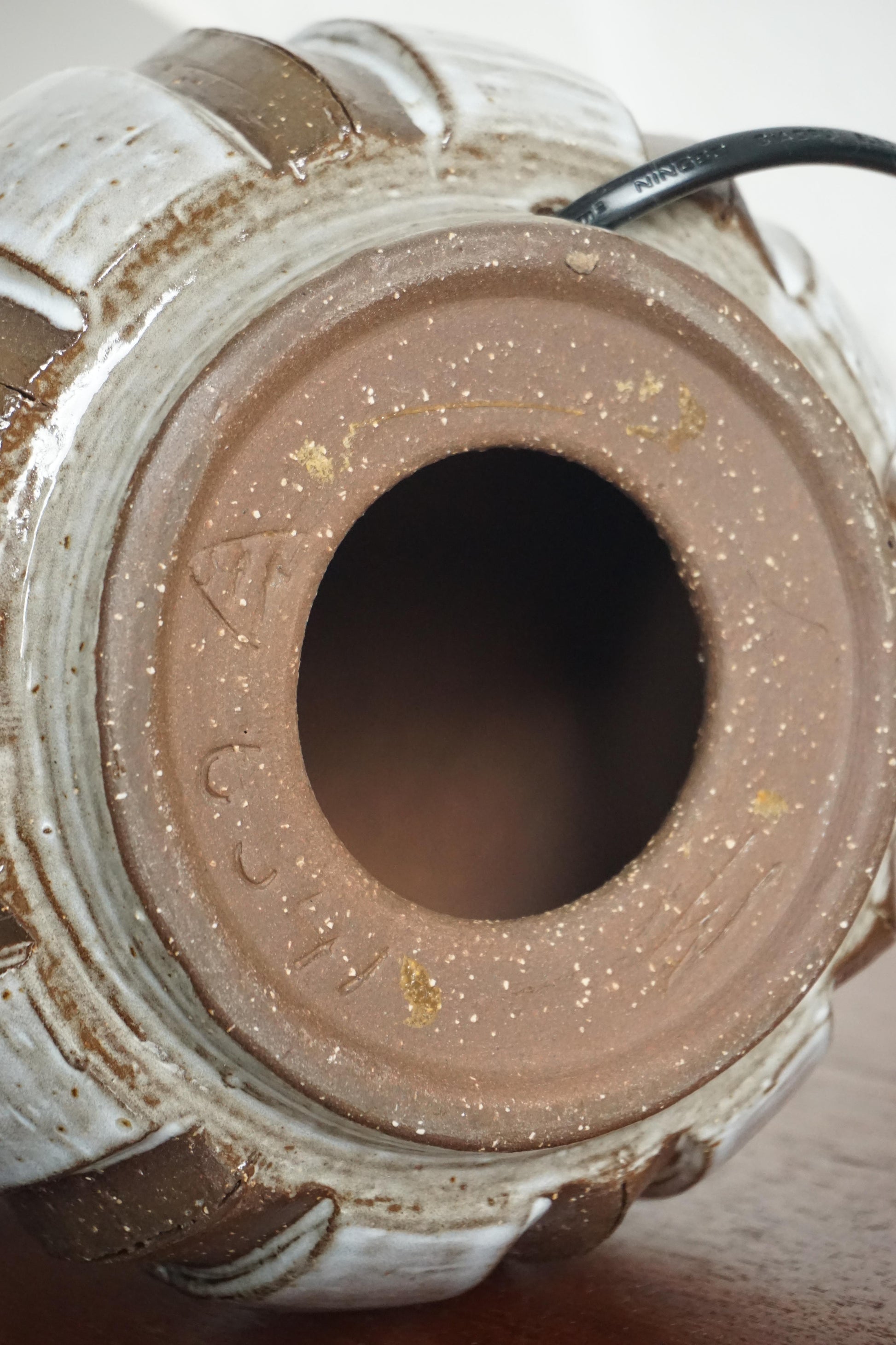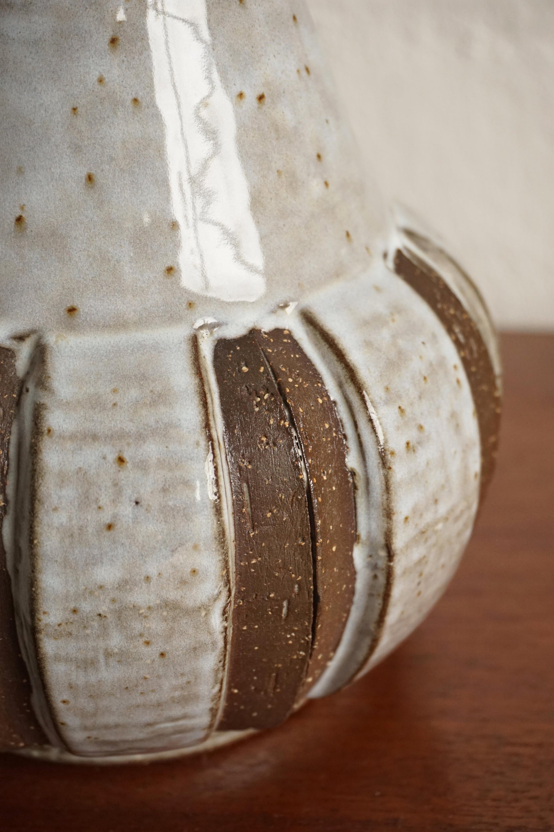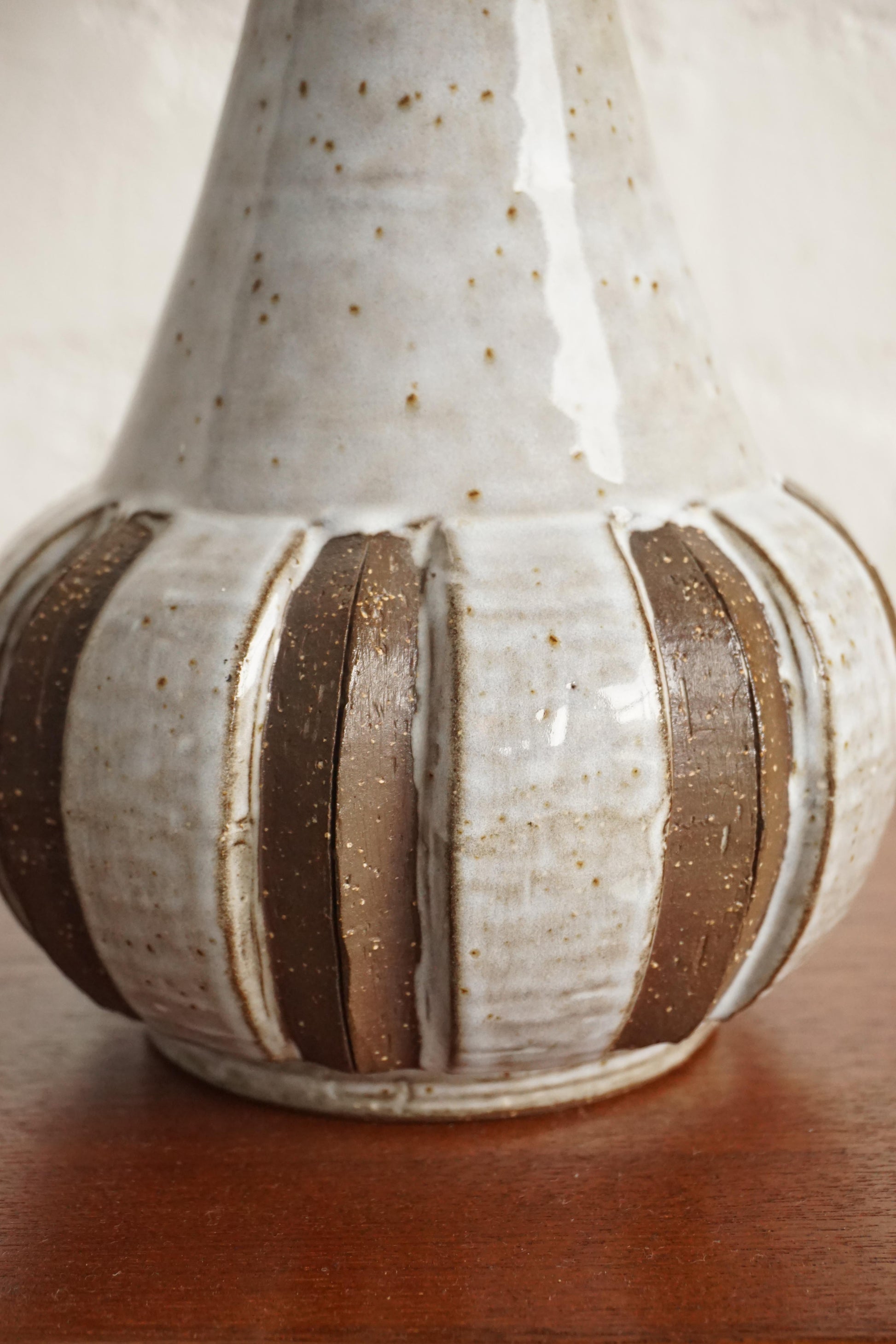 Ceramic lamp designed by Marianne Starck for Michael Andersen & Sons c.1960s Denmark. Hand carved vertical lines in the unglazed clay. Makers sticker on the neck, makers mark on the base. Fully rewired to Australian Standard with a new canvas shade.