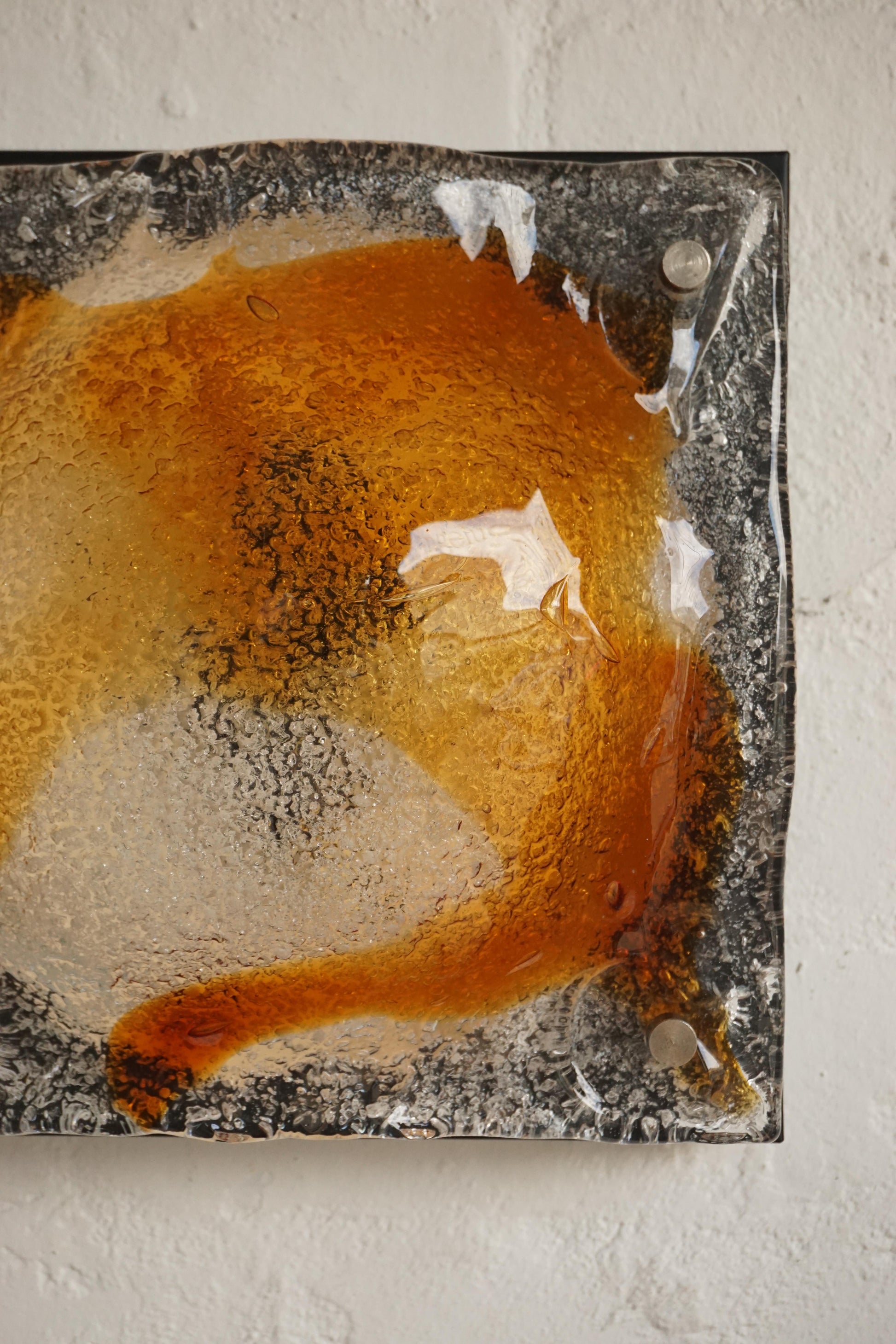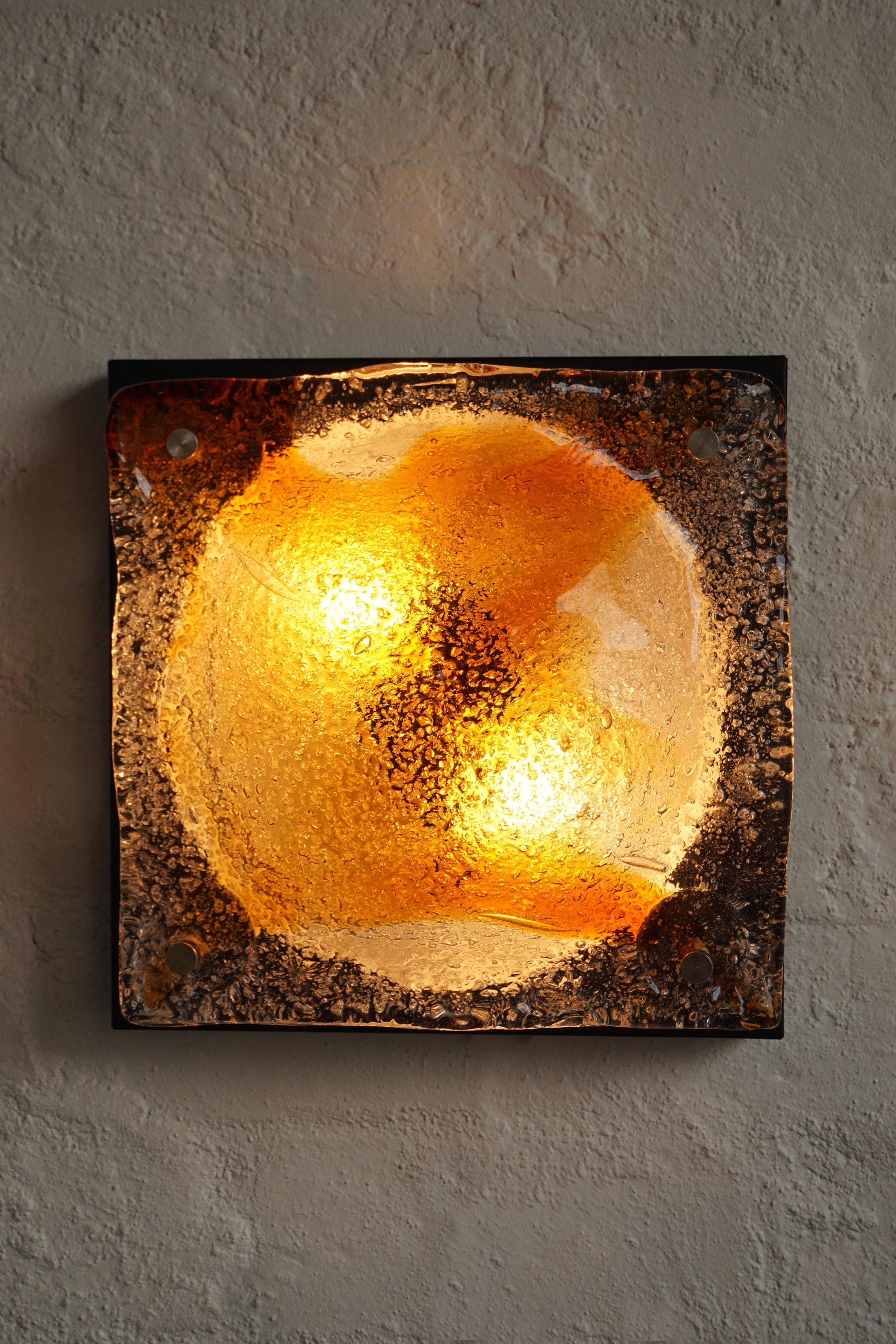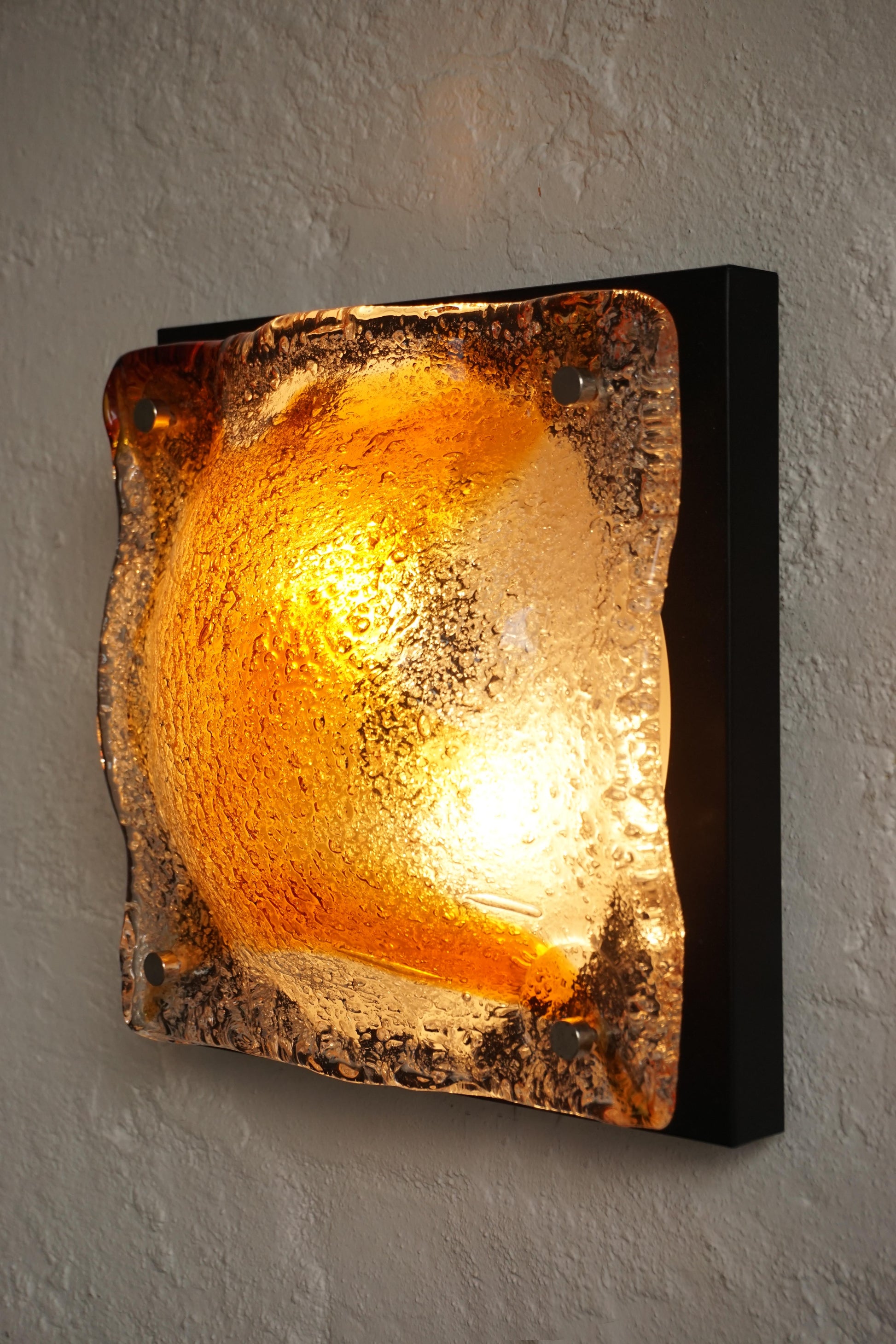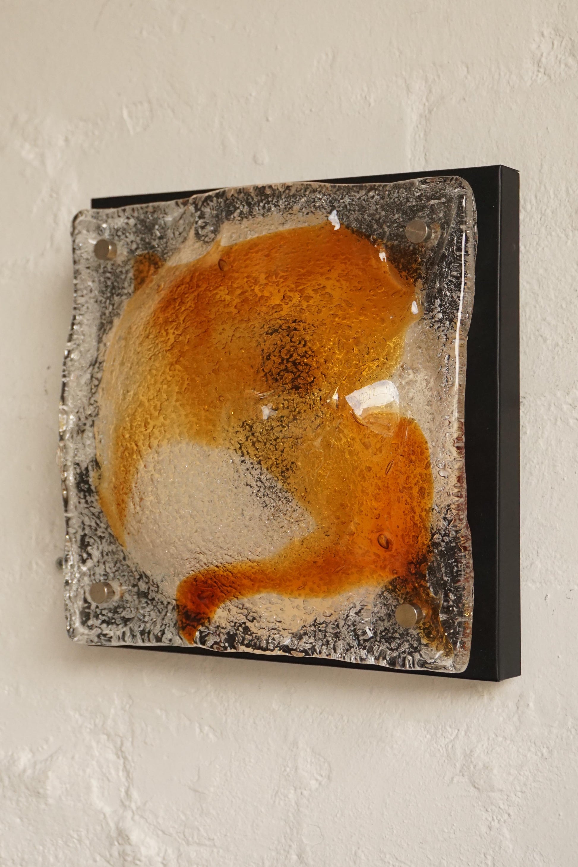 Pair of sconces by Mazzega c.1970s Italy. Handmade Murano glass with an amber swirl. Black lacquered backing plate. Fully rewired to Australian standard, ready to be hardwired in.