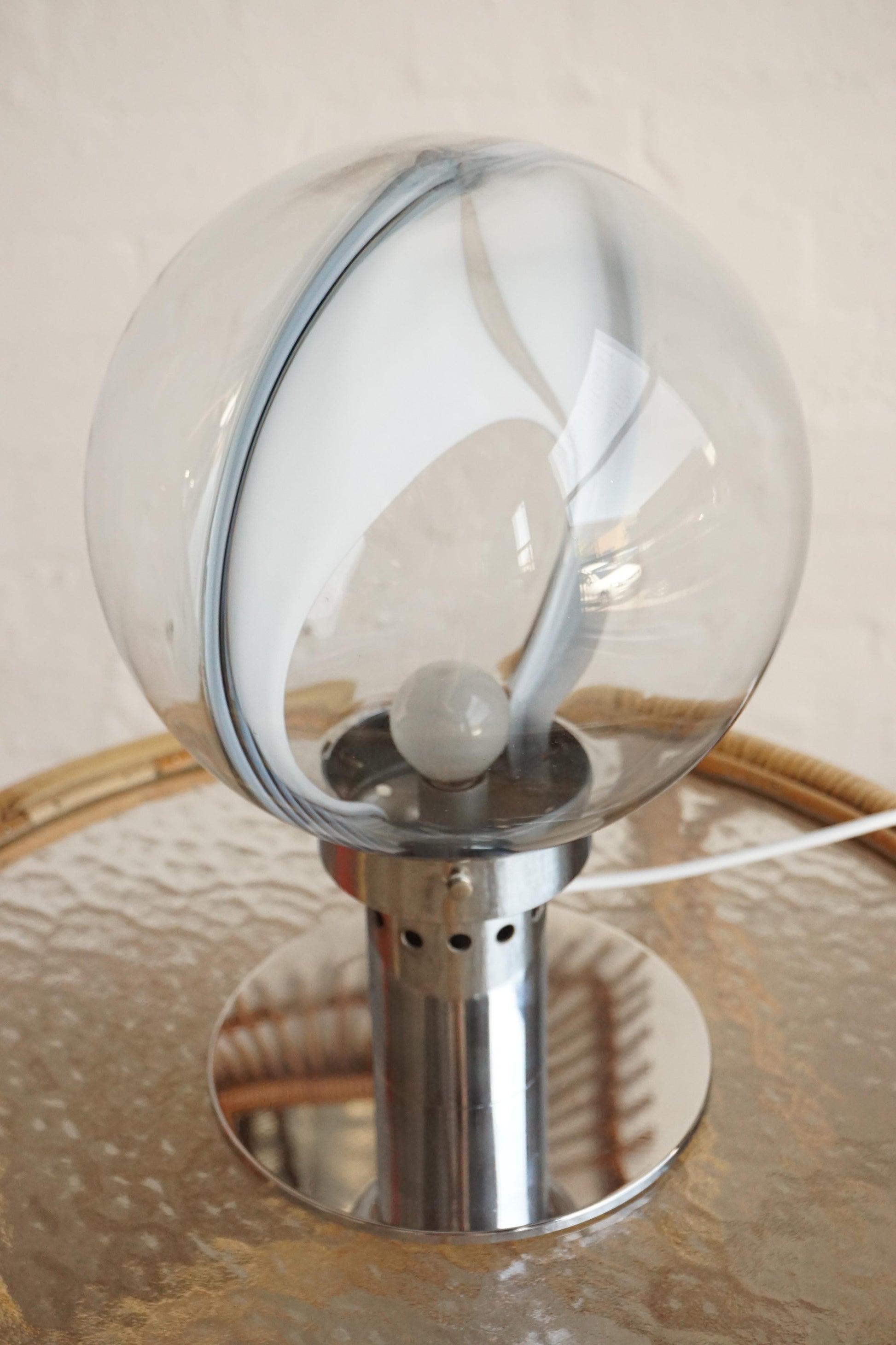 Handblown Murano glass table lamp by Toni Zuccheri for Venini c.1970s Italy. Clear glass with white swirls. Polished chrome details. Fully rewired to Australian Standard with a new inline switch.