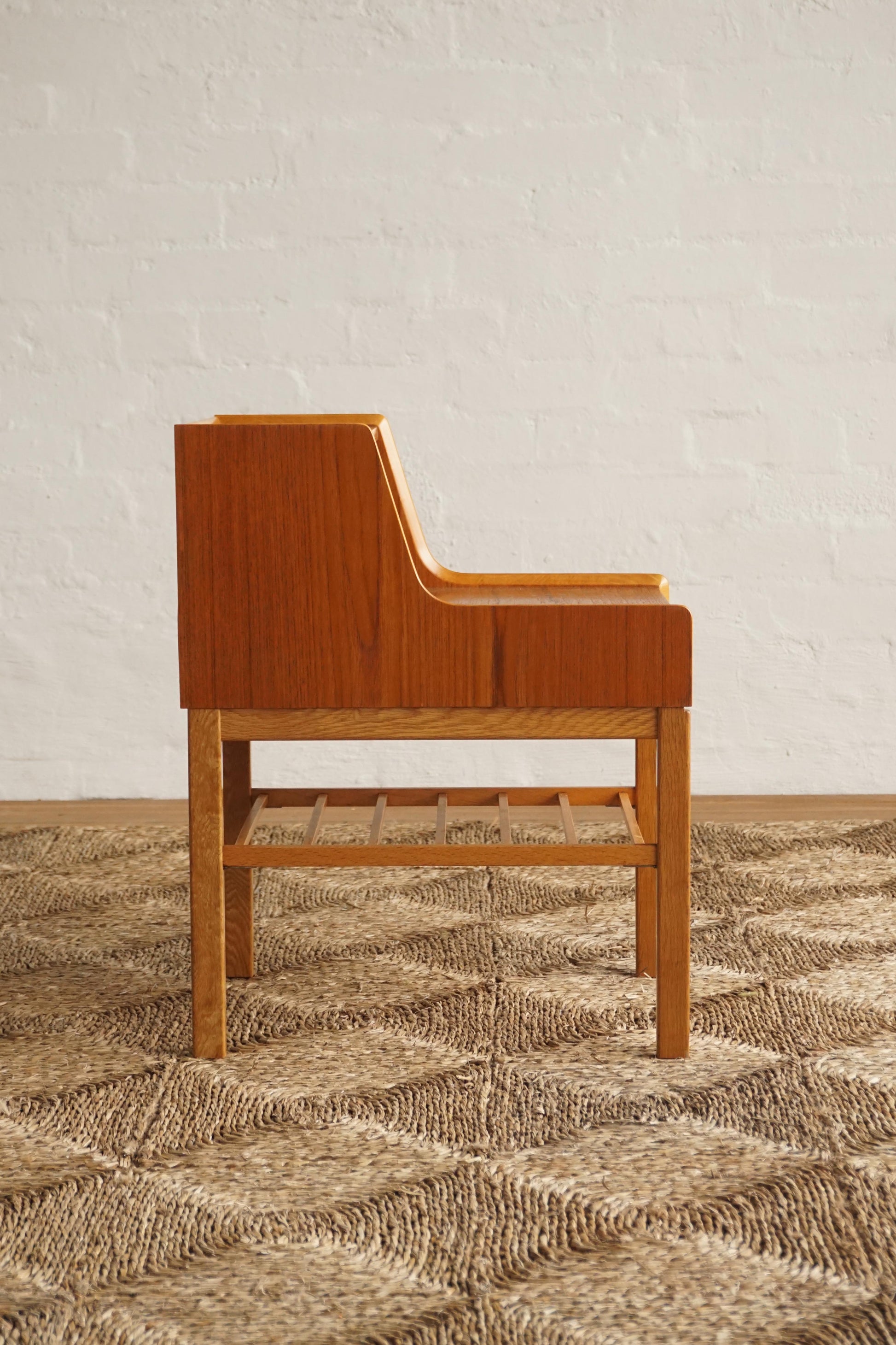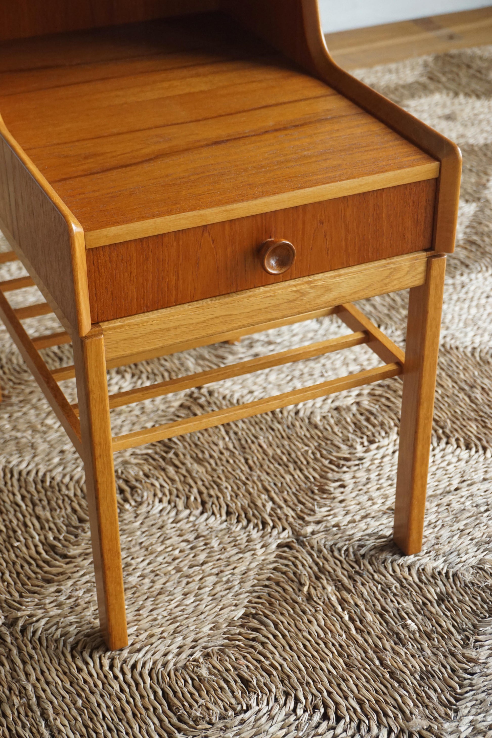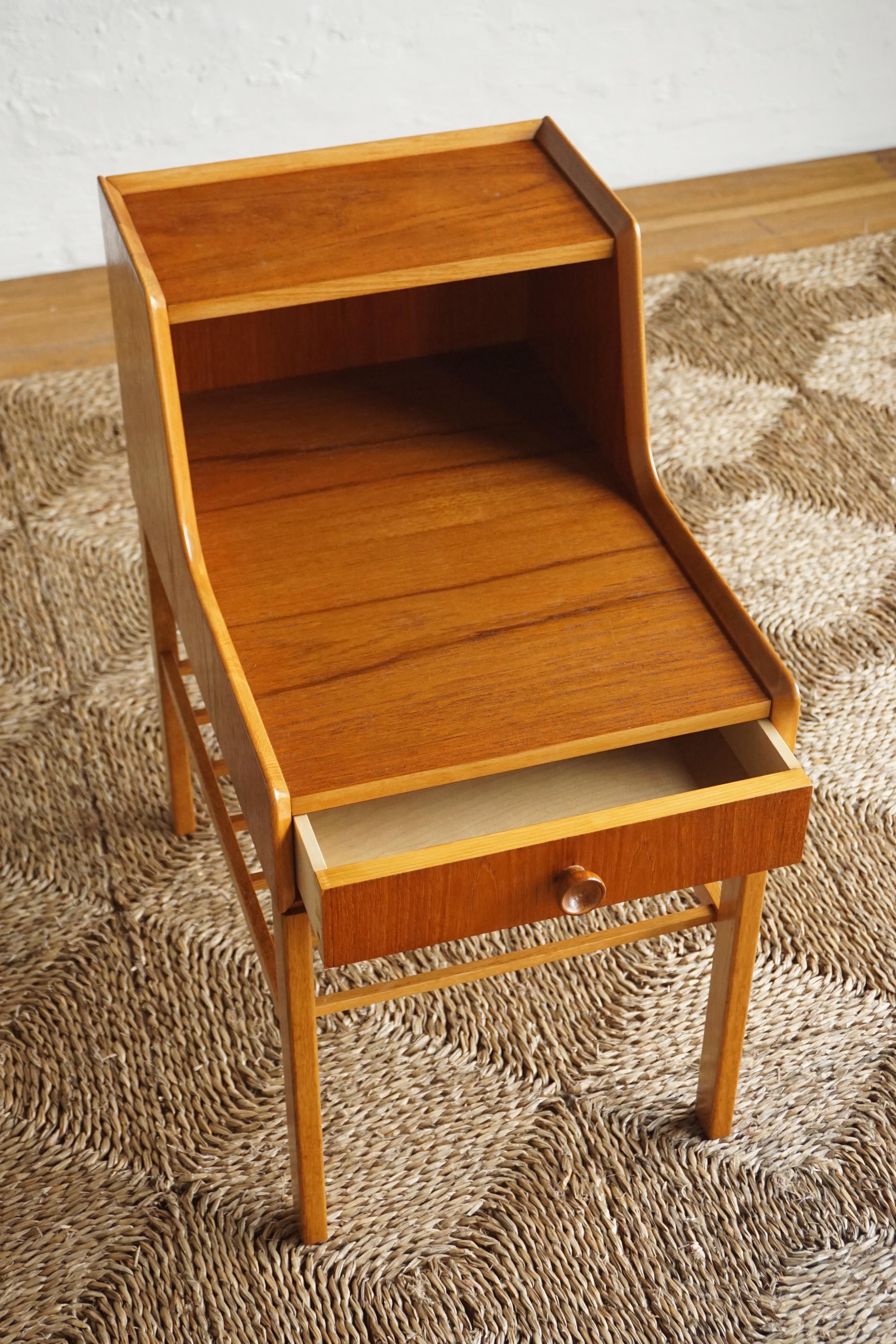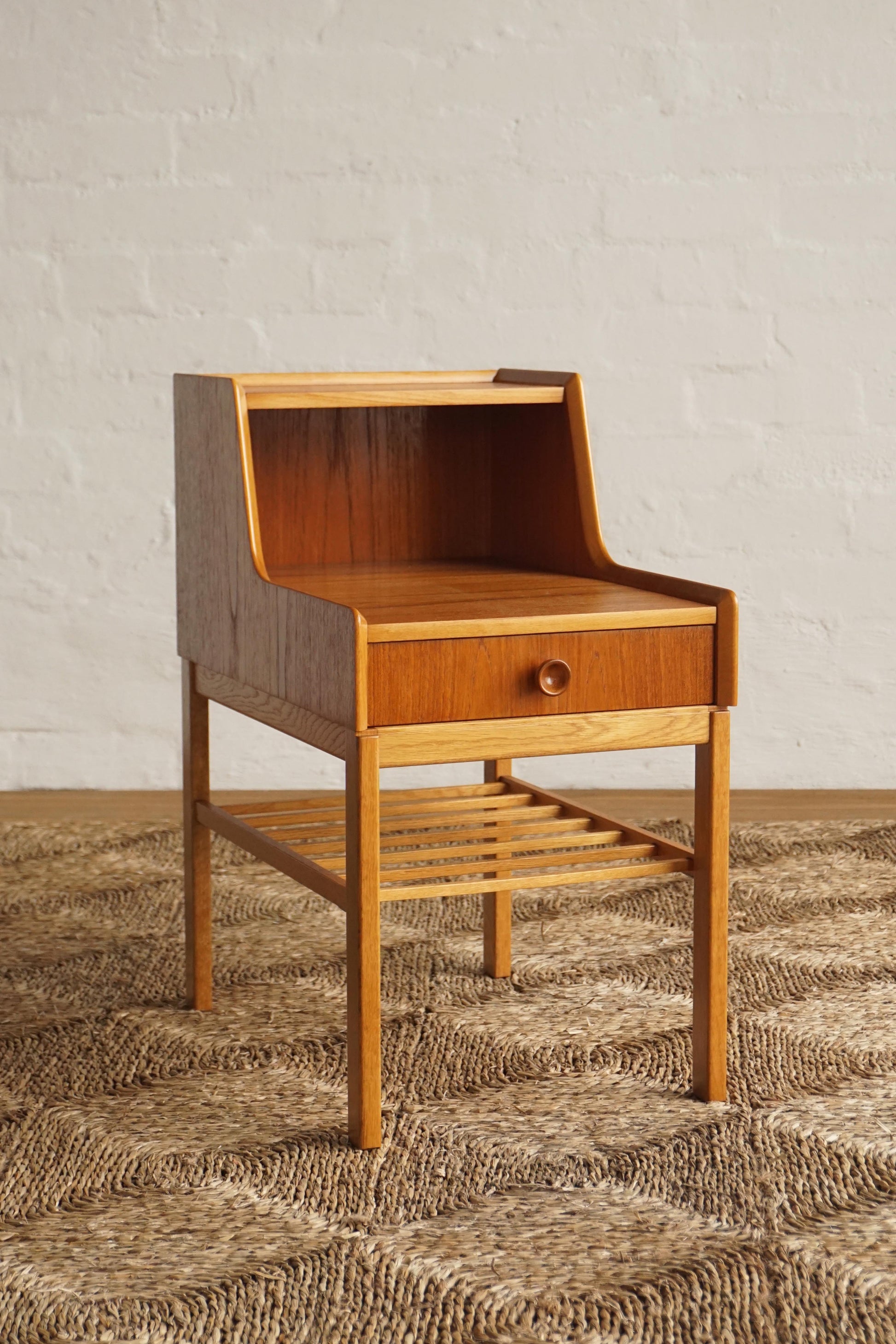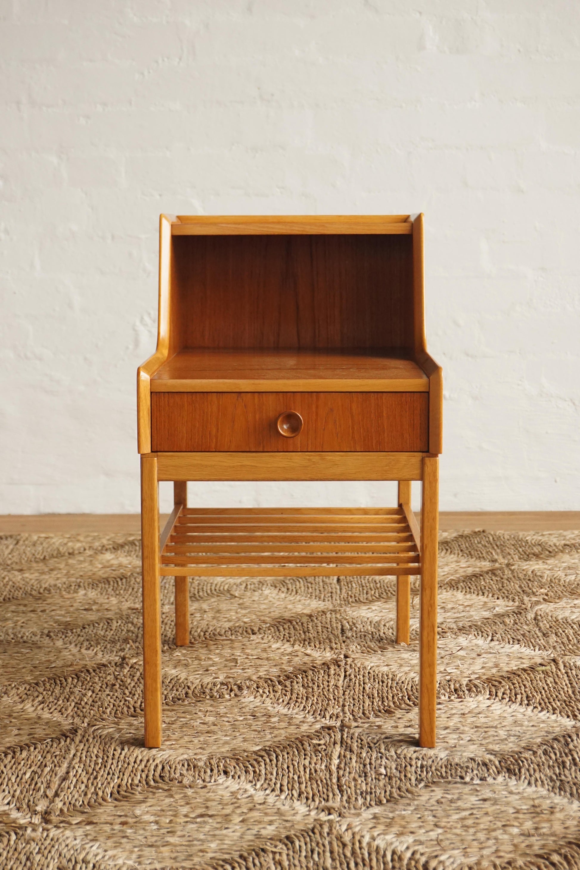 Pair of teak and oak side tables c.1960s Denmark. Oak frame with a teak body and single drawer. Suitable for living room or bedroom. Fully restored and finished in a low sheen hard shellac.