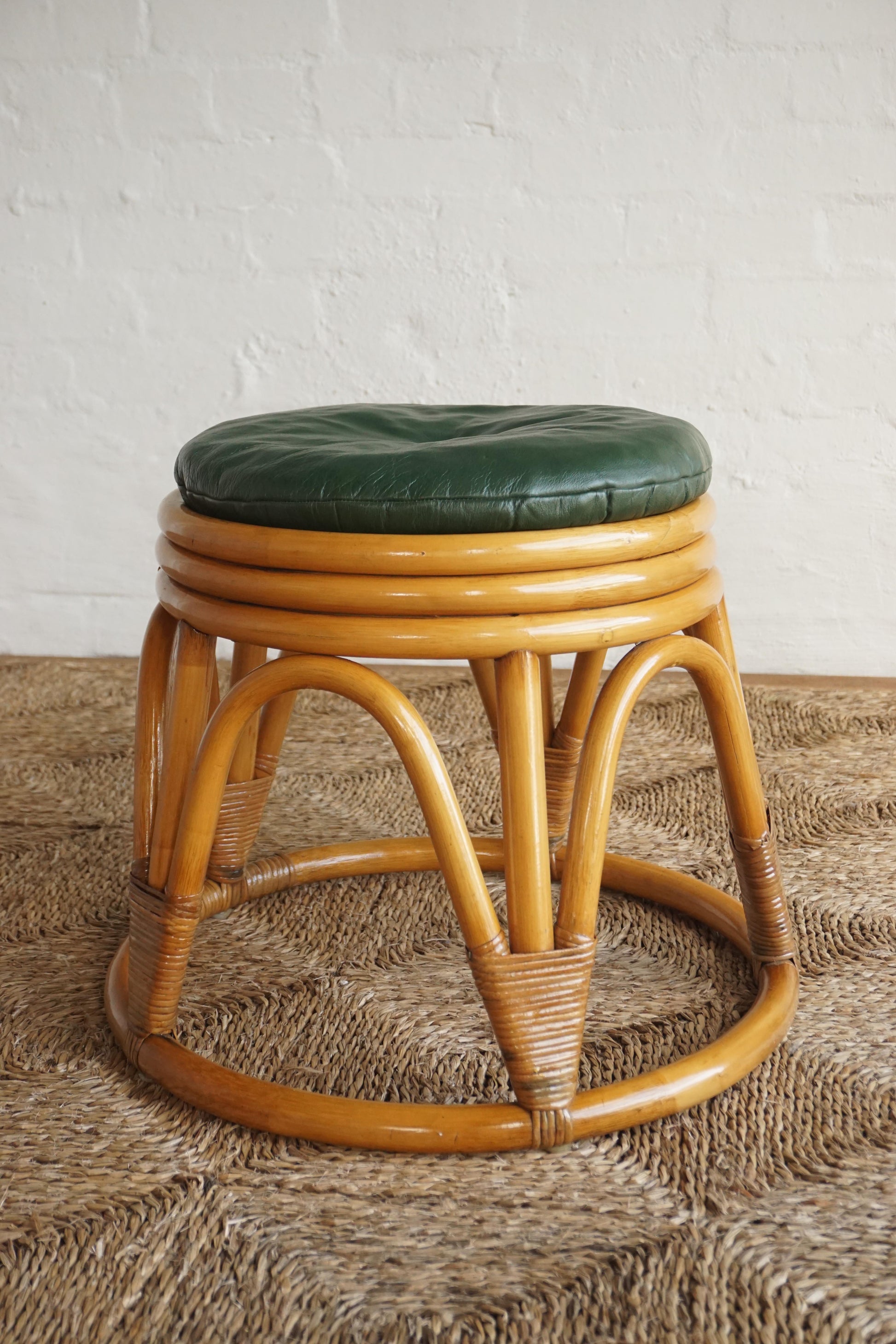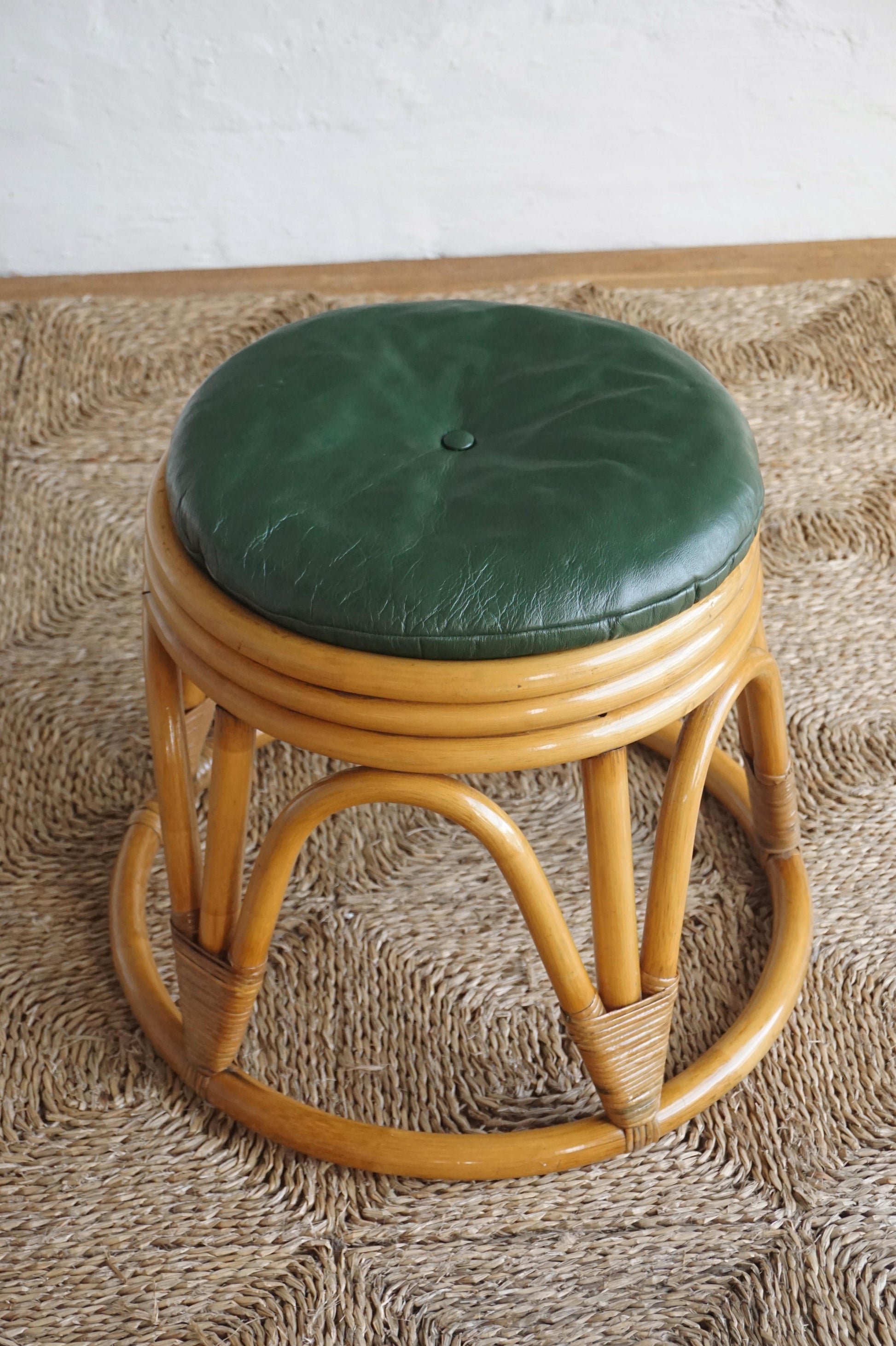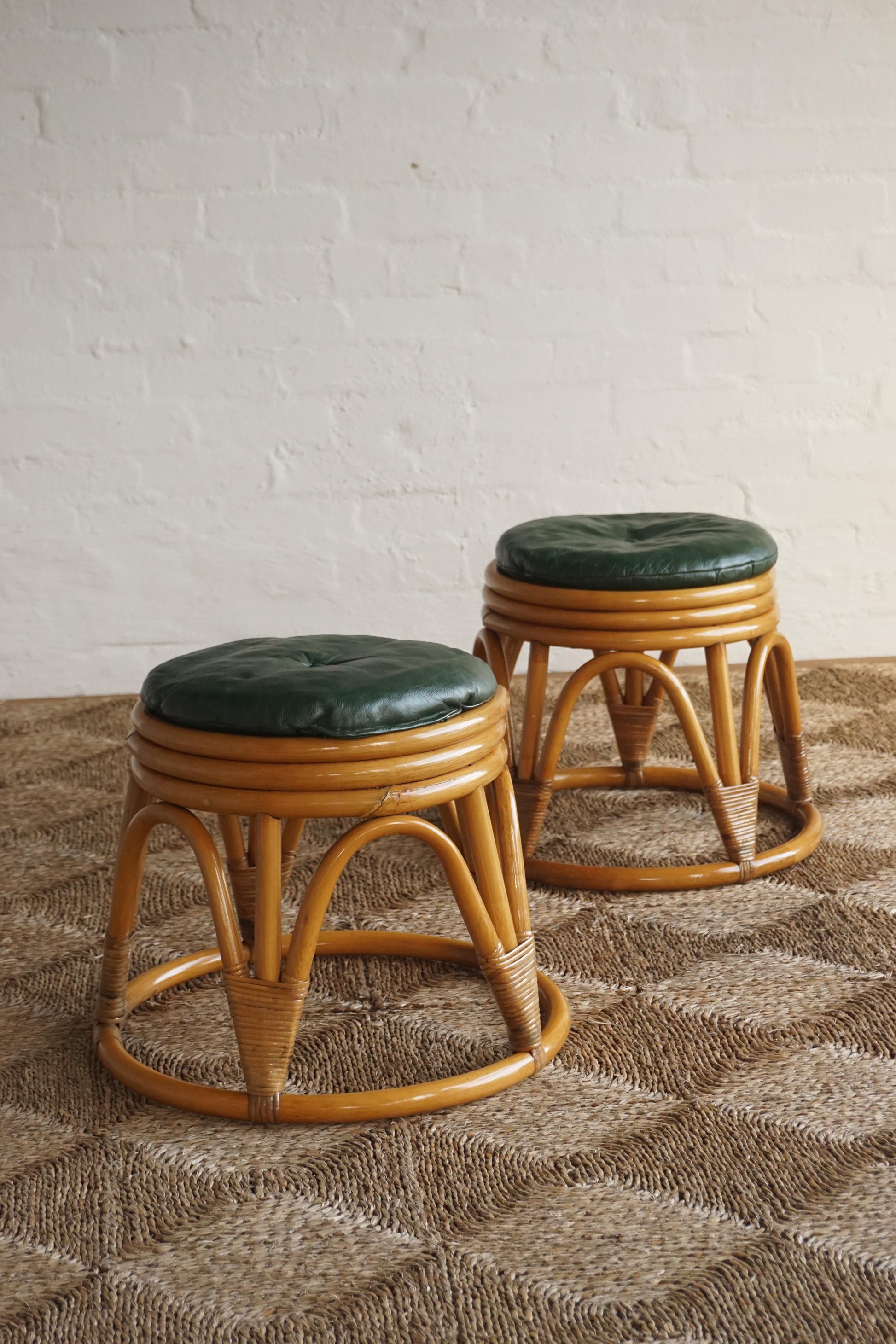Pair of bamboo stools c.1960s Denmark. The stools have been cleaned and finished in a clear lacquer. The dark green leather upholstered cushions have been reconditioned. The underside button is missing on one of the cushions.
