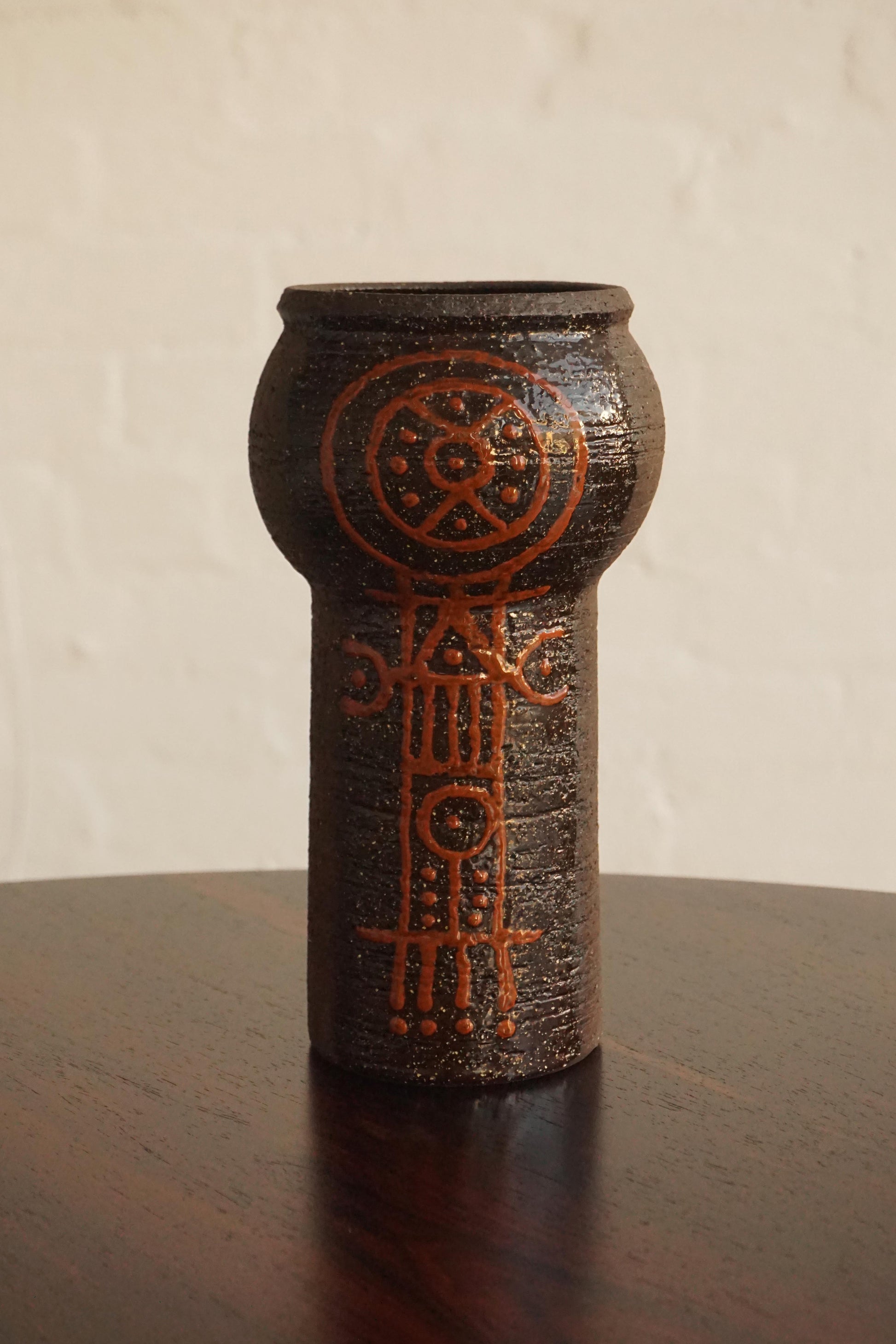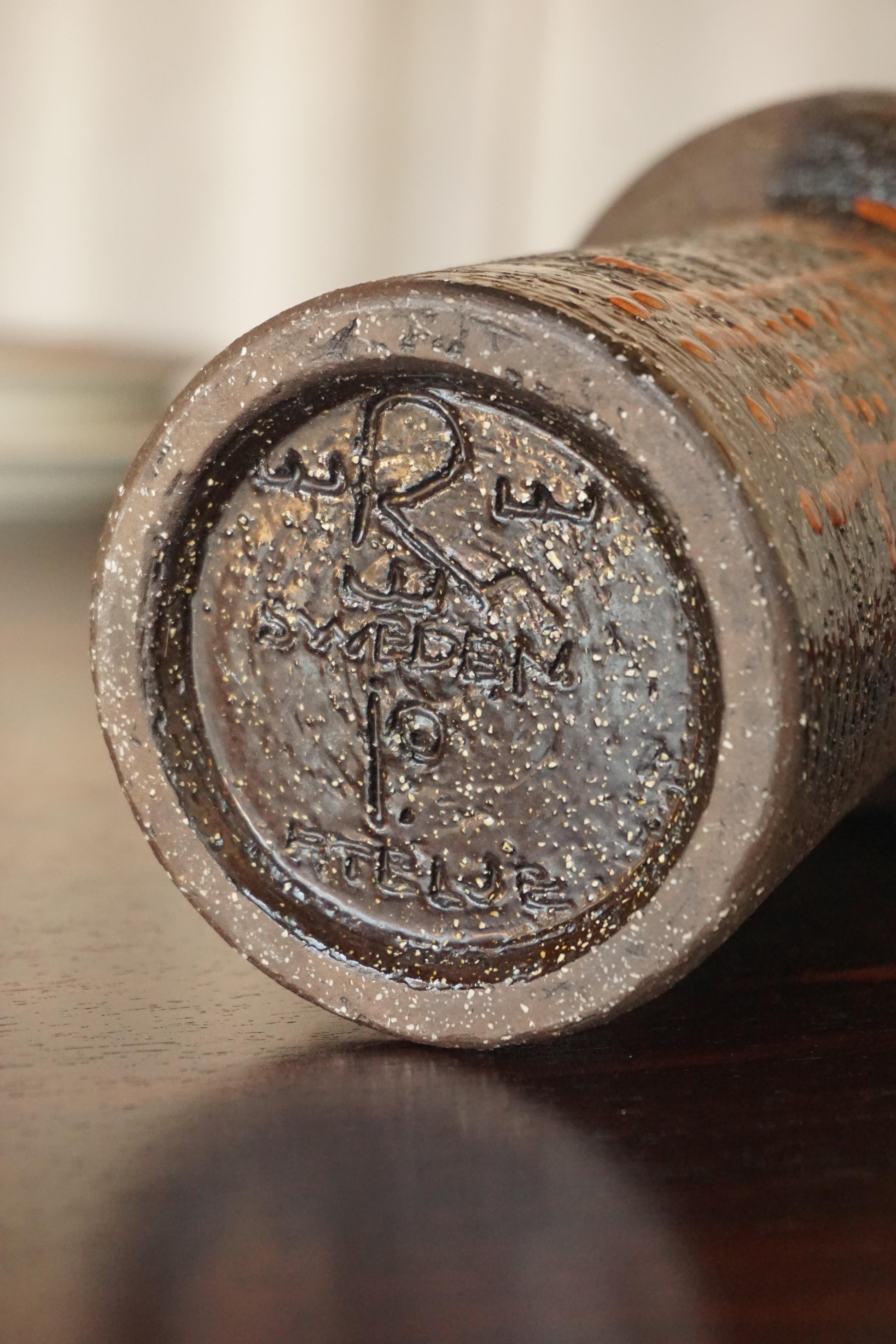 Stoneware vase designed by Inger Persson for Rorstrand c.1970s Sweden. Abstract design, verging on Brutalist influences. Orange and brown glaze. Makers mark to the base.