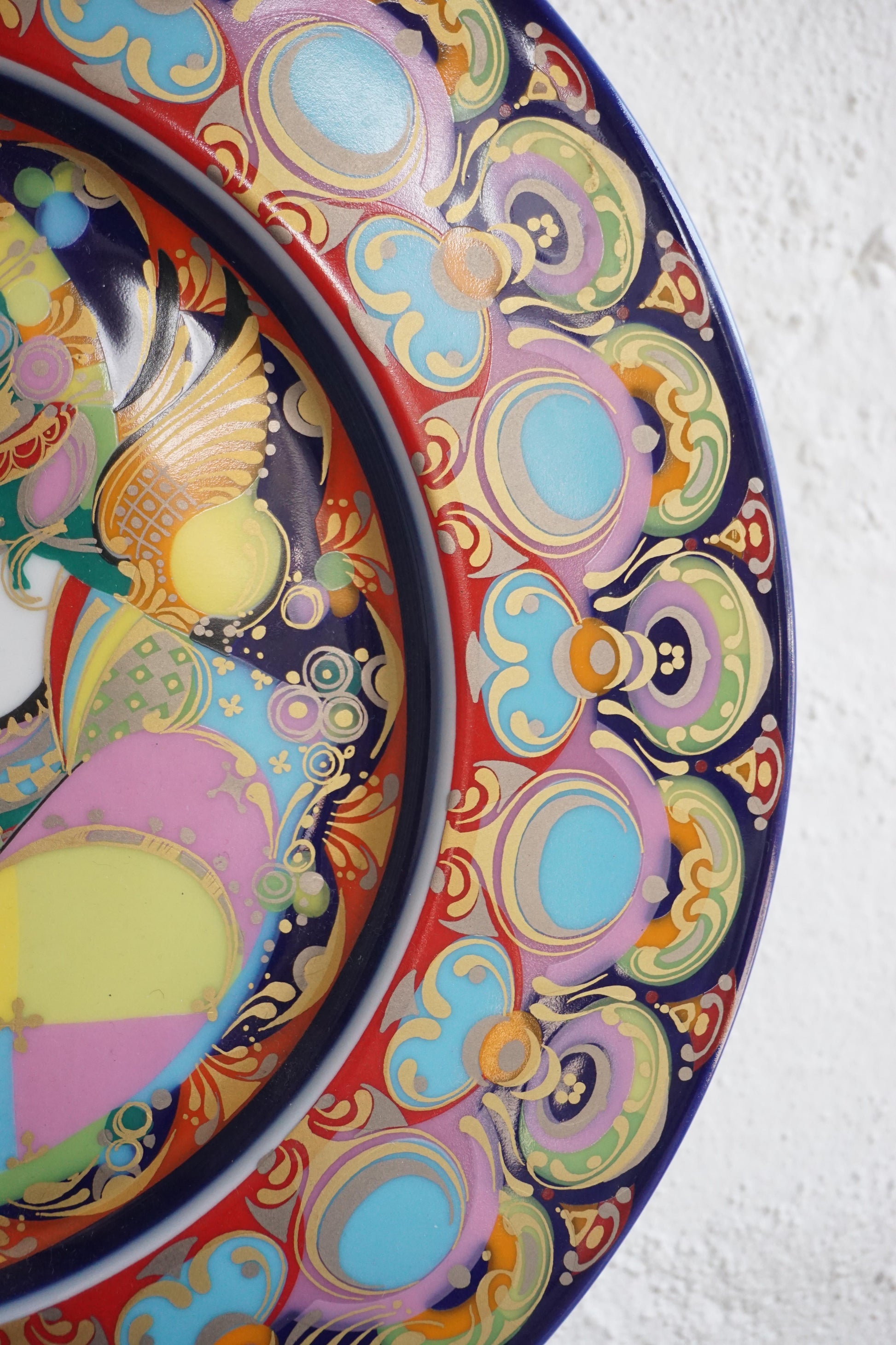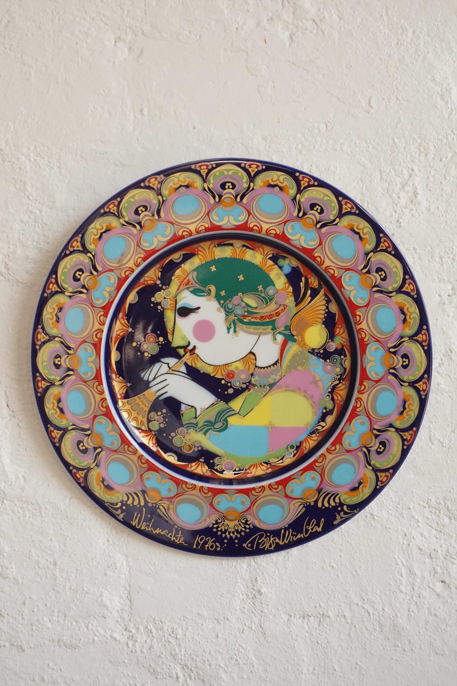 Christmas wall plate designed by Danish artist Bjorn Winblad for Rosenthal, Germany c.1976. The design is titled "Angel of the Trumpet". Porcelain plate with colourful design and gold glaze. Lovely decorative item to have for the holidays.
