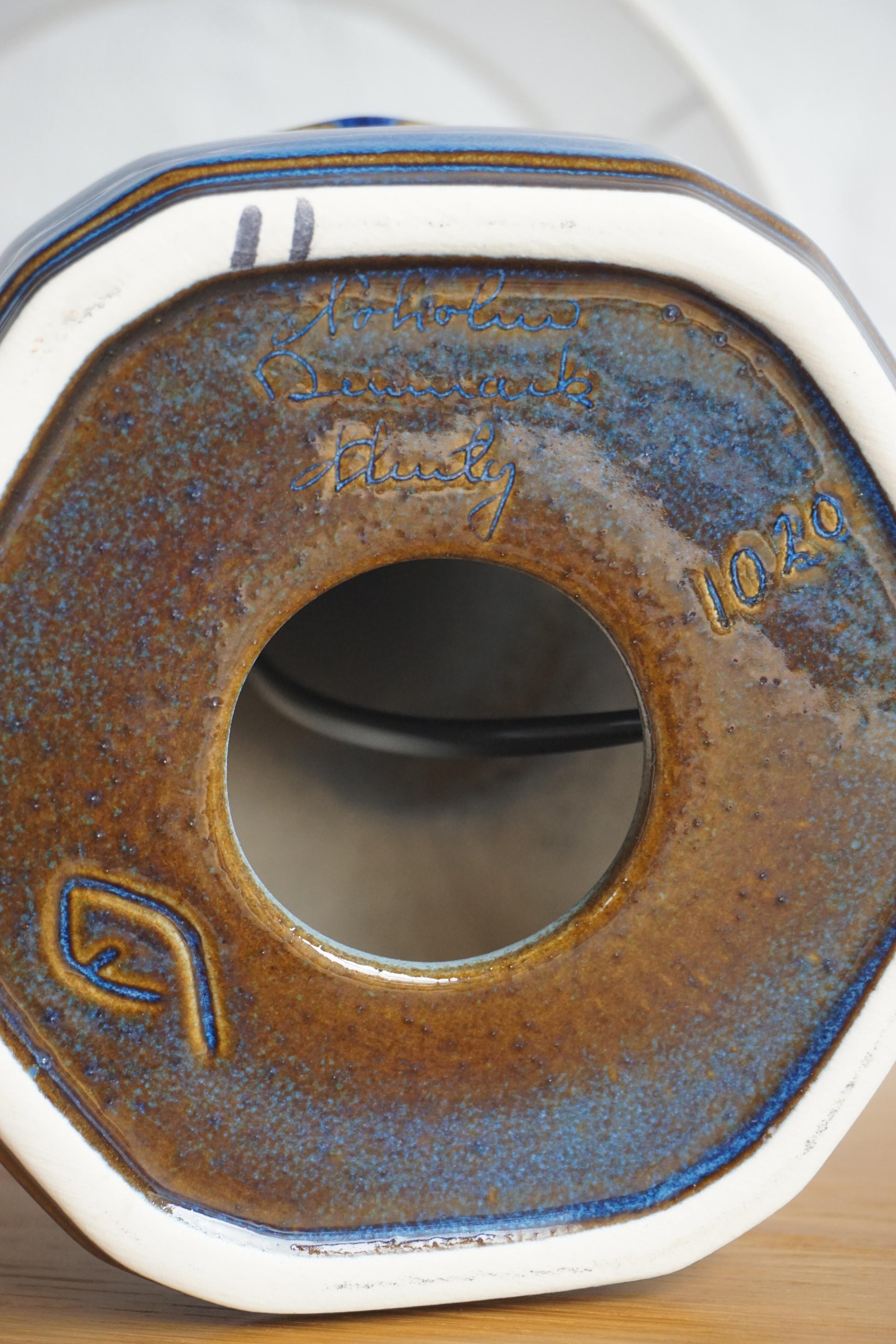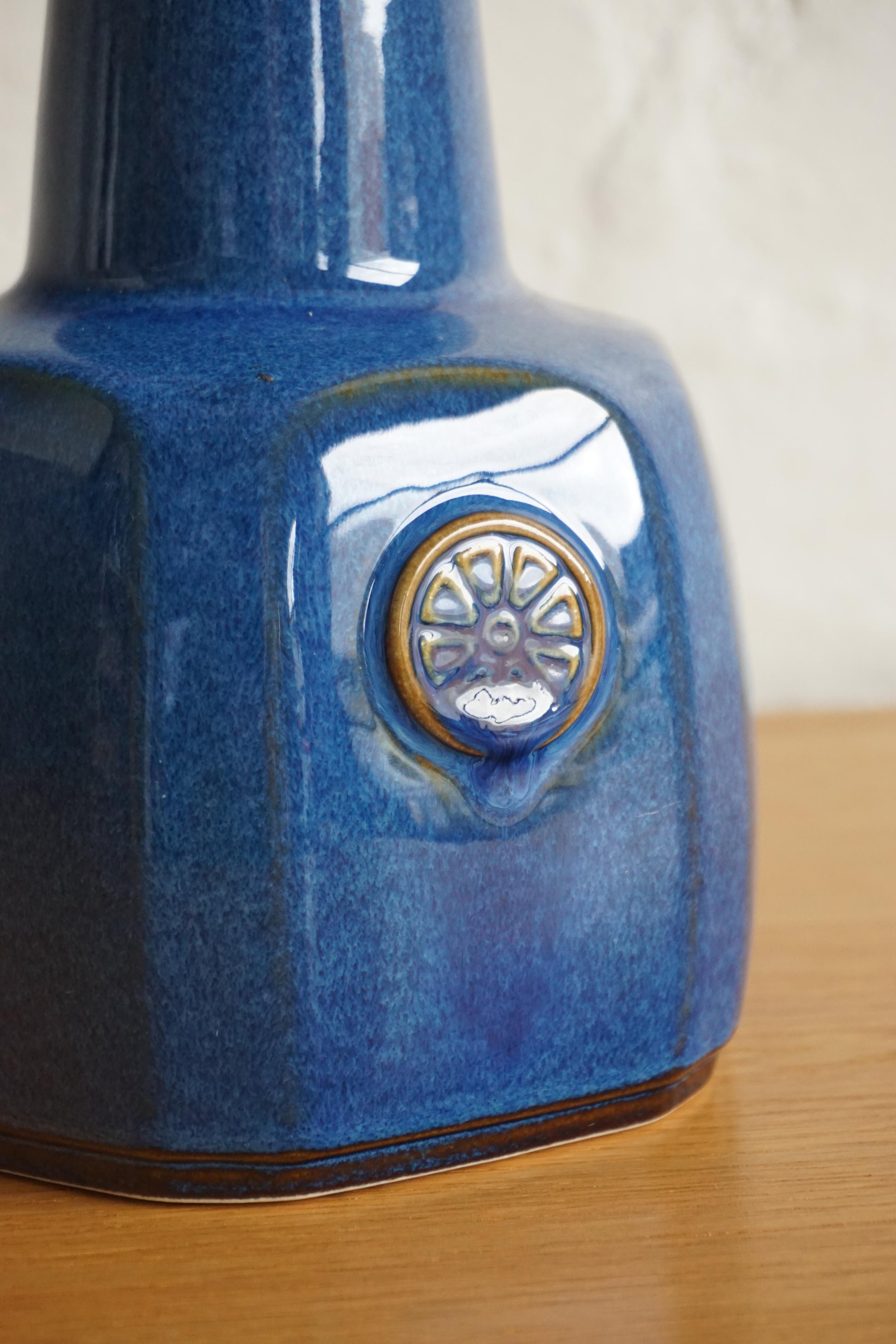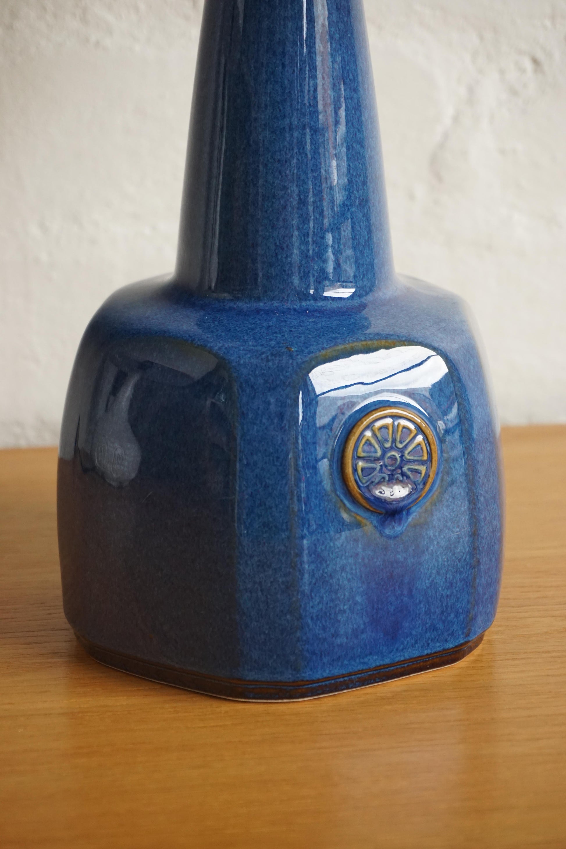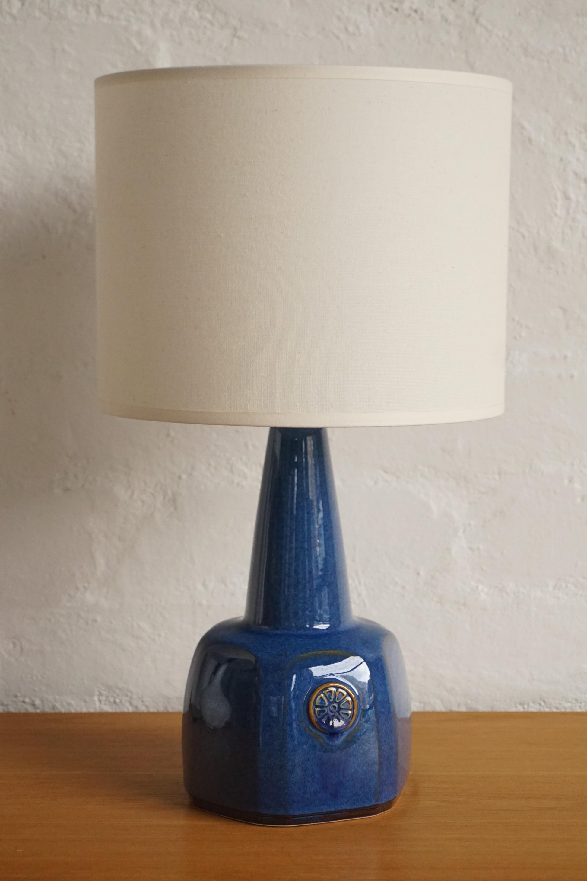 Ceramic lamp designed Einar Johansen by Soholm Stentoj c.1960s Denmark. Lovely glossy blue glaze. Makers mark on the base. Fully rewired to Australian standard with new canvas shade.