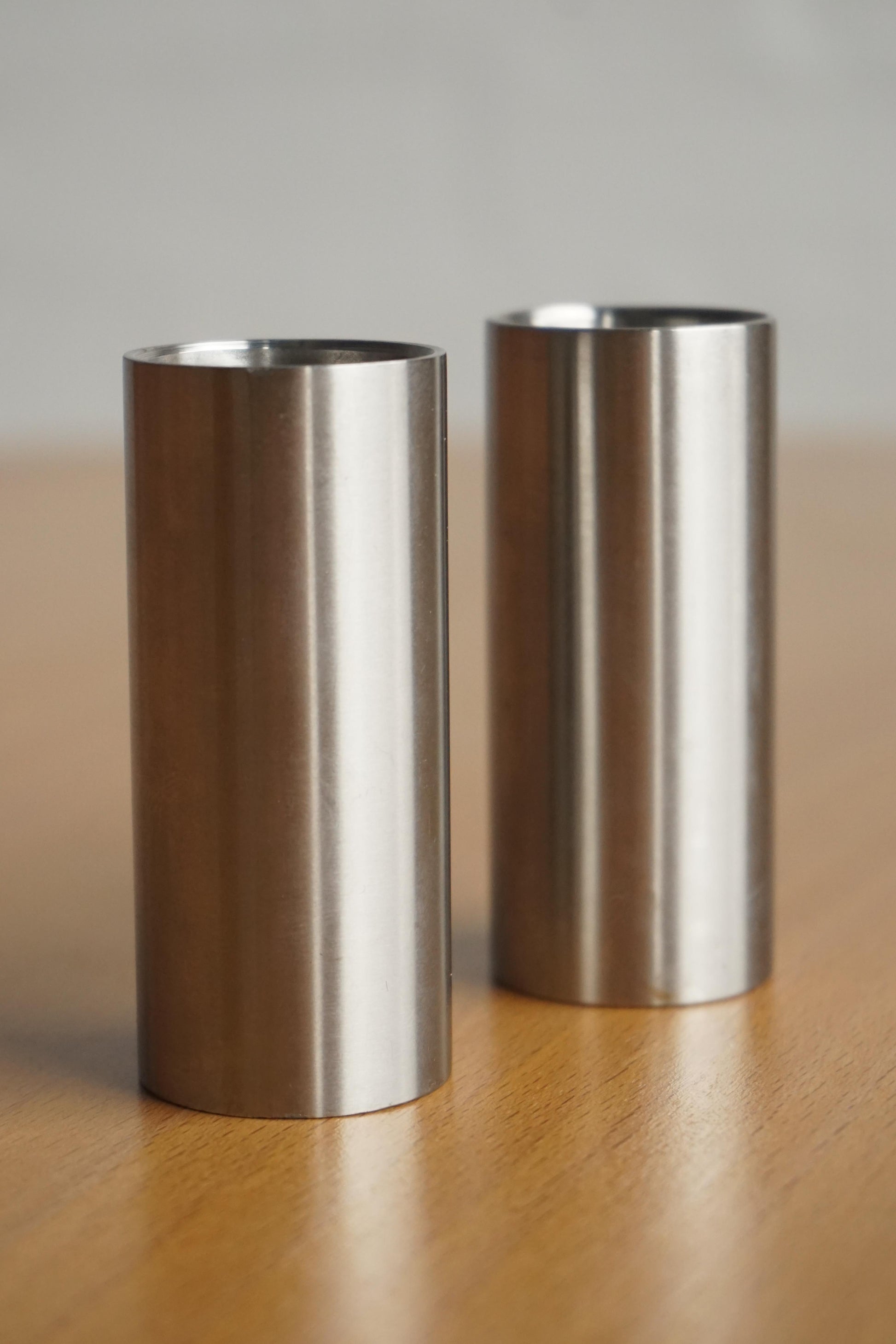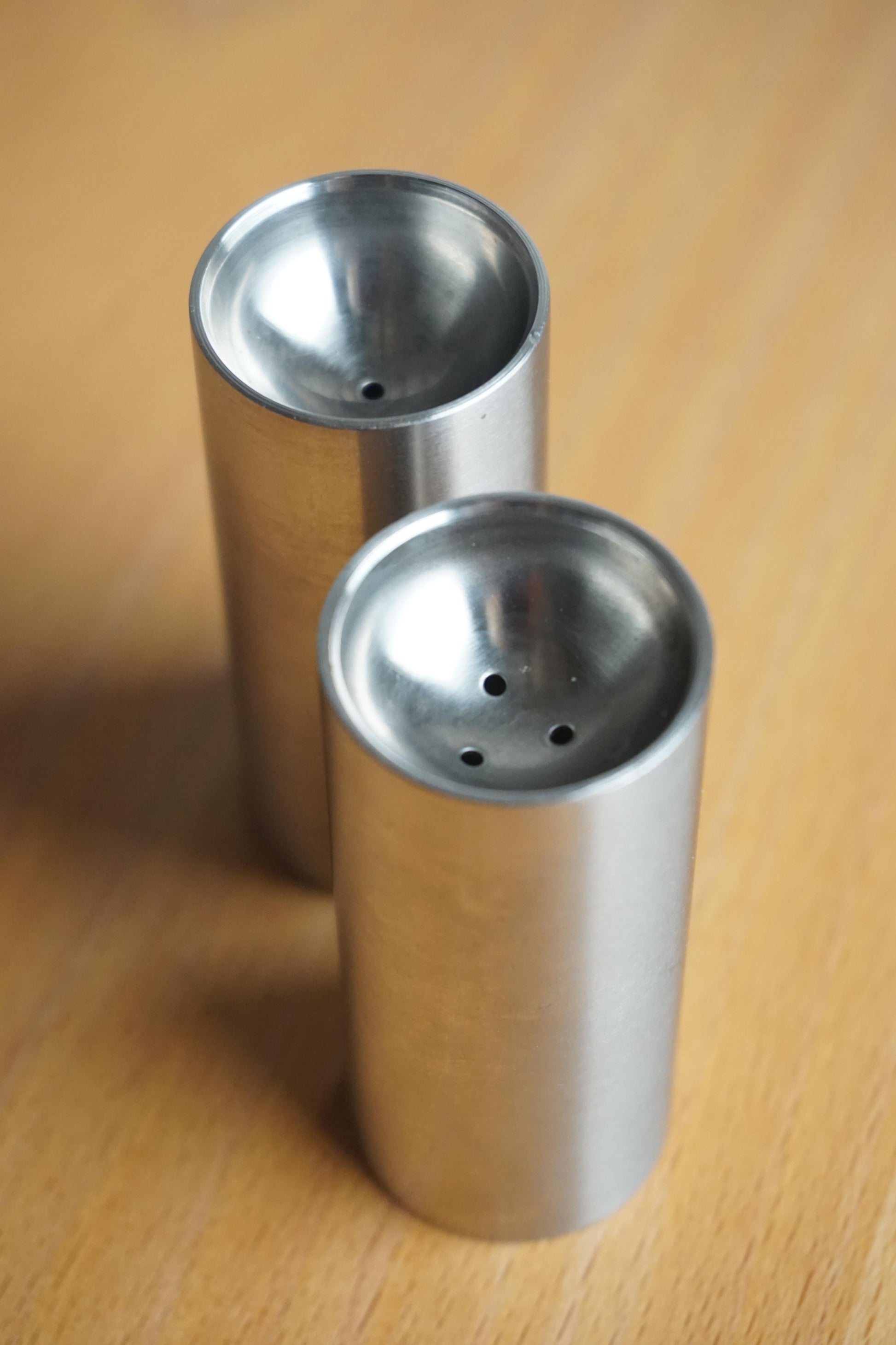 Stainless steel salt and pepper shakers by Stelton from the 'Cylinda' line designed by Arne Jacobsen, c.1960s Denmark.