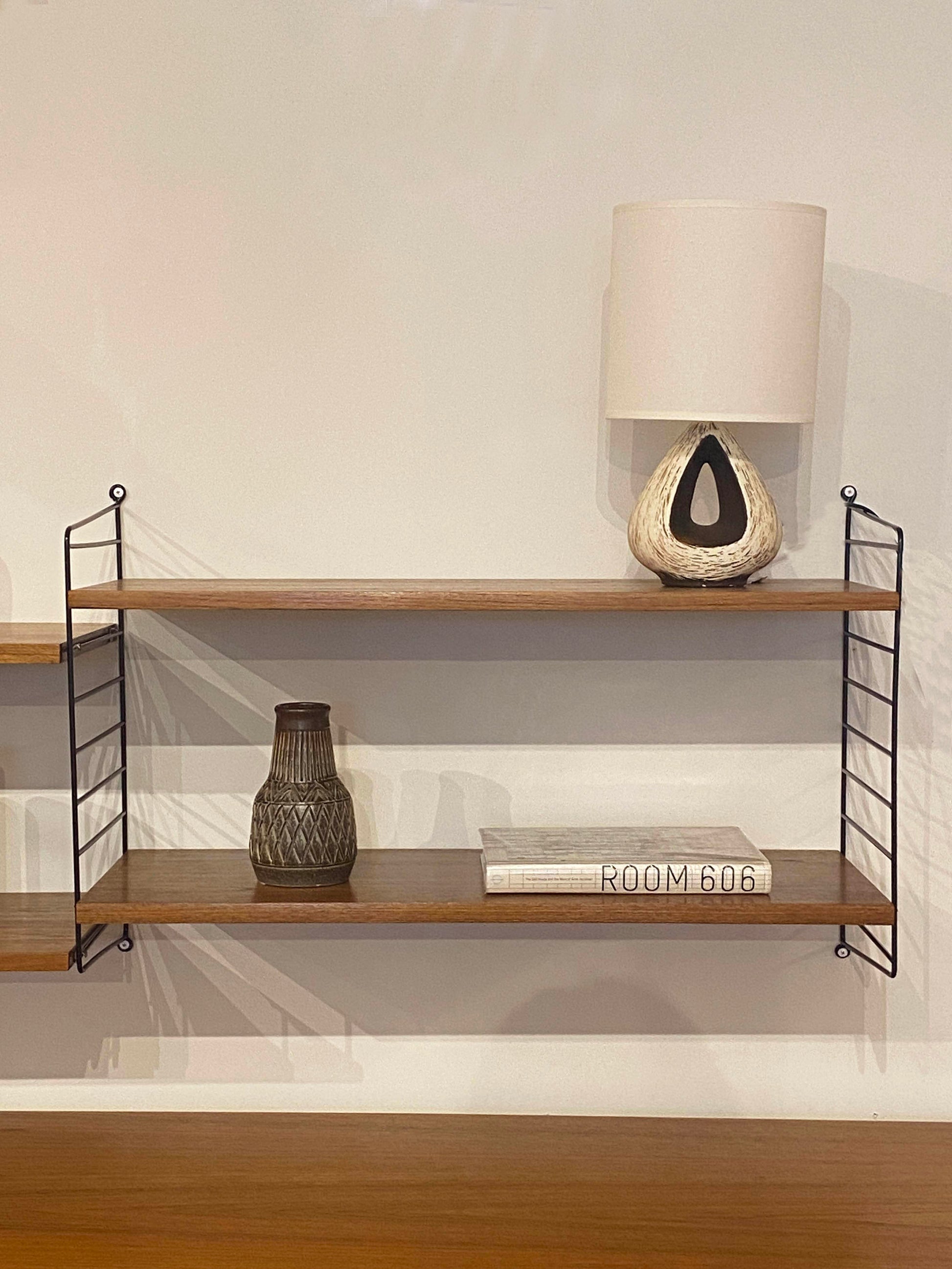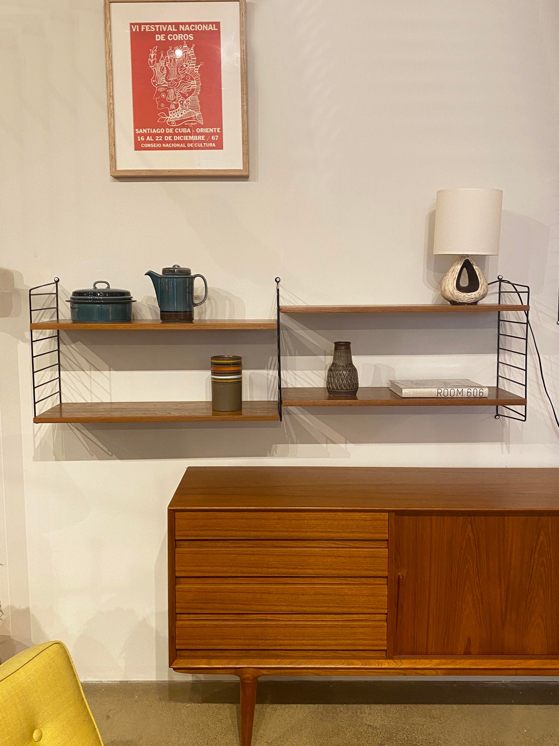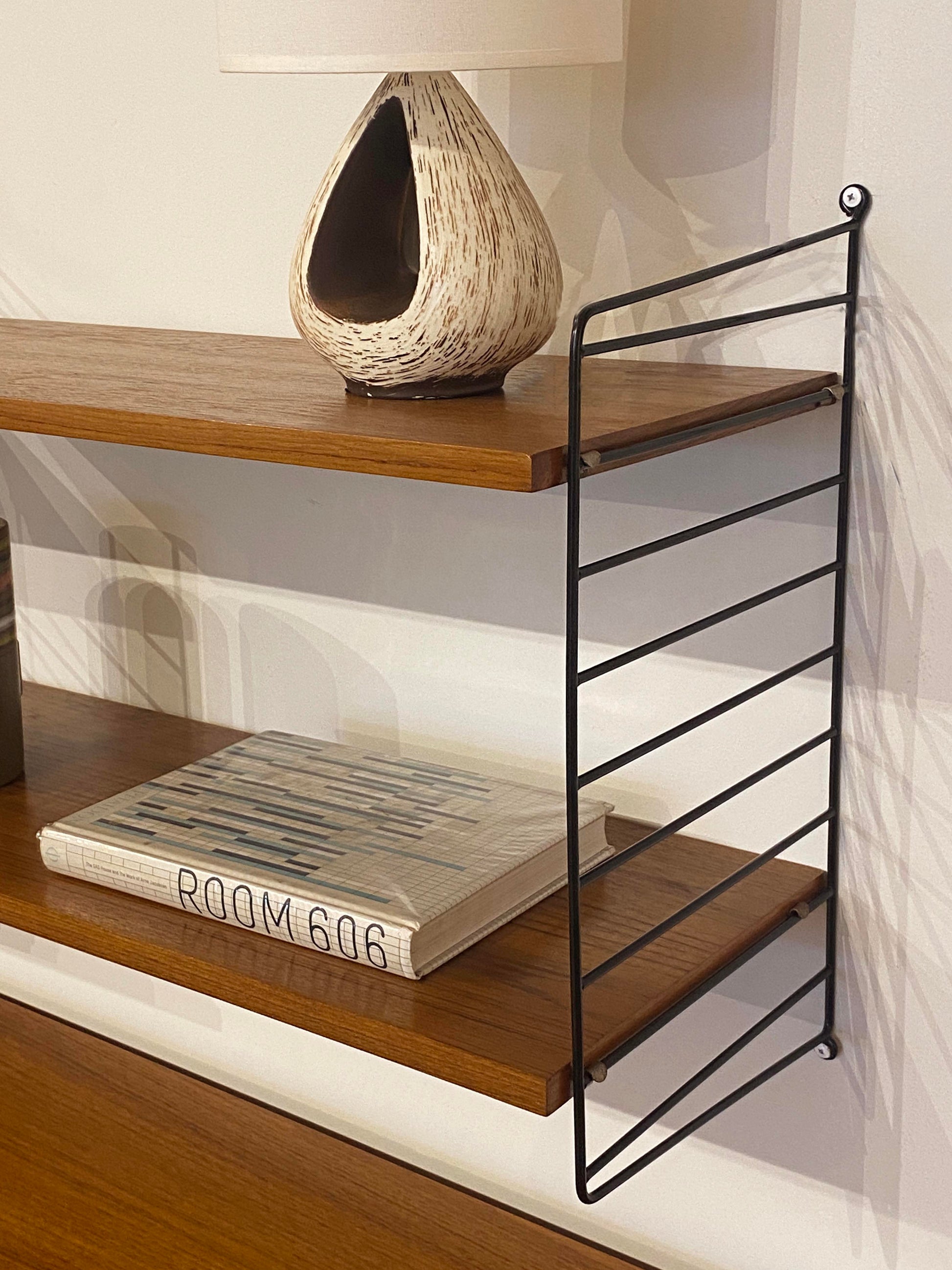 Fully restored 'String' shelving unit by Nils Strinning c.1960s Sweden. The teak shelves have been sanded and polished, finished in hard shellac. Steel rails have been newly powder coated black. Shelves are adjustable in height.