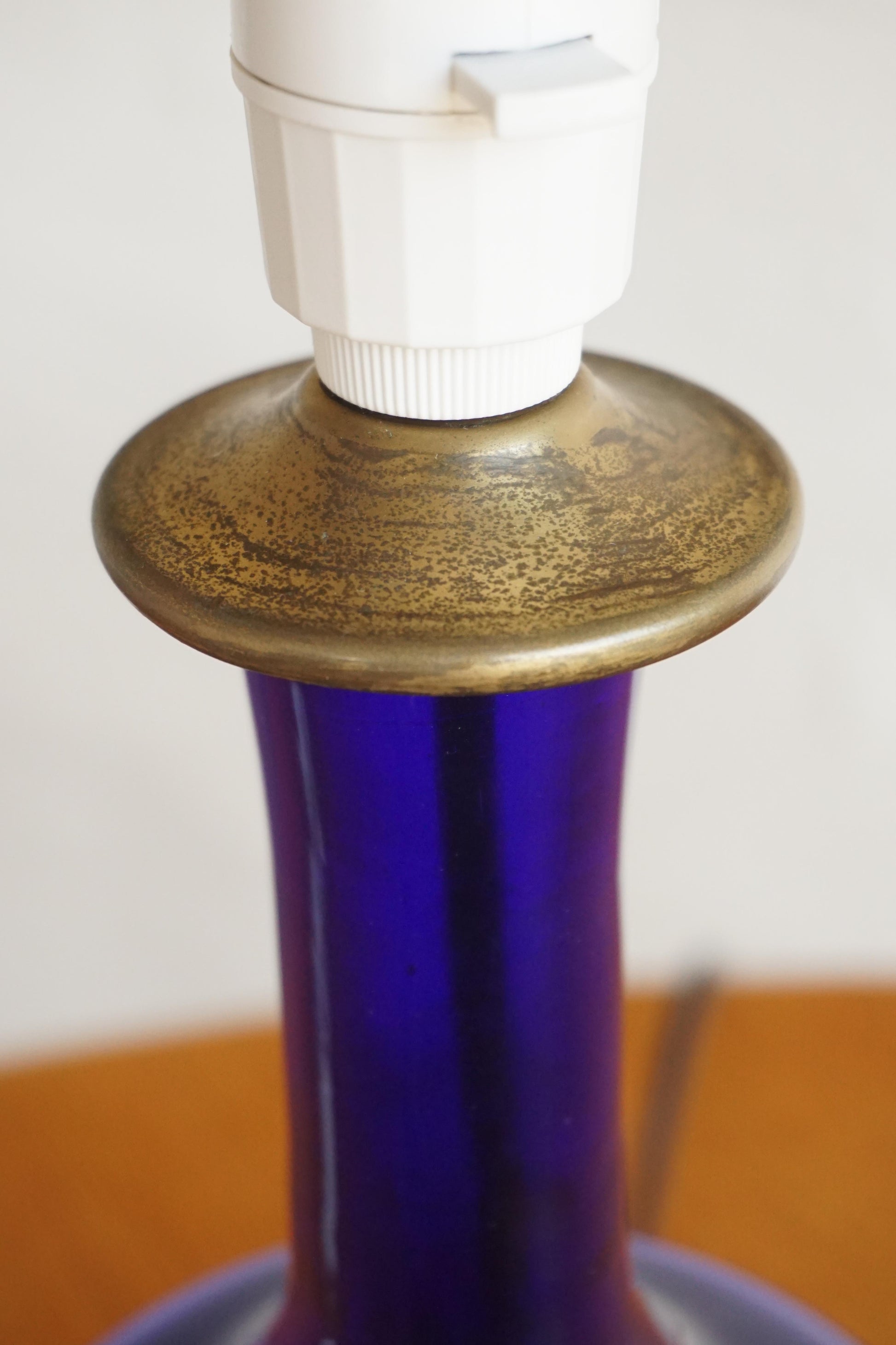 Handblown glass table lamp c.1960s Denmark. Attributed to Kastrup. Blue glass base with a brass cap. The brass has been cleaned and showing some patina. Fully rewired to Australian Standard with a new shade.