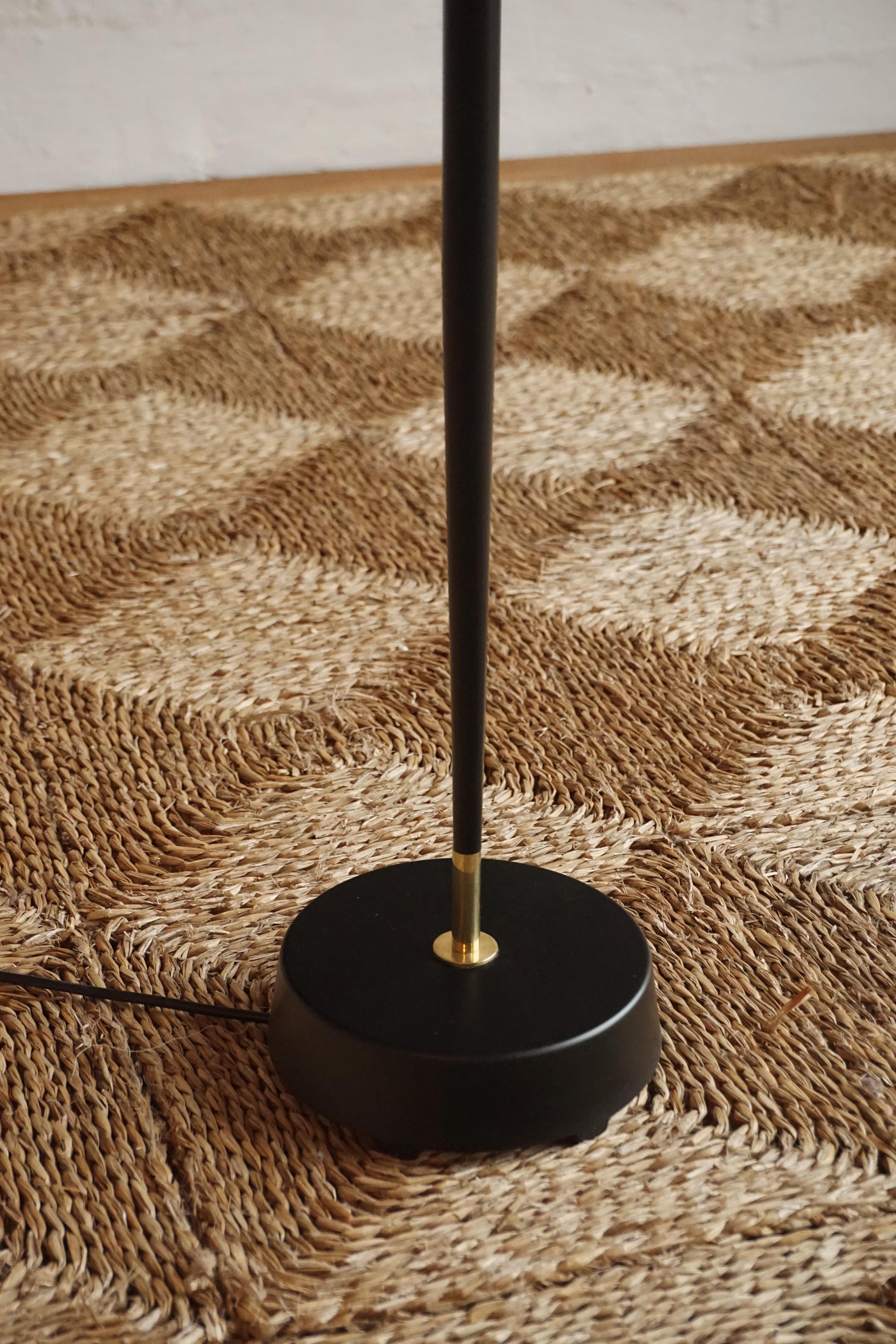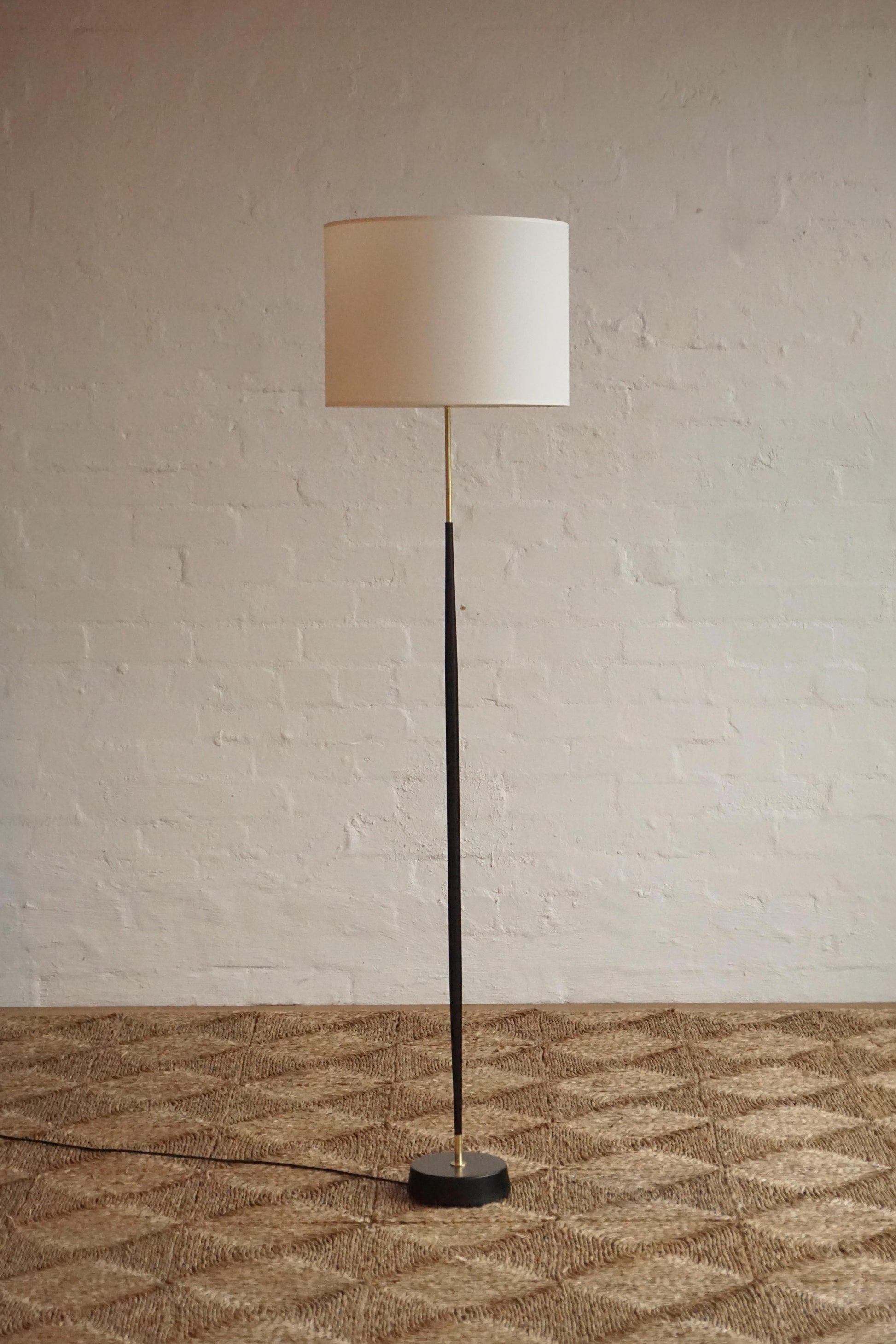 Black and brass standard lamp c.1960s Sweden. Lacquered black steel base and stem with polished brass detail. Fully rewired to Australian Standard with a new canvas shade.
