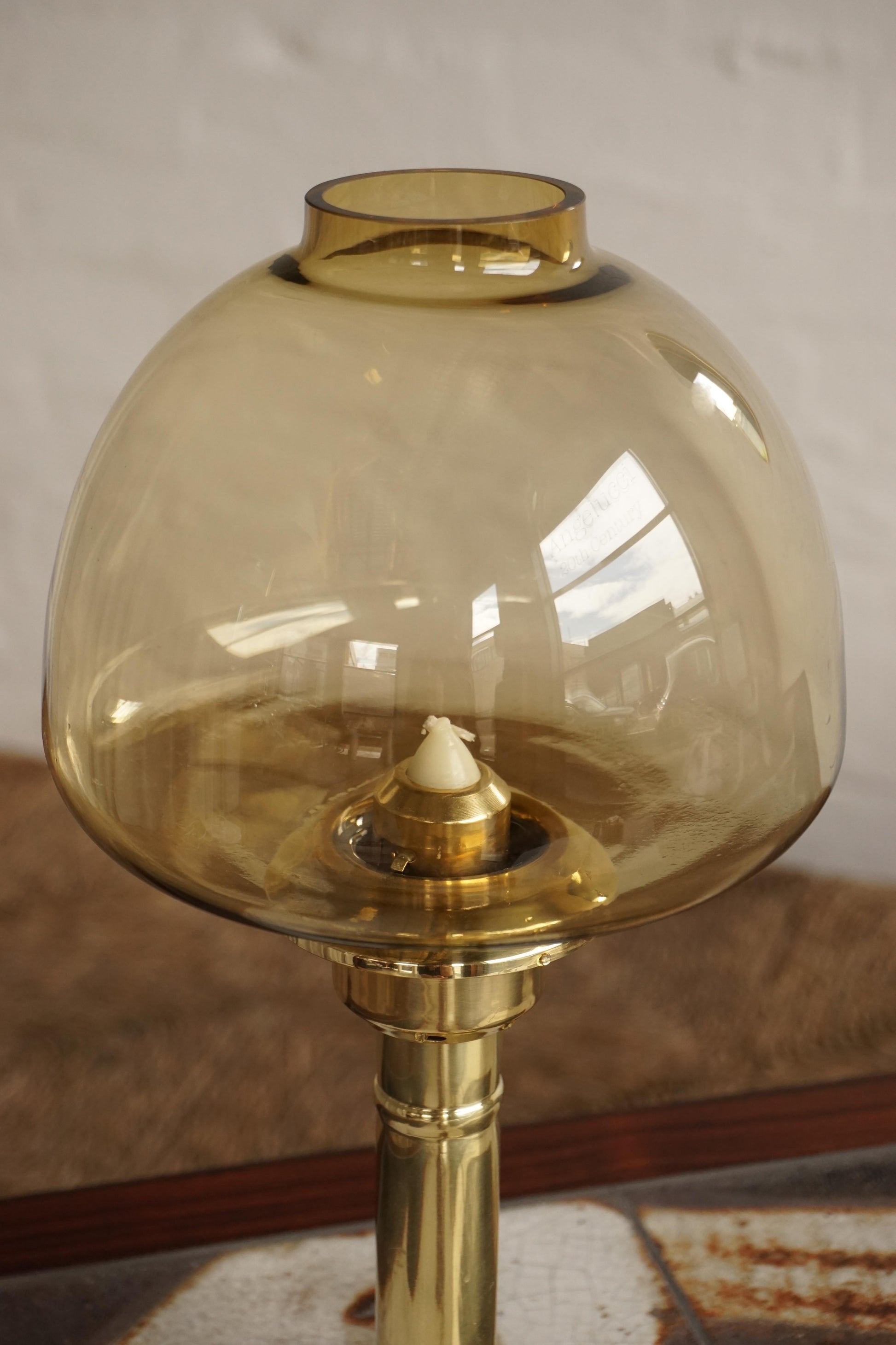 Brass hurricane lamp/ candleholder c.1960s Sweden. Polished brass base with glass shade. The candle holder has a removable spring-loaded tube and burner so the flame stays in the same place until the candle burns out. Comes with a Bolsius drip free candle. Perfect for a festive table-scape.