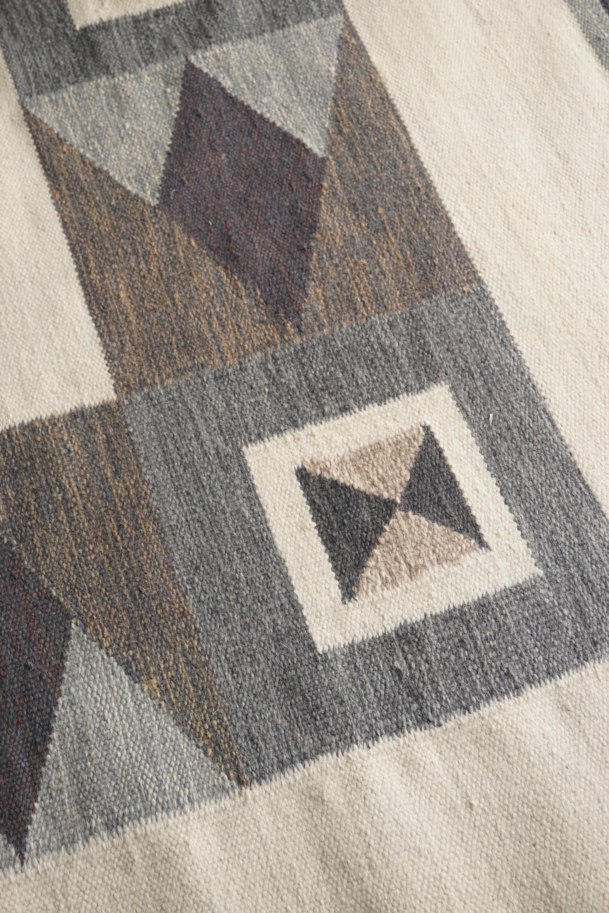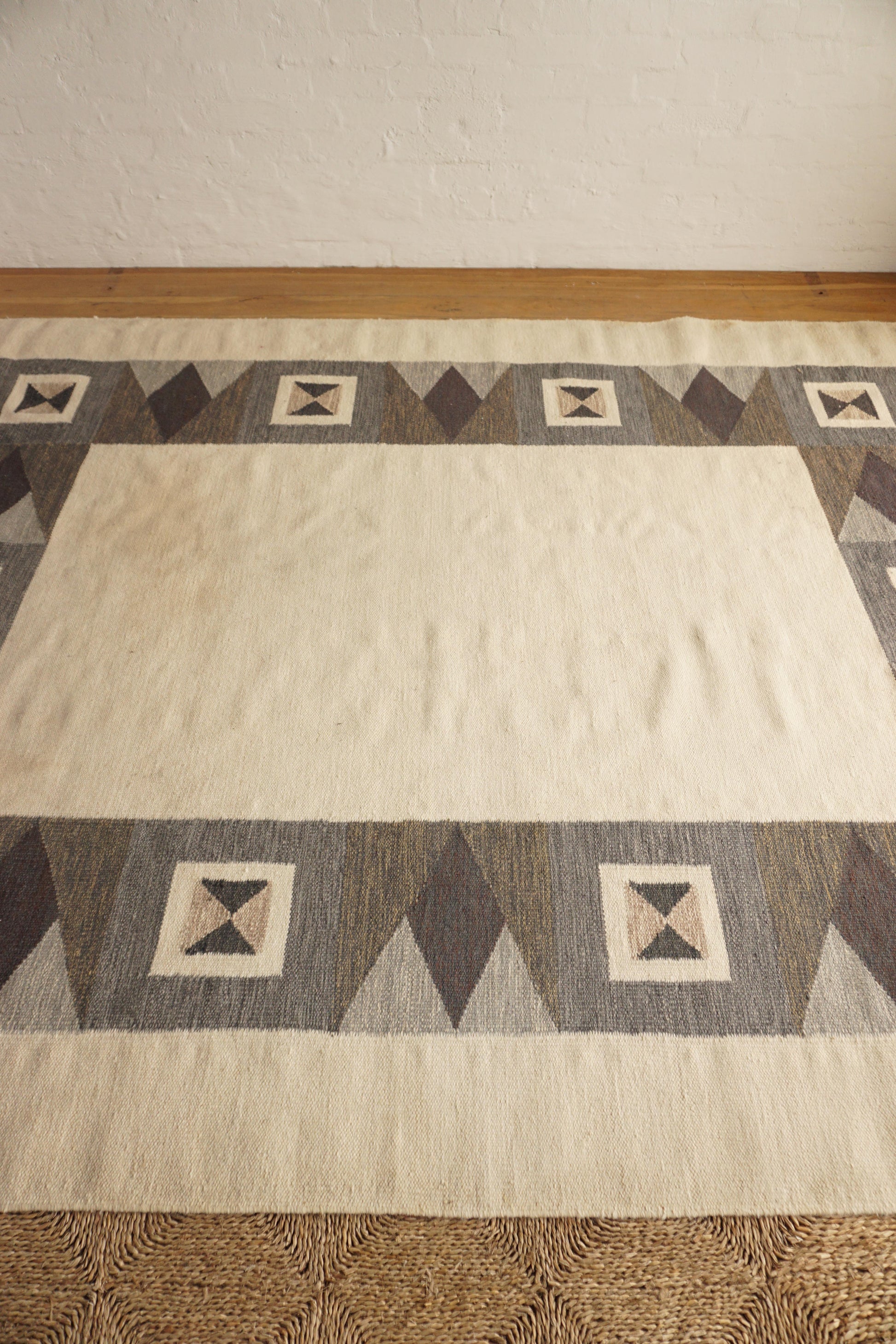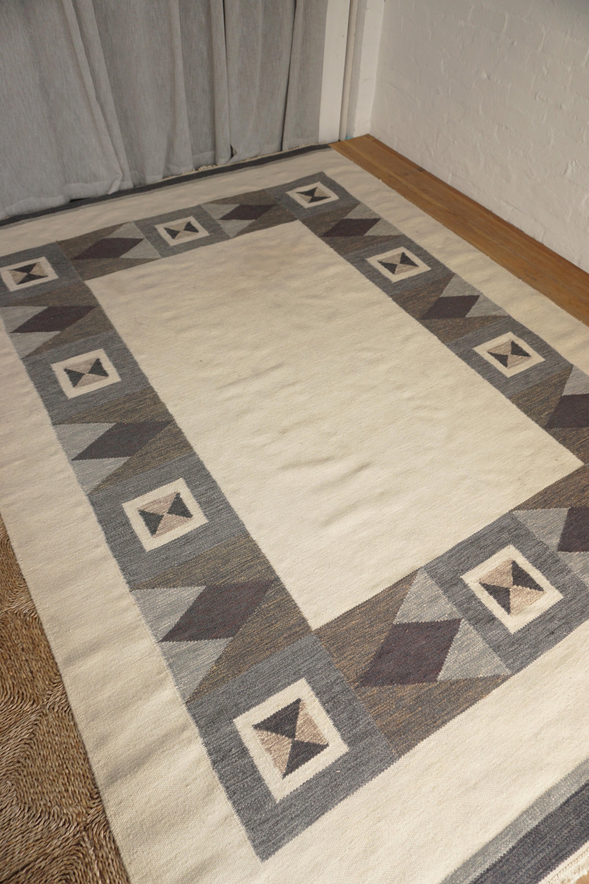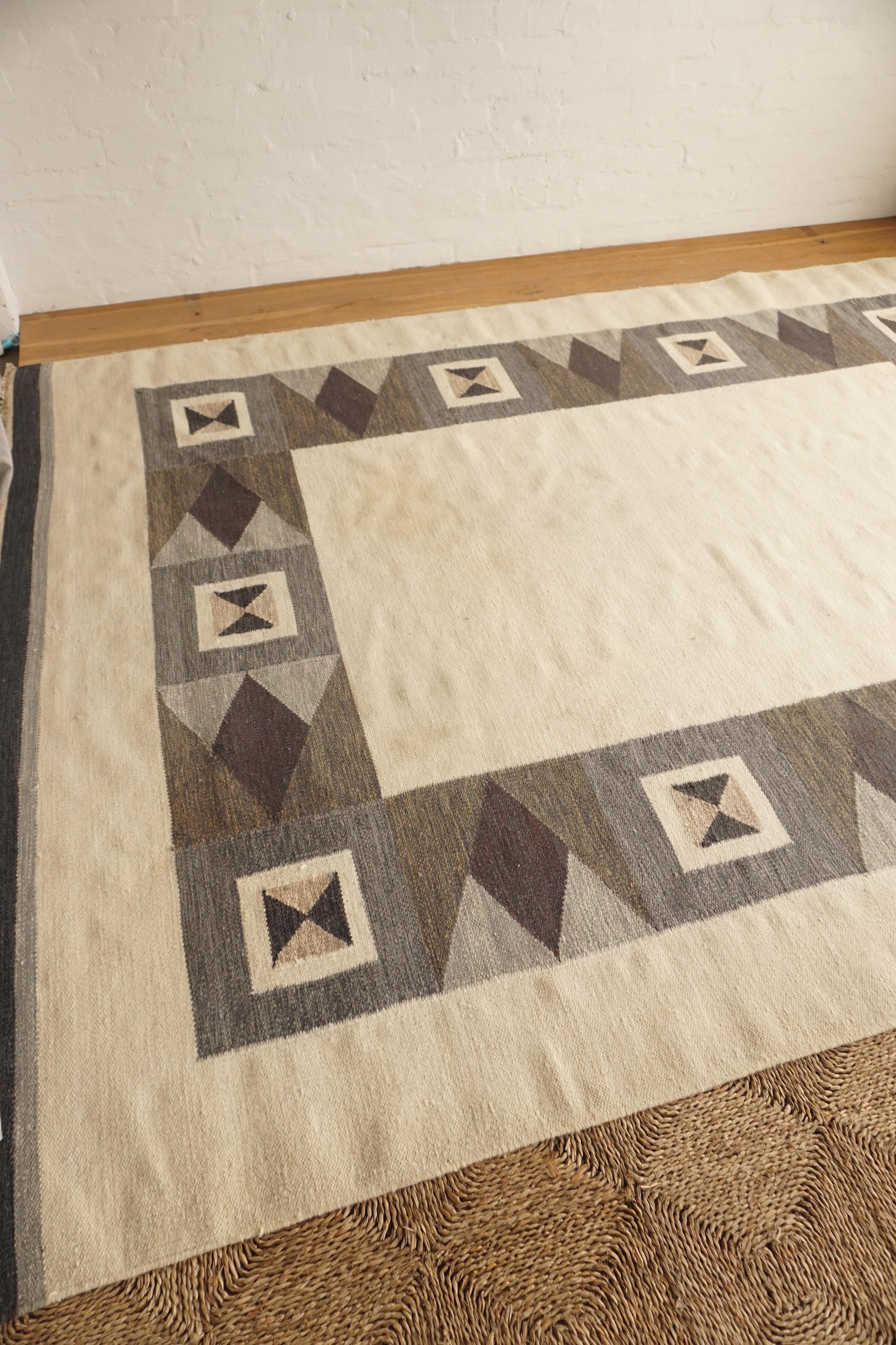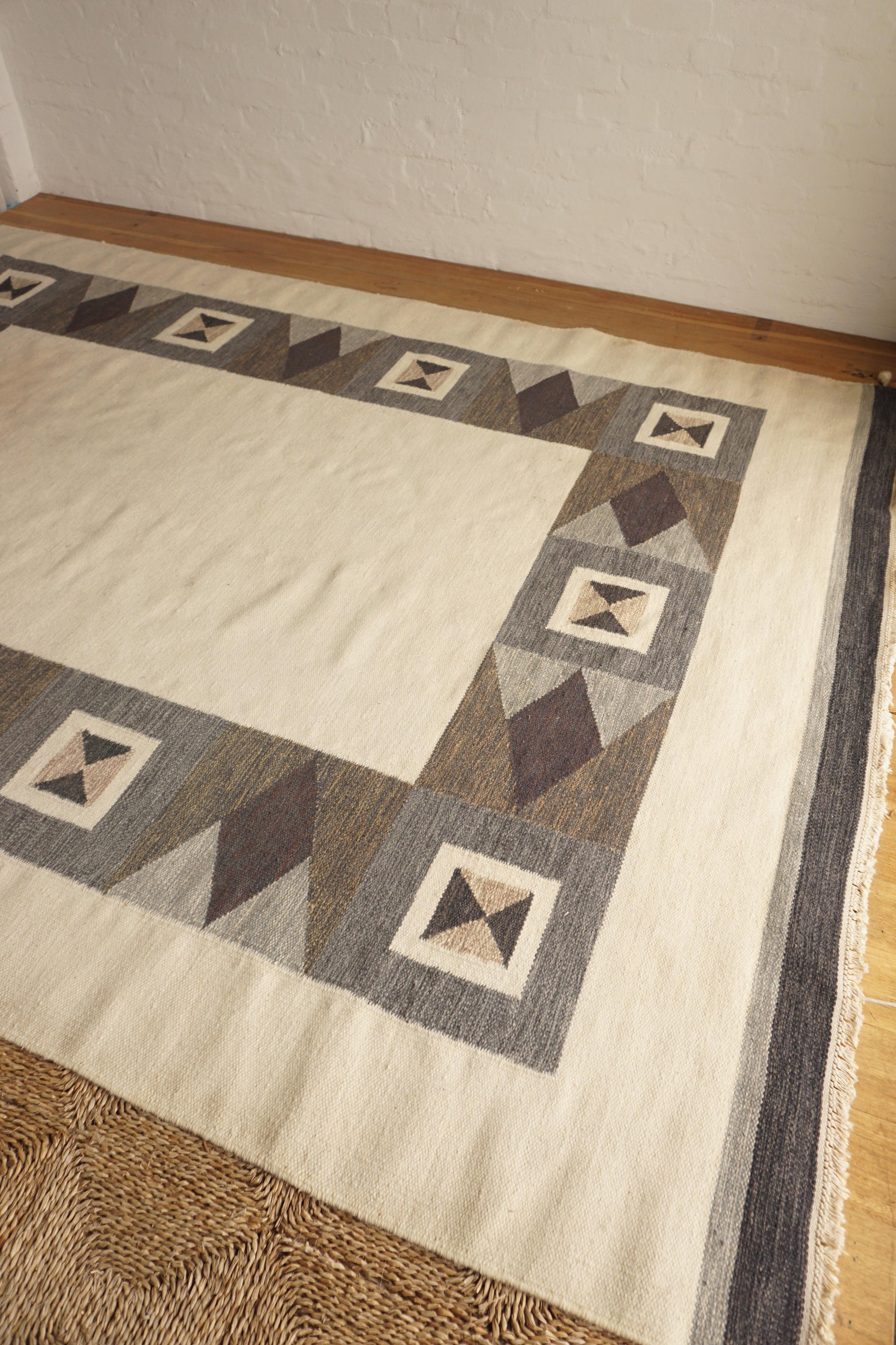 Large handwoven wool rollakan from Sweden. Has been professionally cleaned, some marks as shown in photos.
